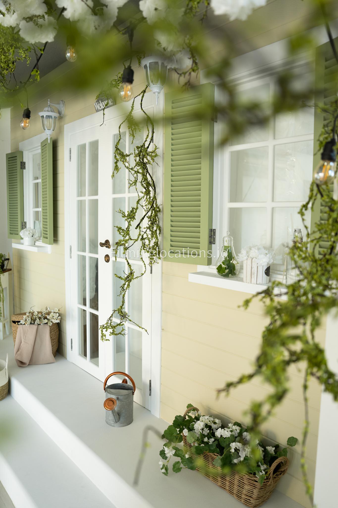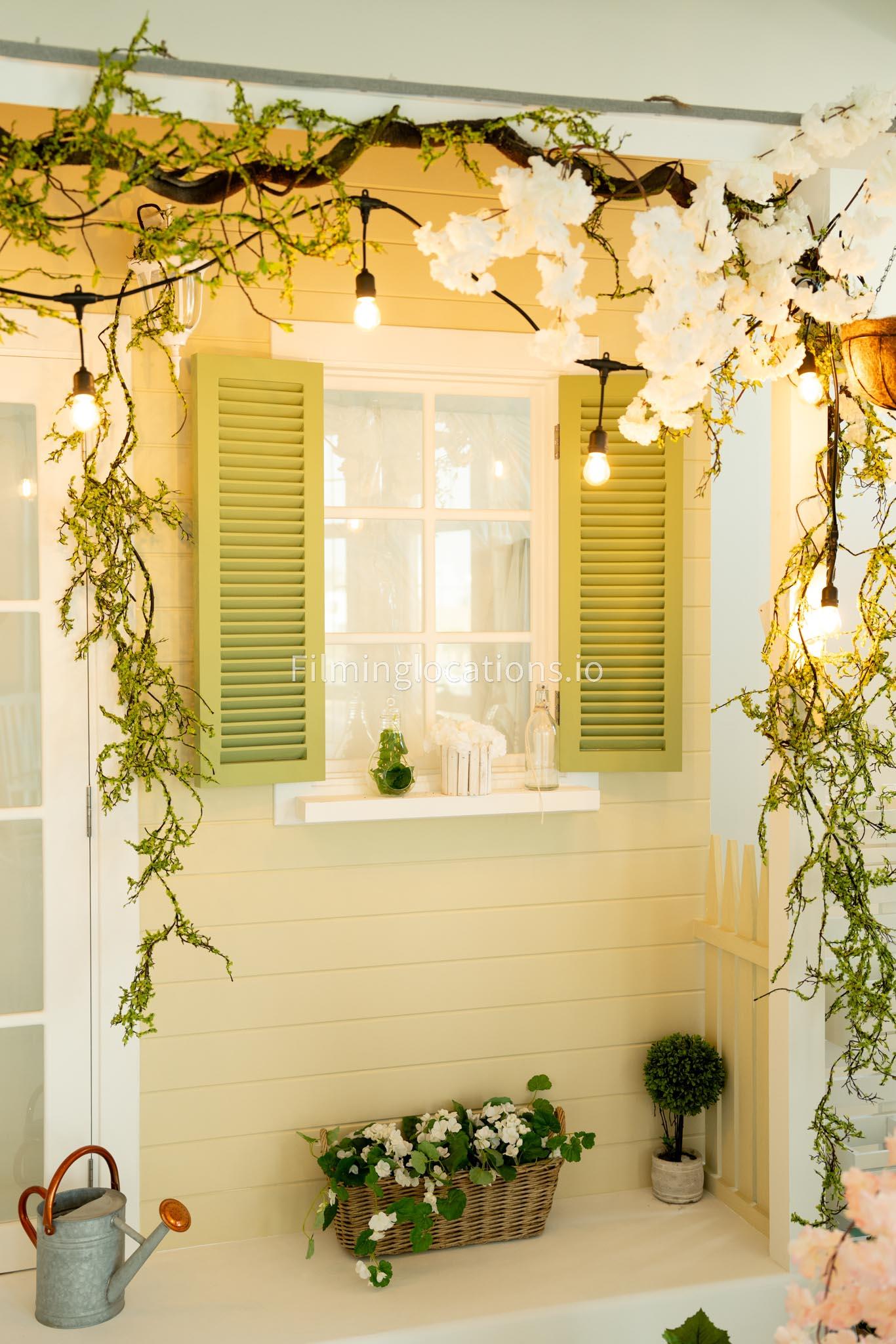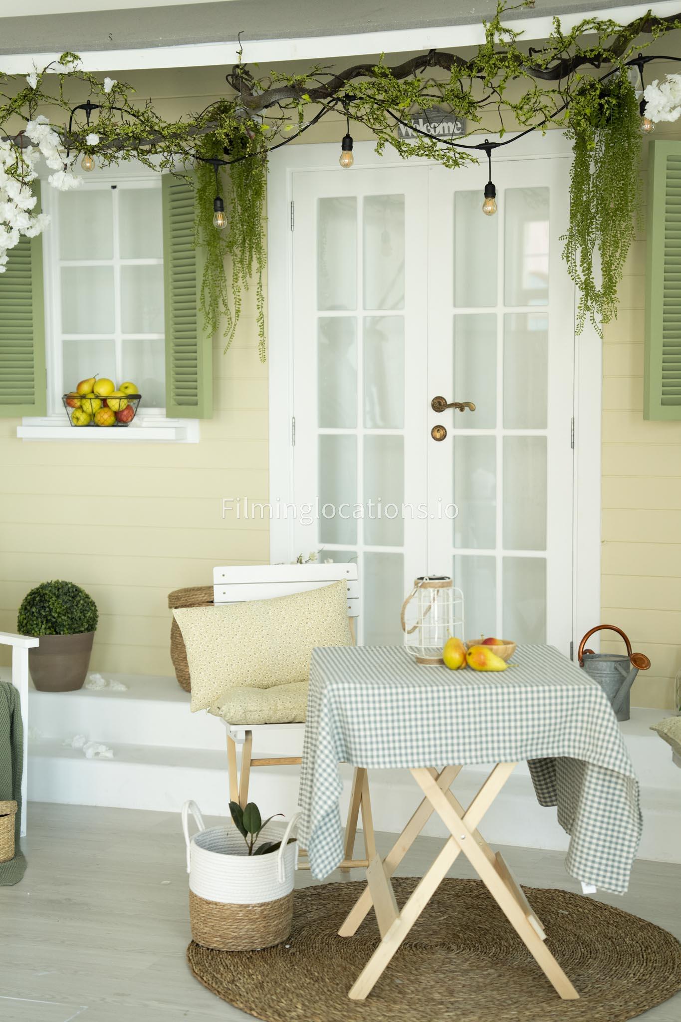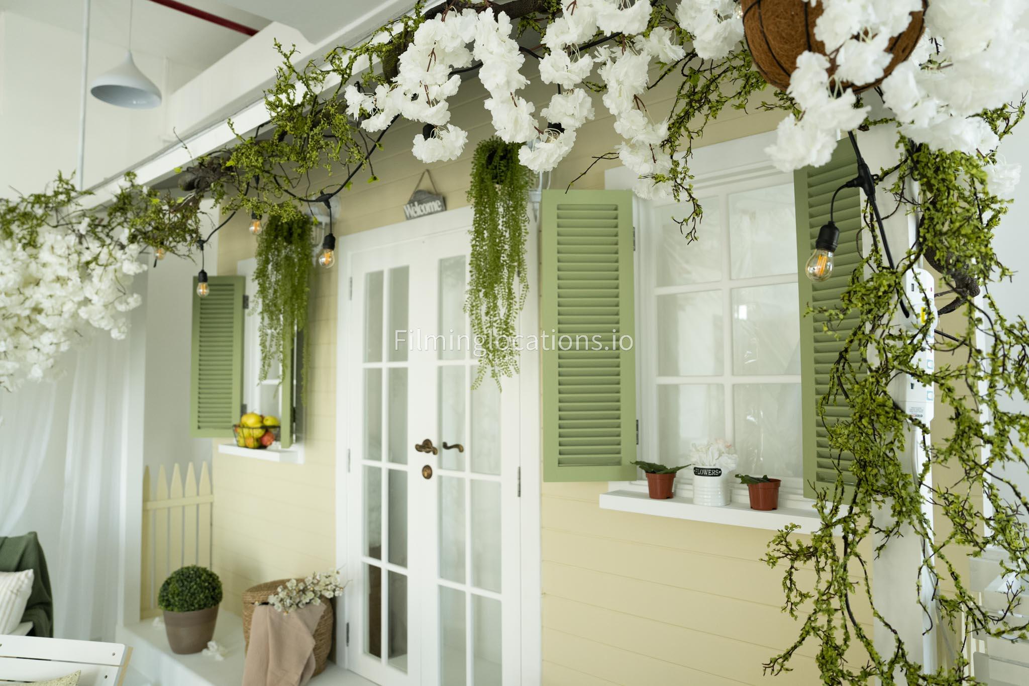 Our cottage-style set boasts a charming porch with beautiful seating and lush greenery, embodying a delightful spring ambiance. Filmmakers will love its picturesque setting, ideal for capturing warm and tranquil scenes filled with romance or family moments