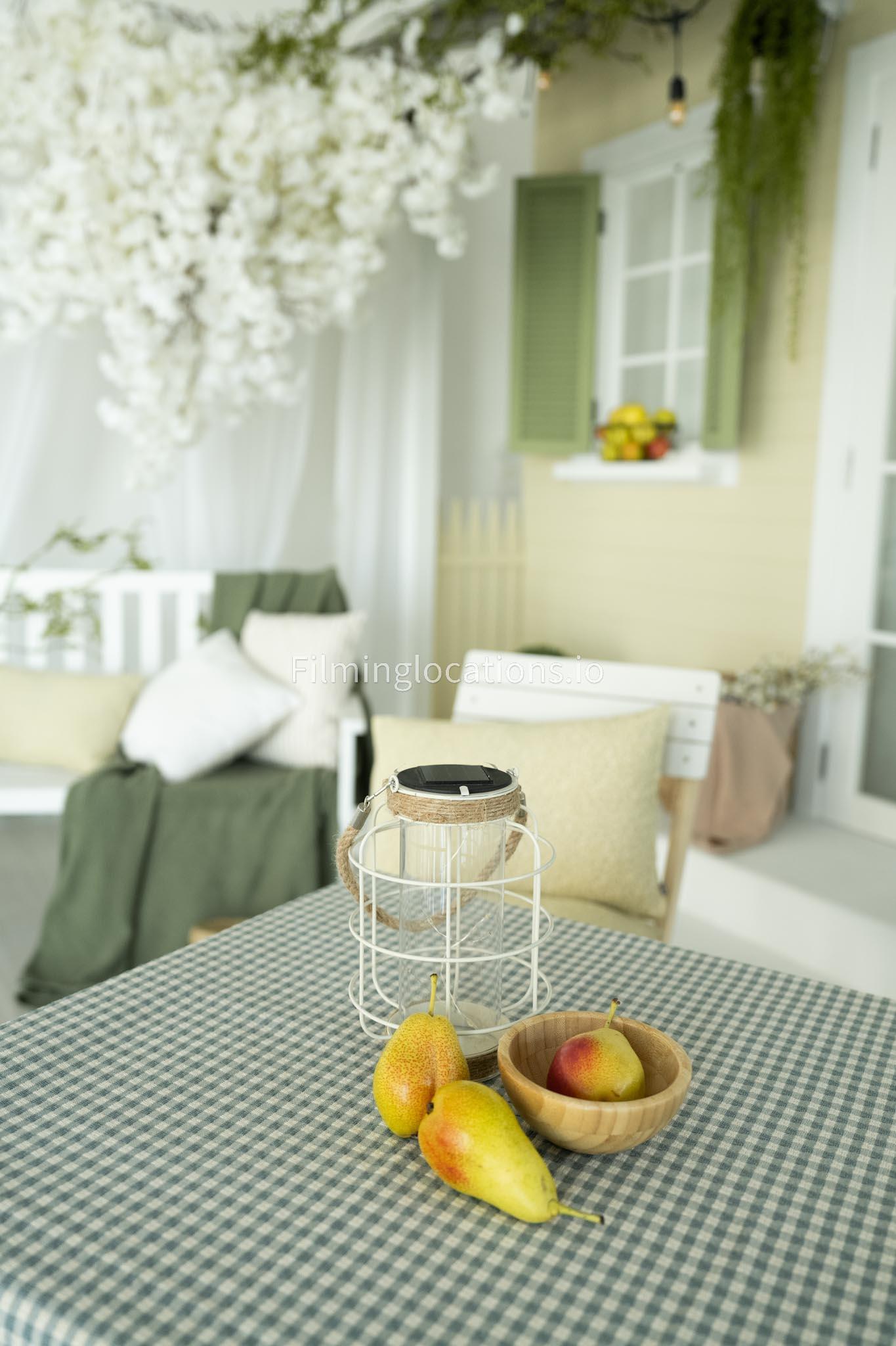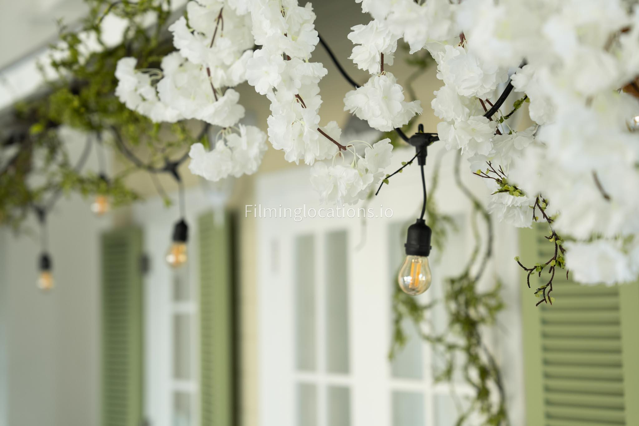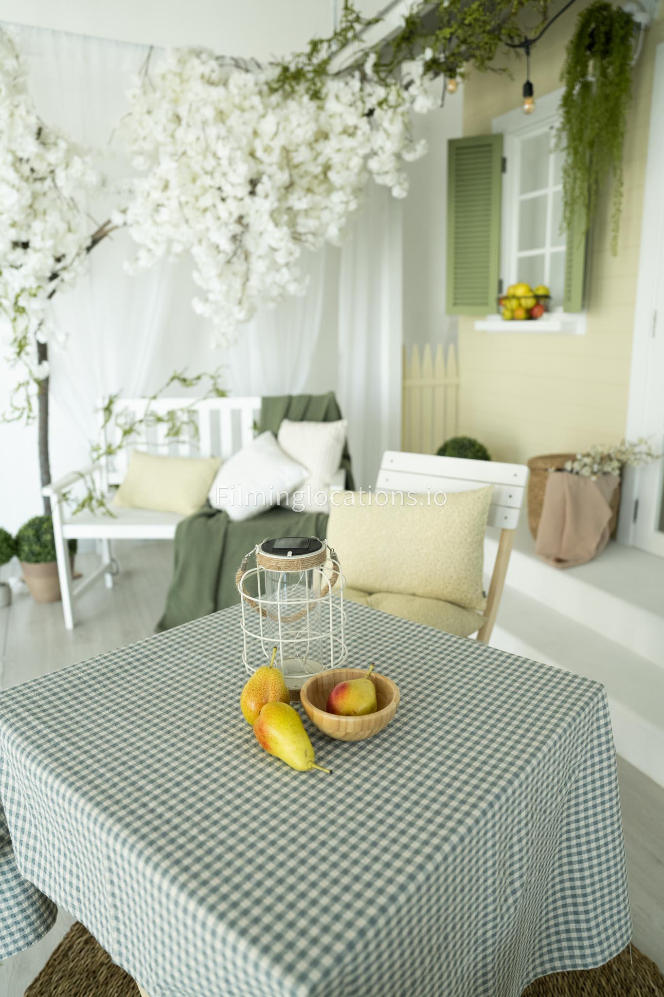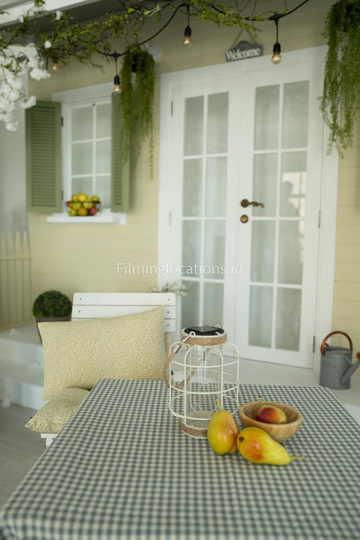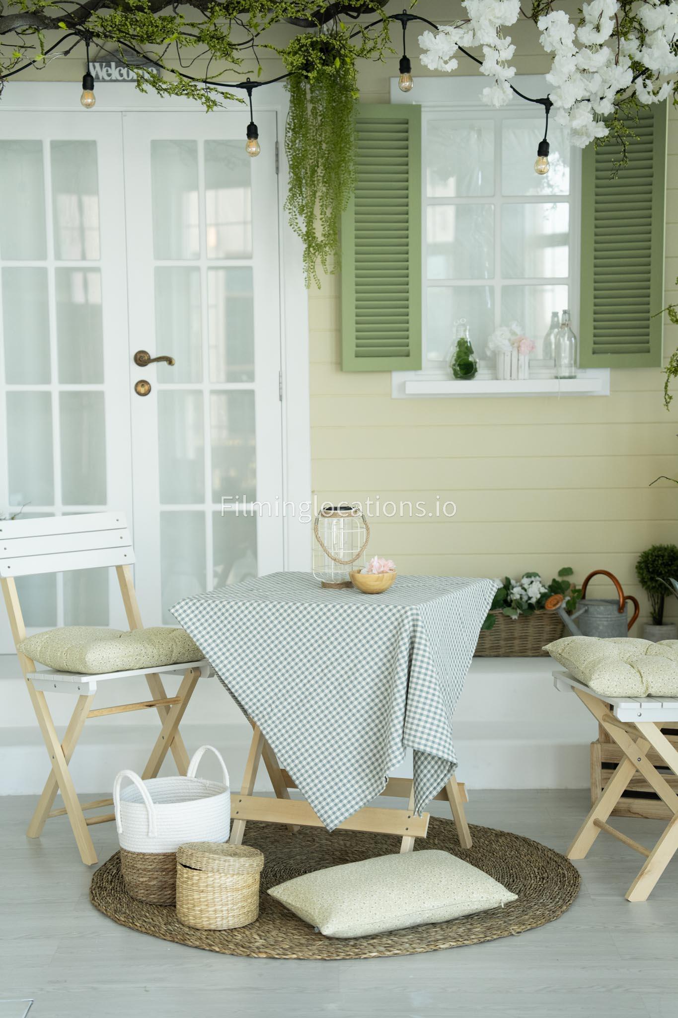 Our cottage-style set boasts a charming porch with beautiful seating and lush greenery, embodying a delightful spring ambiance. Filmmakers will love its picturesque setting, ideal for capturing warm and tranquil scenes filled with romance or family moments