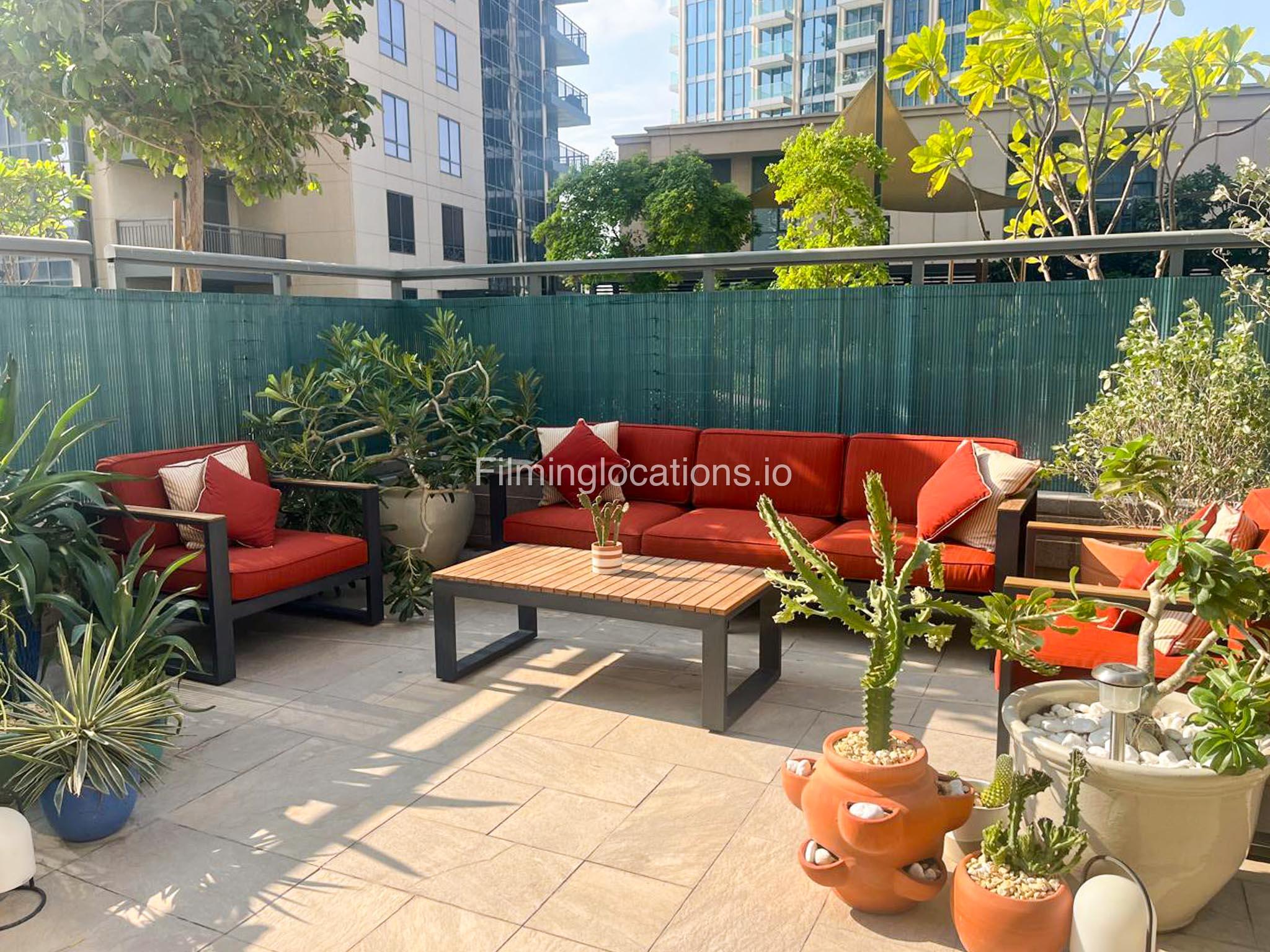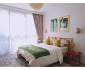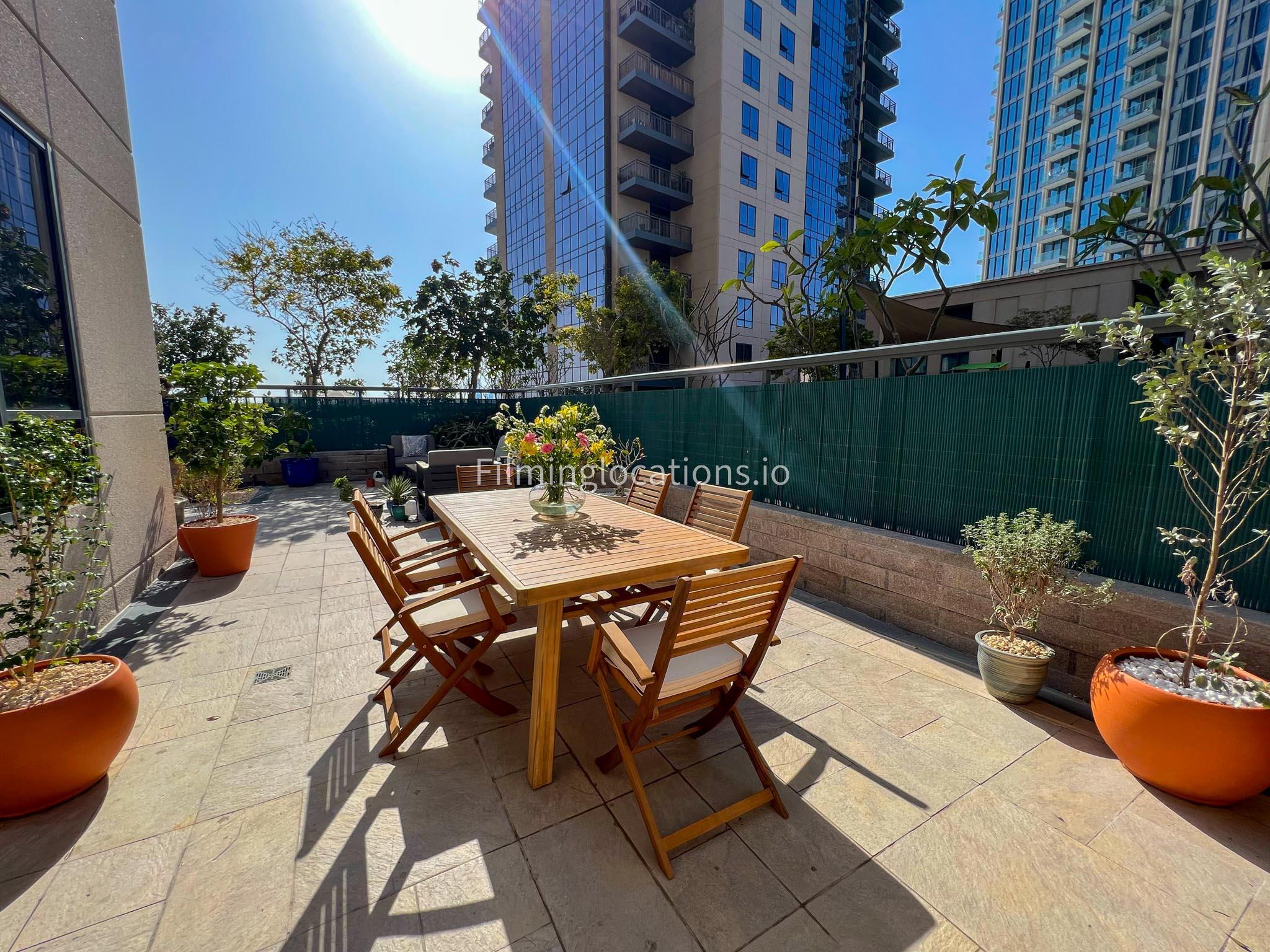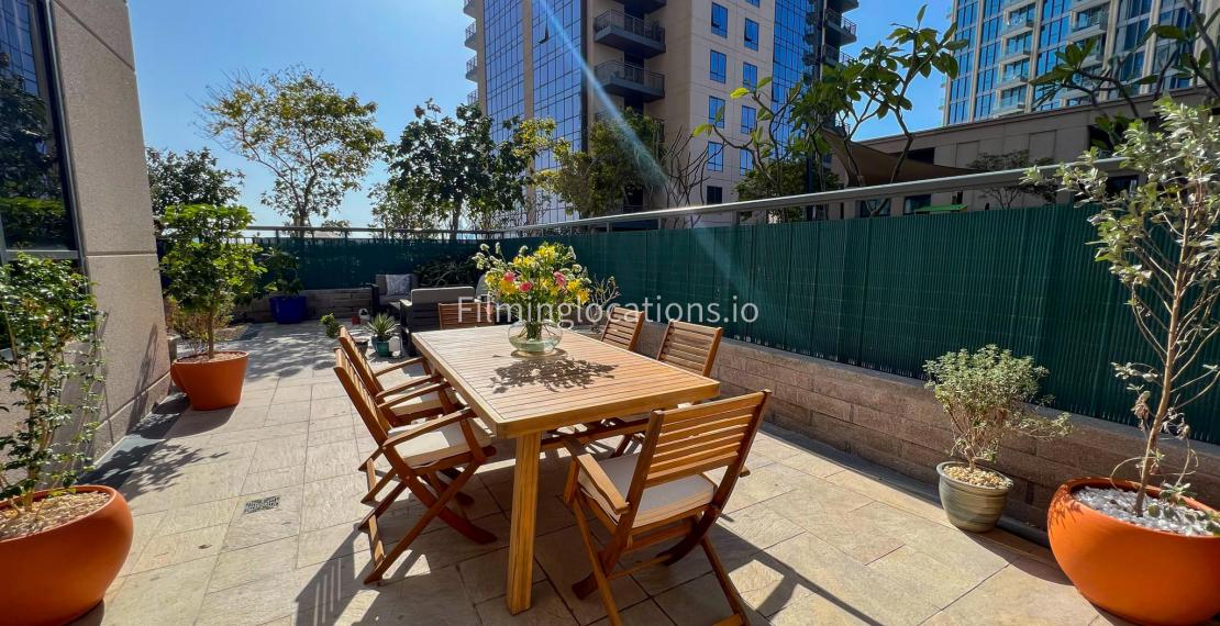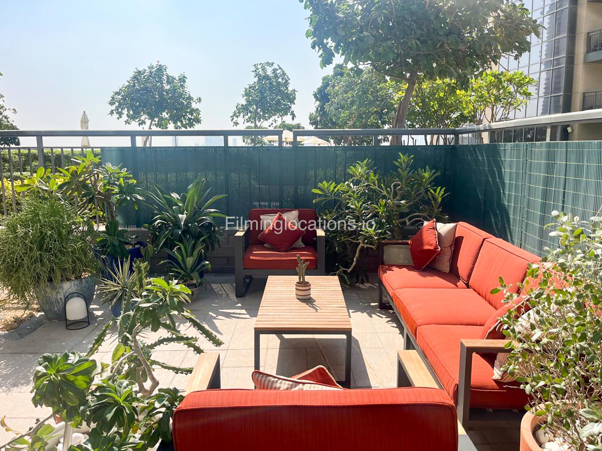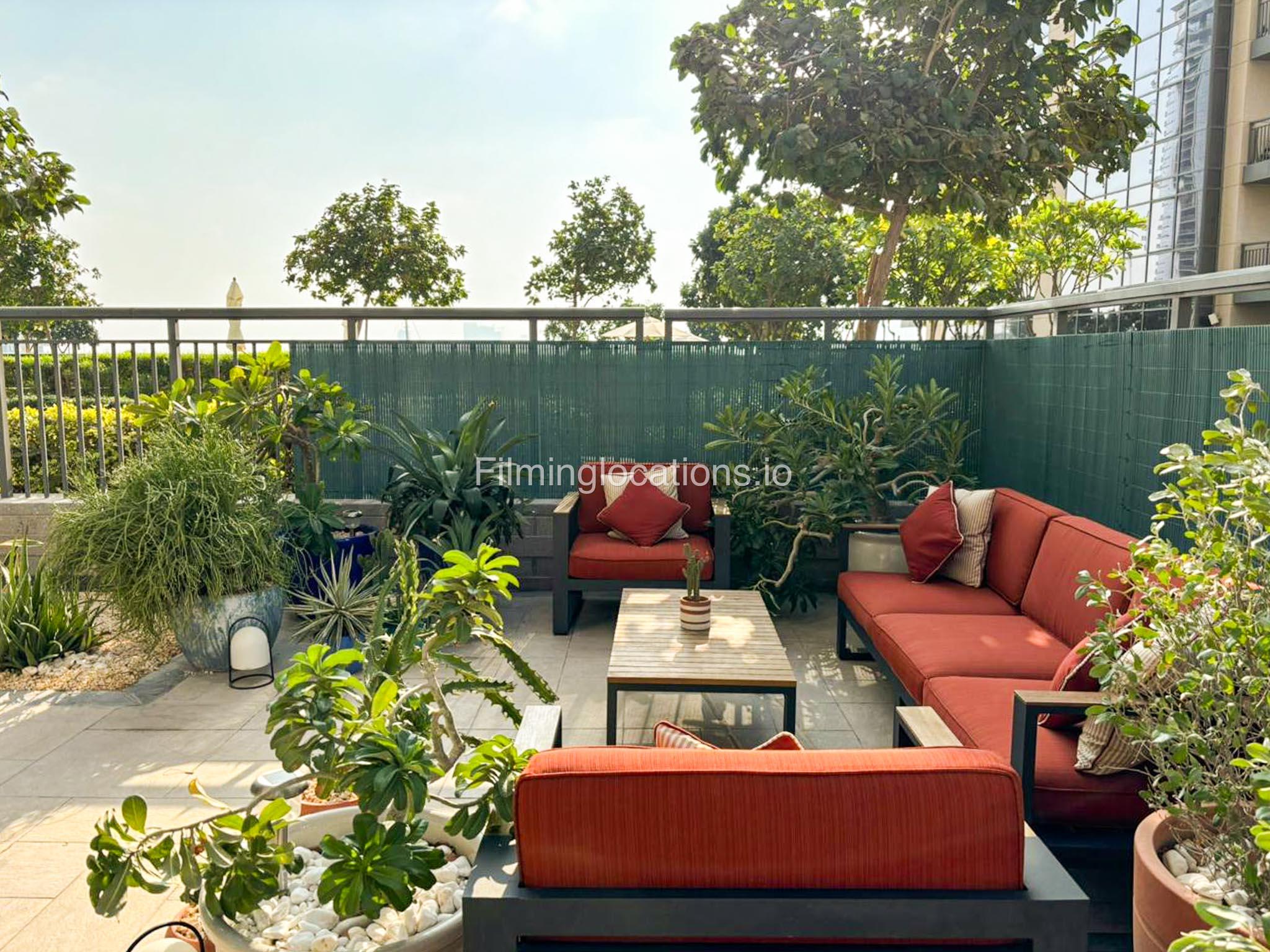 The apartment has a vibrant atmosphere, adorned with artworks and lively décor. Natural light floods the space through expansive floor-to-ceiling windows, illuminating the living room, charming dining area, and open kitchen. The bedrooms boasts tasteful decorations, adding to the overall ambiance. Furthermore, a highlight for filmmakers is the generous balcony, offering ample outdoor seating amidst lush greenery, providing an ideal setting for captivating scenes.