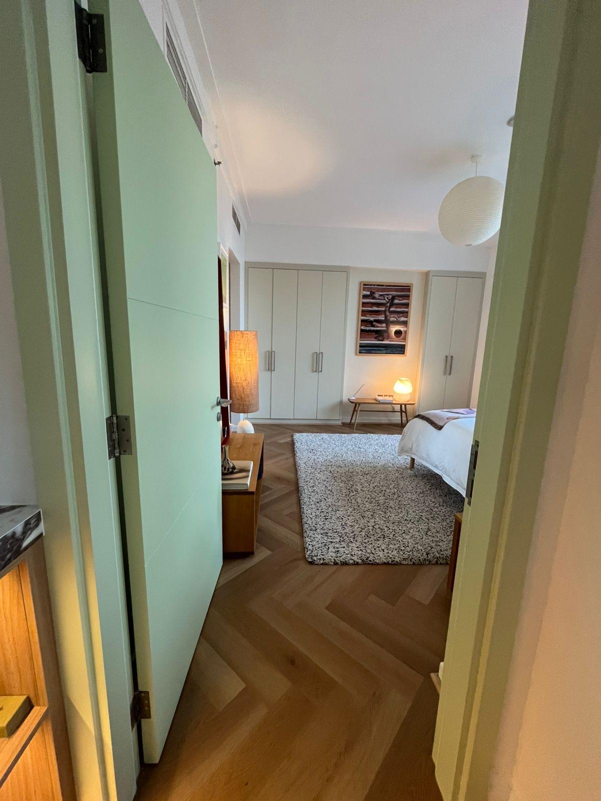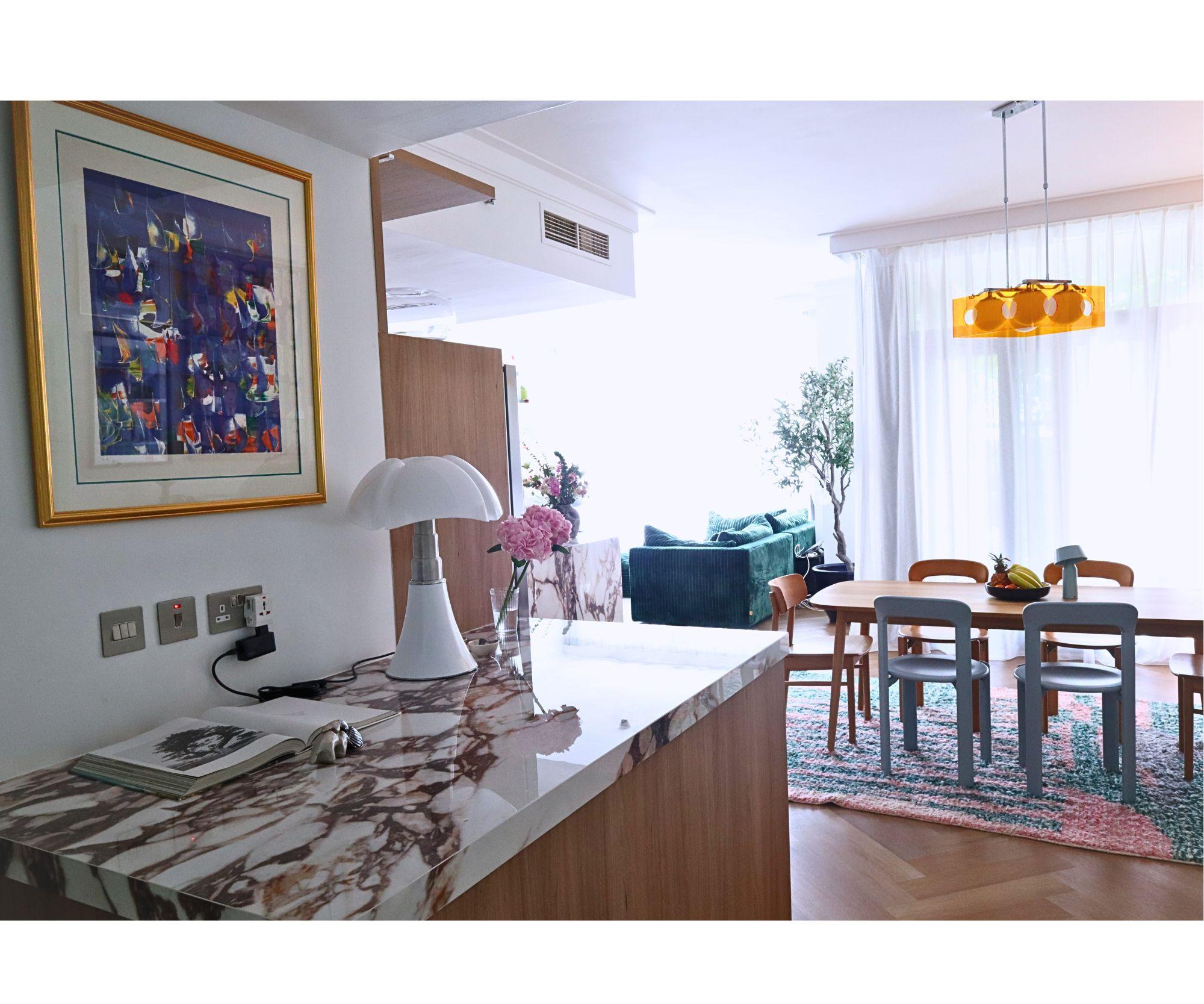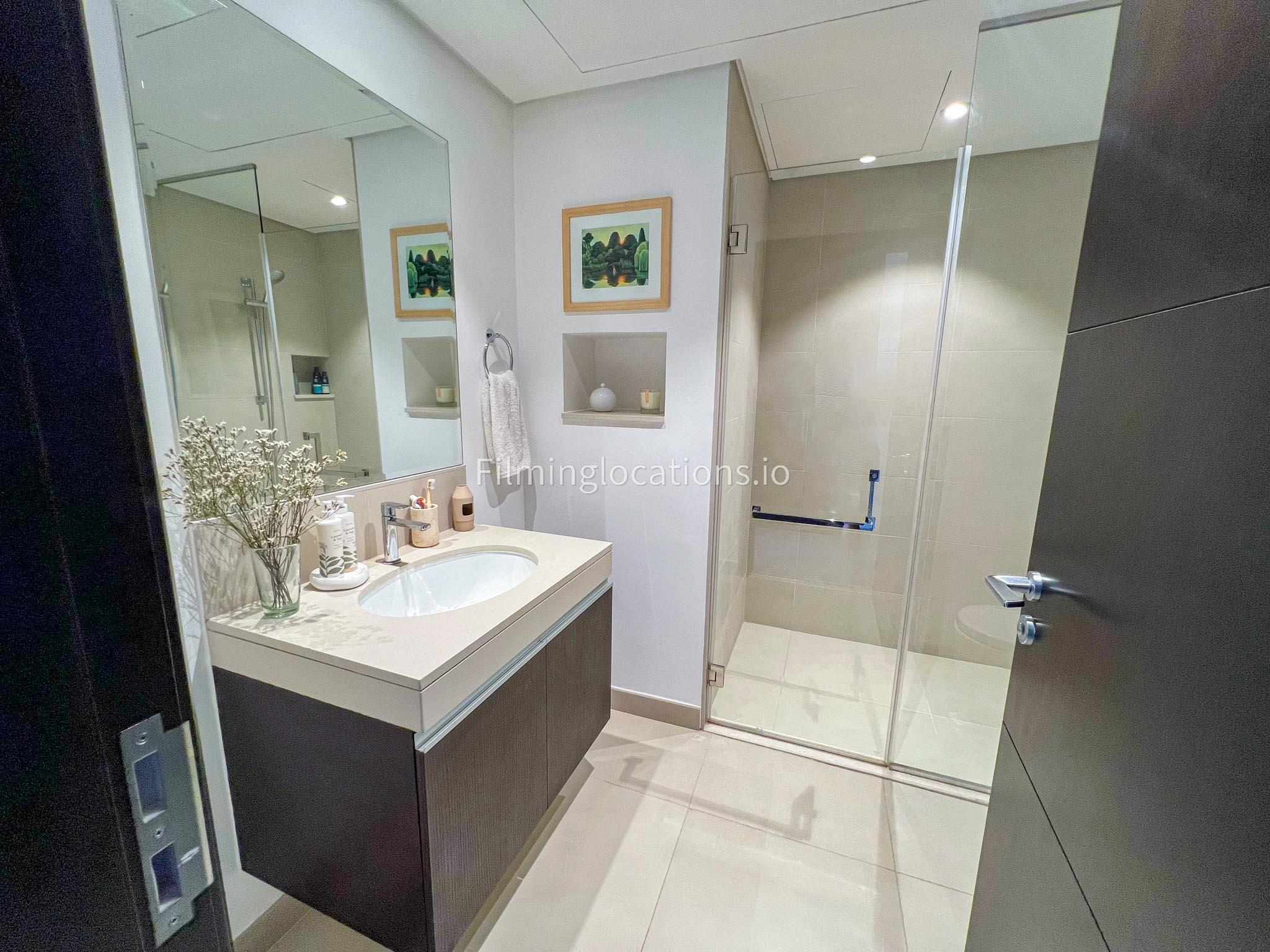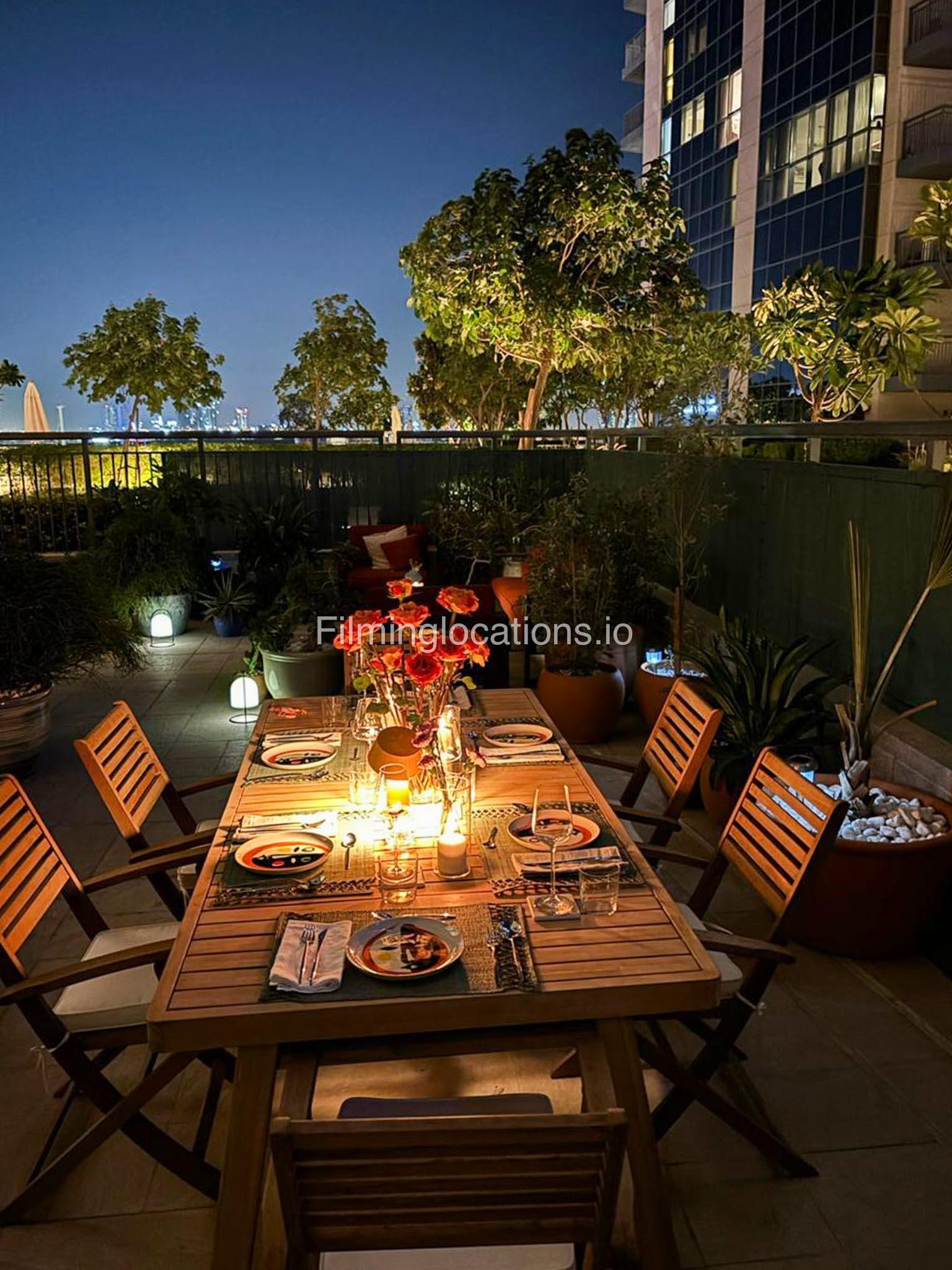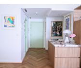 The apartment has a vibrant atmosphere, adorned with artworks and lively décor. Natural light floods the space through expansive floor-to-ceiling windows, illuminating the living room, charming dining area, and open kitchen. The bedrooms boasts tasteful decorations, adding to the overall ambiance. Furthermore, a highlight for filmmakers is the generous balcony, offering ample outdoor seating amidst lush greenery, providing an ideal setting for captivating scenes.