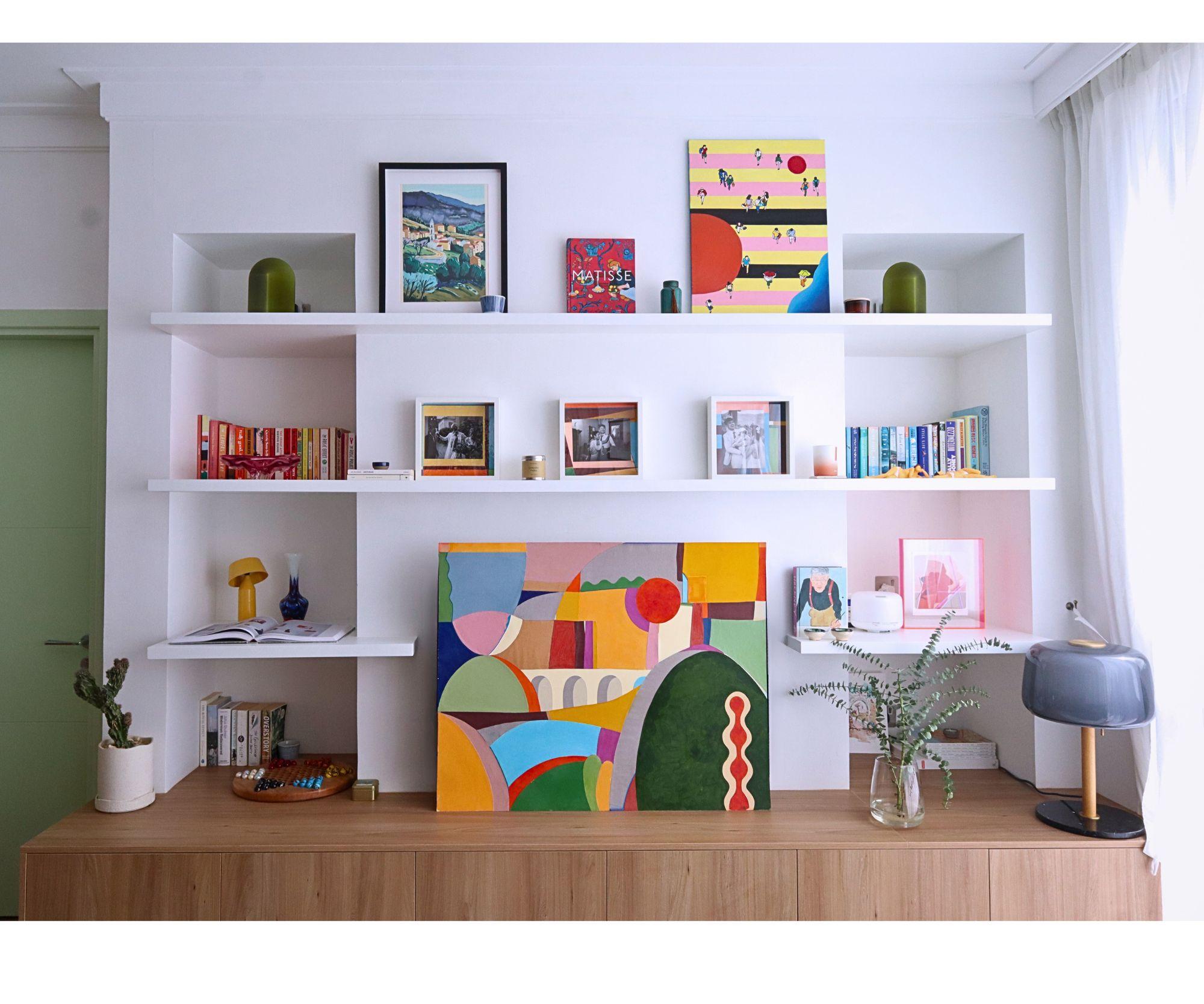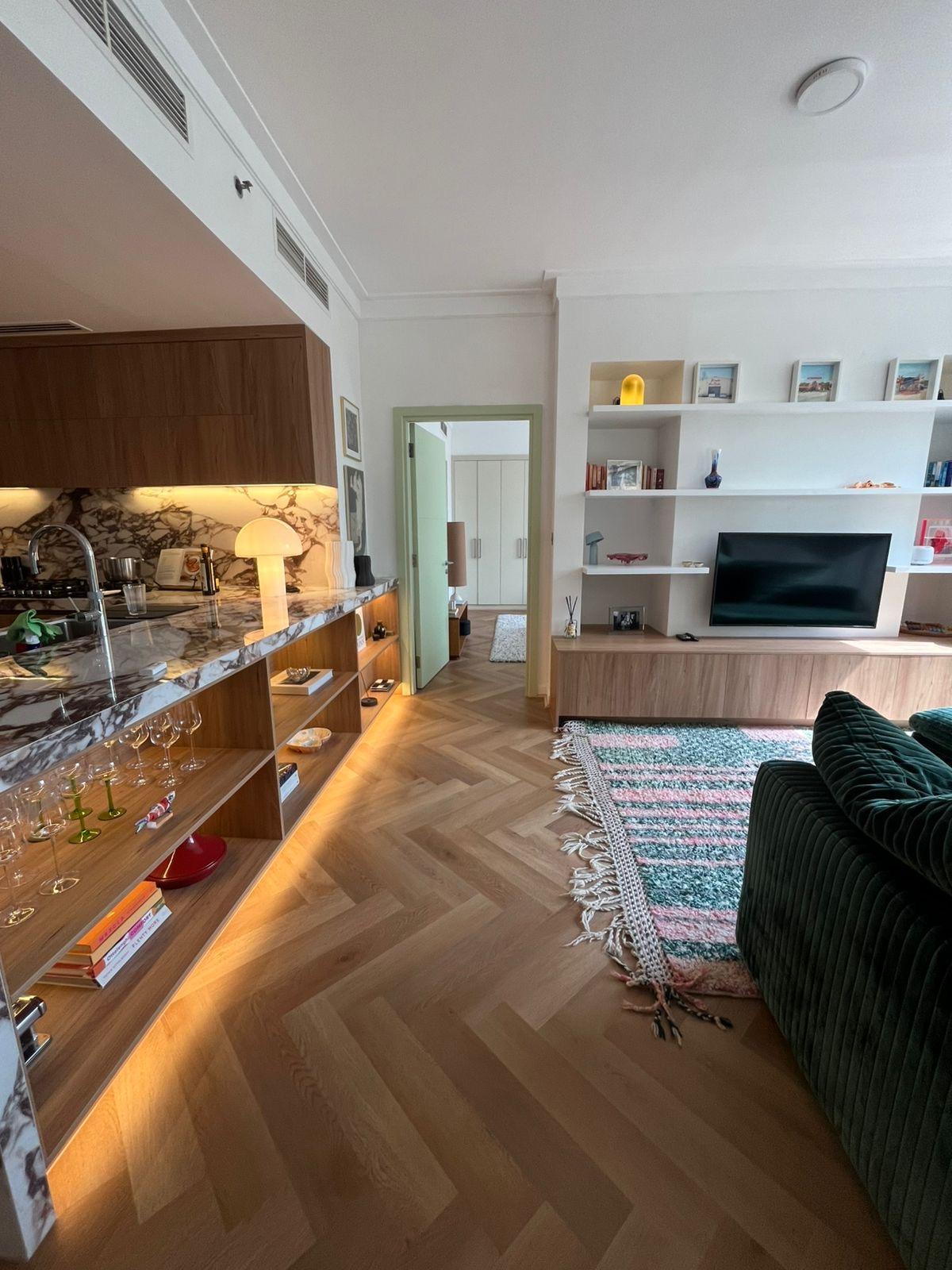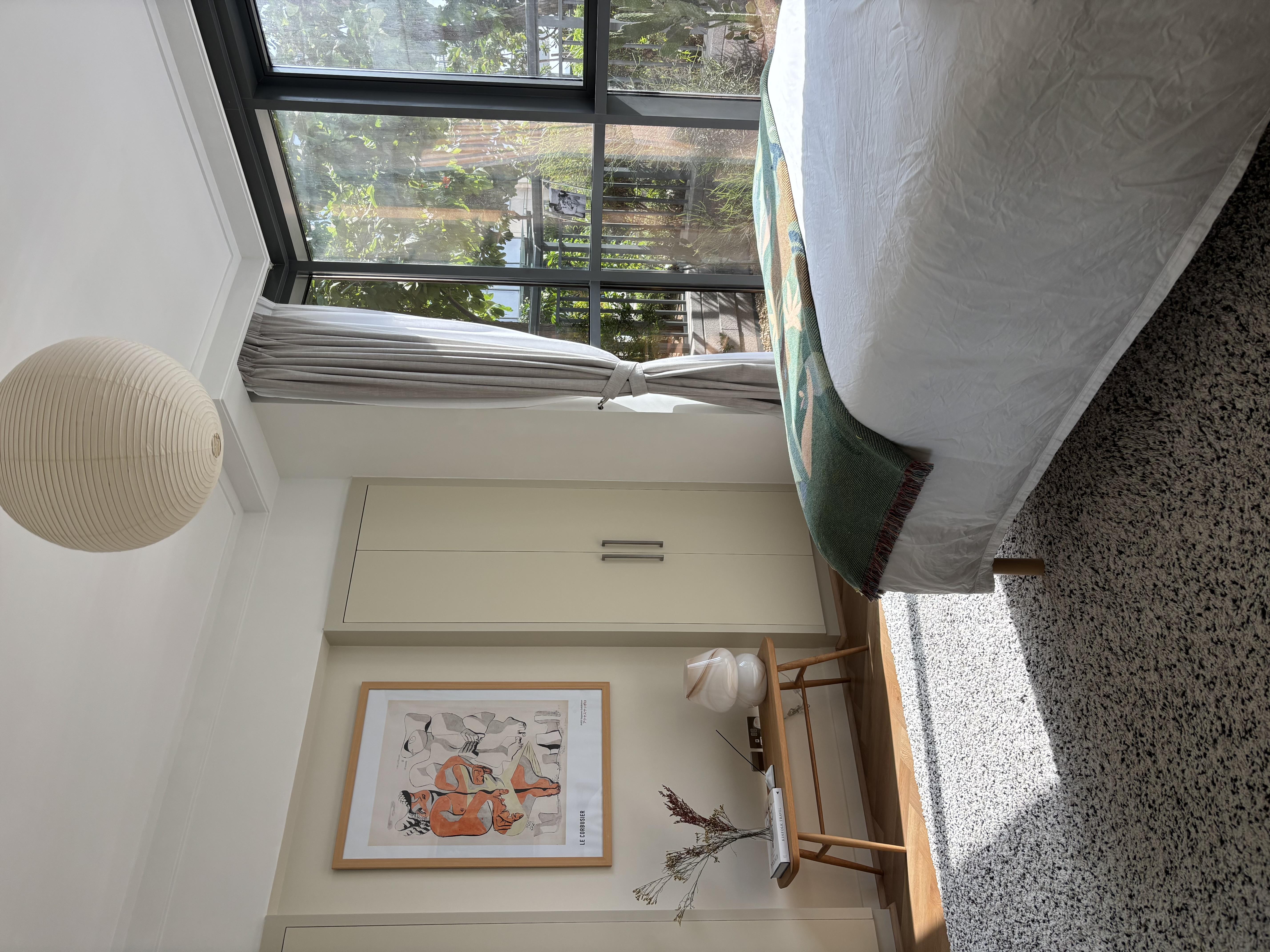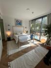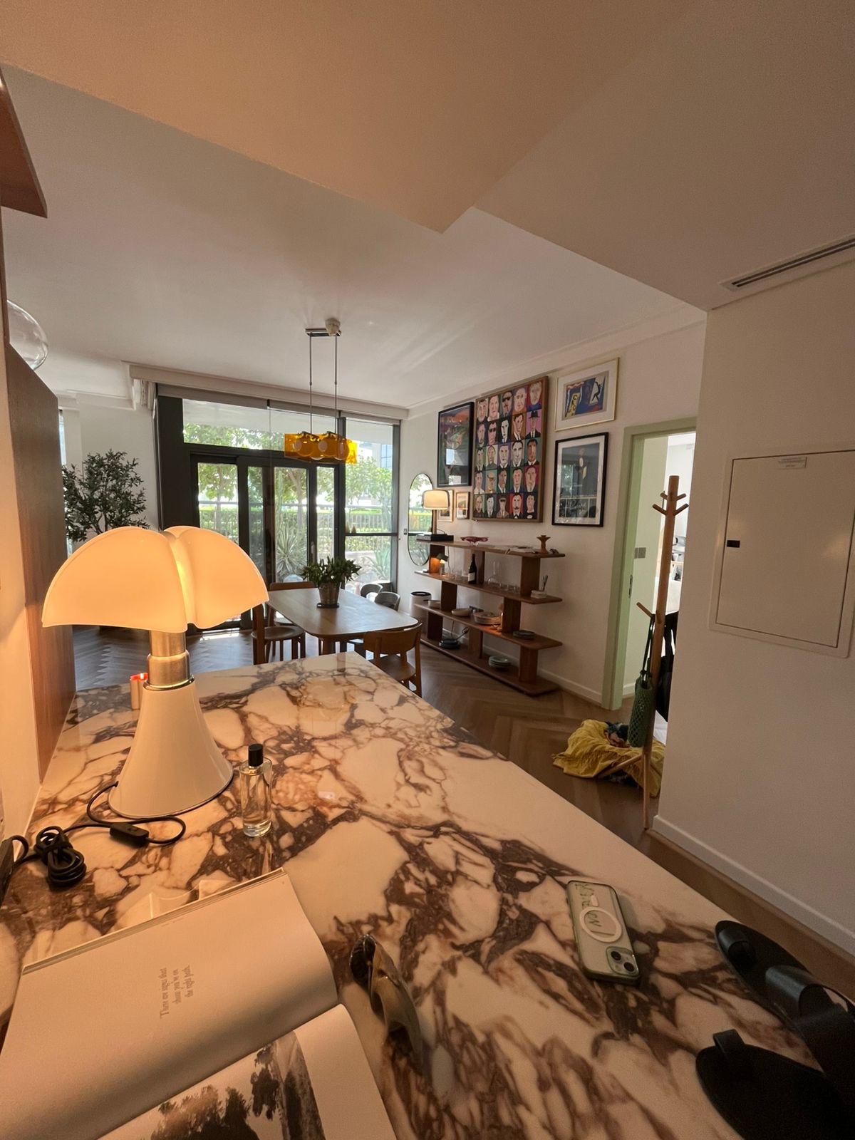 The apartment has a vibrant atmosphere, adorned with artworks and lively décor. Natural light floods the space through expansive floor-to-ceiling windows, illuminating the living room, charming dining area, and open kitchen. The bedrooms boasts tasteful decorations, adding to the overall ambiance. Furthermore, a highlight for filmmakers is the generous balcony, offering ample outdoor seating amidst lush greenery, providing an ideal setting for captivating scenes.