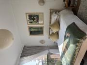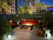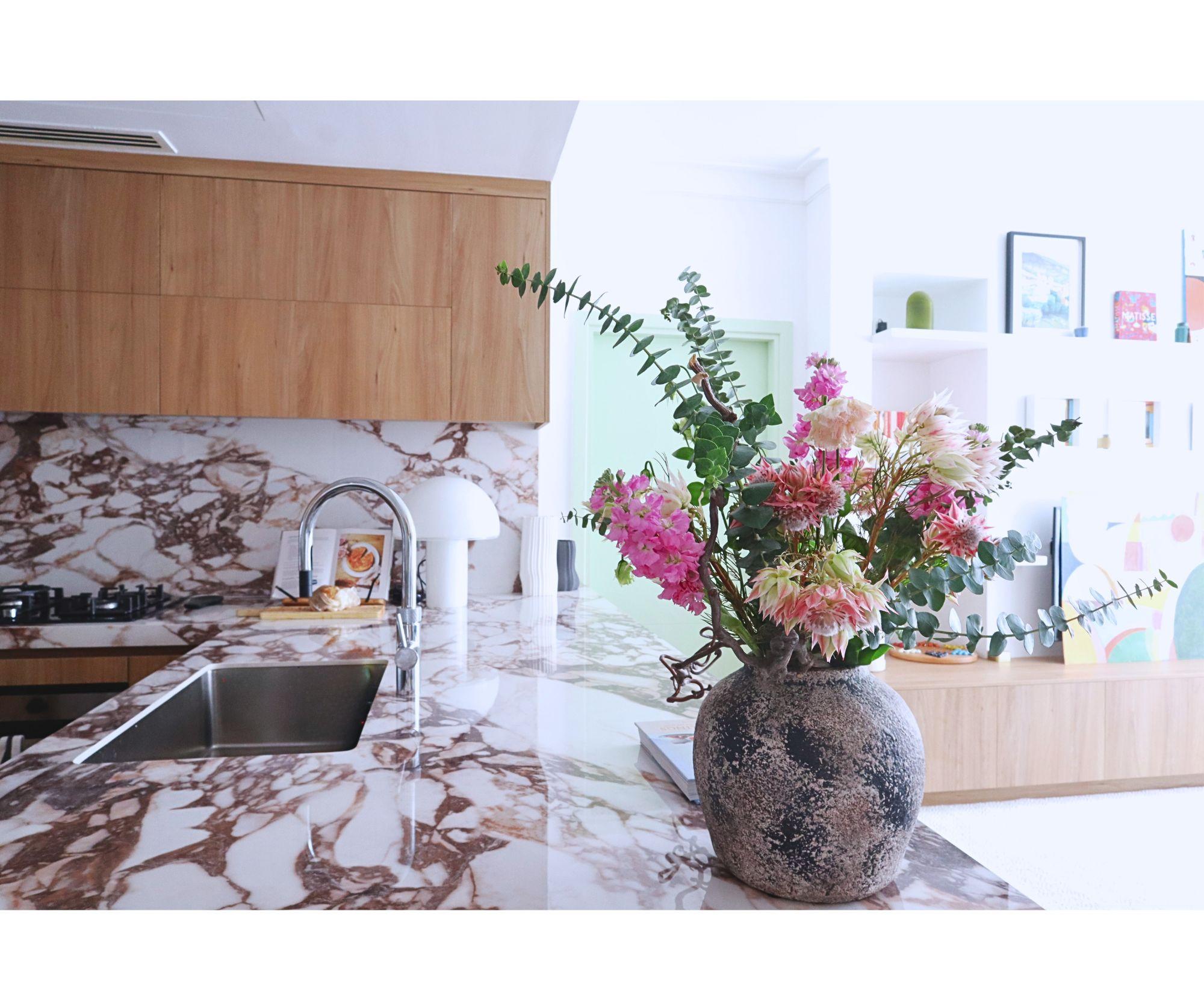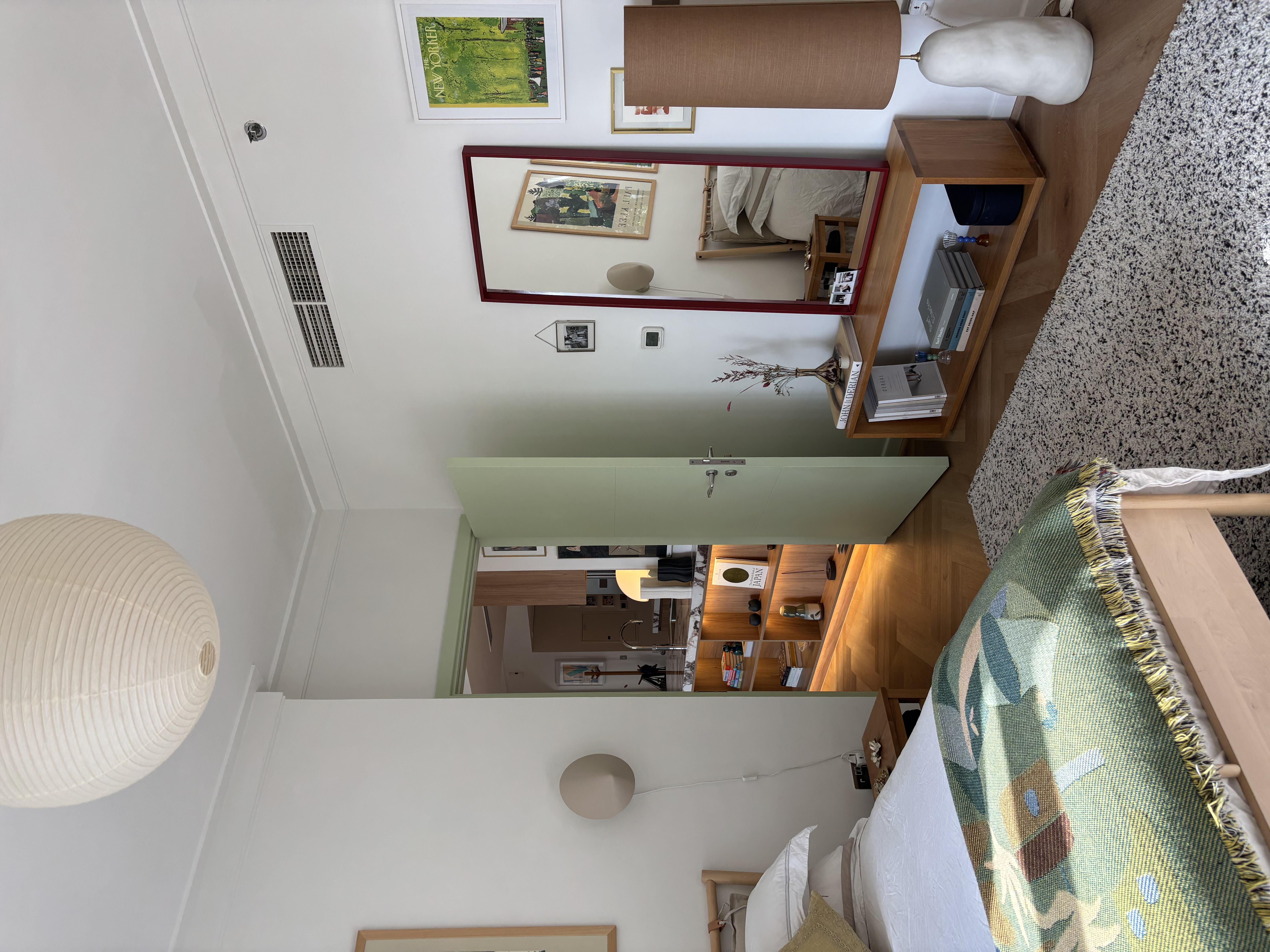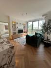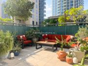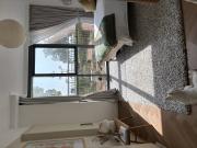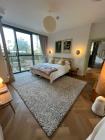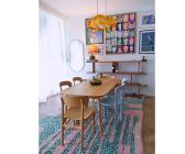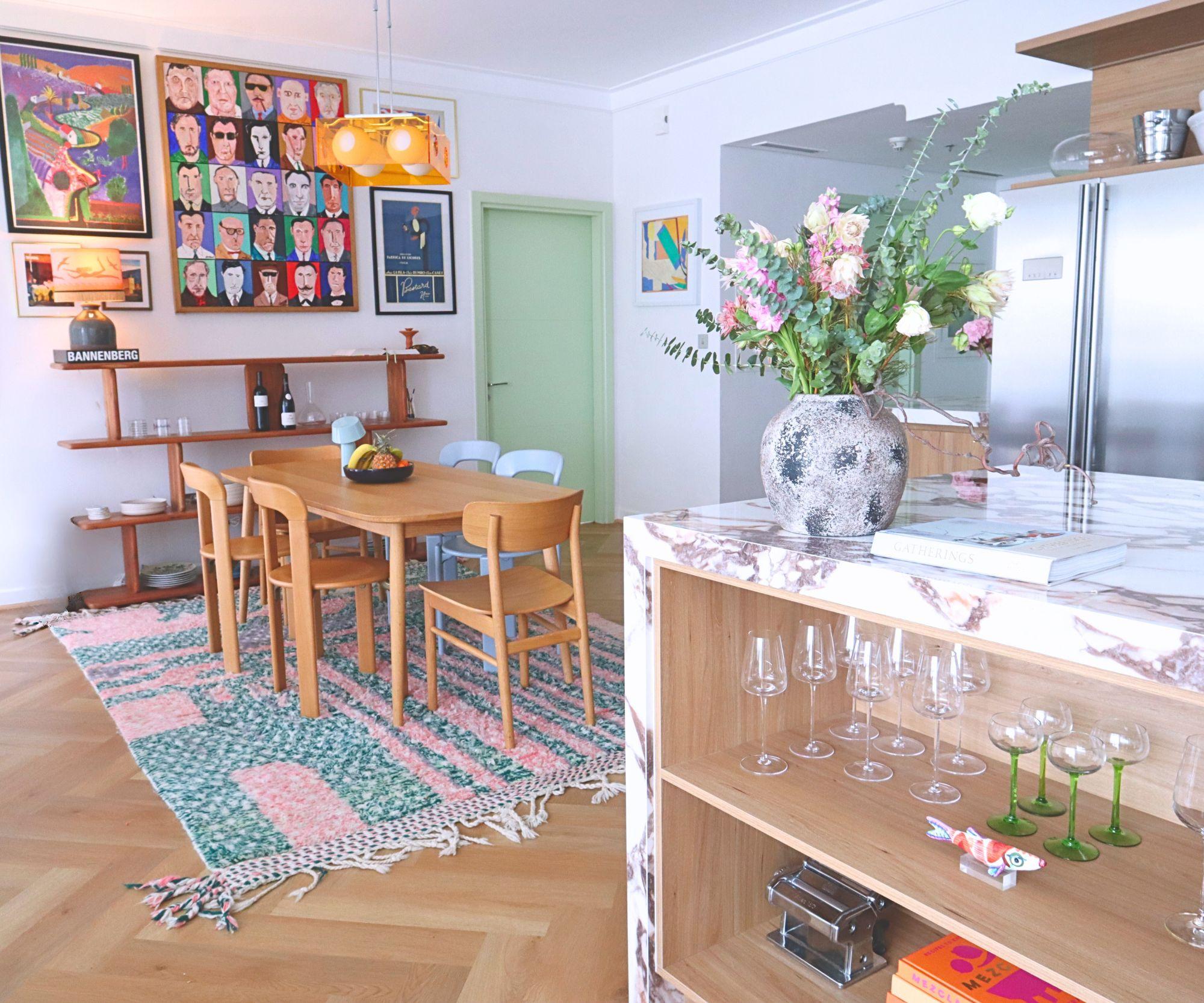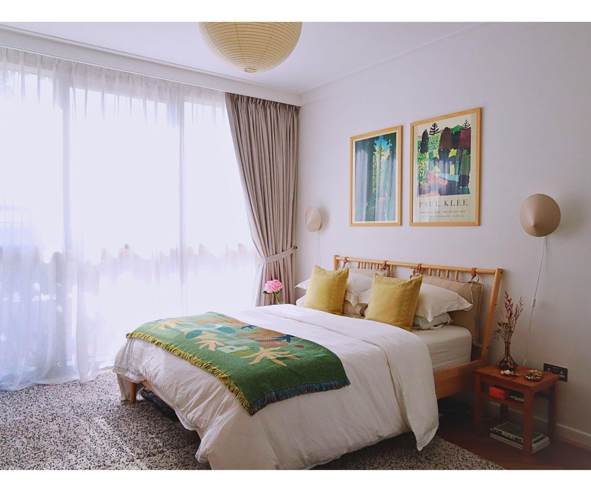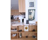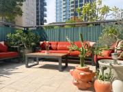 The apartment has a vibrant atmosphere, adorned with artworks and lively décor. Natural light floods the space through expansive floor-to-ceiling windows, illuminating the living room, charming dining area, and open kitchen. The bedrooms boasts tasteful decorations, adding to the overall ambiance. Furthermore, a highlight for filmmakers is the generous balcony, offering ample outdoor seating amidst lush greenery, providing an ideal setting for captivating scenes.