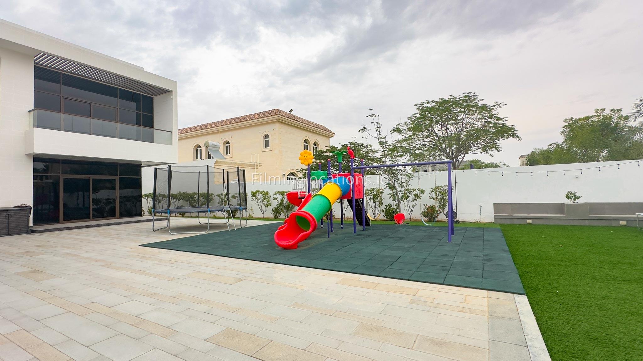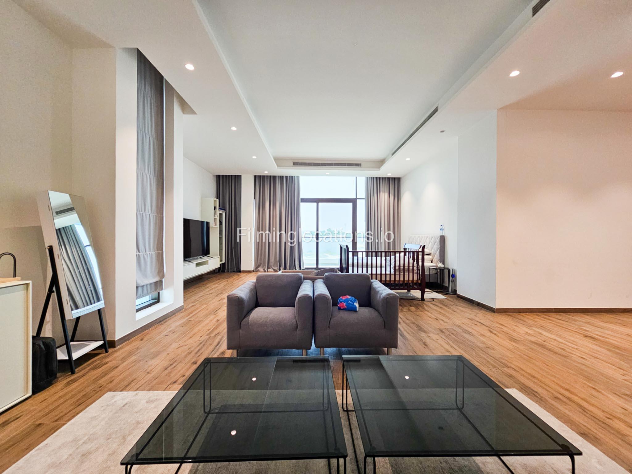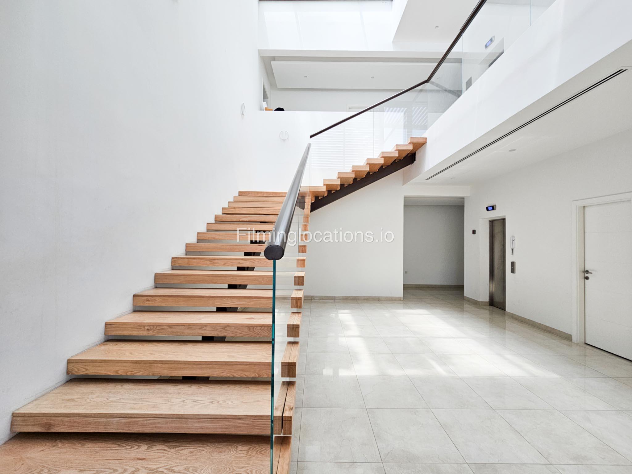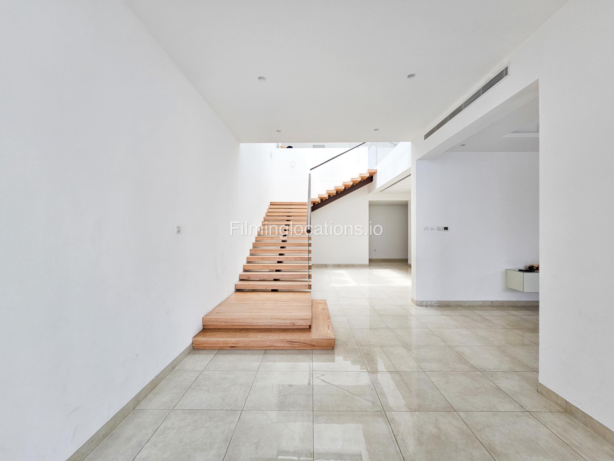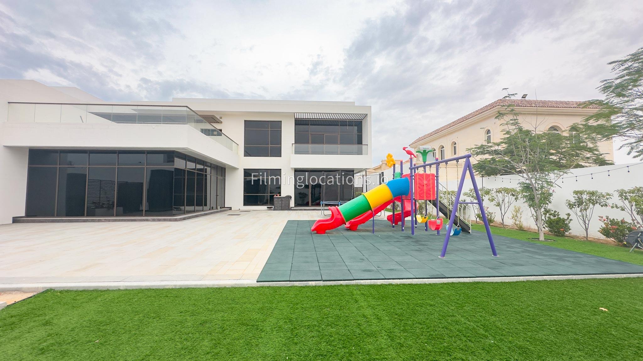 Our villa boasts a modern design featuring four bedrooms,a spacious living room and a striking wooden staircase, perfect for cinematic shots. The modern kitchen is sleek and well-equipped. Additionally, there is a private elevator. The terrace offers scenic views, perfect for capturing various moods on film. Outside, there's a playground ideal for family scenes. A large garage accommodates cars and equipment.