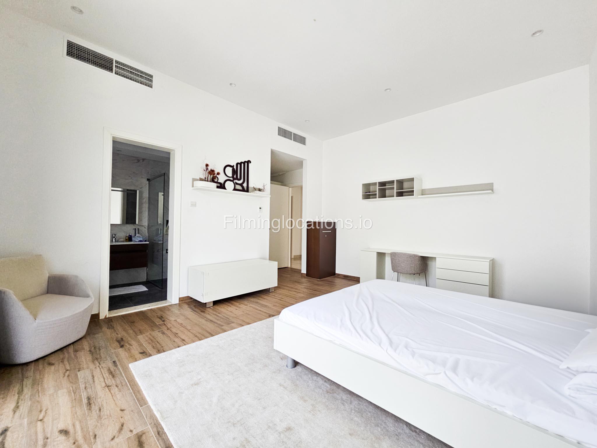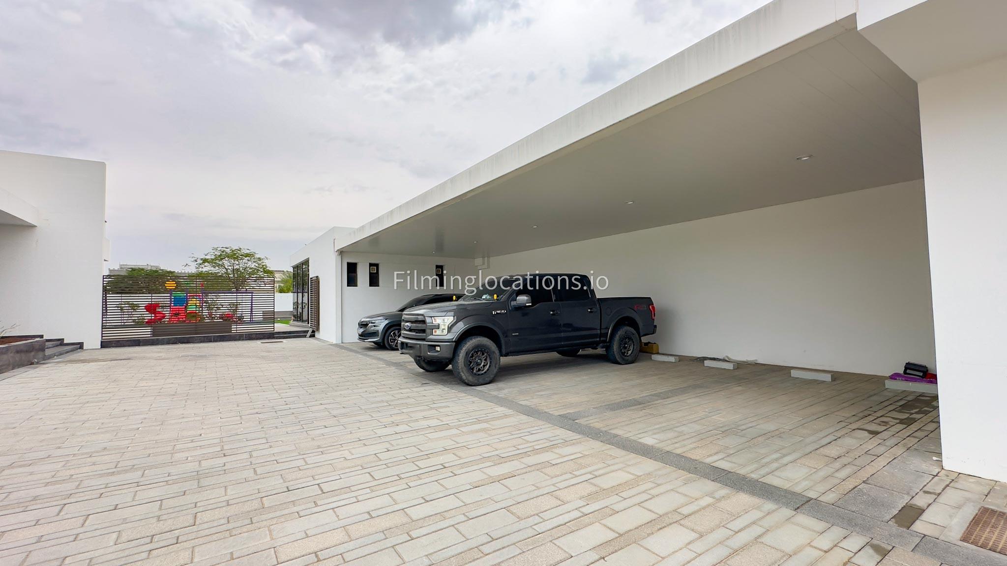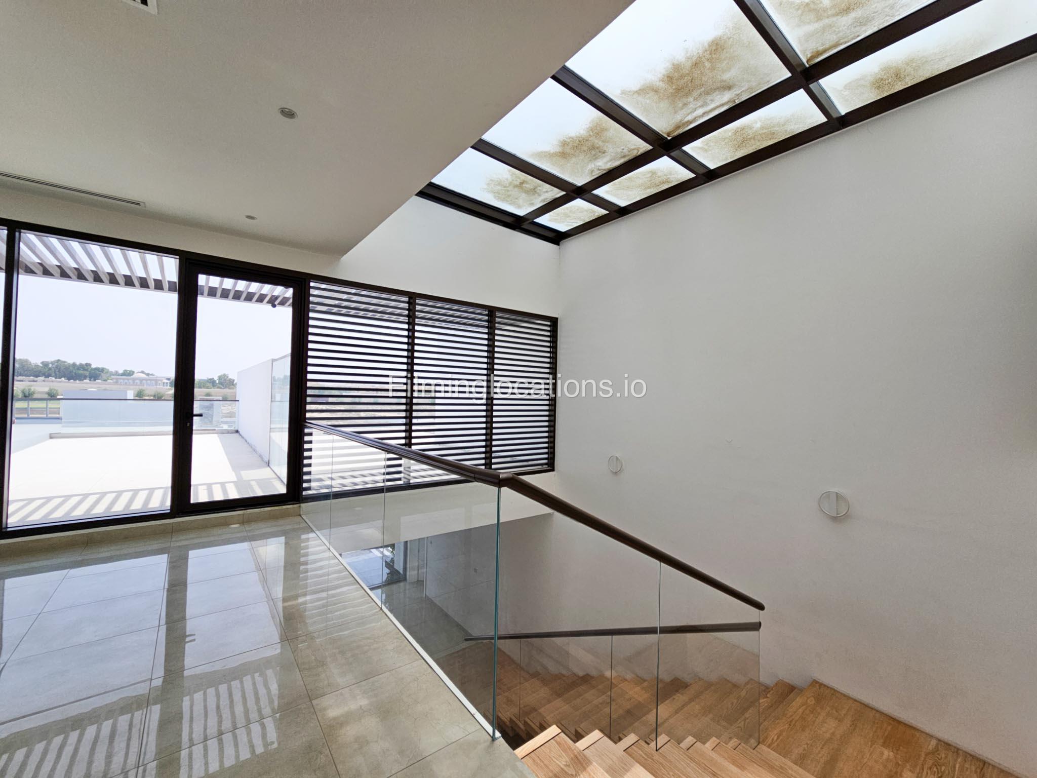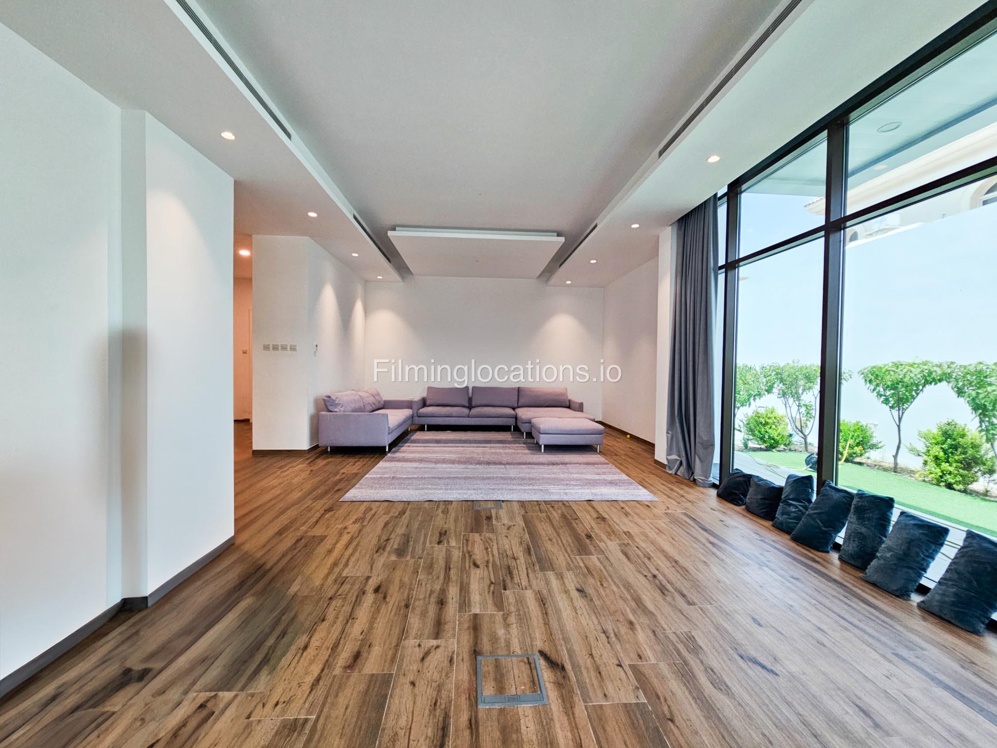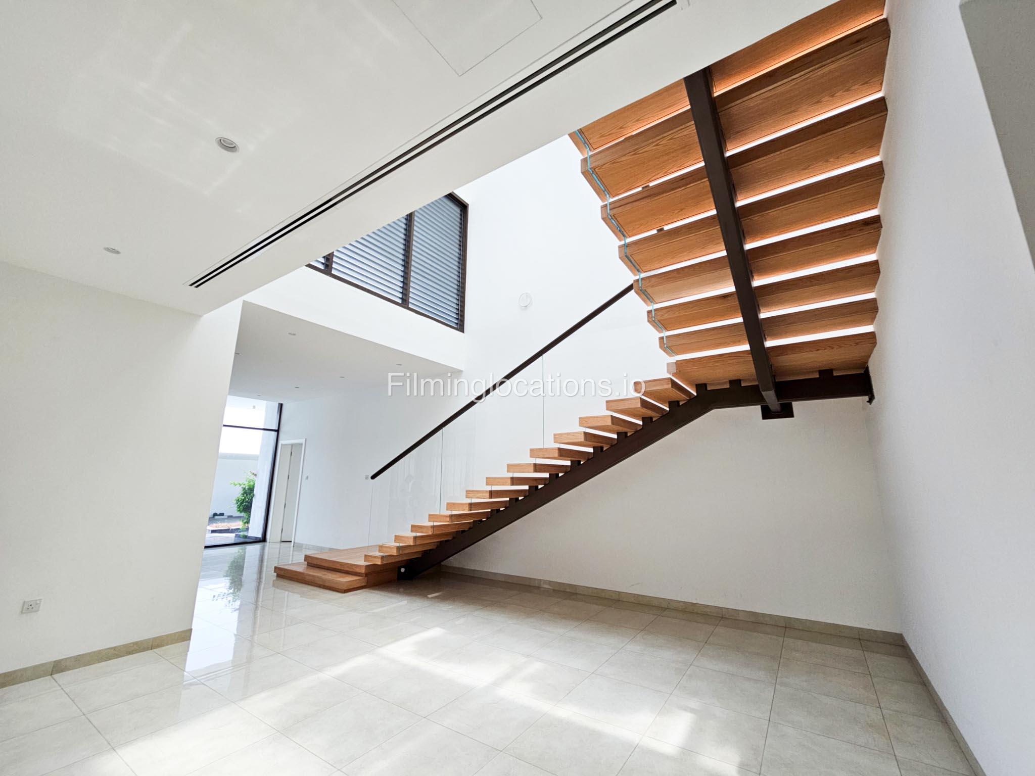 Our villa boasts a modern design featuring four bedrooms,a spacious living room and a striking wooden staircase, perfect for cinematic shots. The modern kitchen is sleek and well-equipped. Additionally, there is a private elevator. The terrace offers scenic views, perfect for capturing various moods on film. Outside, there's a playground ideal for family scenes. A large garage accommodates cars and equipment.