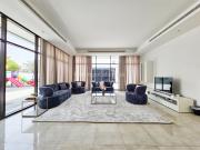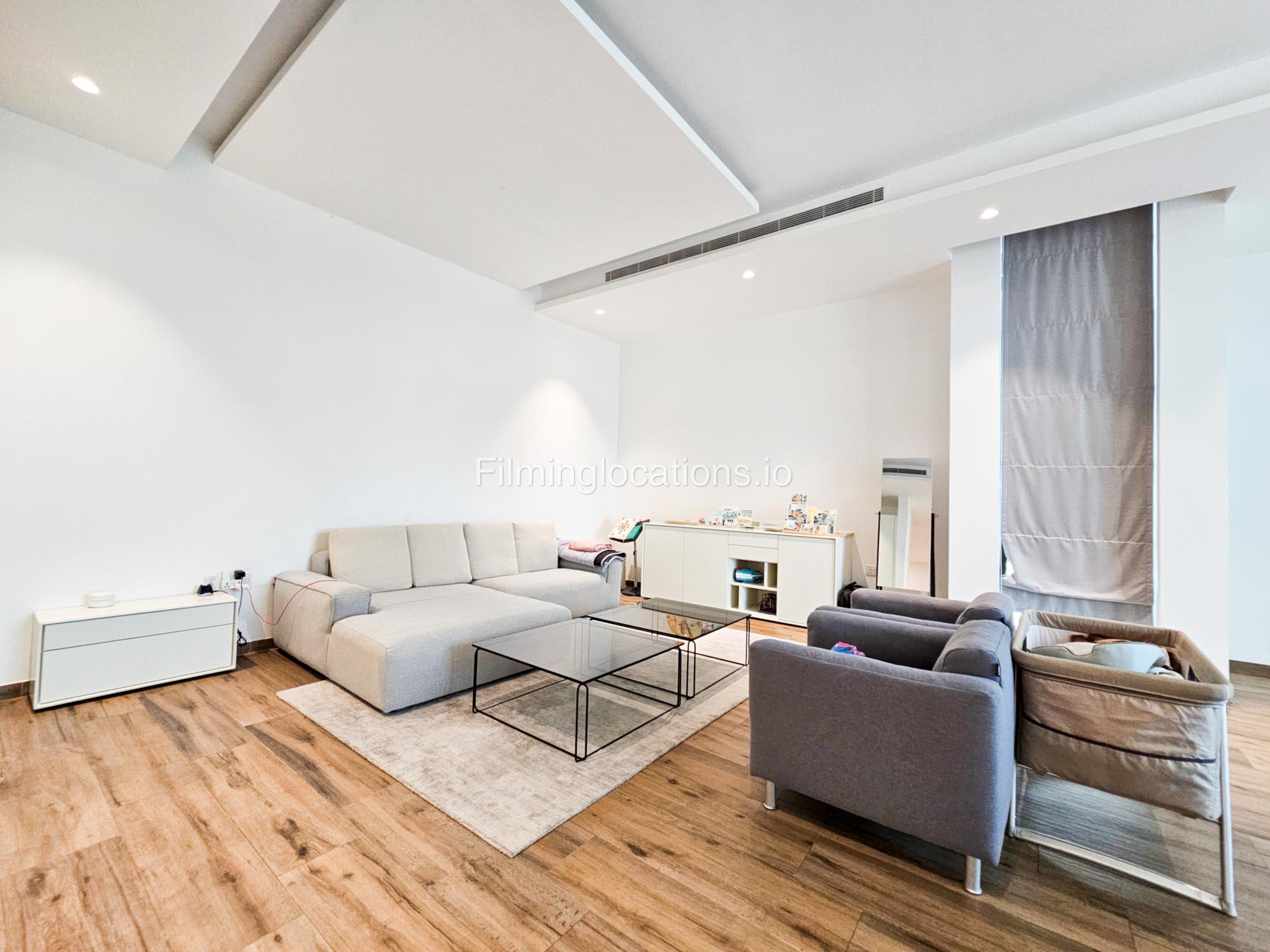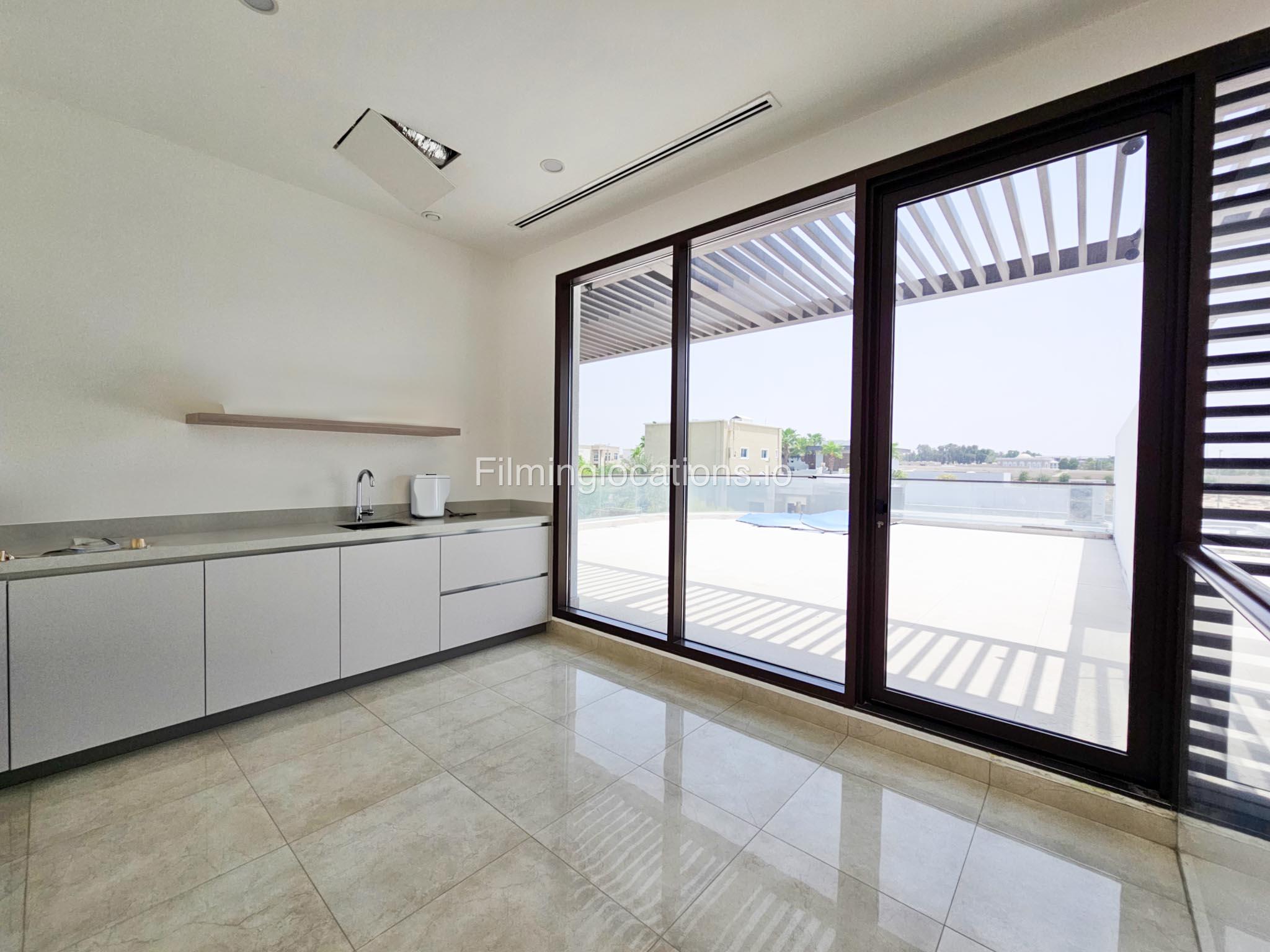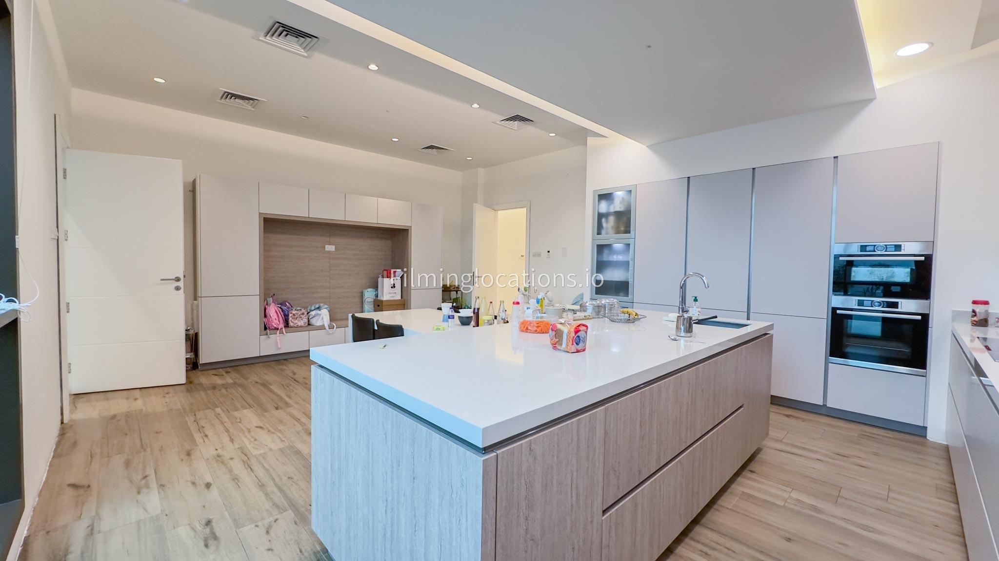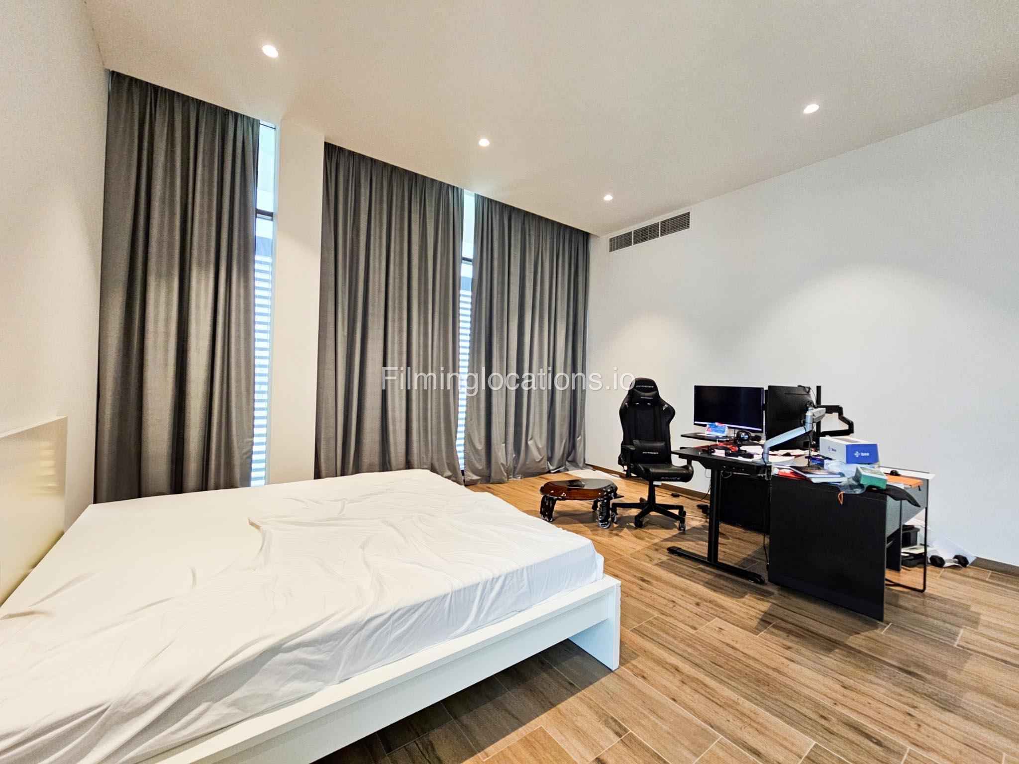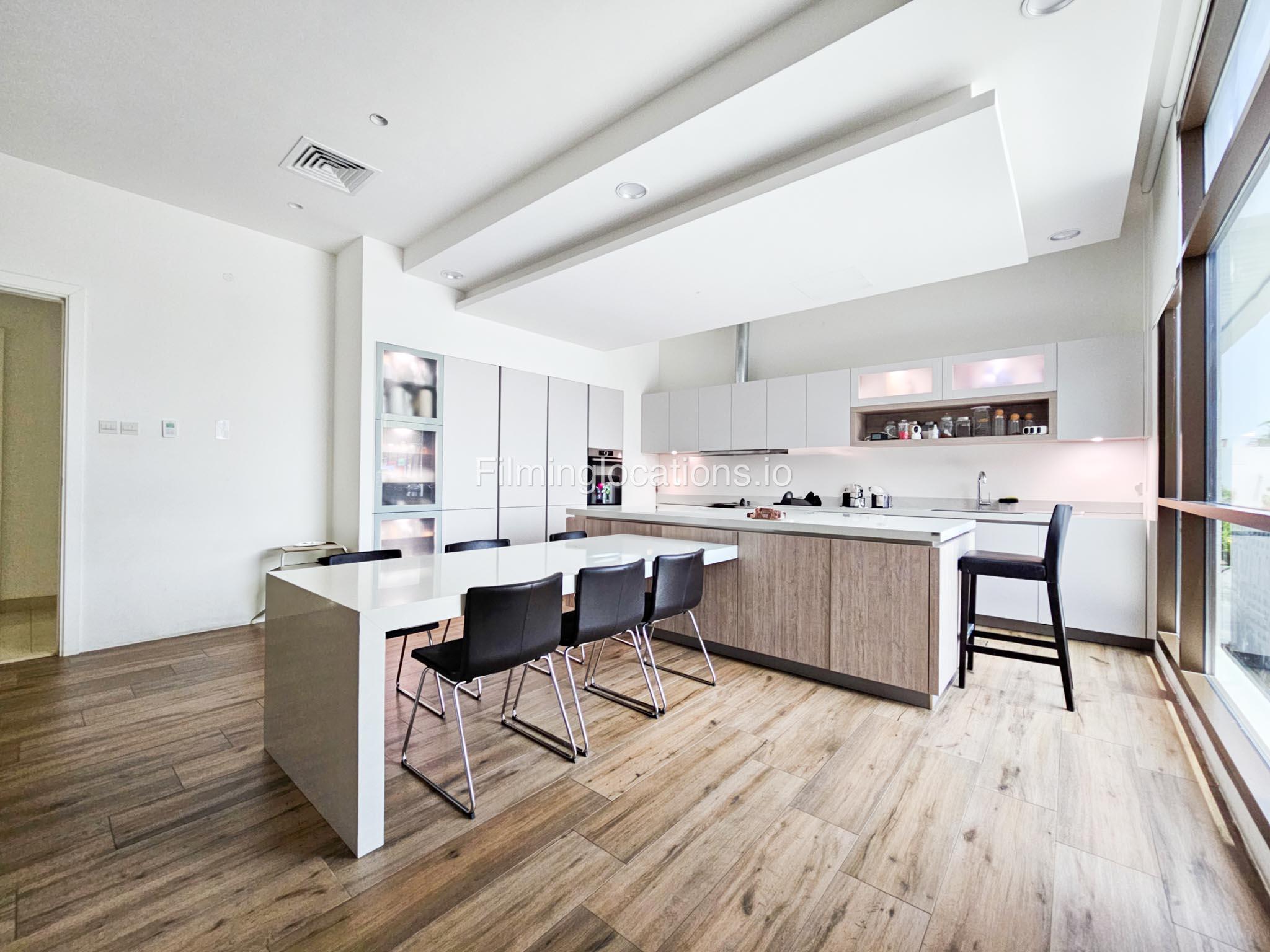 Our villa boasts a modern design featuring four bedrooms,a spacious living room and a striking wooden staircase, perfect for cinematic shots. The modern kitchen is sleek and well-equipped. Additionally, there is a private elevator. The terrace offers scenic views, perfect for capturing various moods on film. Outside, there's a playground ideal for family scenes. A large garage accommodates cars and equipment.