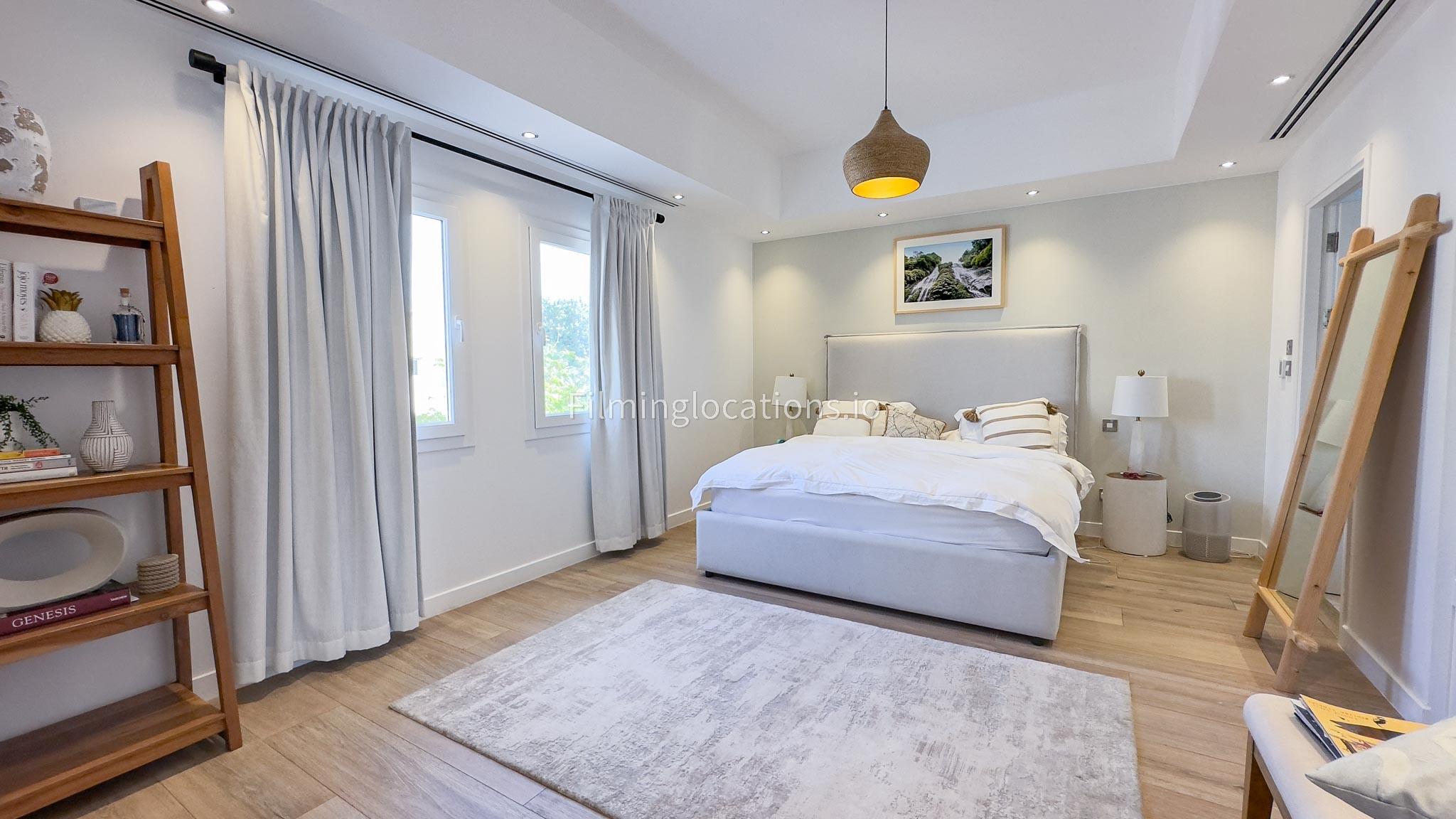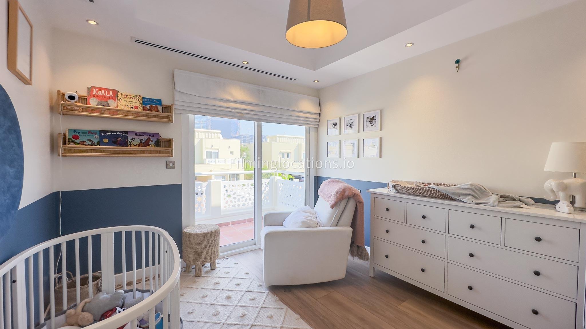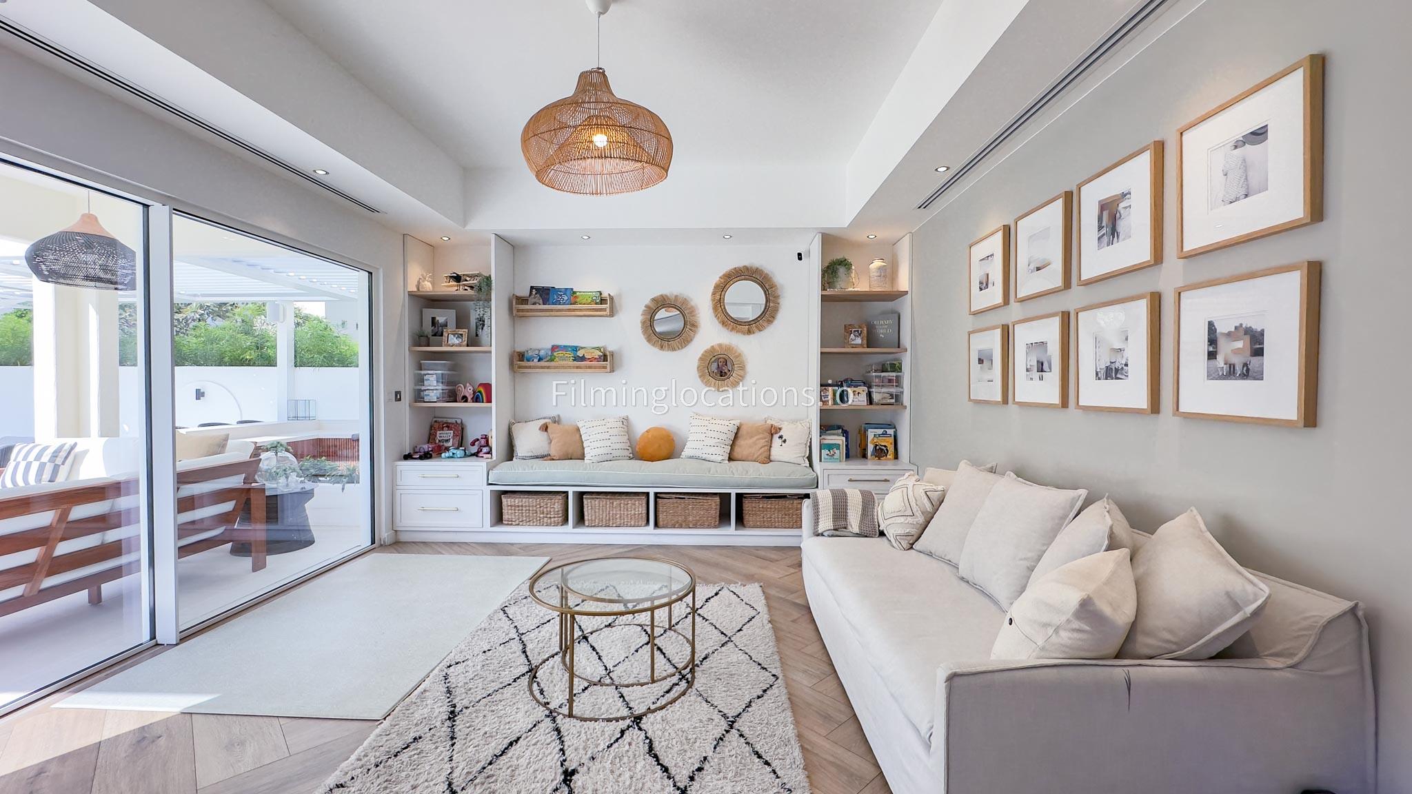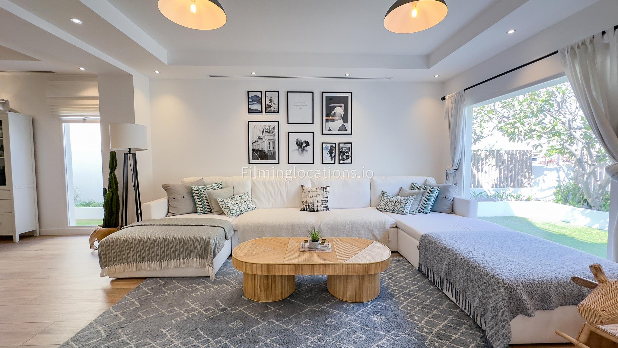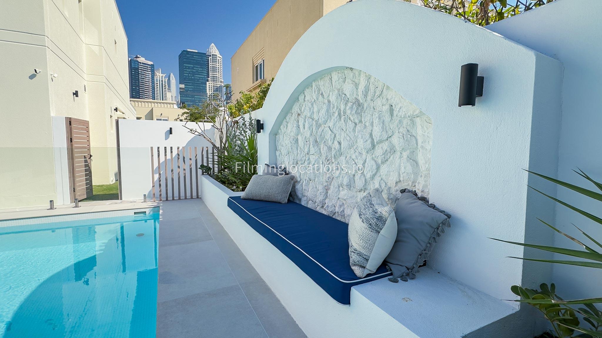 Our villa has an elegant and spacious living room with a beautiful blend of white and wood furniture. Additionally, there is a living room near the open kitchen with bohemian style décor. There is a beautiful bedroom with a spacious balcony and a nursery on the upper floor. The backyard is a reflection of luxury with the pristine pool and patio furnishings making it perfect for any outdoor scenes.