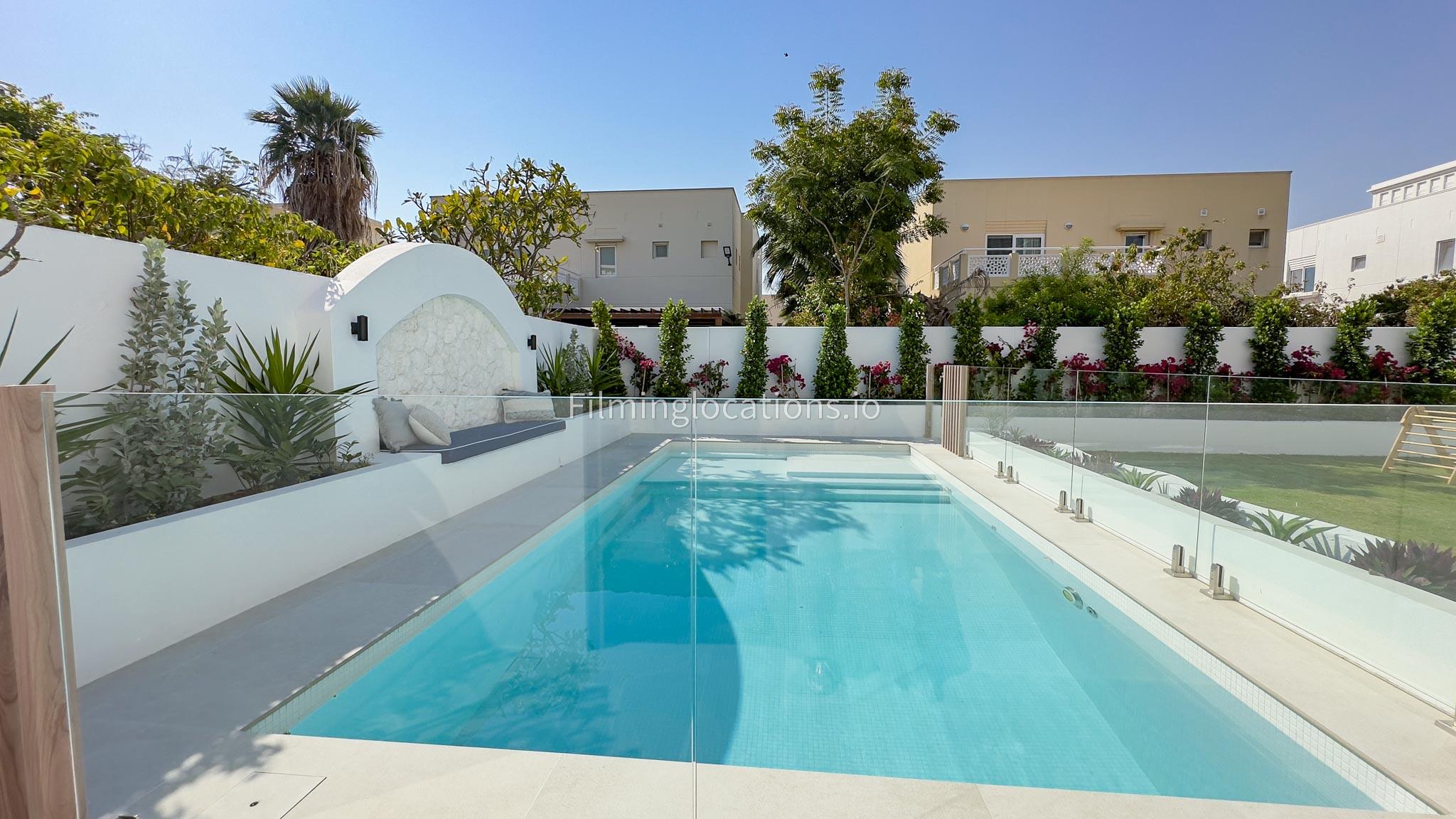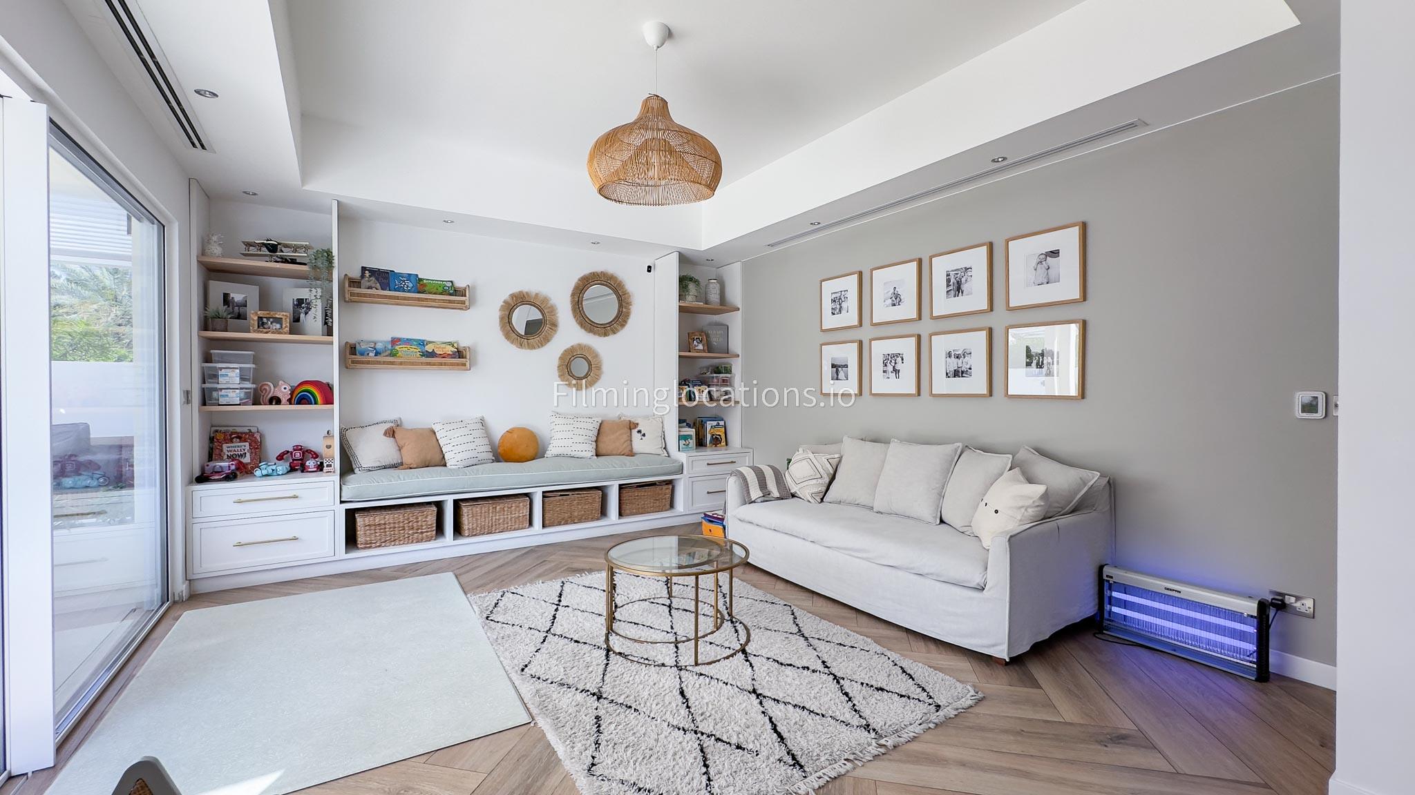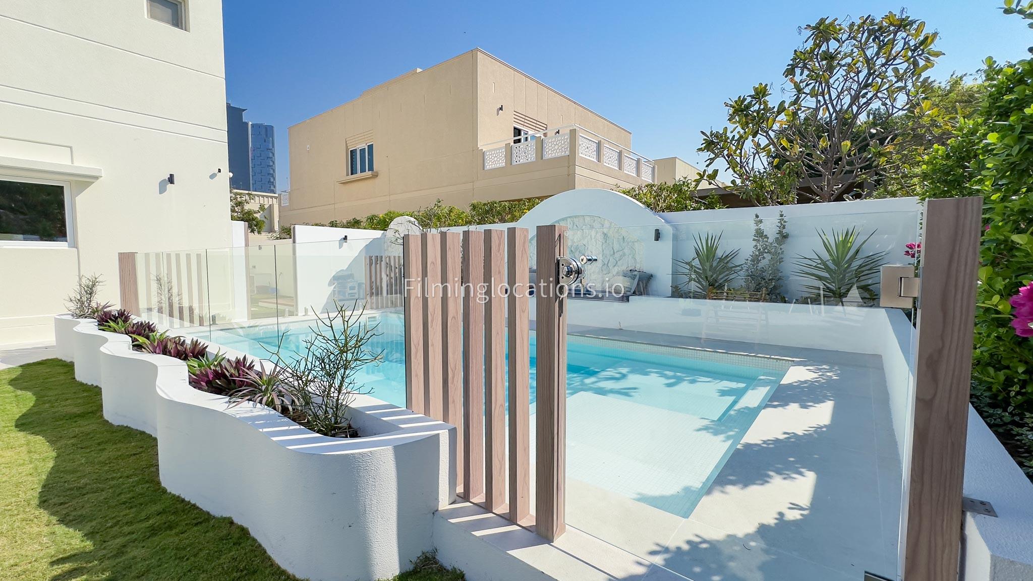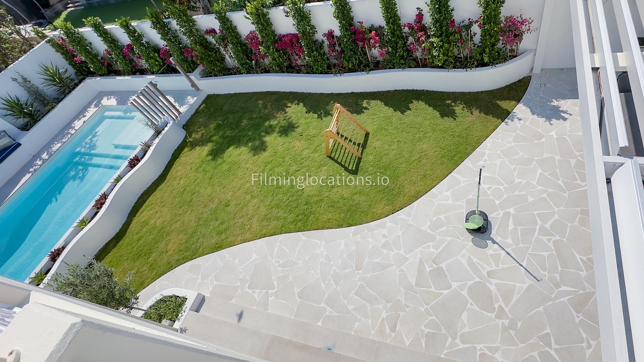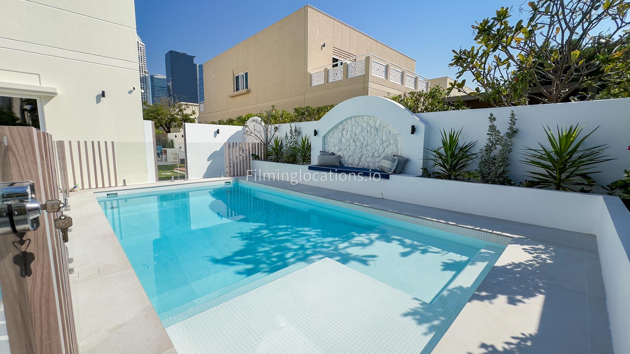 Our villa has an elegant and spacious living room with a beautiful blend of white and wood furniture. Additionally, there is a living room near the open kitchen with bohemian style décor. There is a beautiful bedroom with a spacious balcony and a nursery on the upper floor. The backyard is a reflection of luxury with the pristine pool and patio furnishings making it perfect for any outdoor scenes.