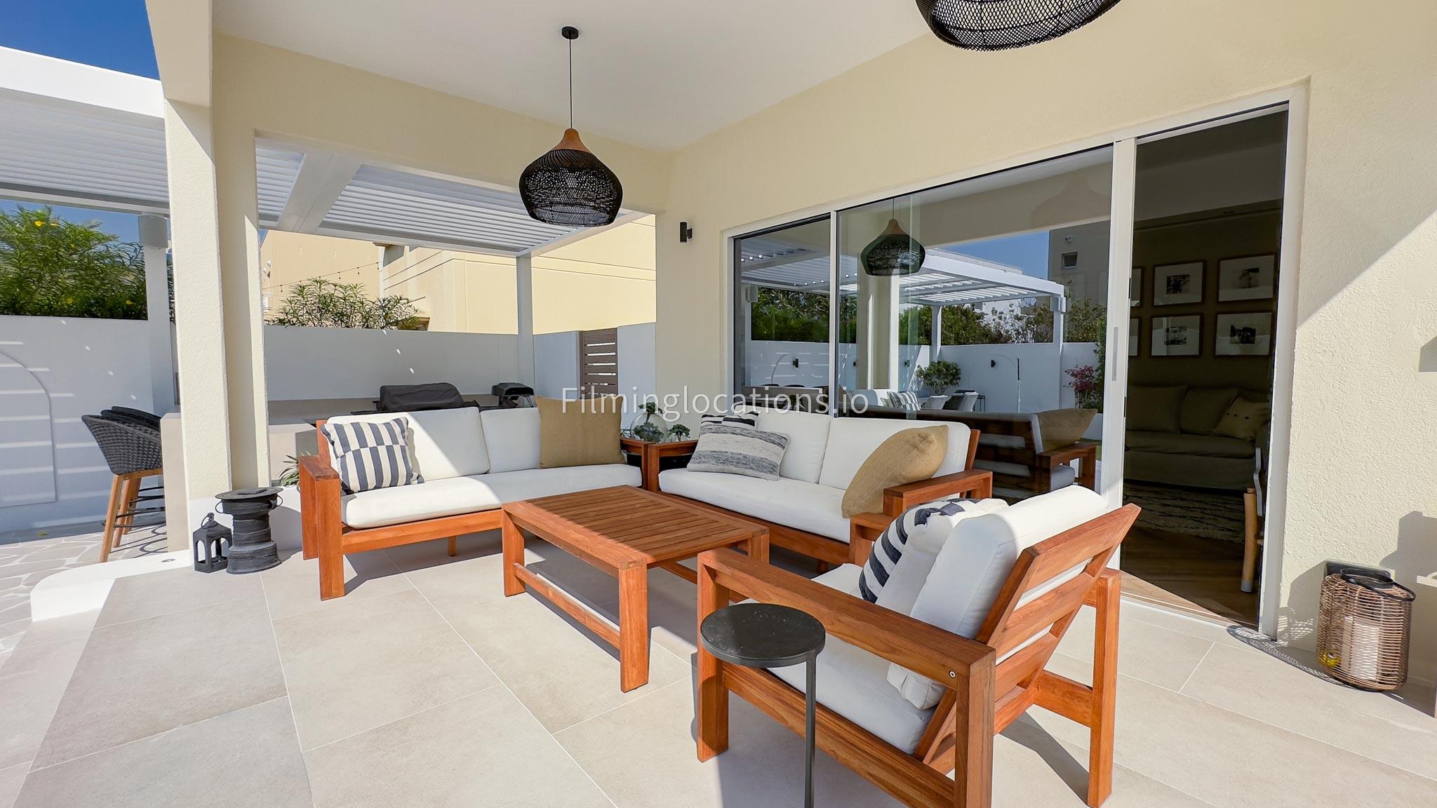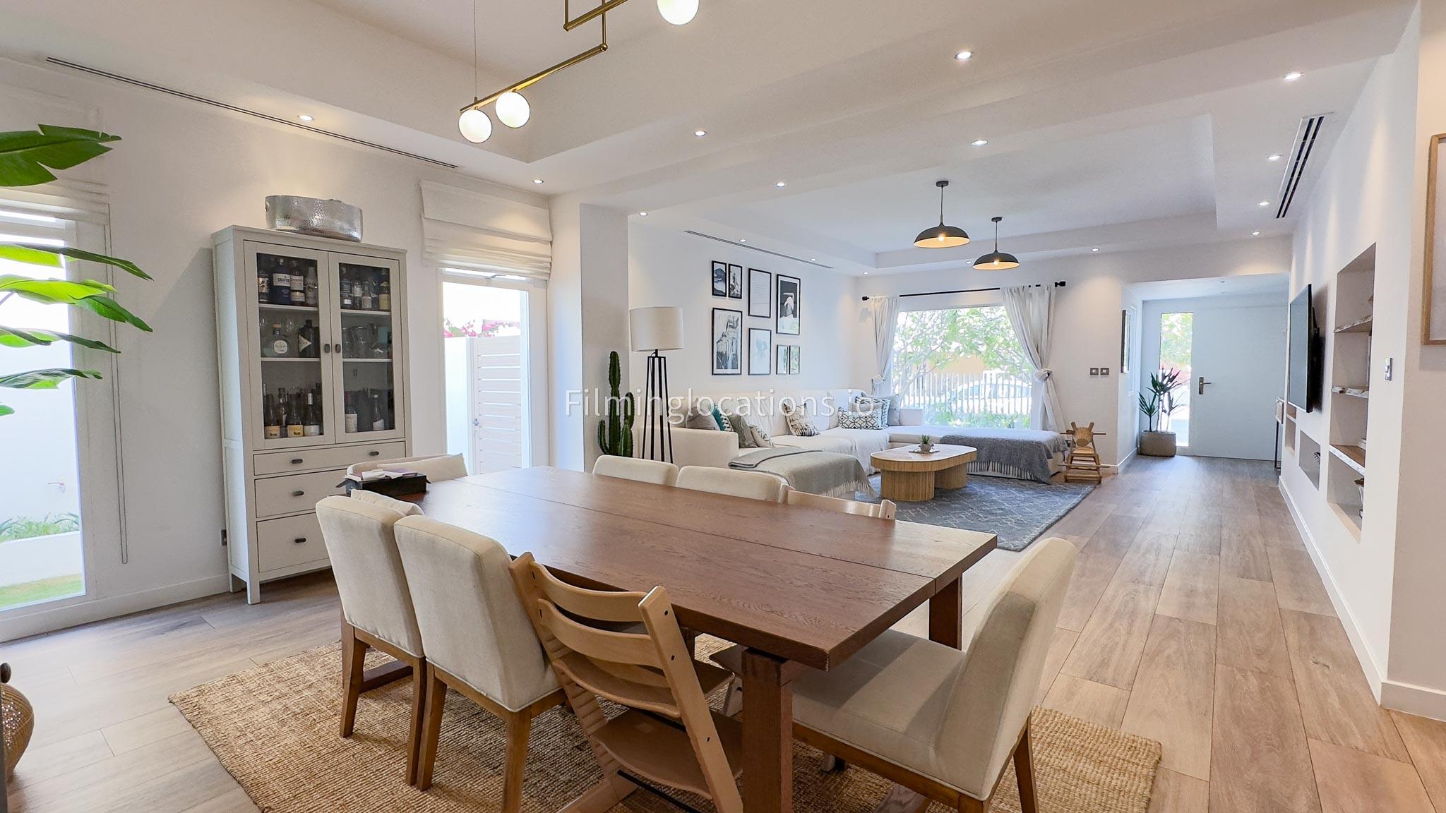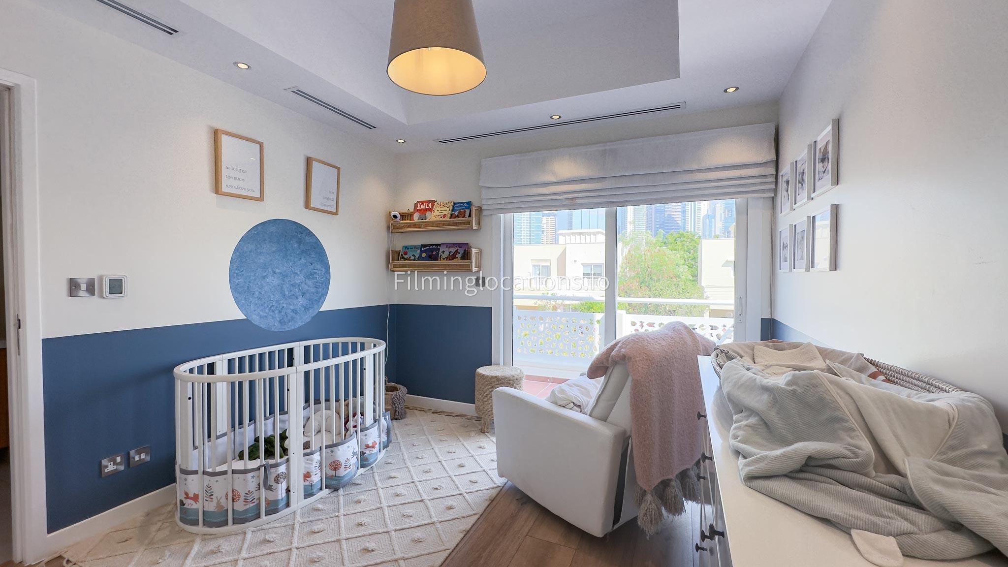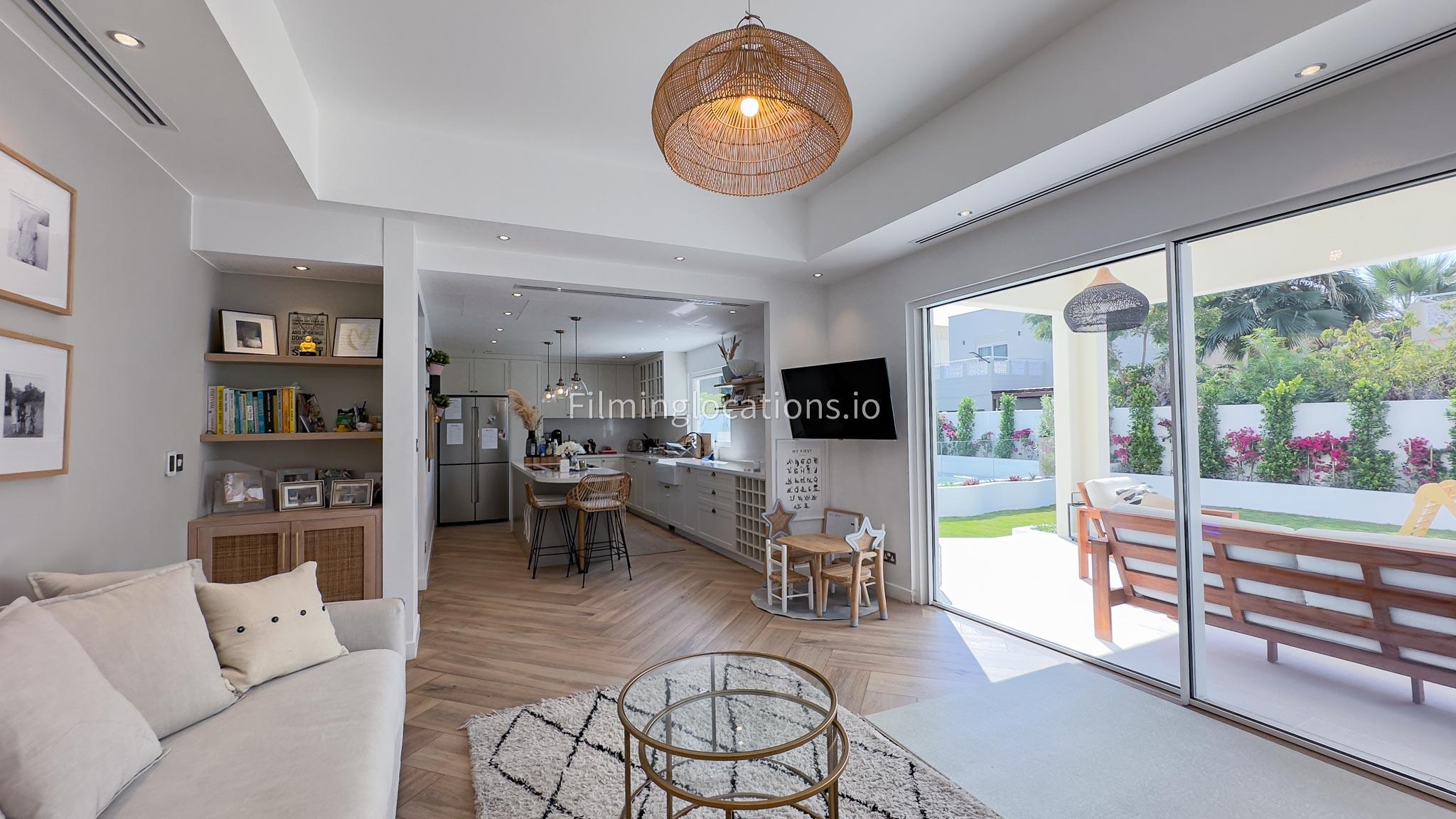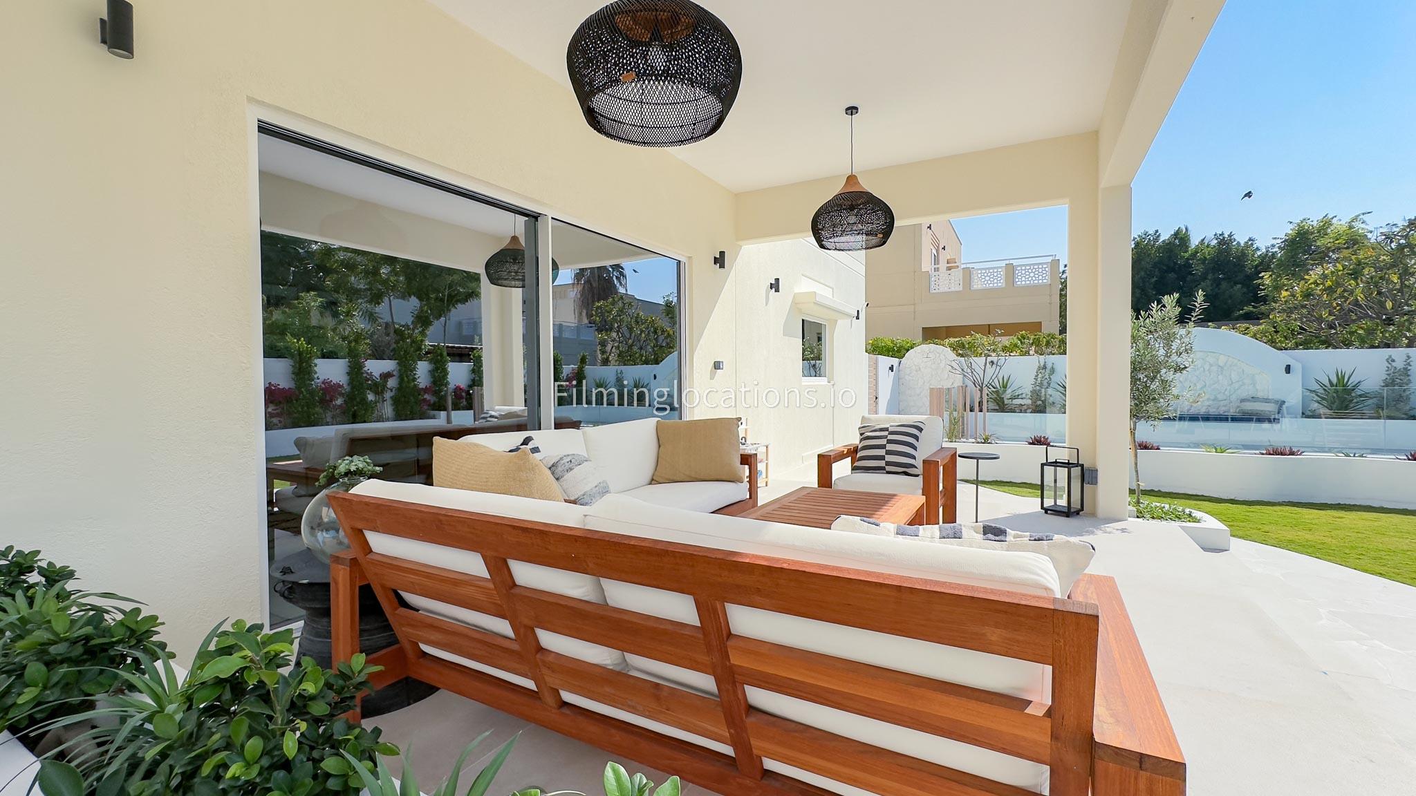 Our villa has an elegant and spacious living room with a beautiful blend of white and wood furniture. Additionally, there is a living room near the open kitchen with bohemian style décor. There is a beautiful bedroom with a spacious balcony and a nursery on the upper floor. The backyard is a reflection of luxury with the pristine pool and patio furnishings making it perfect for any outdoor scenes.