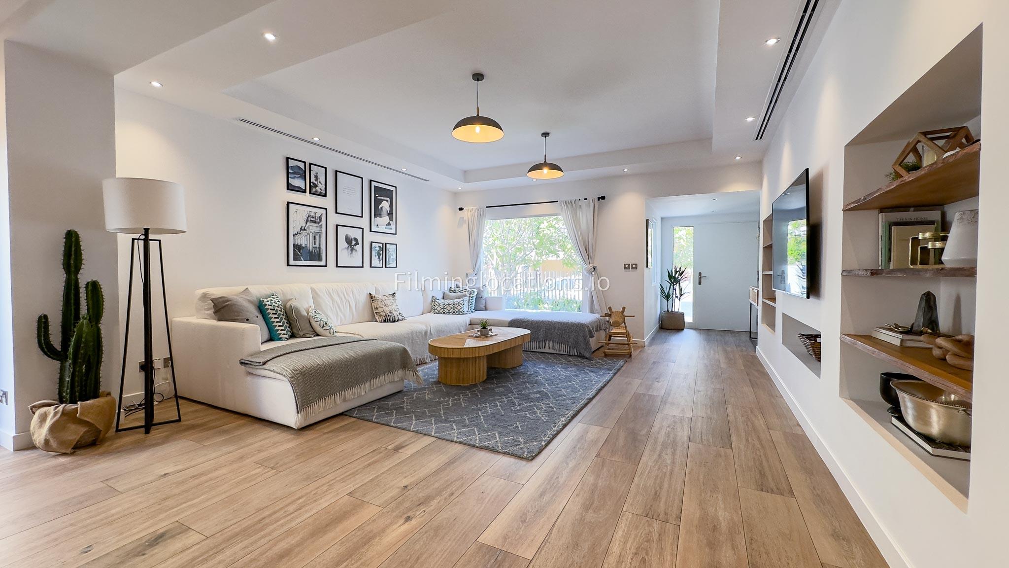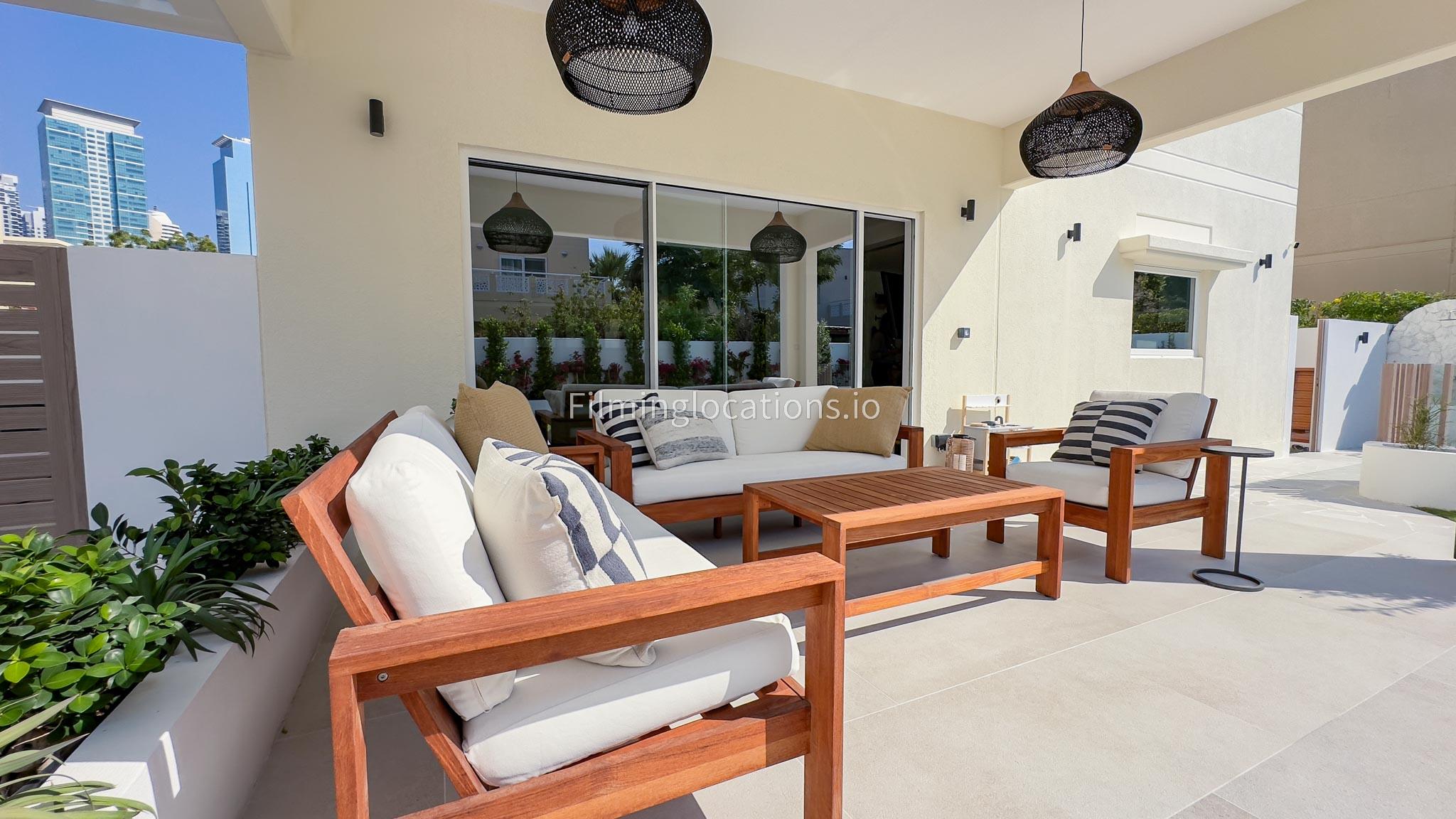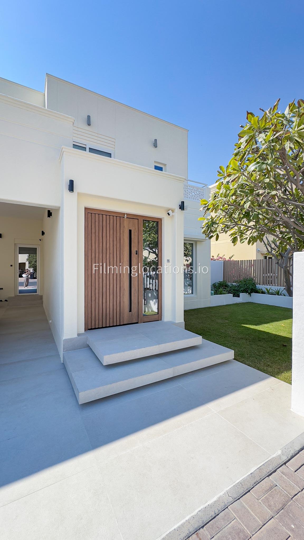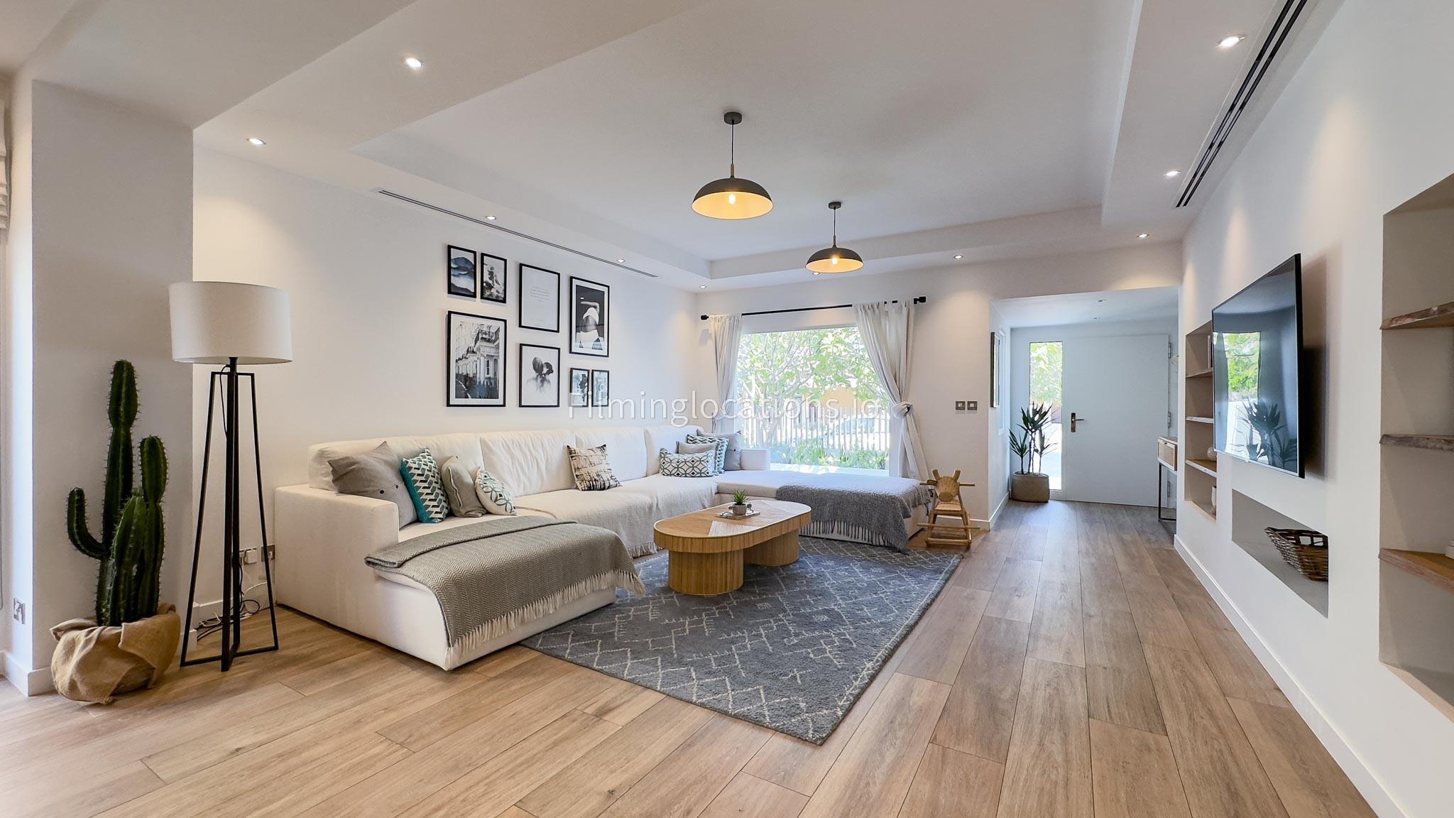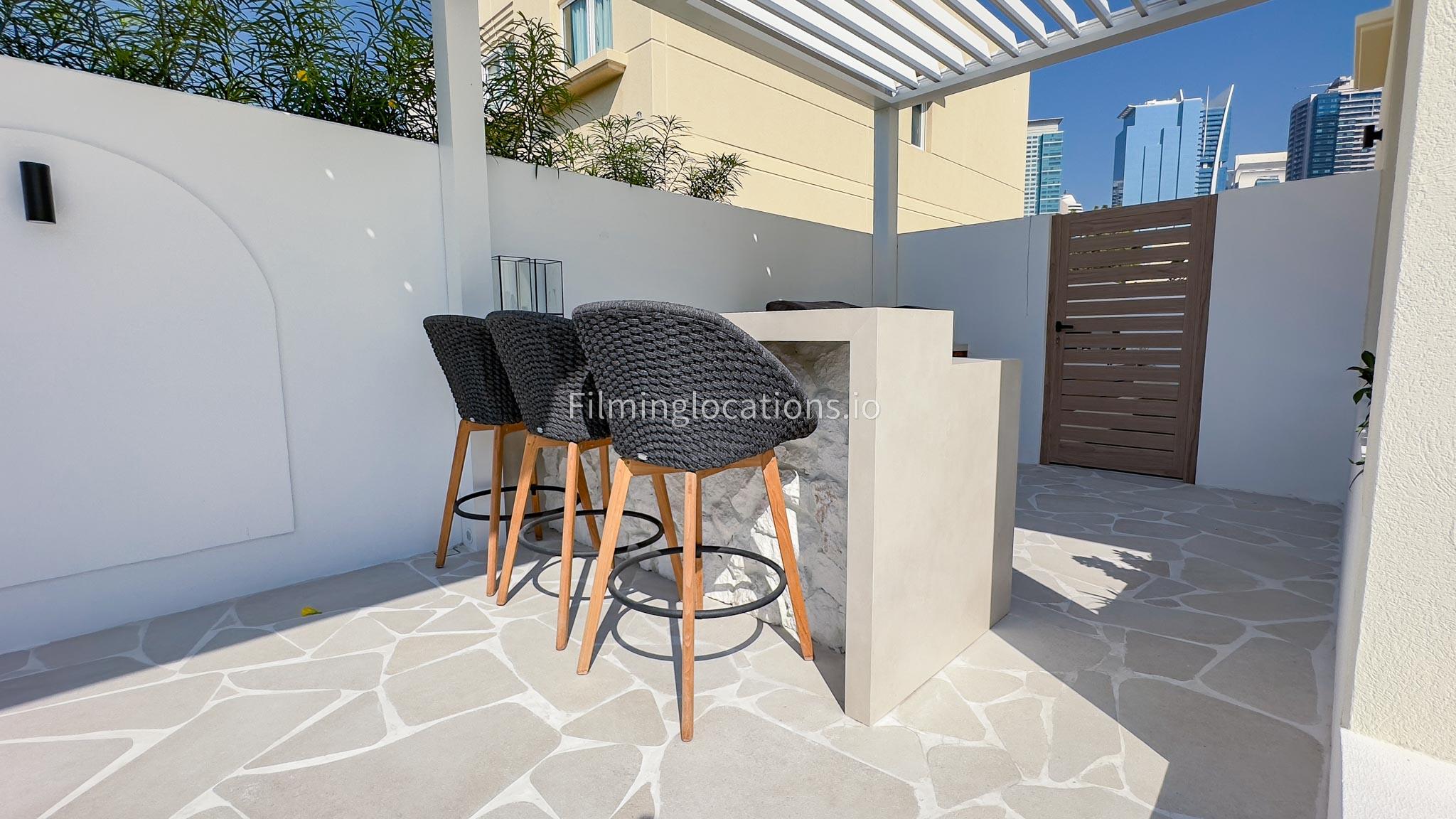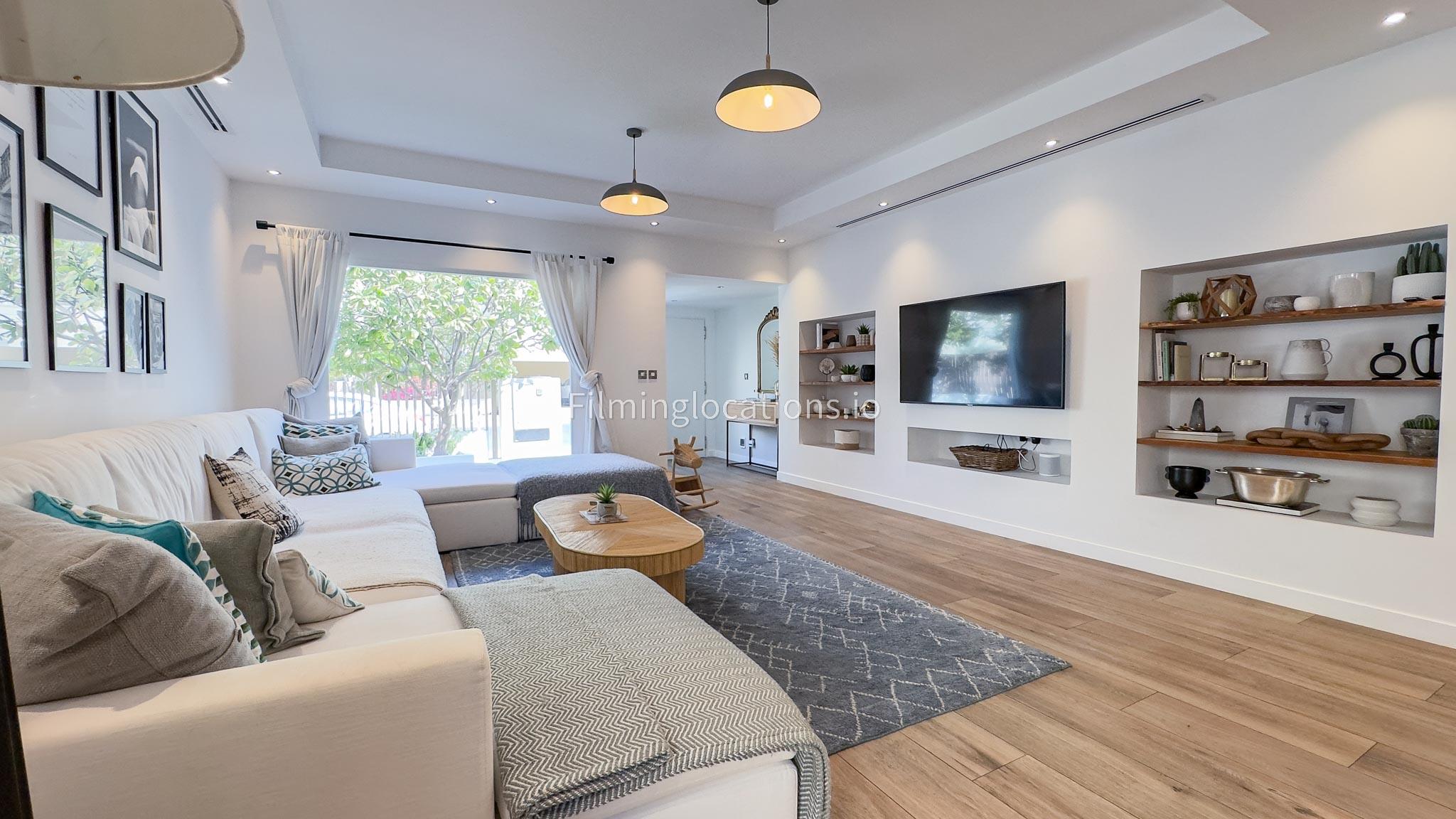 Our villa has an elegant and spacious living room with a beautiful blend of white and wood furniture. Additionally, there is a living room near the open kitchen with bohemian style décor. There is a beautiful bedroom with a spacious balcony and a nursery on the upper floor. The backyard is a reflection of luxury with the pristine pool and patio furnishings making it perfect for any outdoor scenes.