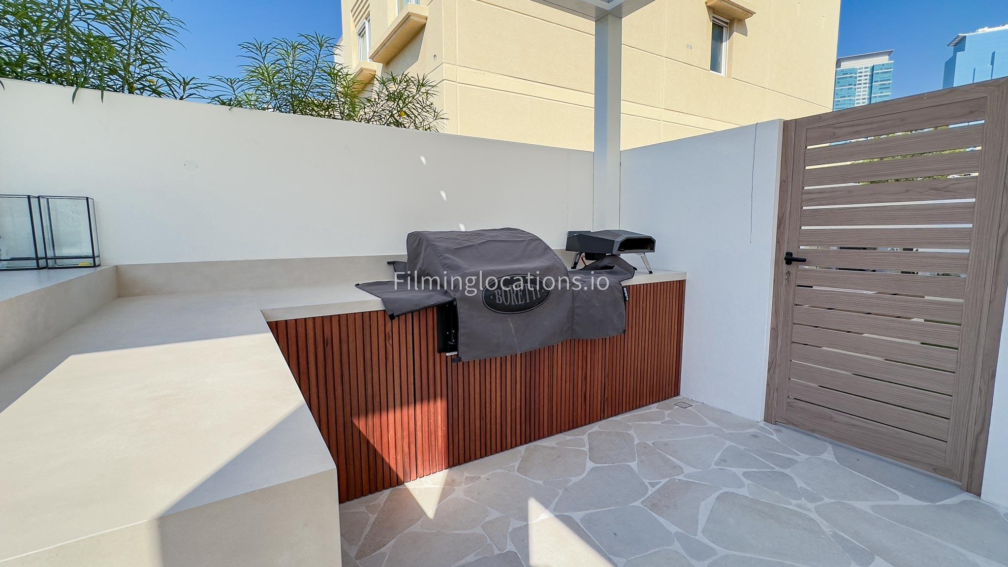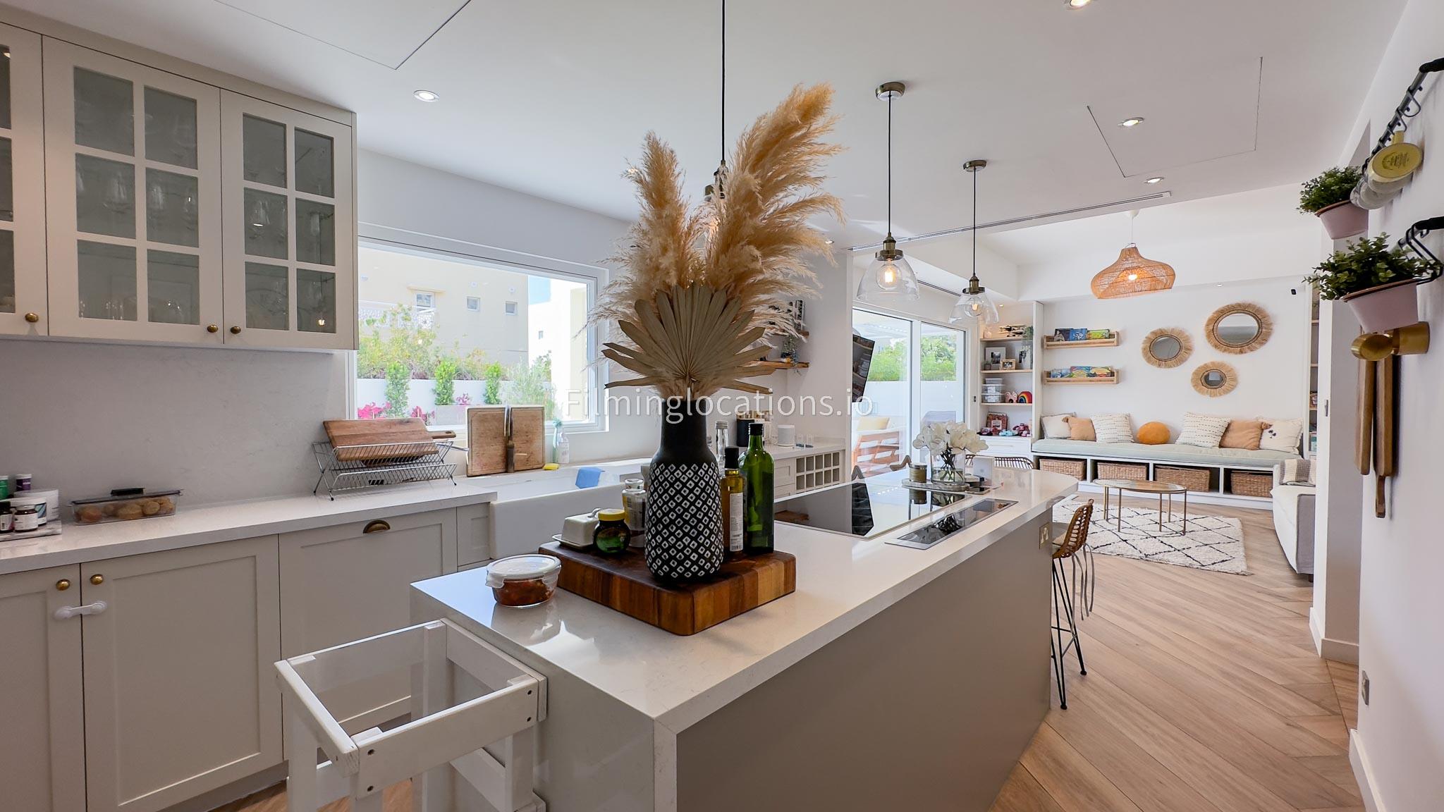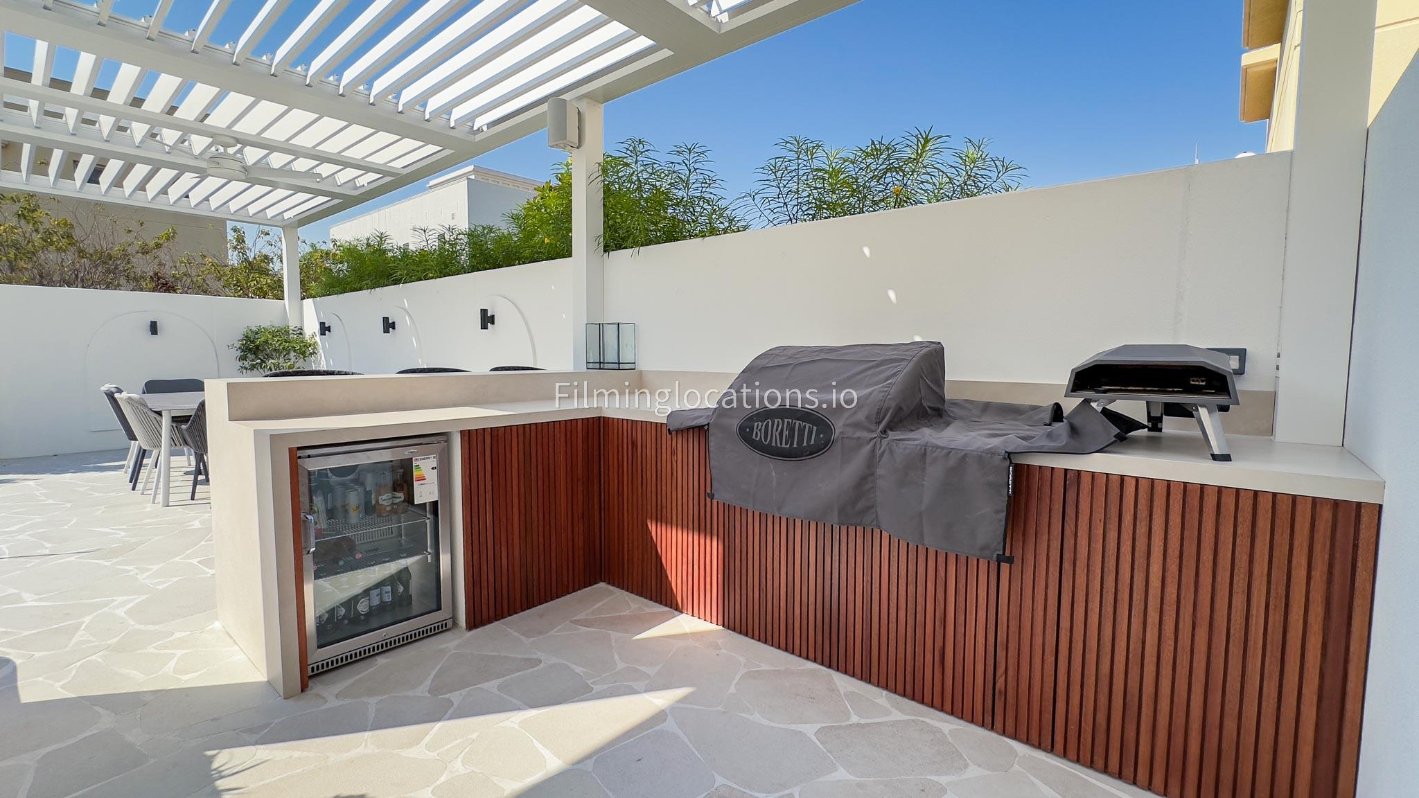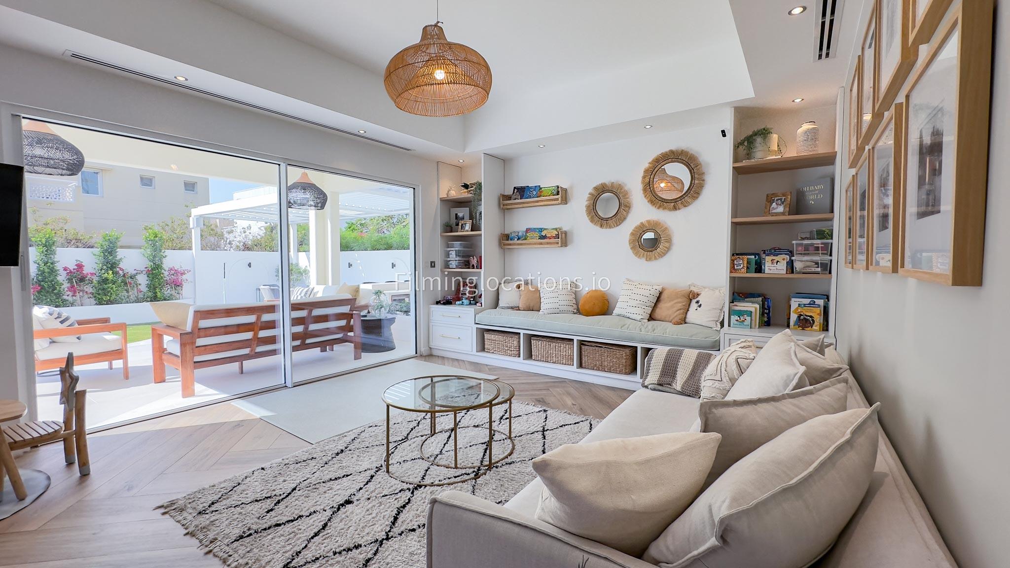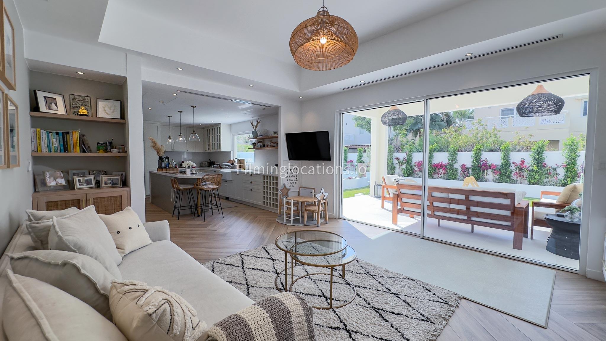 Our villa has an elegant and spacious living room with a beautiful blend of white and wood furniture. Additionally, there is a living room near the open kitchen with bohemian style décor. There is a beautiful bedroom with a spacious balcony and a nursery on the upper floor. The backyard is a reflection of luxury with the pristine pool and patio furnishings making it perfect for any outdoor scenes.