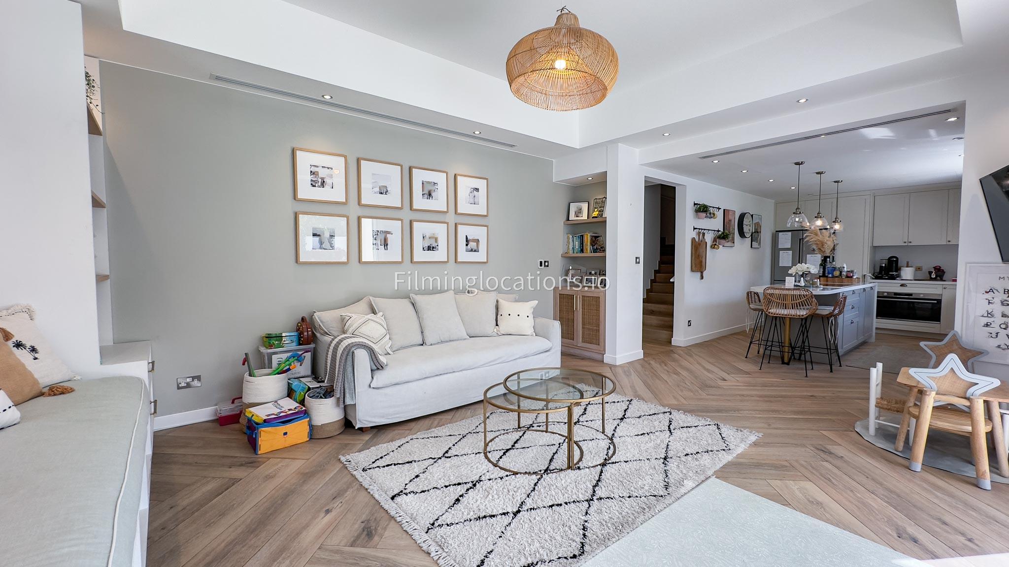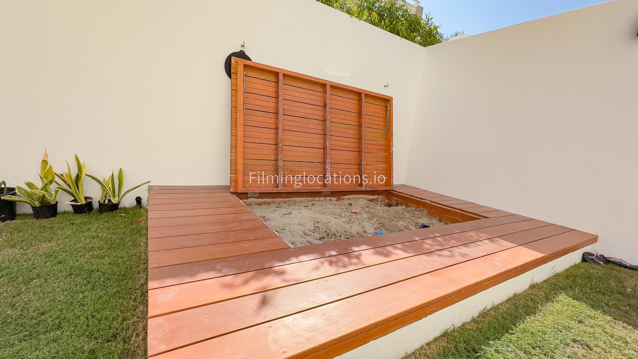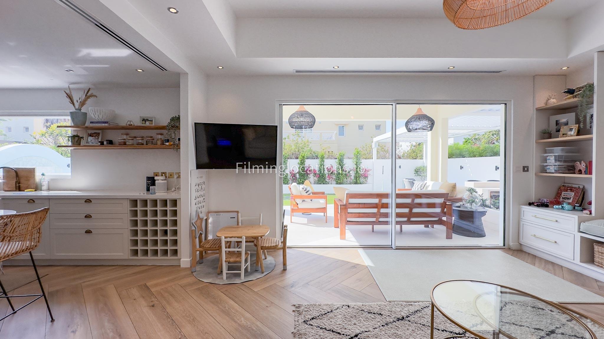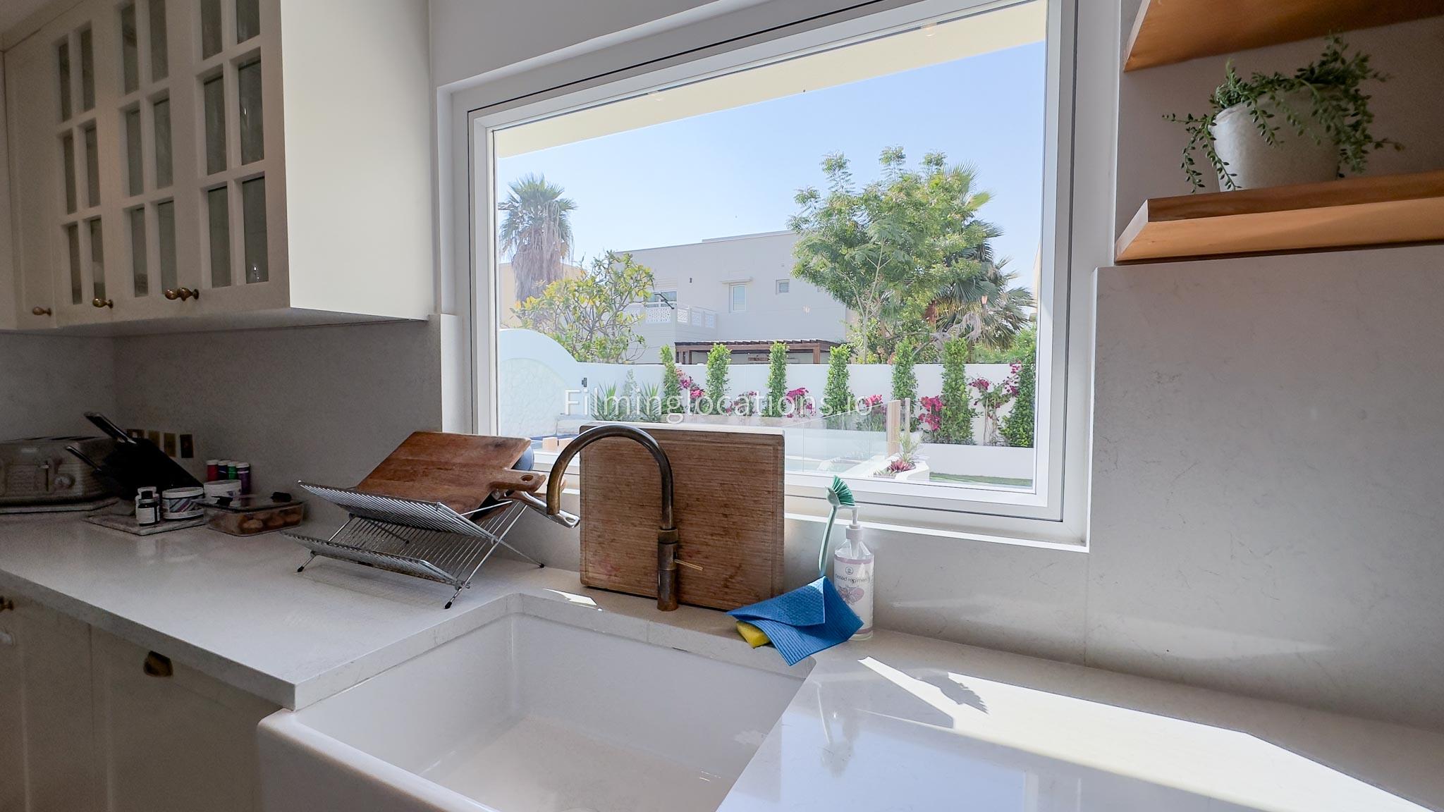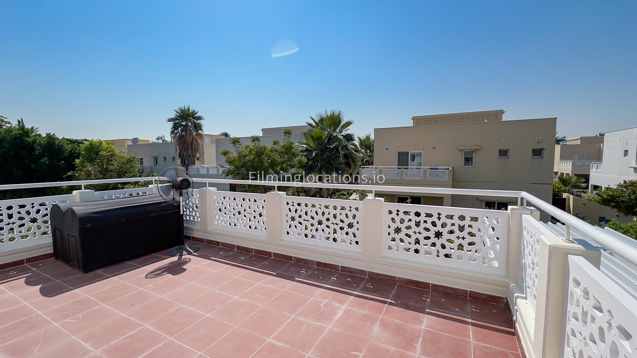 Our villa has an elegant and spacious living room with a beautiful blend of white and wood furniture. Additionally, there is a living room near the open kitchen with bohemian style décor. There is a beautiful bedroom with a spacious balcony and a nursery on the upper floor. The backyard is a reflection of luxury with the pristine pool and patio furnishings making it perfect for any outdoor scenes.