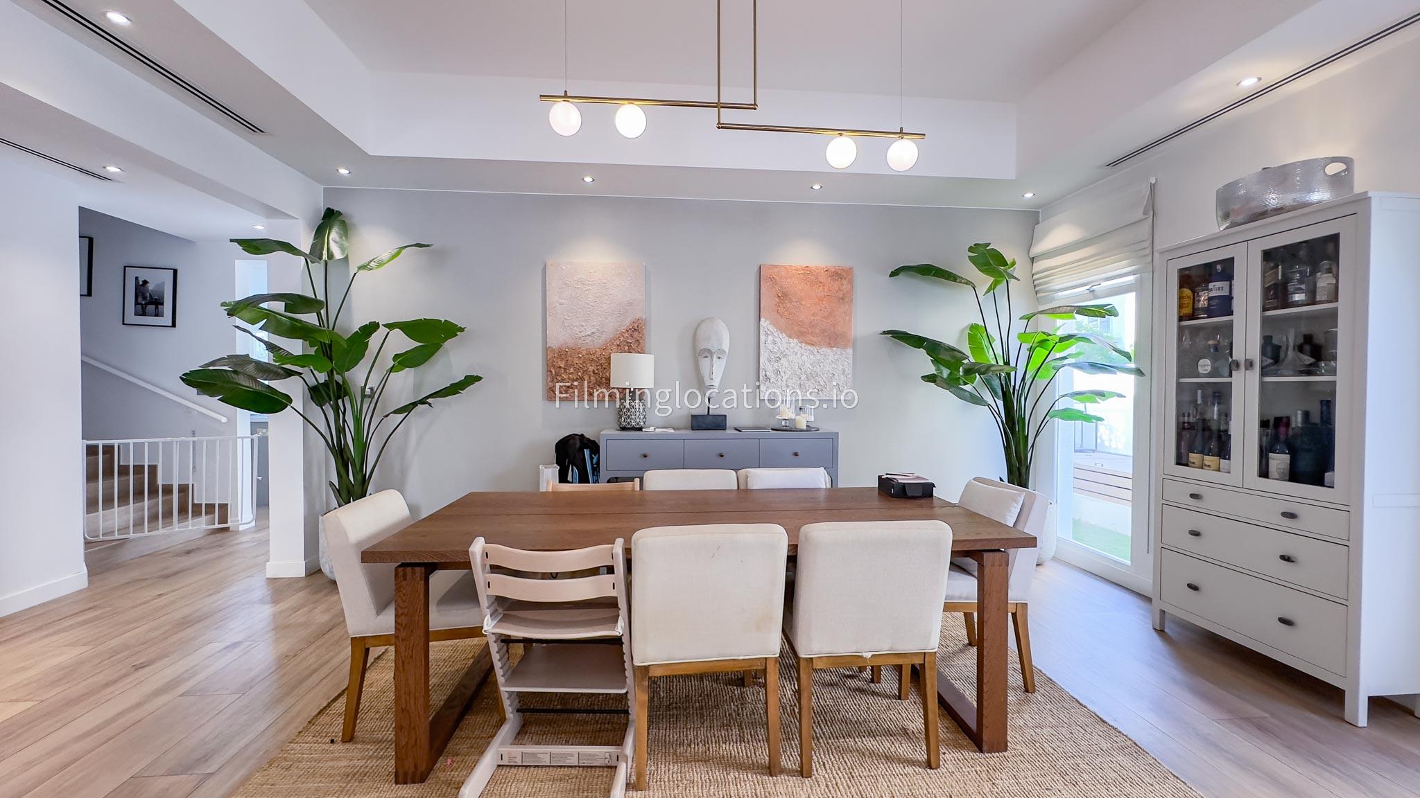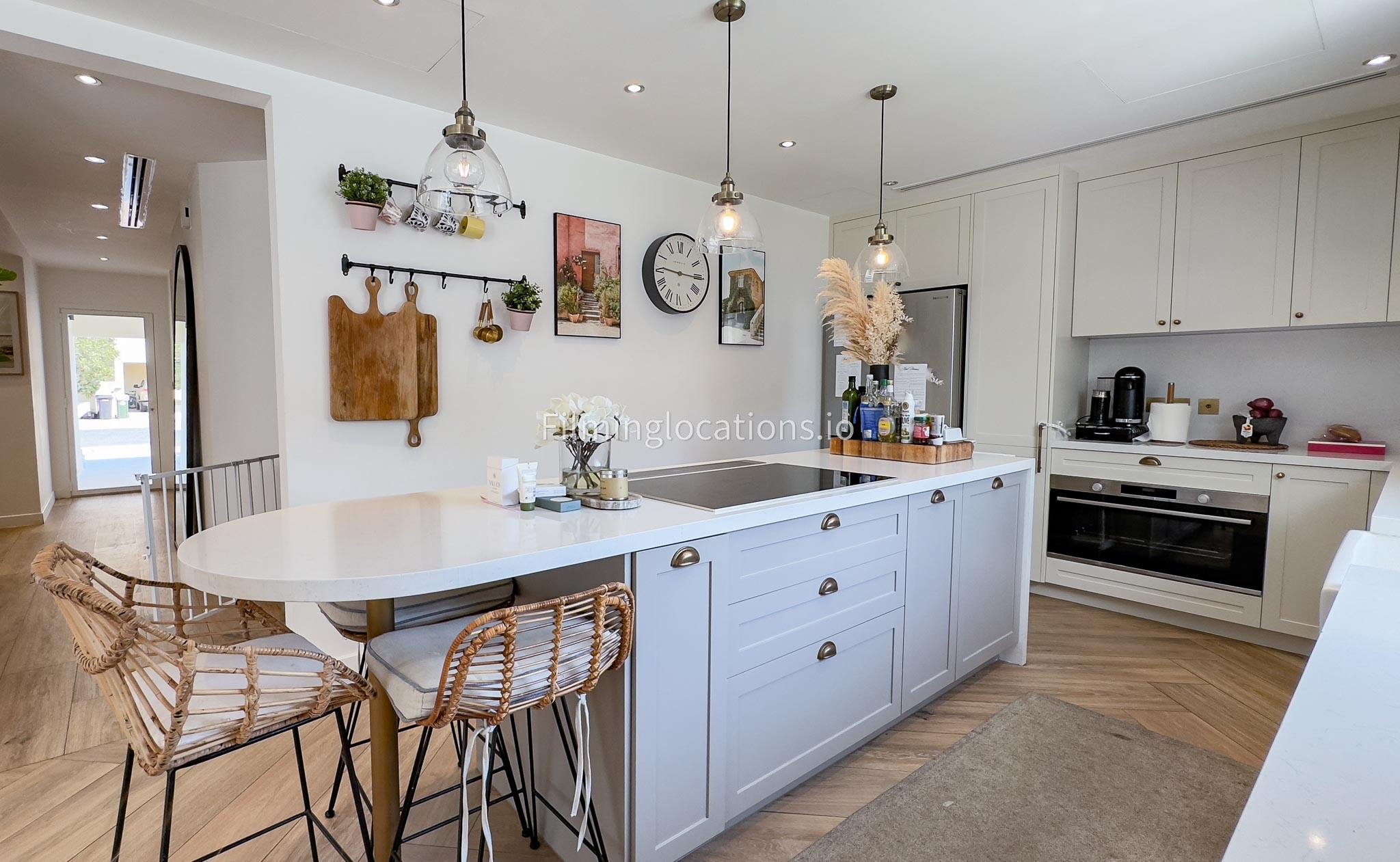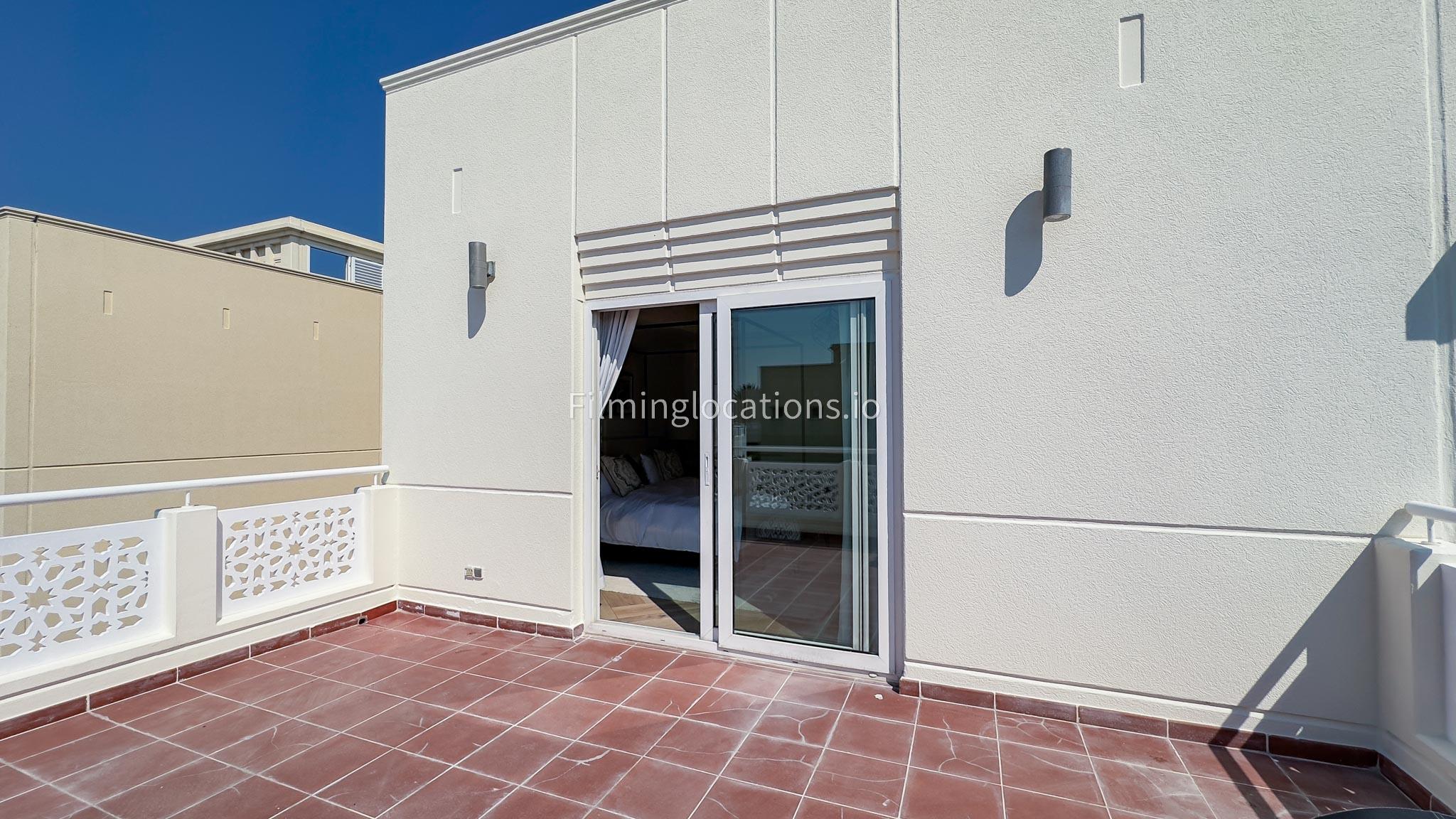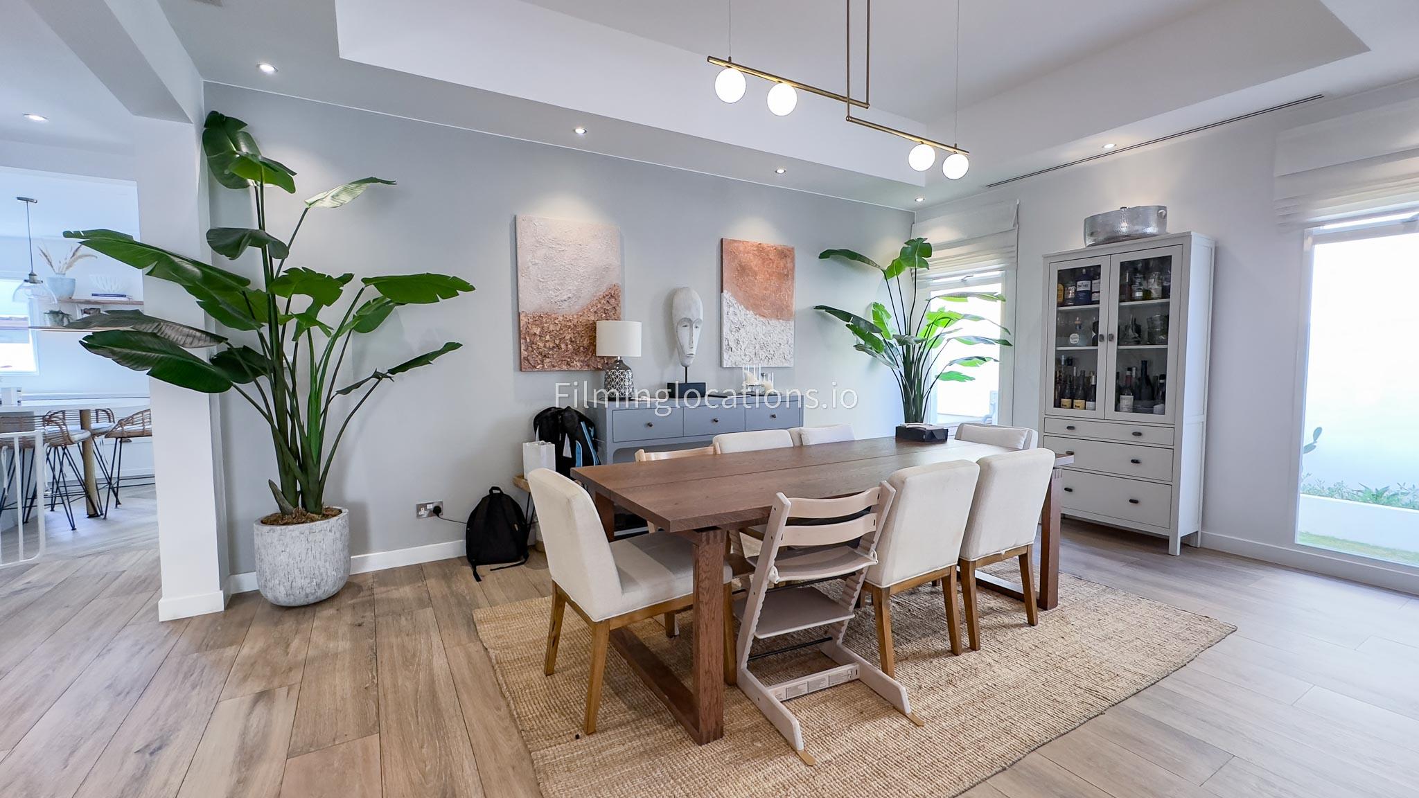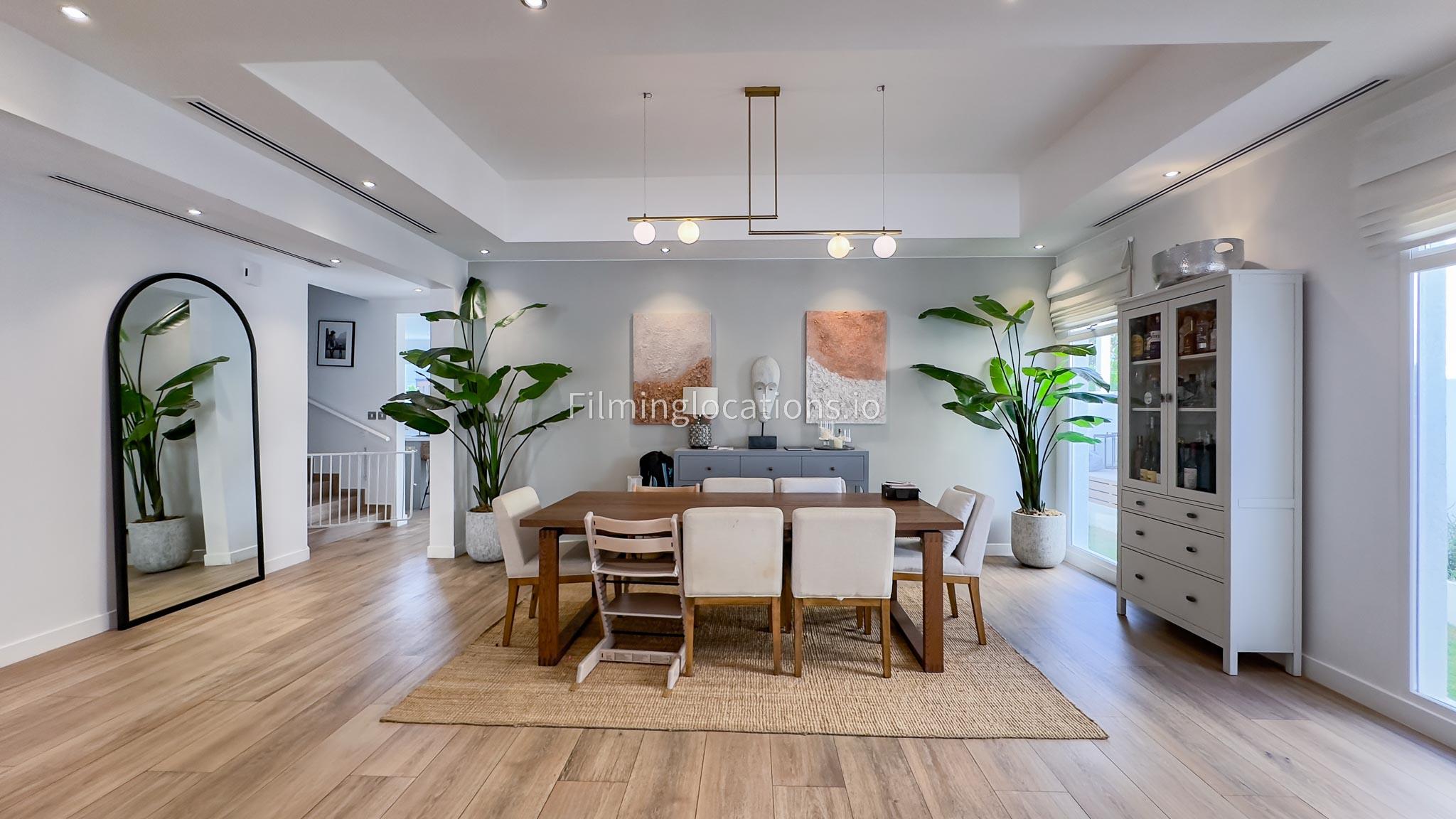 Our villa has an elegant and spacious living room with a beautiful blend of white and wood furniture. Additionally, there is a living room near the open kitchen with bohemian style décor. There is a beautiful bedroom with a spacious balcony and a nursery on the upper floor. The backyard is a reflection of luxury with the pristine pool and patio furnishings making it perfect for any outdoor scenes.