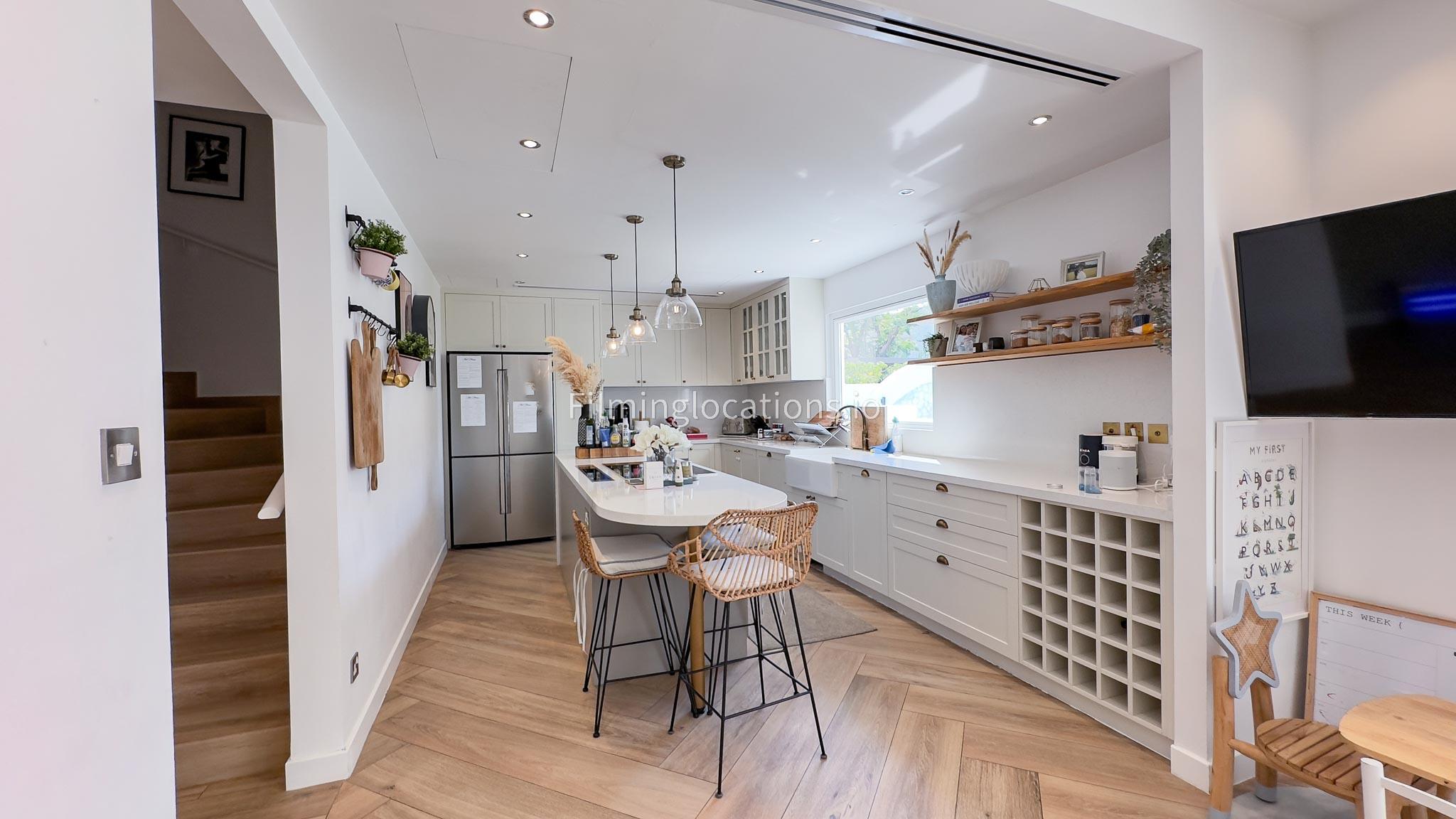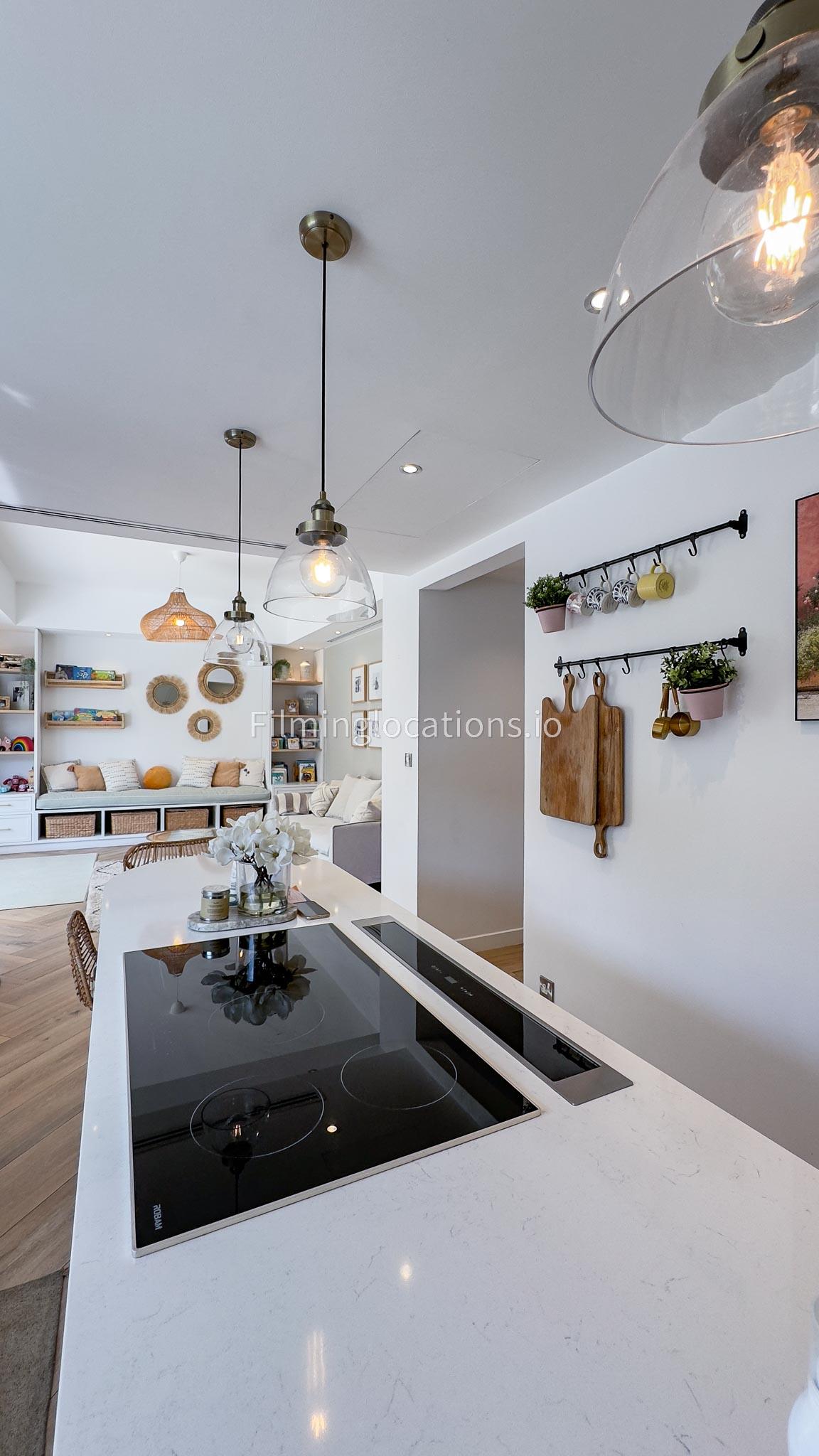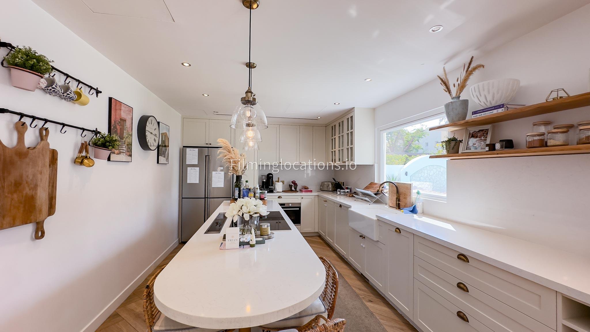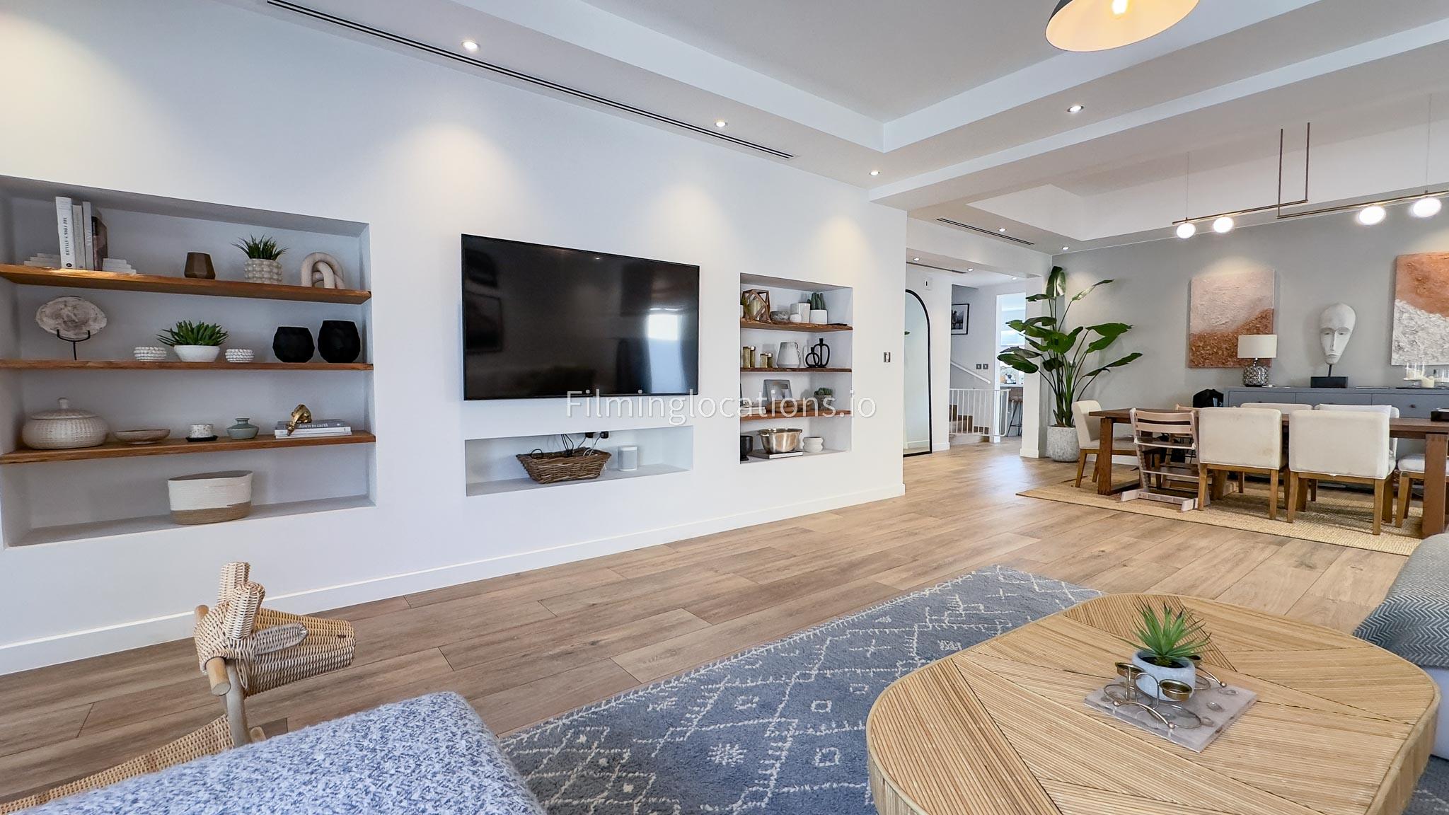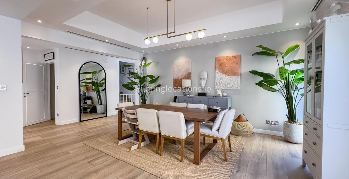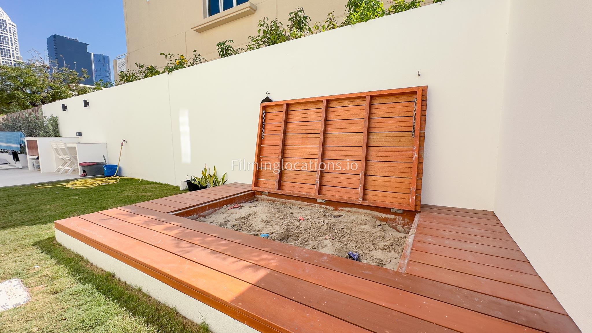 Our villa has an elegant and spacious living room with a beautiful blend of white and wood furniture. Additionally, there is a living room near the open kitchen with bohemian style décor. There is a beautiful bedroom with a spacious balcony and a nursery on the upper floor. The backyard is a reflection of luxury with the pristine pool and patio furnishings making it perfect for any outdoor scenes.
