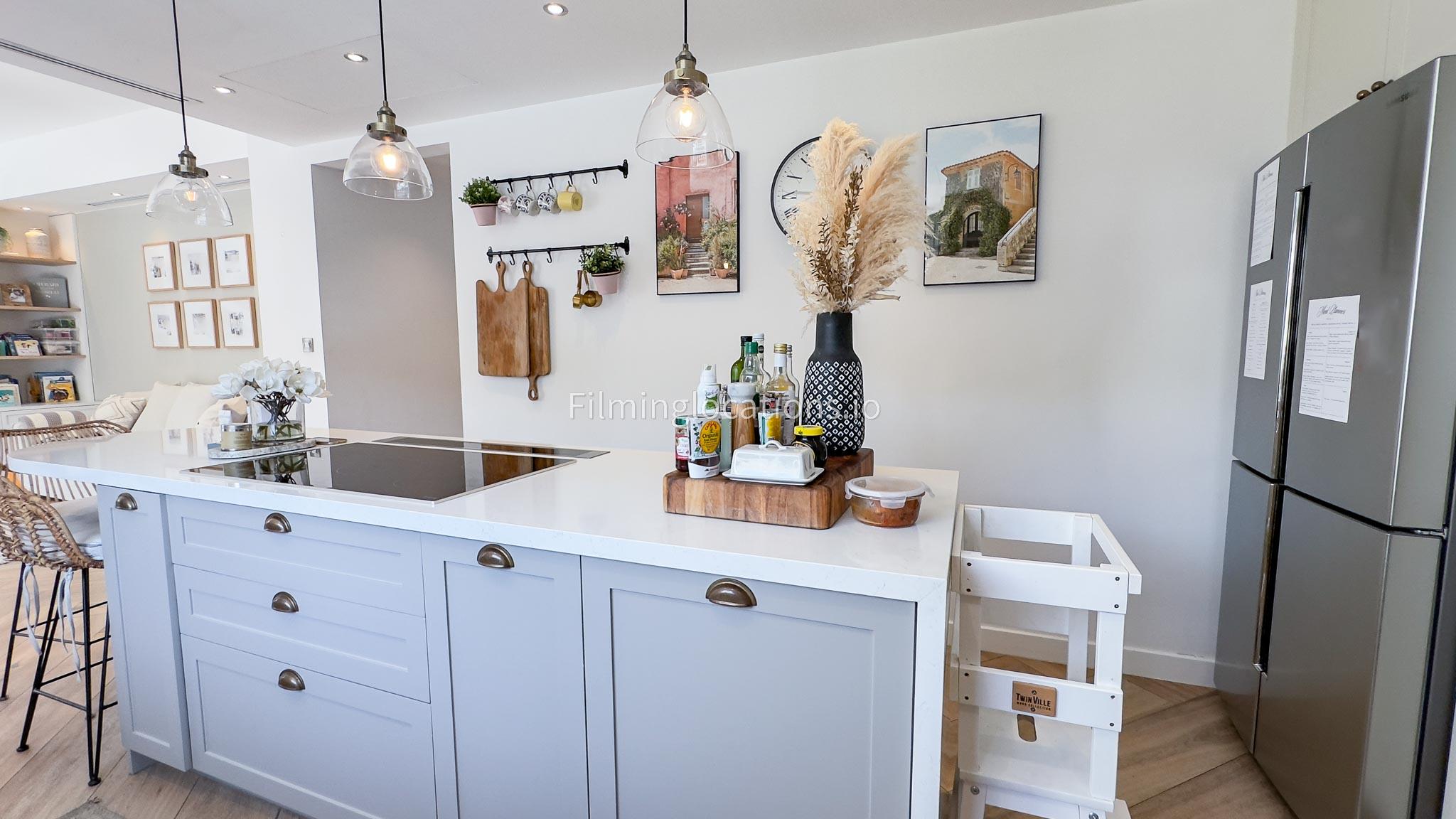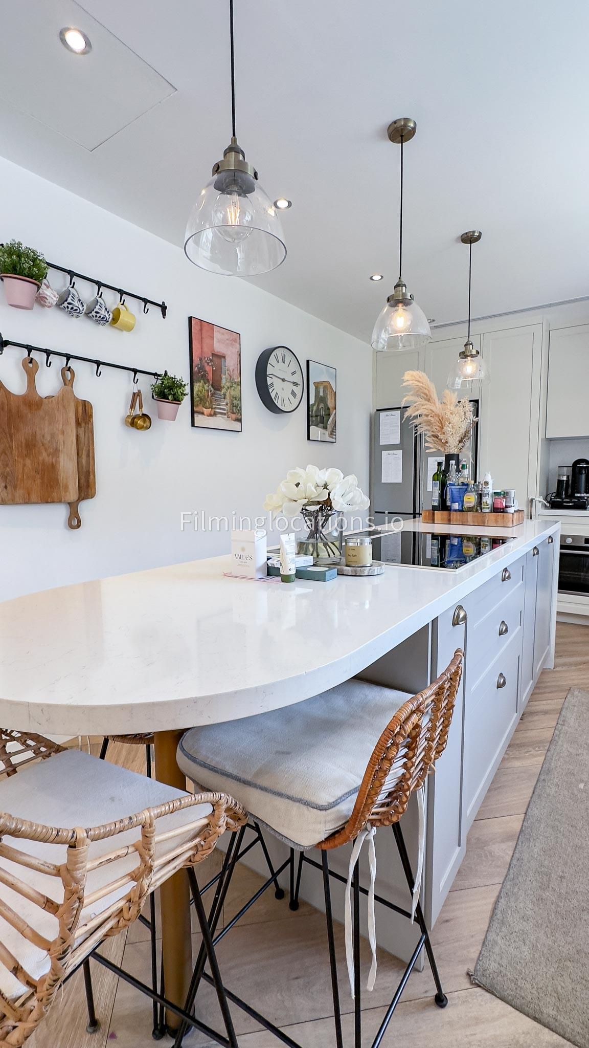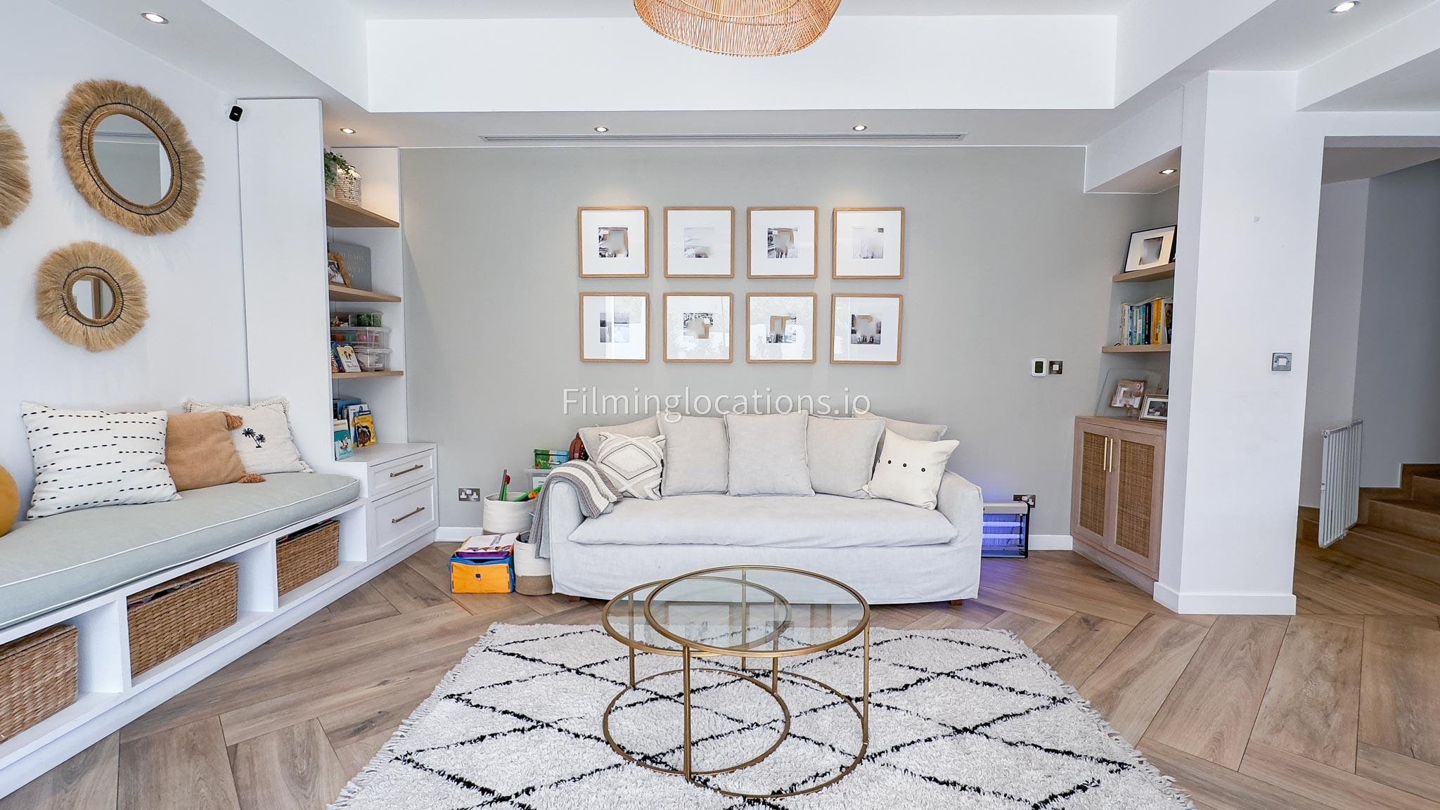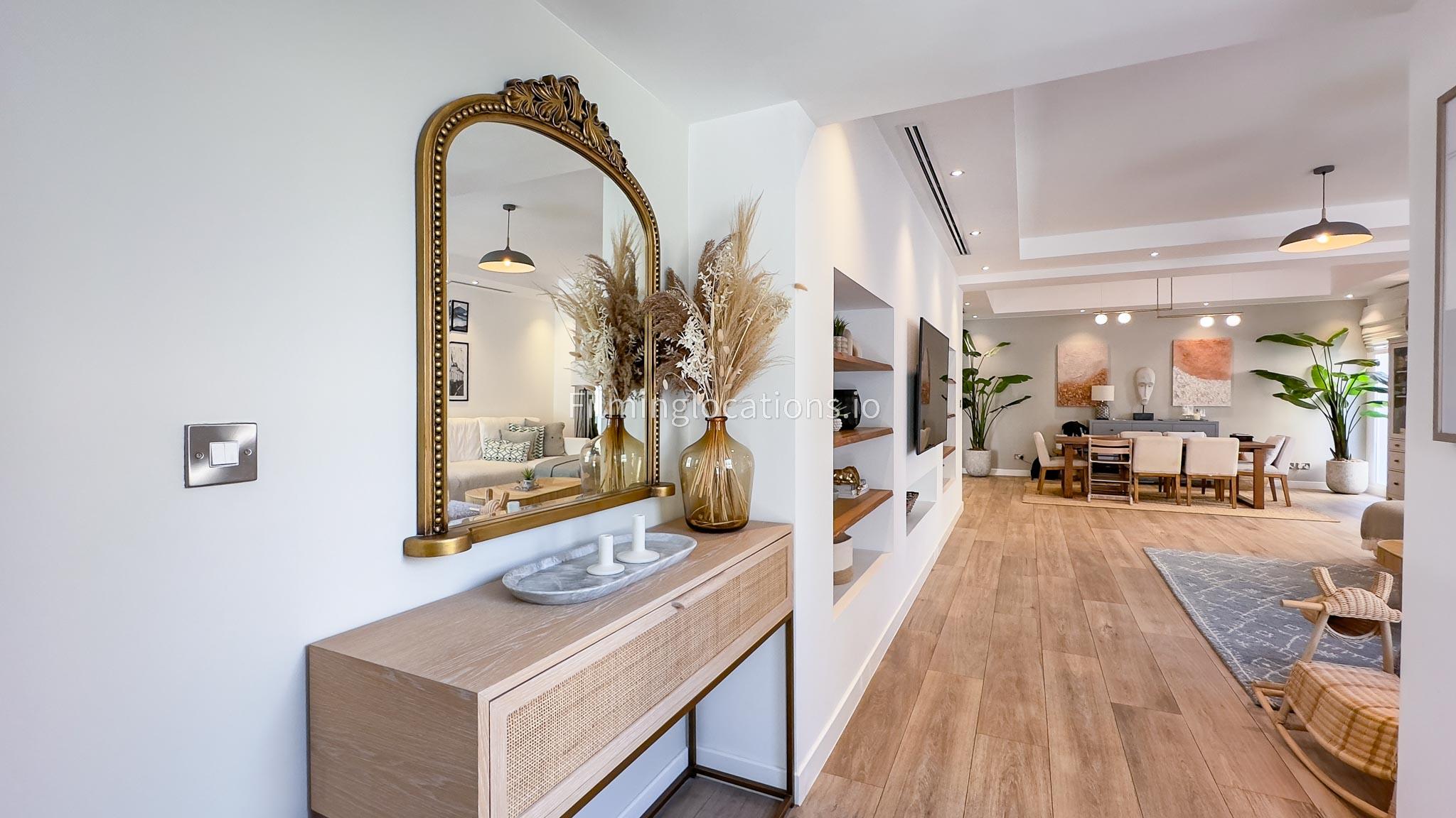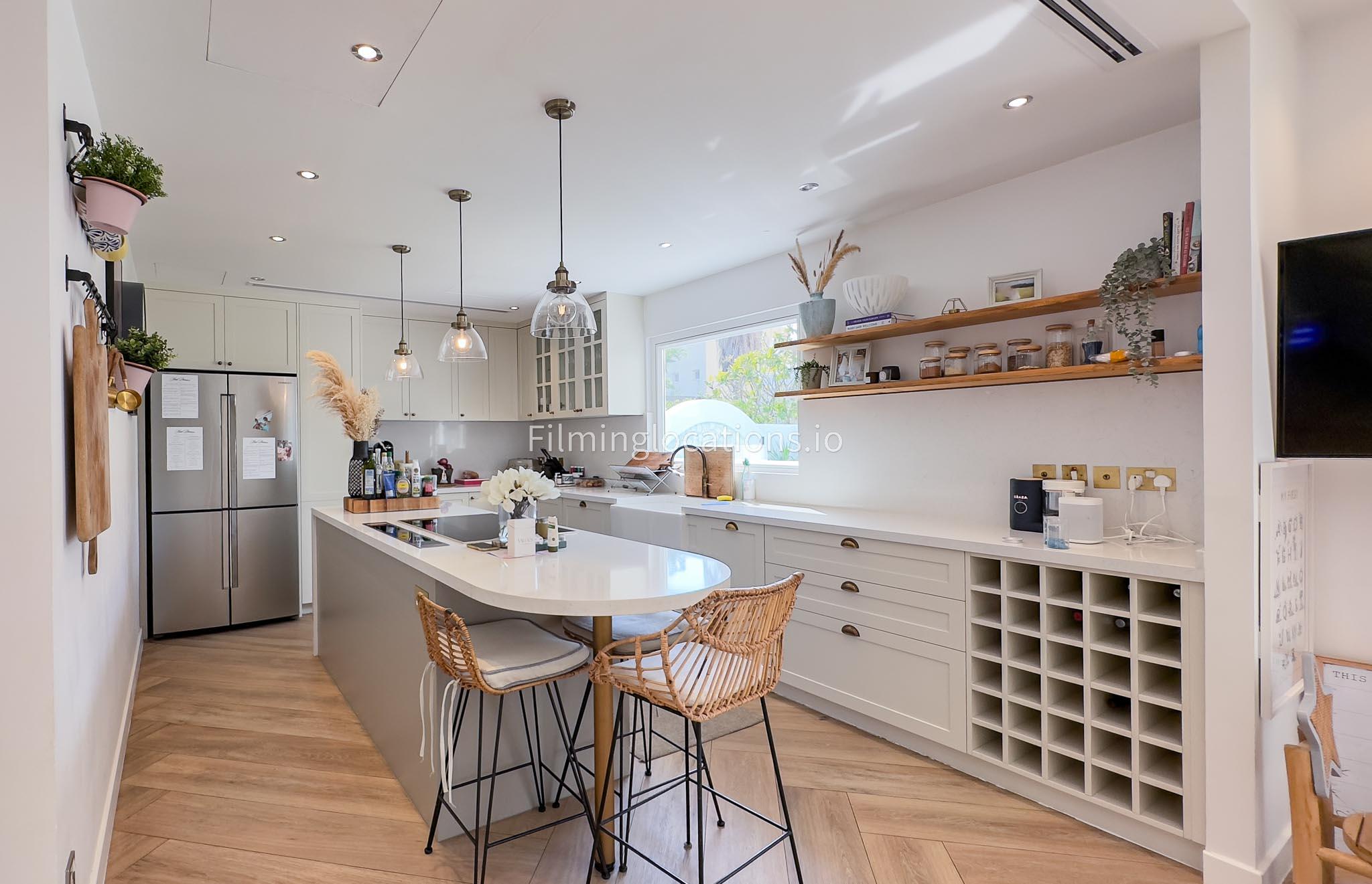 Our villa has an elegant and spacious living room with a beautiful blend of white and wood furniture. Additionally, there is a living room near the open kitchen with bohemian style décor. There is a beautiful bedroom with a spacious balcony and a nursery on the upper floor. The backyard is a reflection of luxury with the pristine pool and patio furnishings making it perfect for any outdoor scenes.