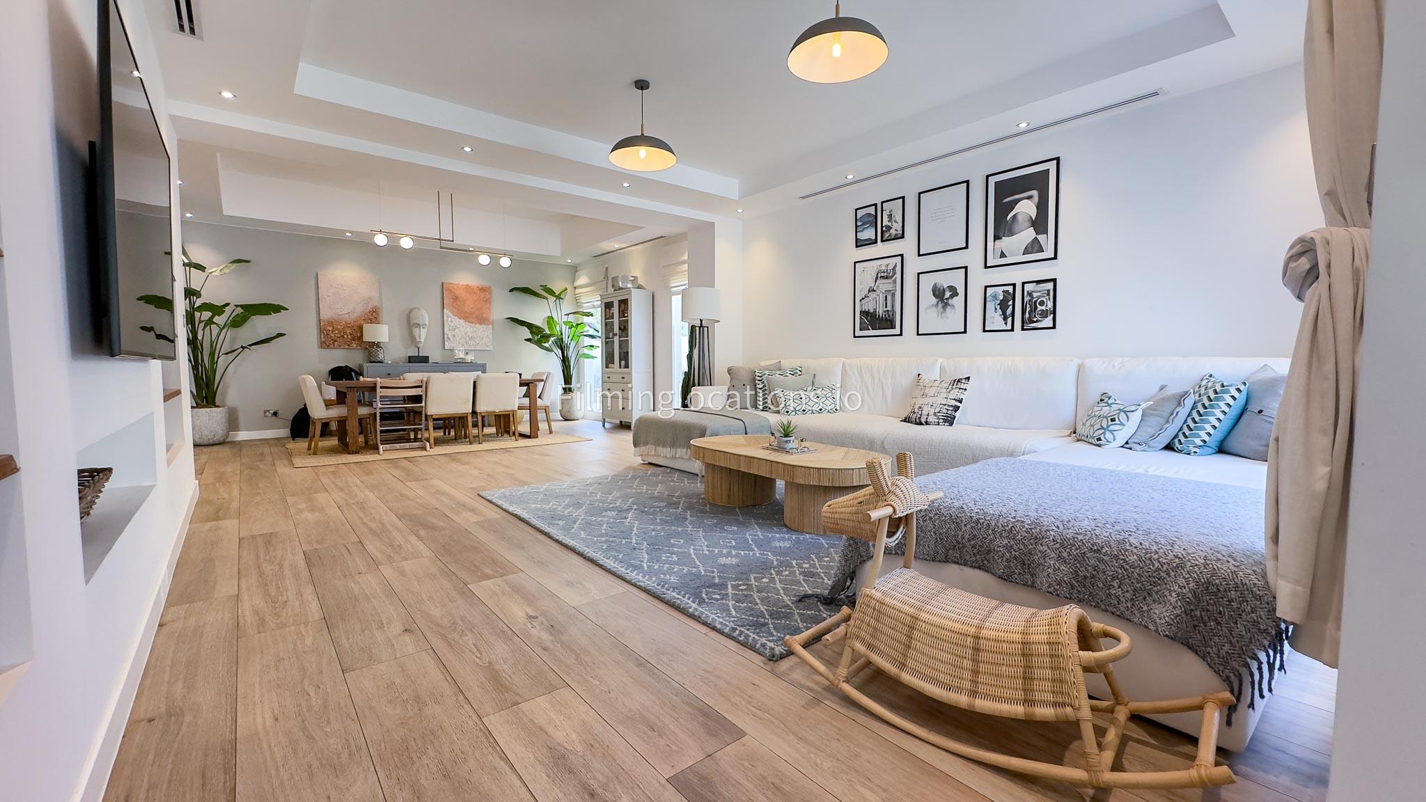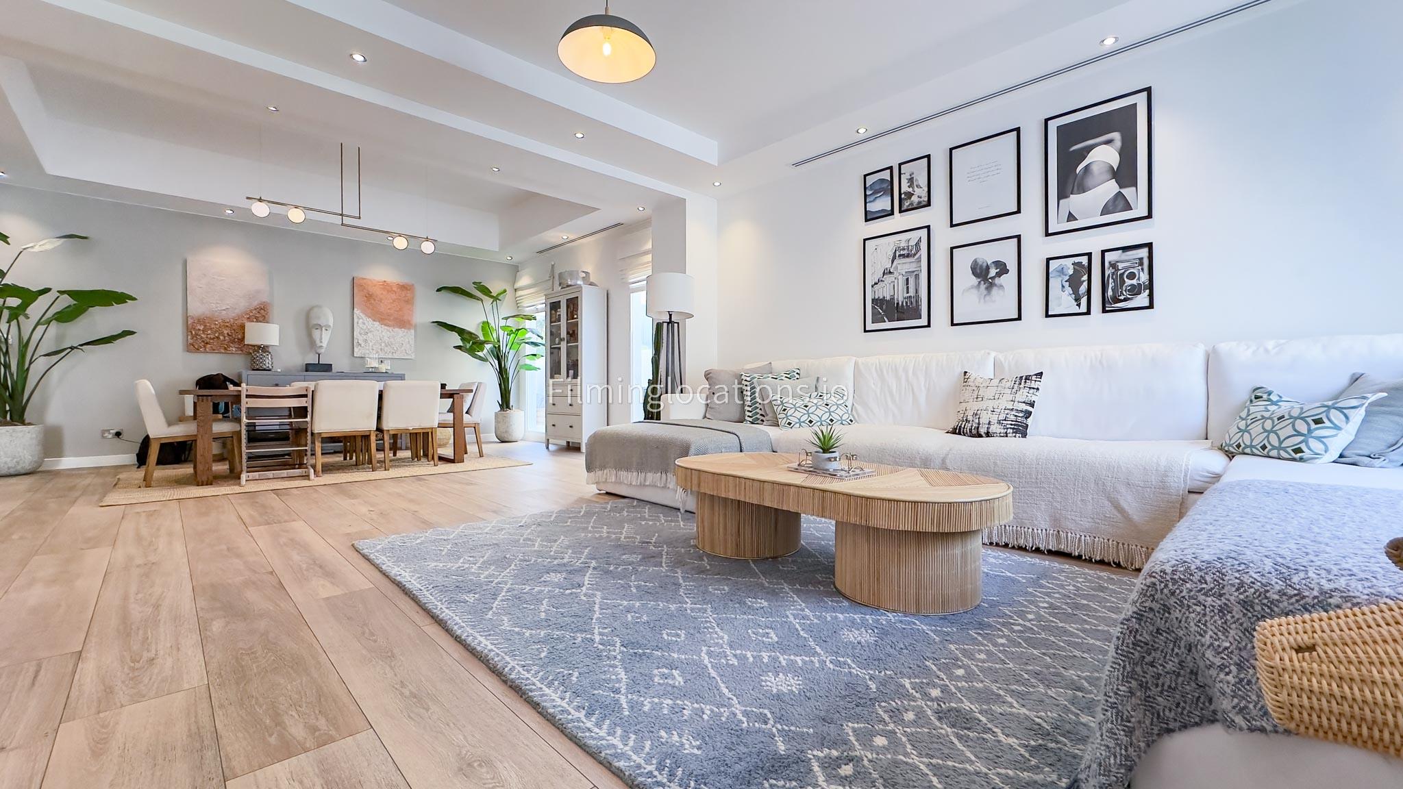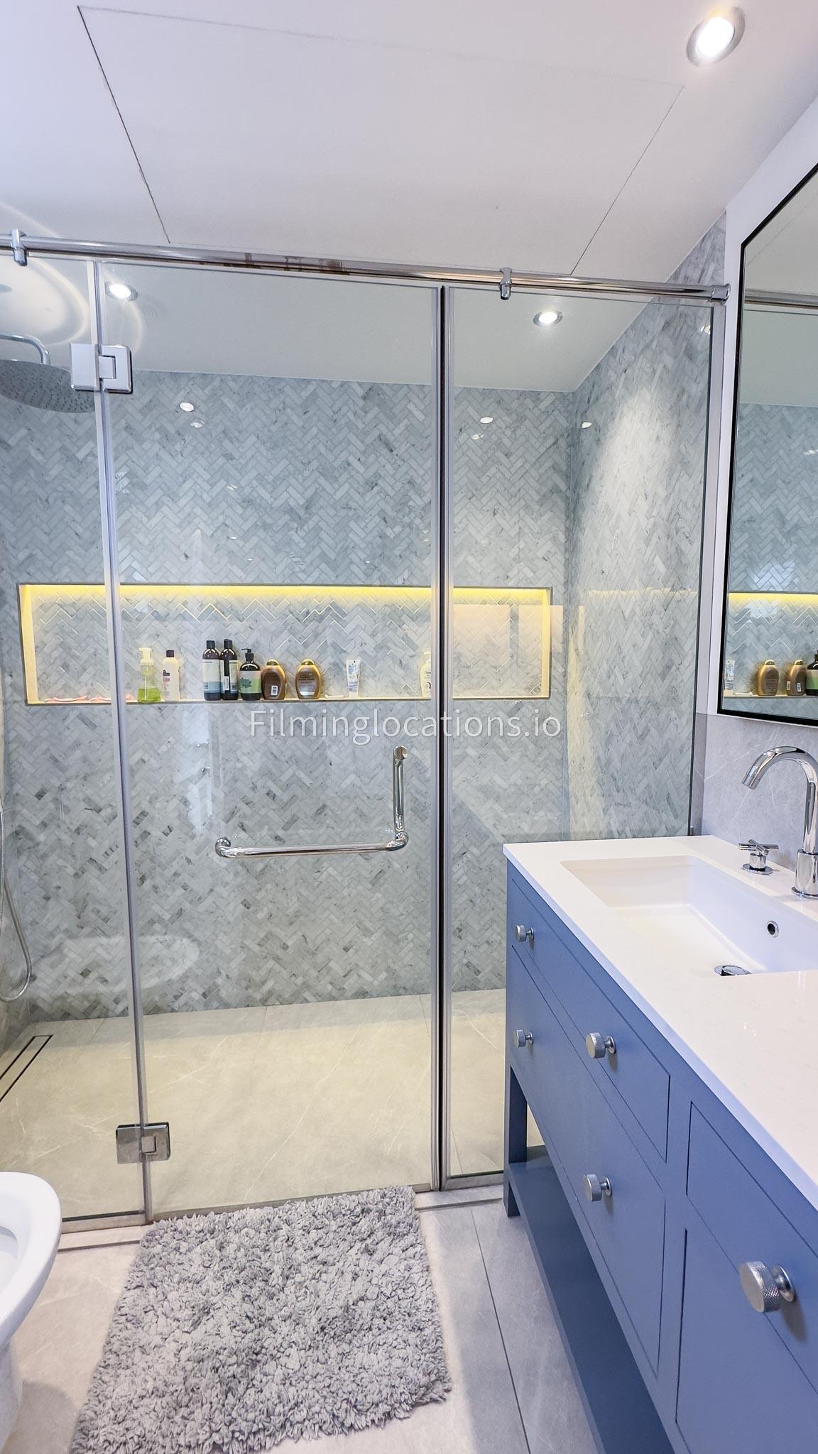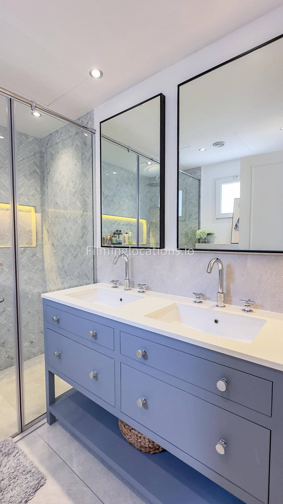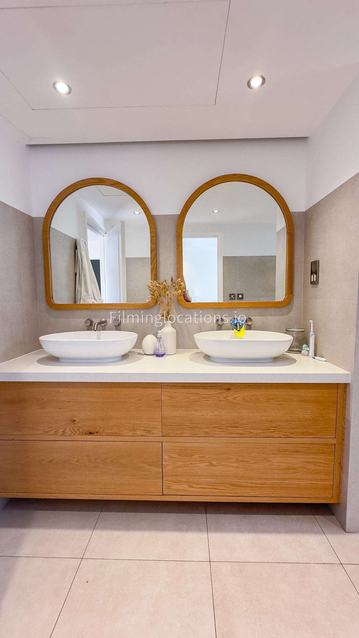 Our villa has an elegant and spacious living room with a beautiful blend of white and wood furniture. Additionally, there is a living room near the open kitchen with bohemian style décor. There is a beautiful bedroom with a spacious balcony and a nursery on the upper floor. The backyard is a reflection of luxury with the pristine pool and patio furnishings making it perfect for any outdoor scenes.