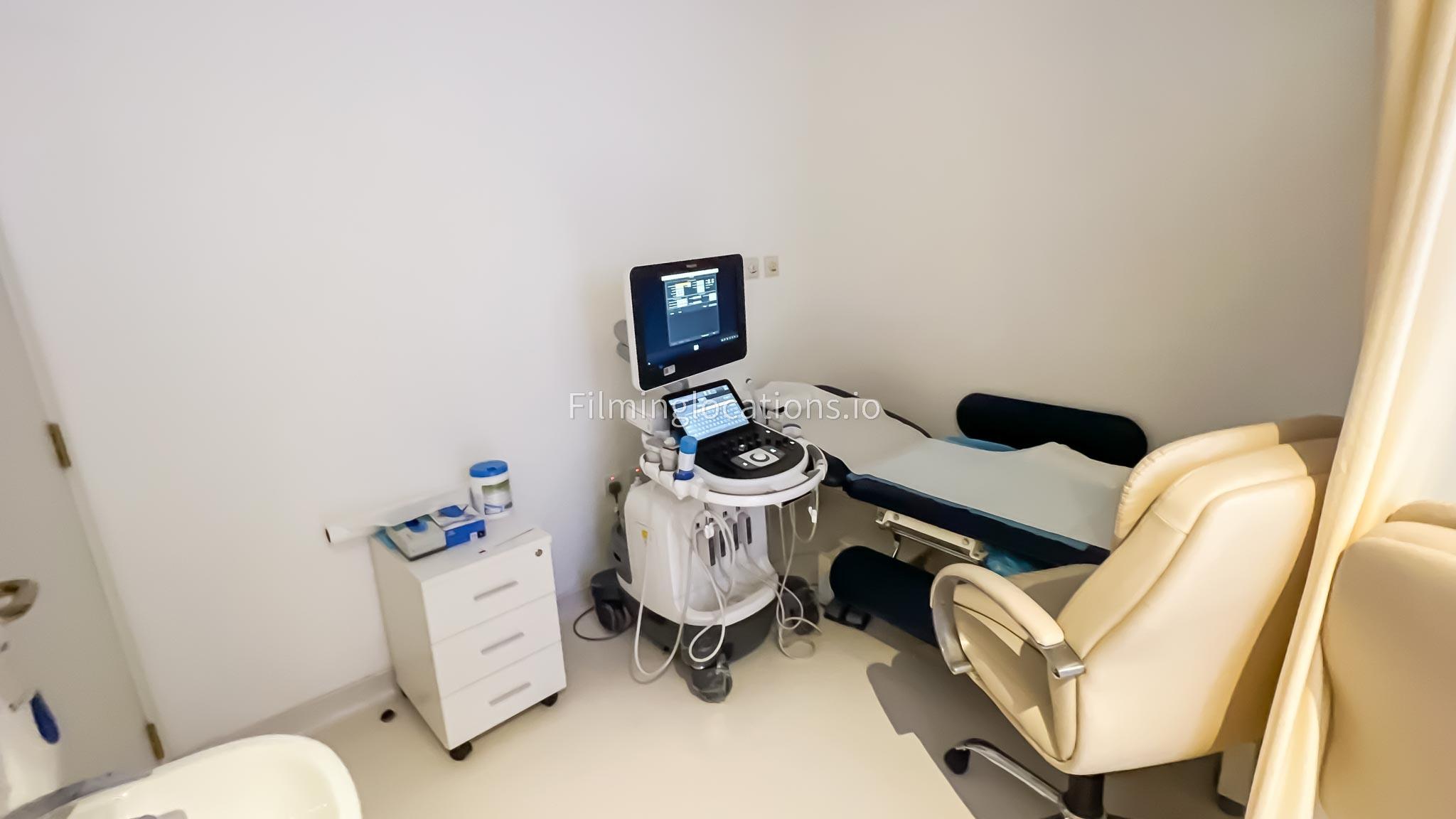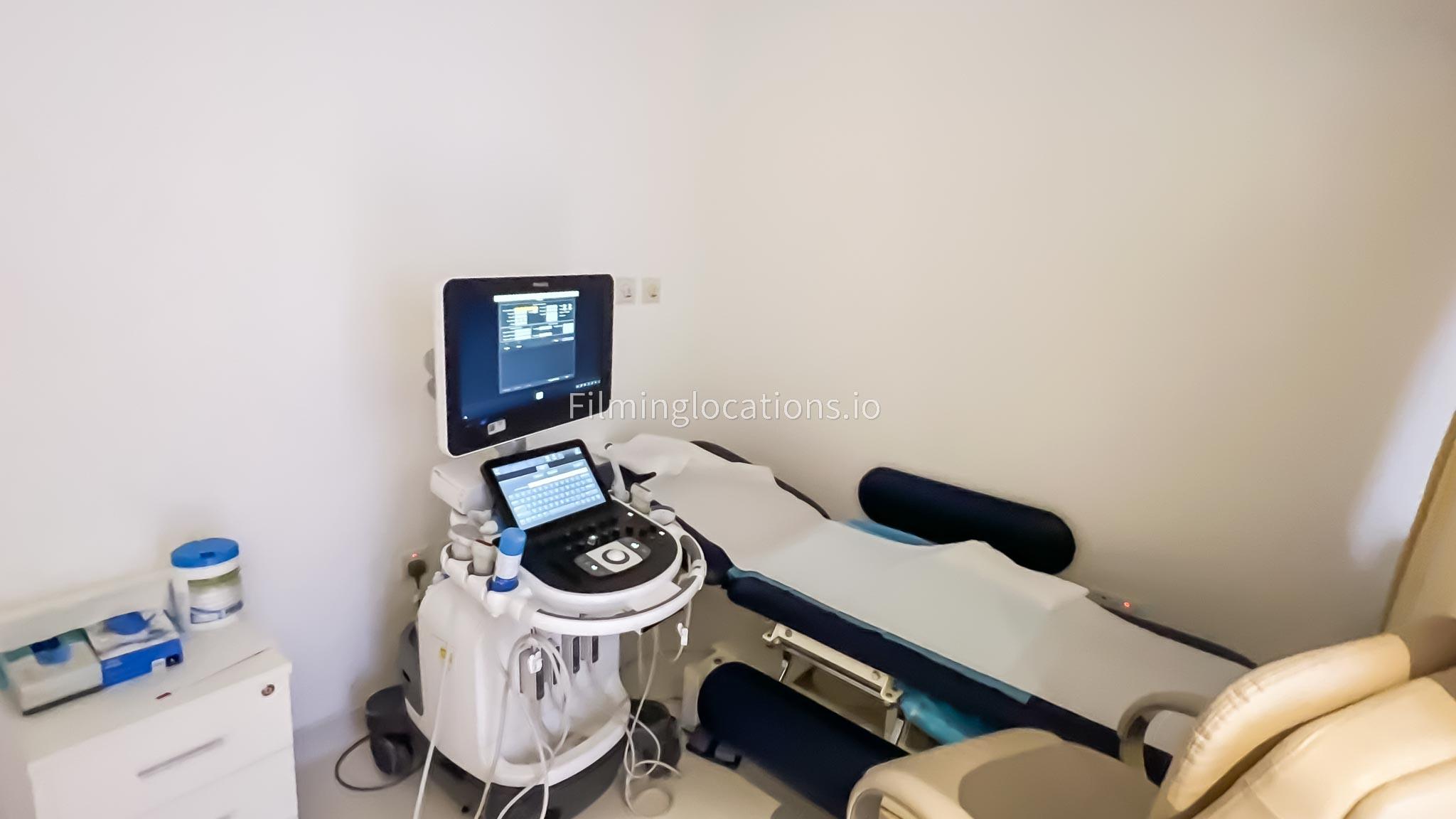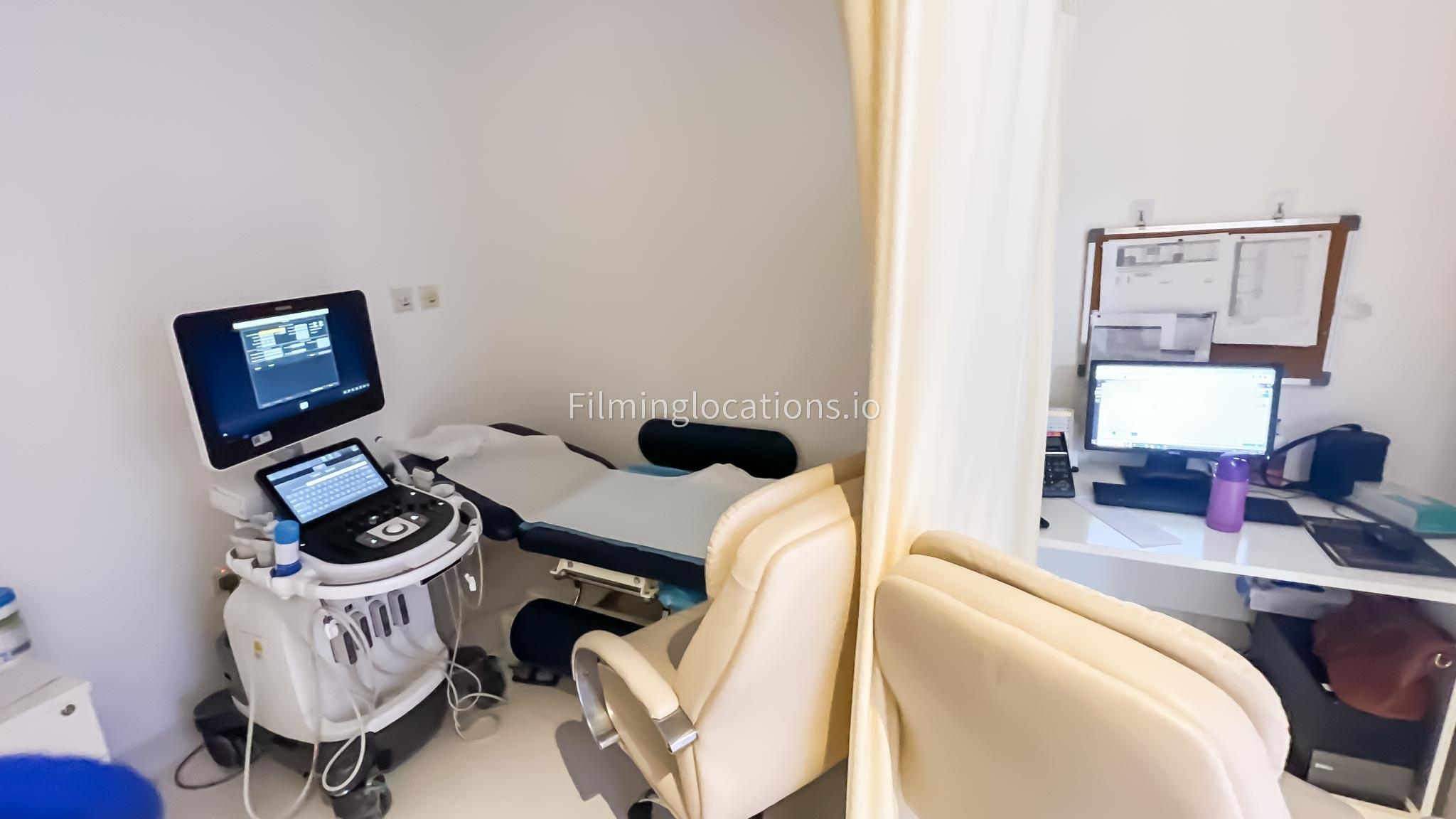 Our ultrasound room is available for filming. Our ultrasound room is equipped with the medical grade tools along with a patient bed and technician workspace.