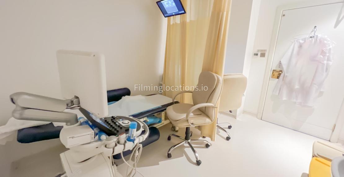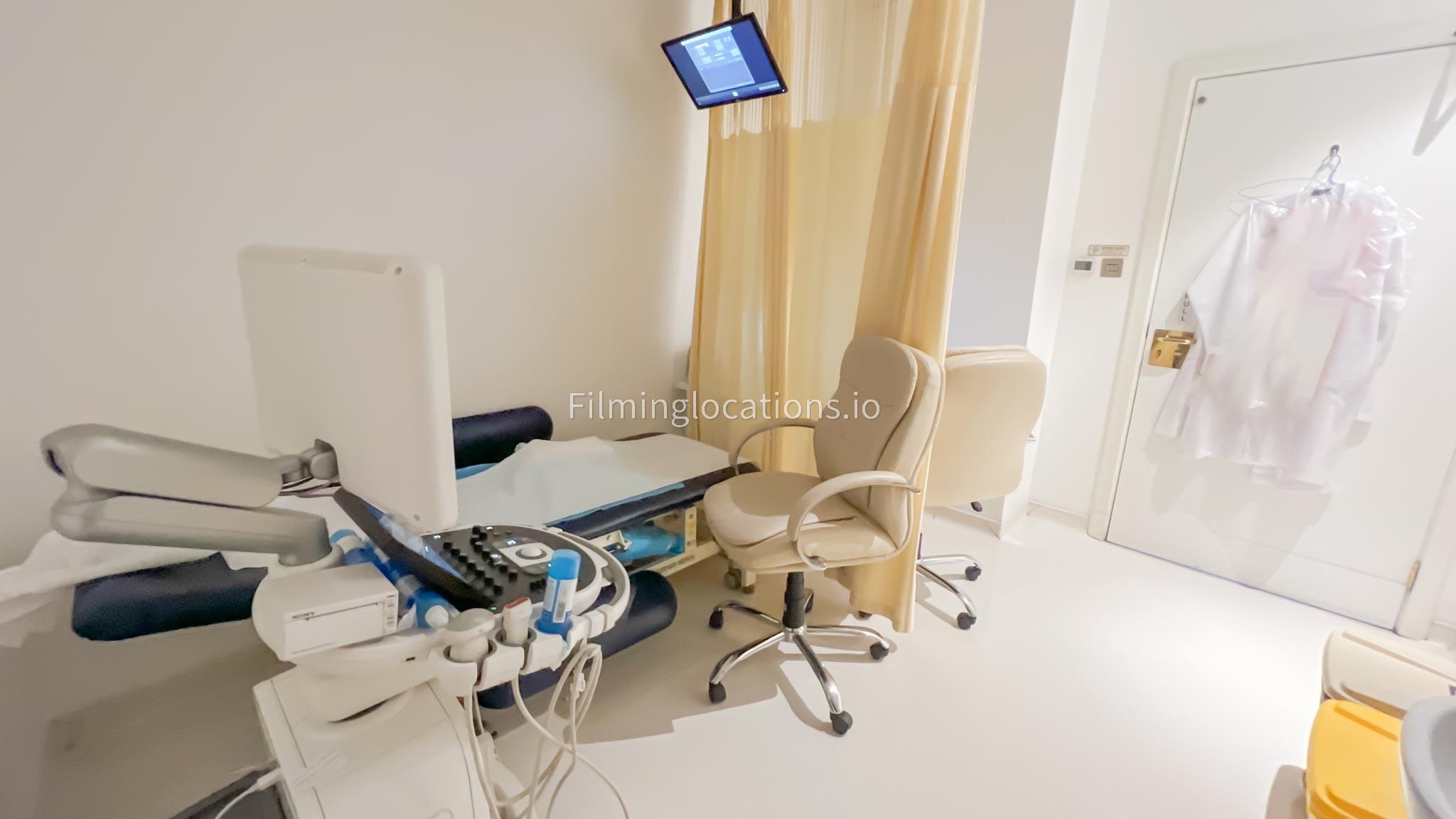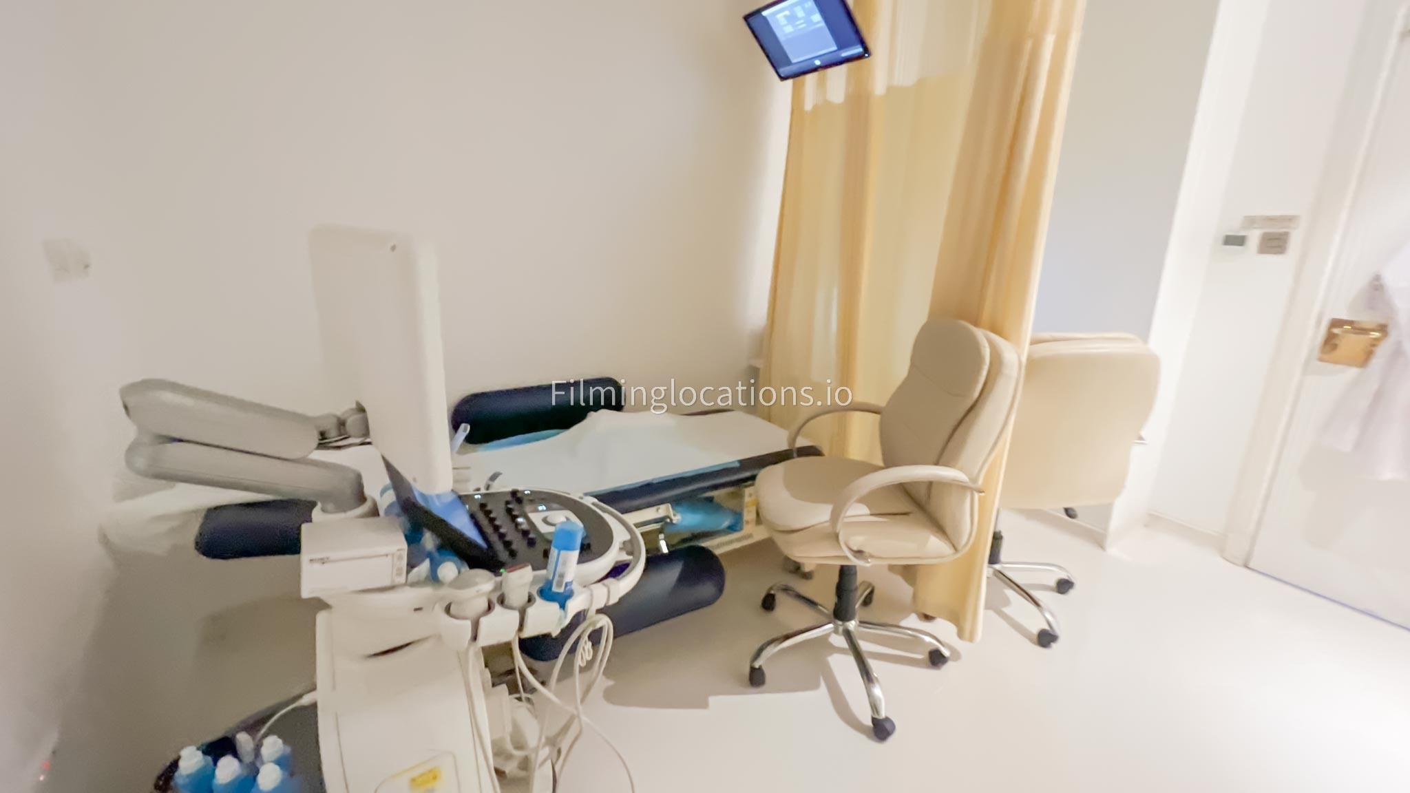 Our ultrasound room is available for filming. Our ultrasound room is equipped with the medical grade tools along with a patient bed and technician workspace.