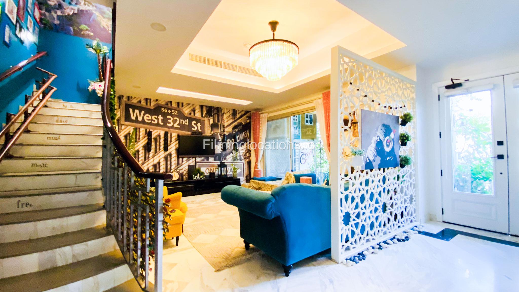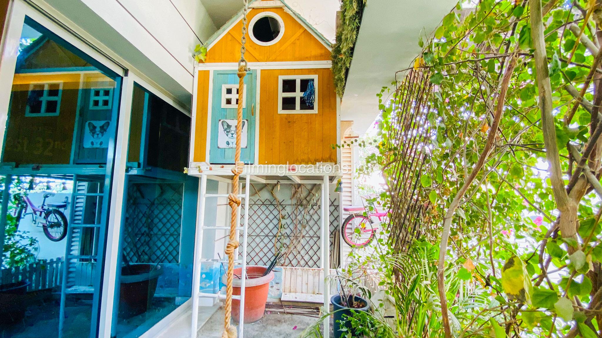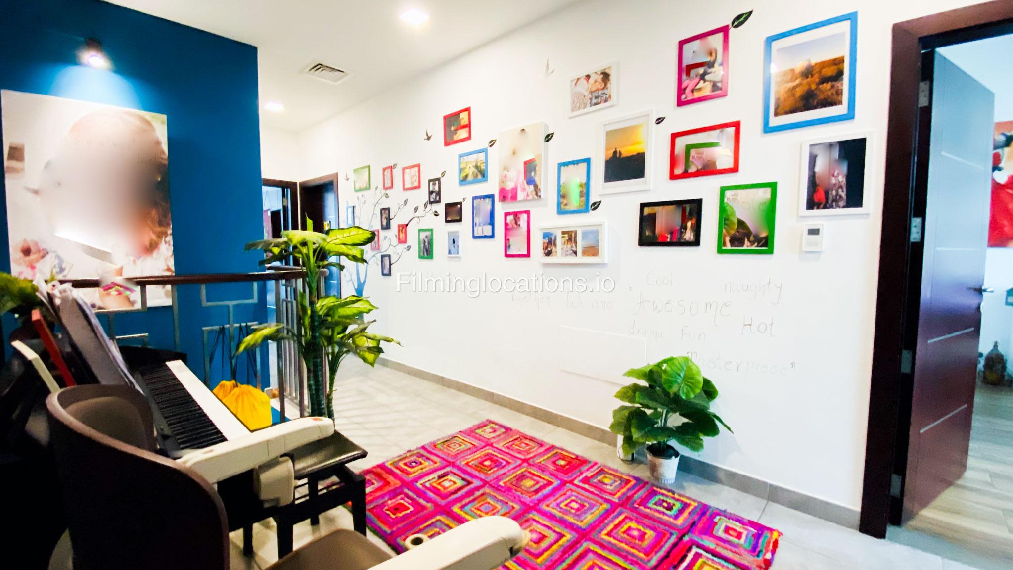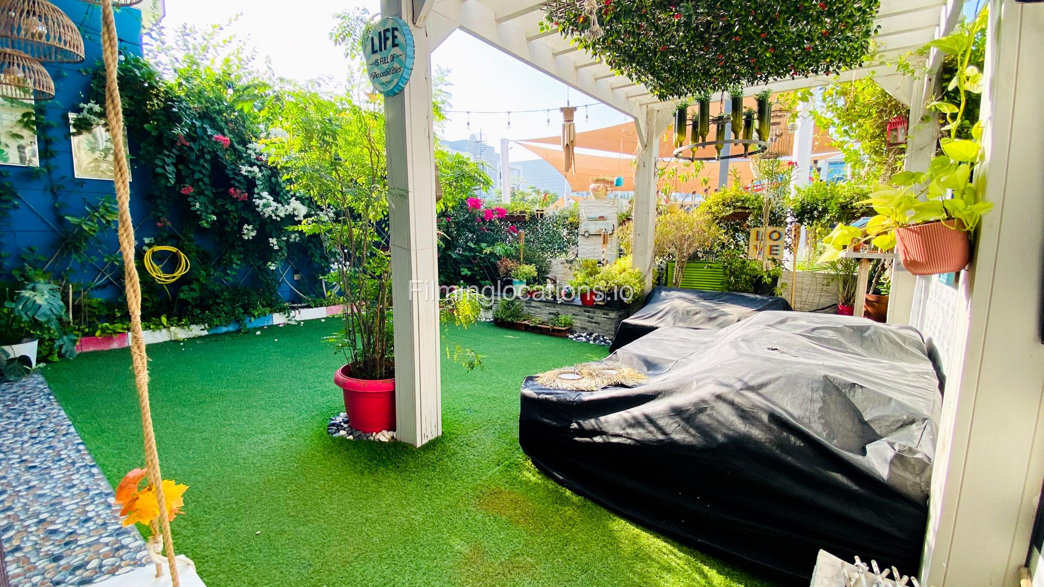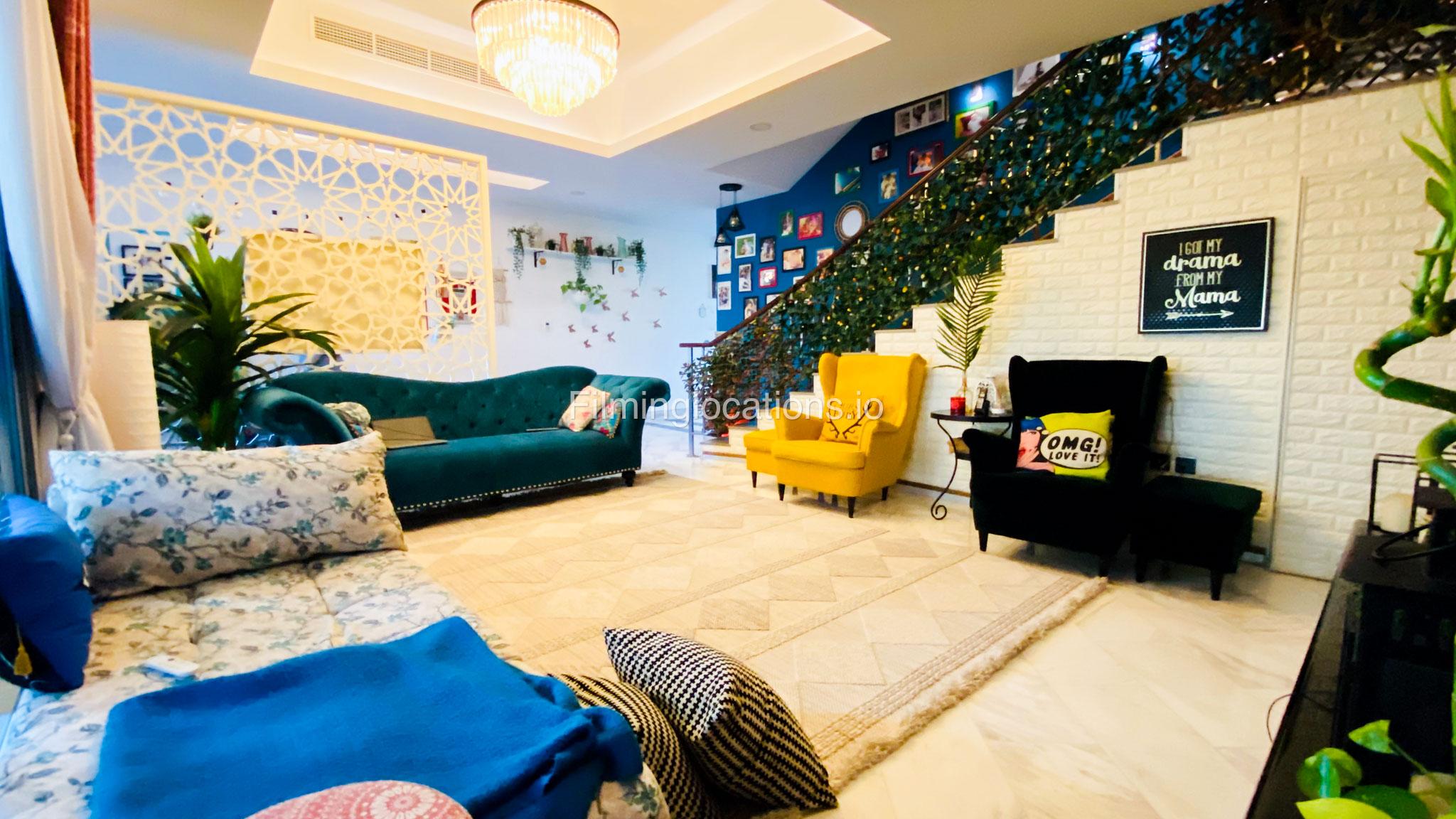 Our colorful Bohemian style villa in Dubai is perfect for filming. It features 3 bedrooms, a wooden playhouse in the garden, a piano, a beautiful garden, a balcony, a kitchen, and a spiral staircase. With its unique decor and vibrant interiors, this villa provides a stunning backdrop for any project. Book now to secure this fantastic filming location.