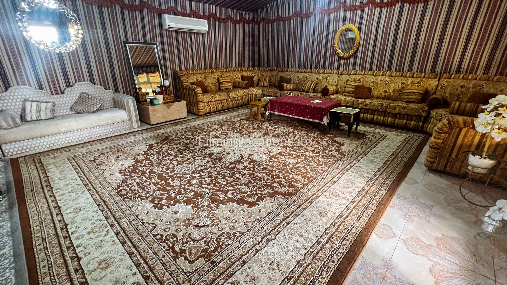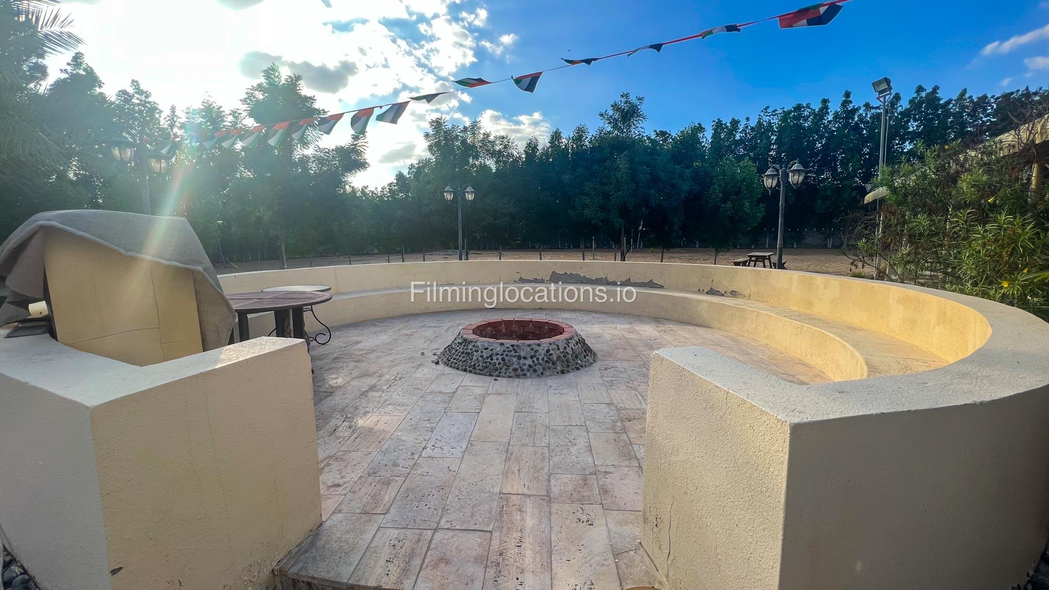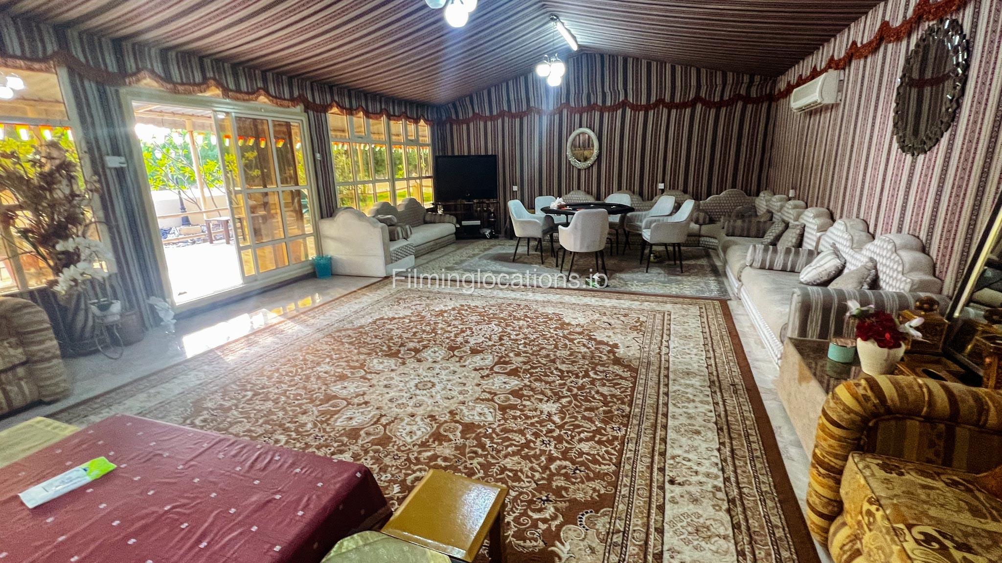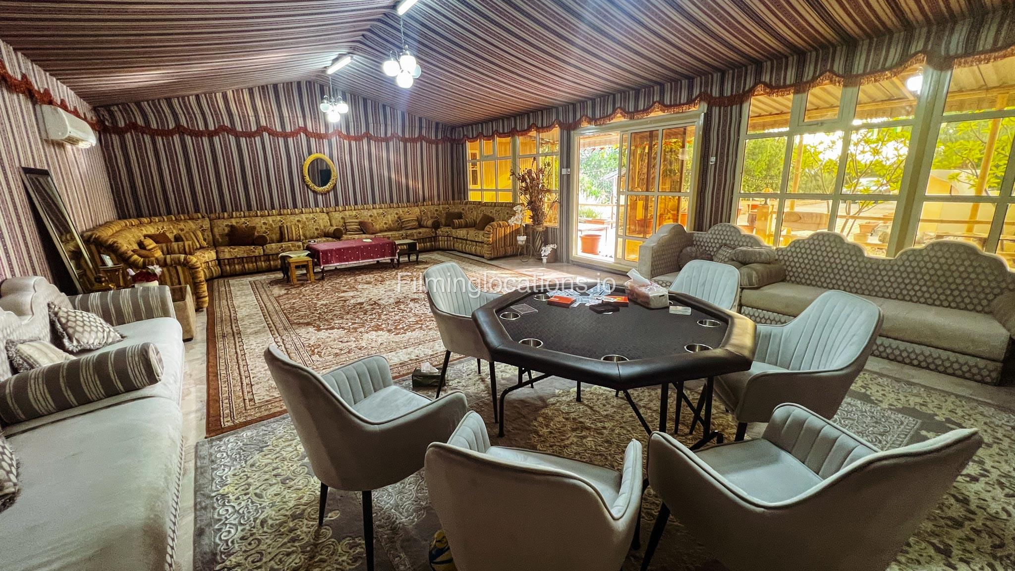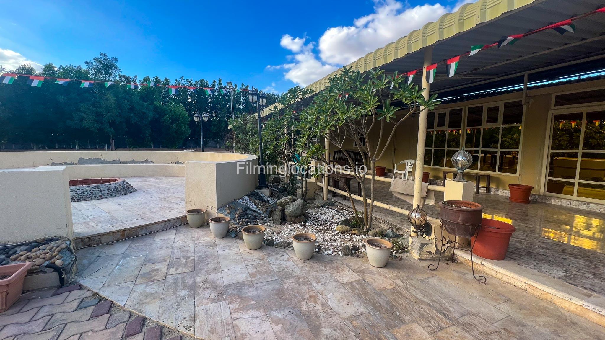 This exquisite farm home in Dubai offers a captivating setting for your next project. Featuring a vibrant green garden, charming animals, and a cozy fire pit, the location provides a beautiful blend of natural and modern elements. The elegant Majlis, complete with a TV, adds a touch of comfort. Perfect for a variety of scenes, this home boasts a picturesque backdrop and a warm, inviting atmosphere.