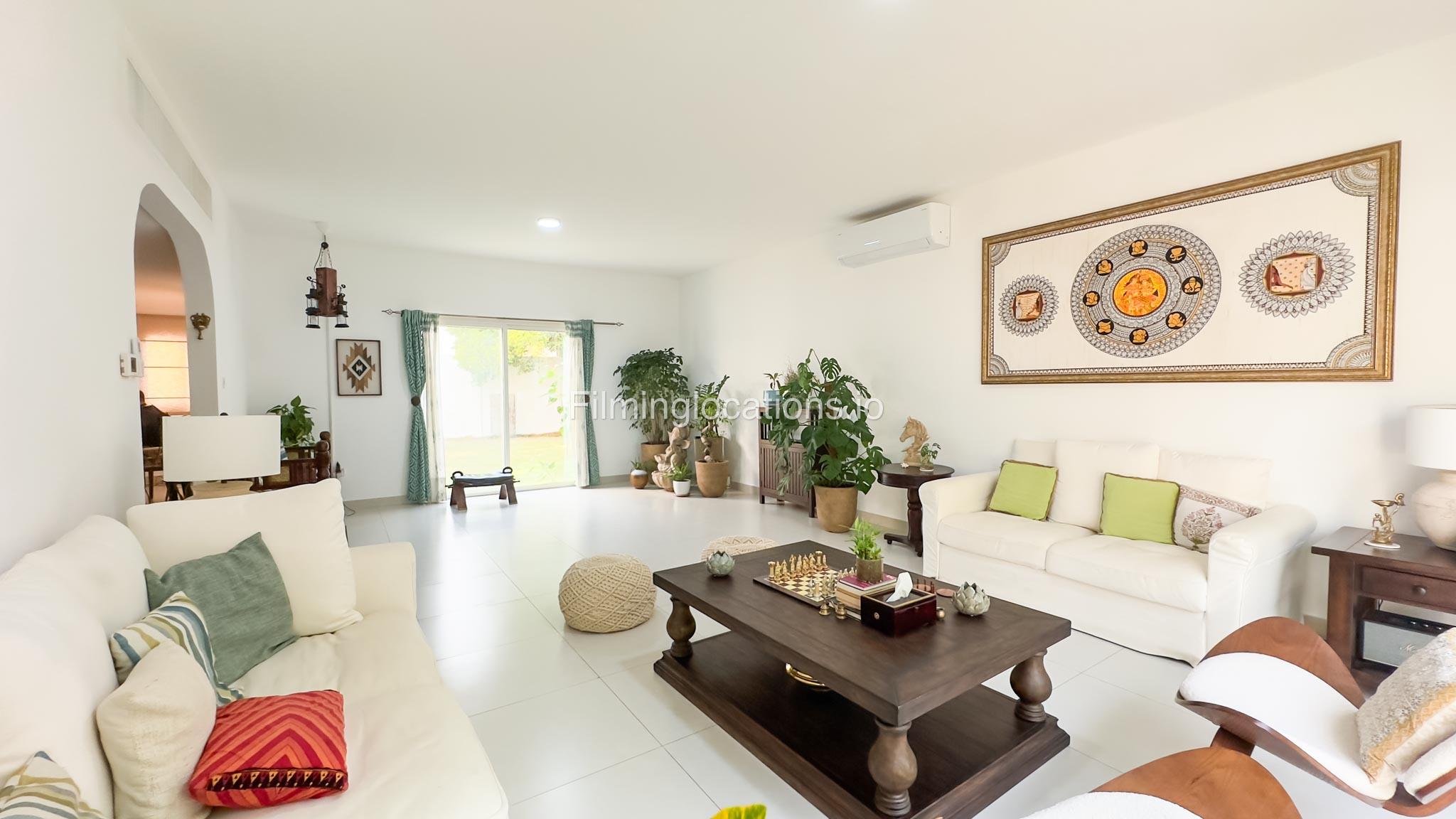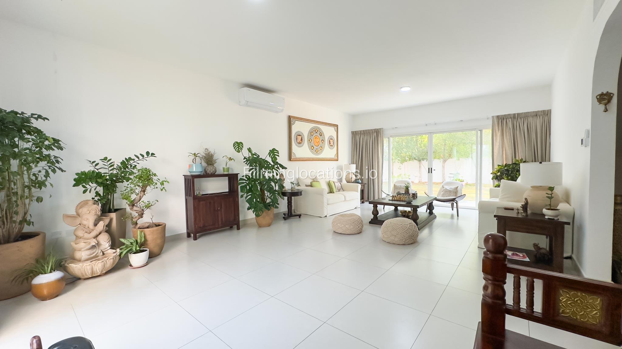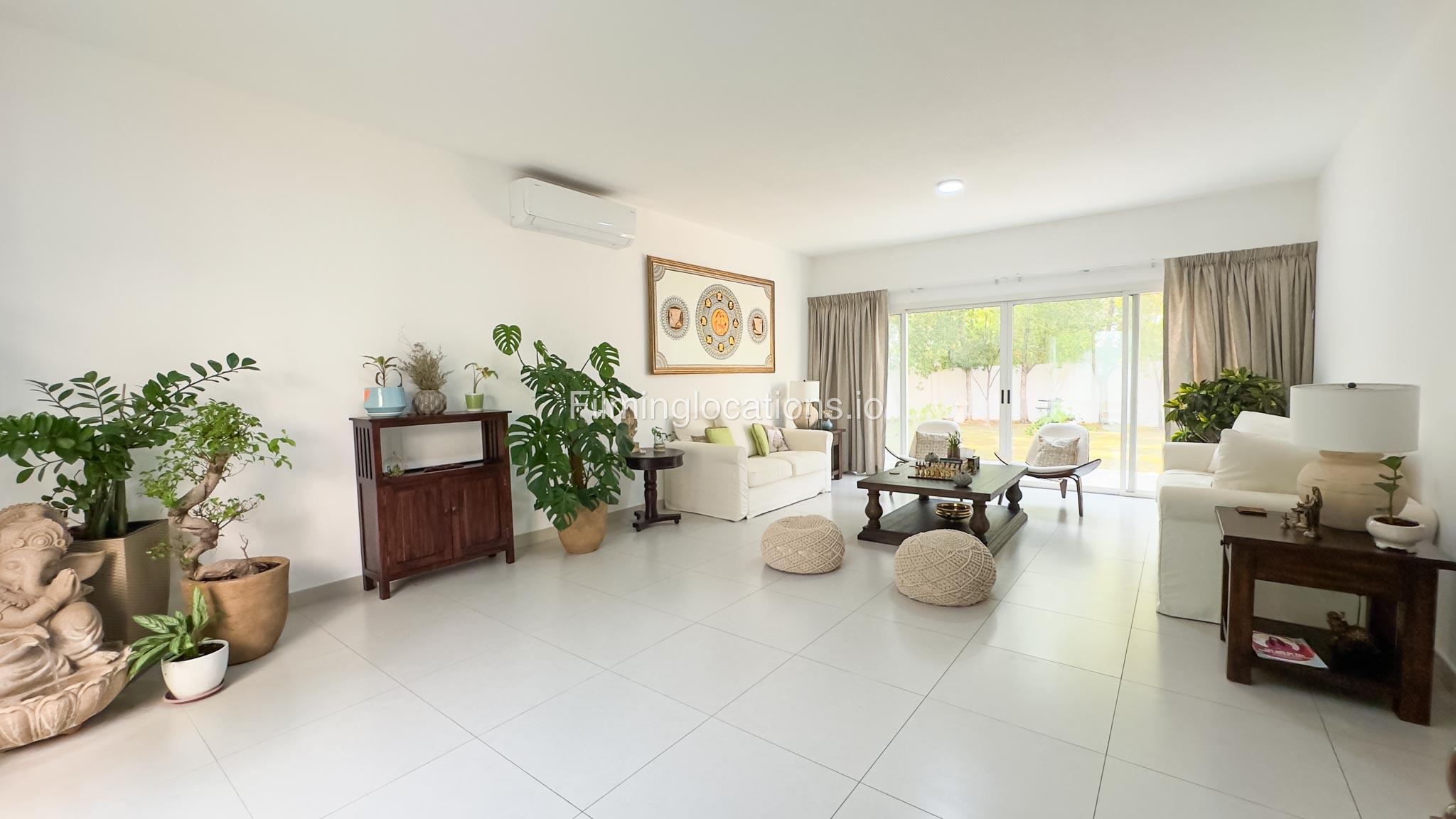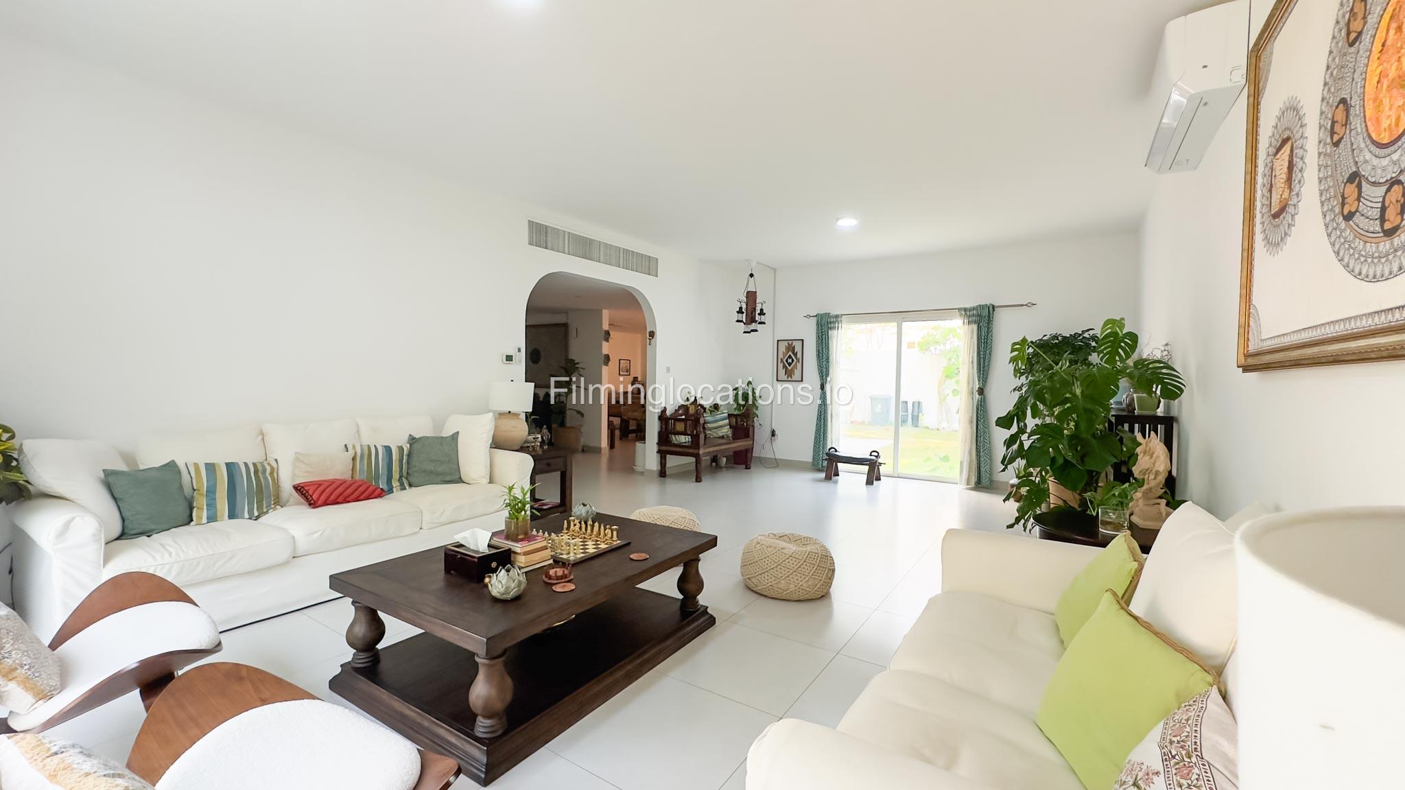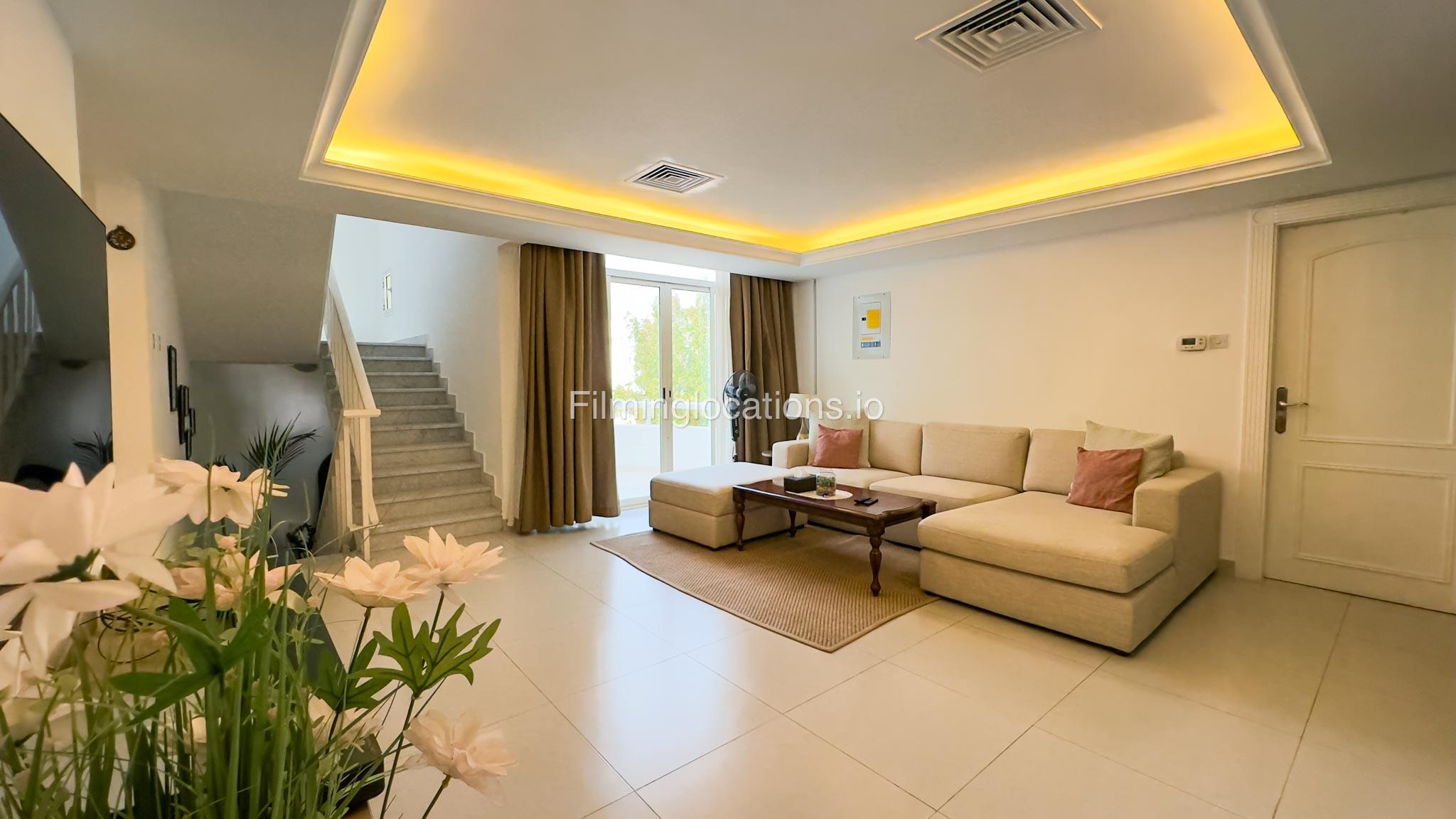Our villa is a modern one-bedroom villa tucked away in a serene environment surrounded by lush greenery. The villa features a spacious lounge area, a fully equipped kitchen, and a bathroom—all on the ground floor for convenient access during shoots, as well as a lounge area on the first floor. Outside, you'll find ample parking space for up to six cars, ensuring hassle-free logistics for your film crew.