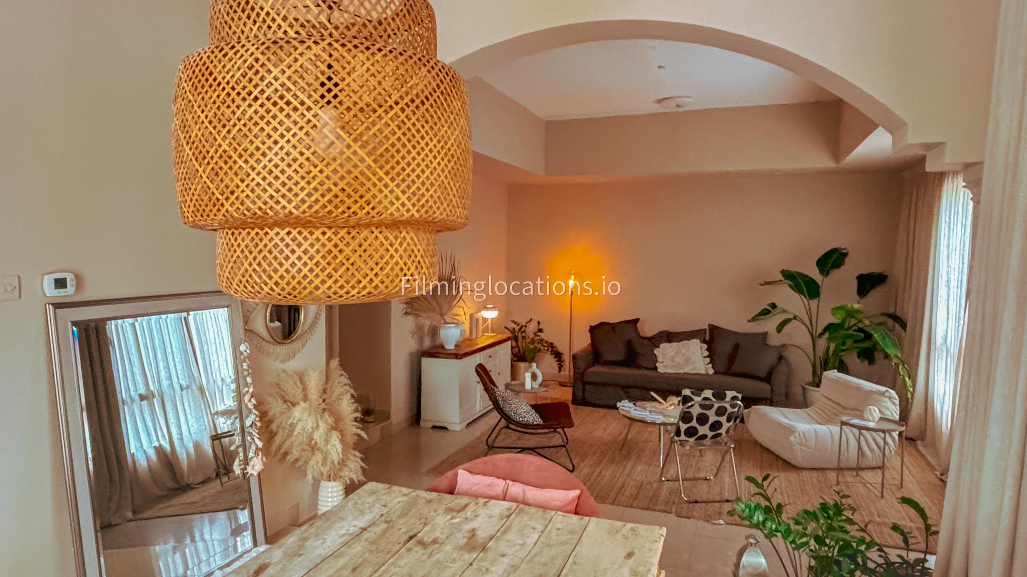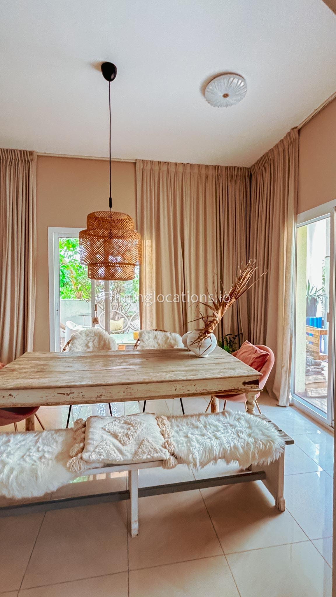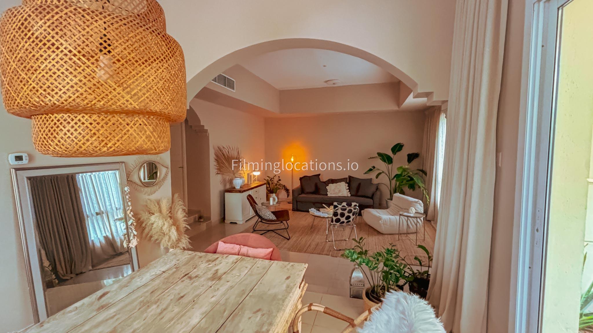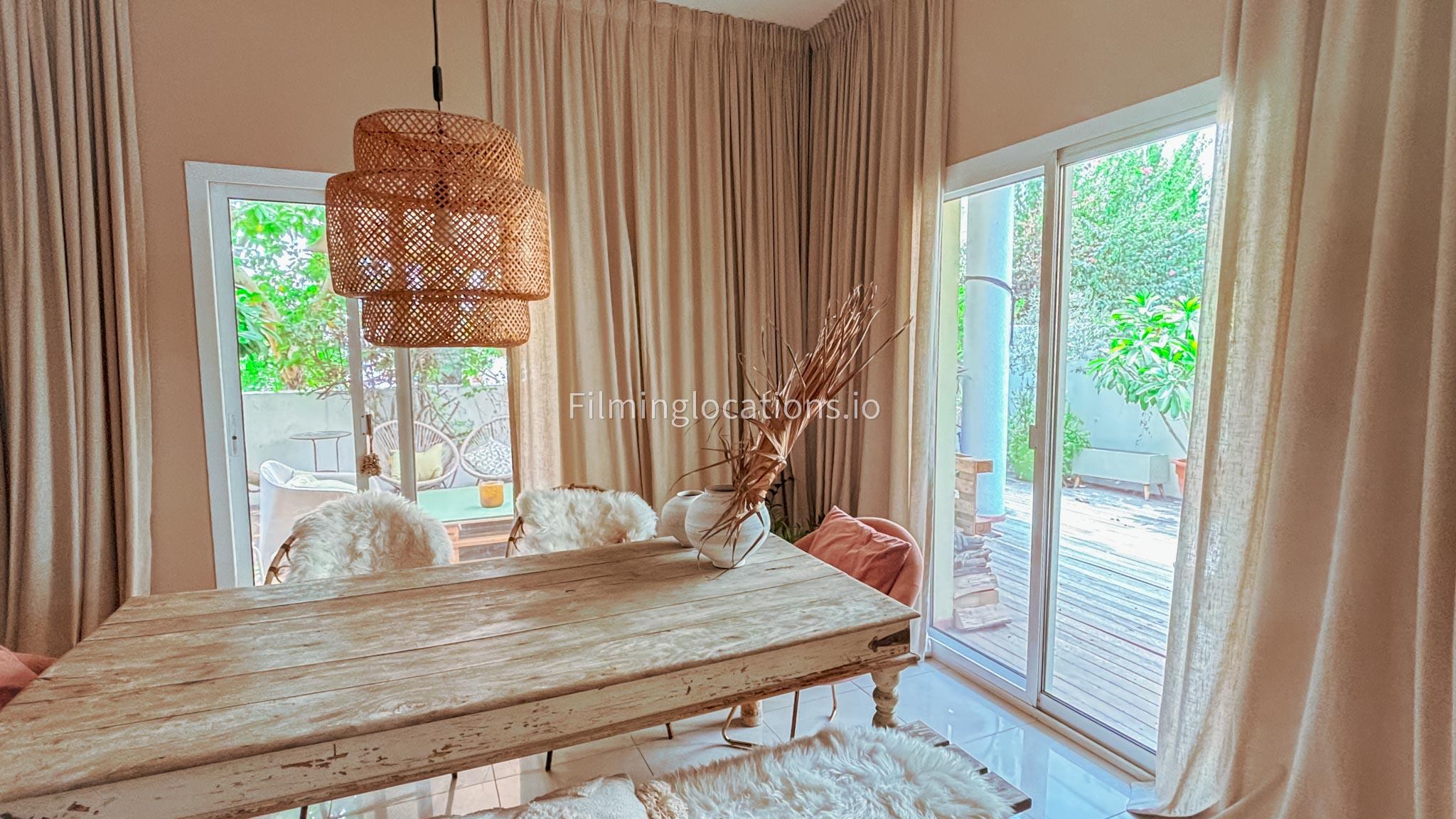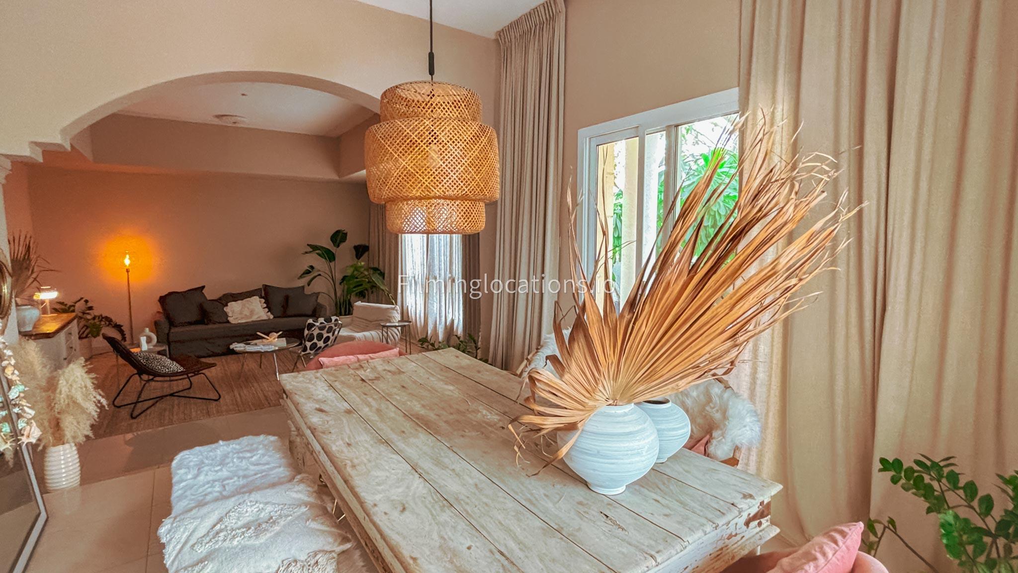 Our Boho-style villa is a perfect location for film shoots that need a cozy and stylish setting. The living room features warm, earthy tones and soft lighting, creating a relaxed and inviting atmosphere. The dining area is bright and aesthetic, with natural wood furniture, wicker lighting, and large windows that fill the space with natural light. Outside, the quaint backyard includes a comfortable seating area surrounded by greenery, ideal for outdoor scenes.