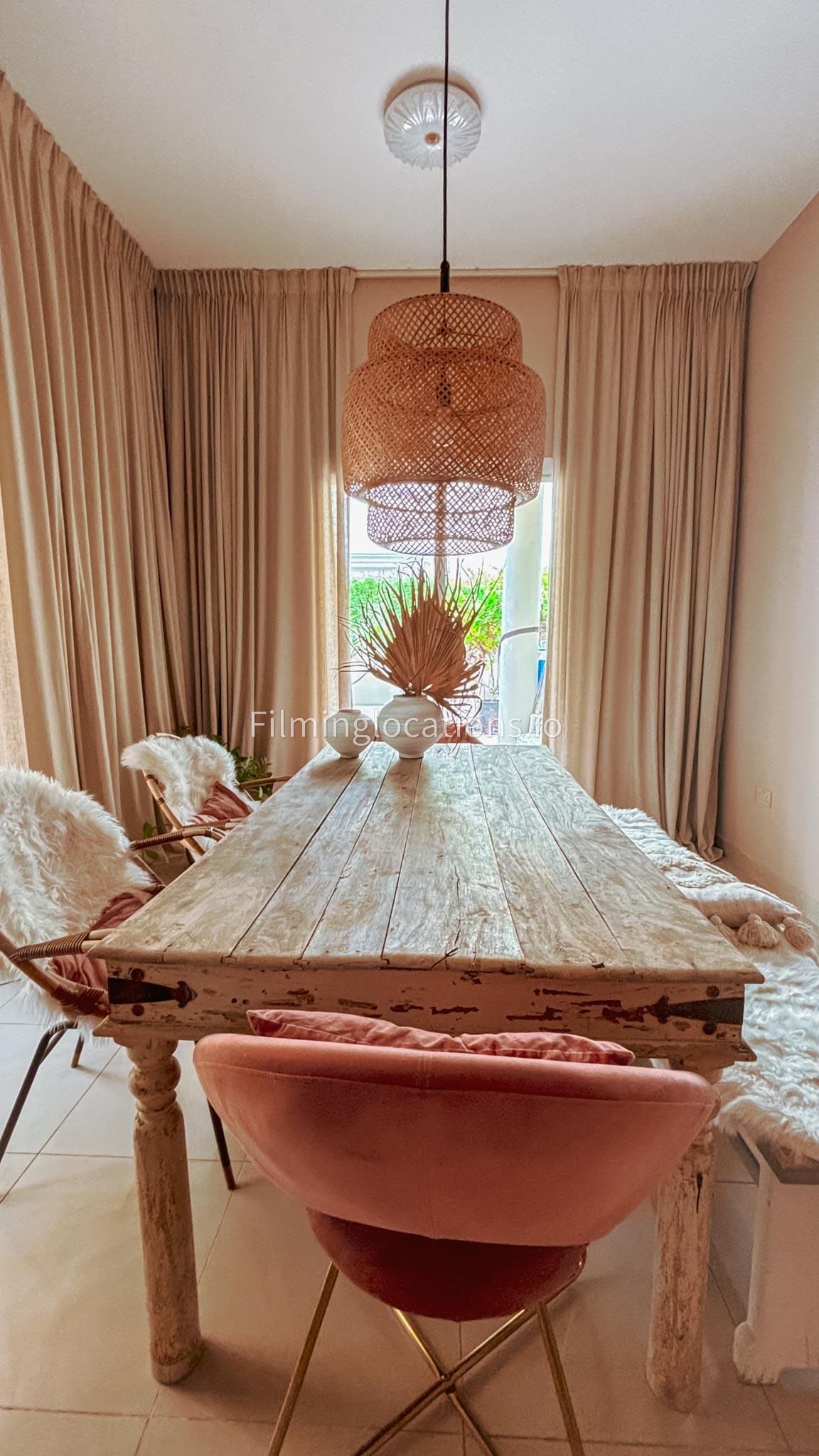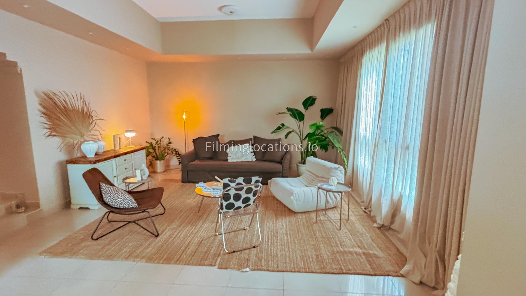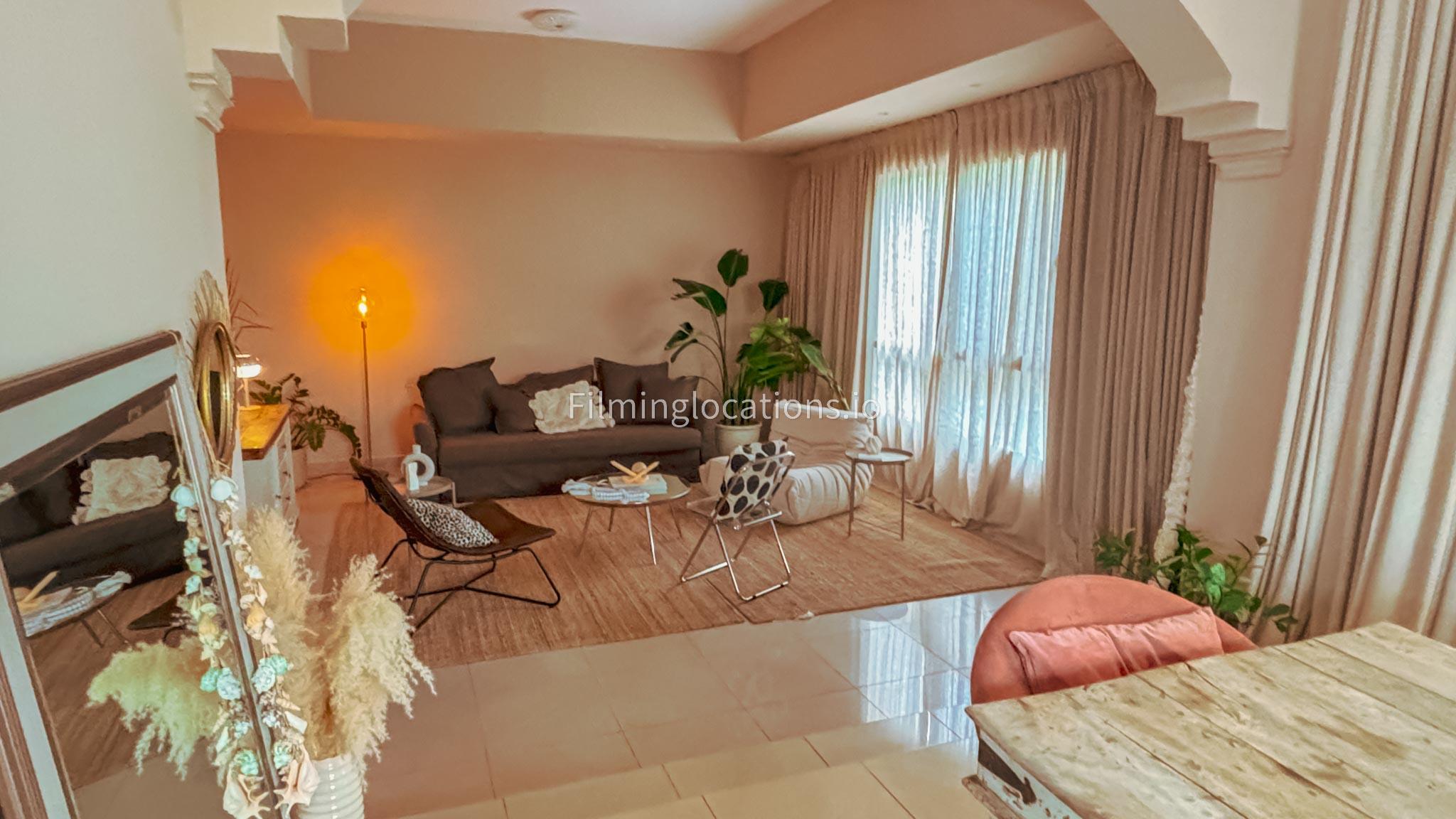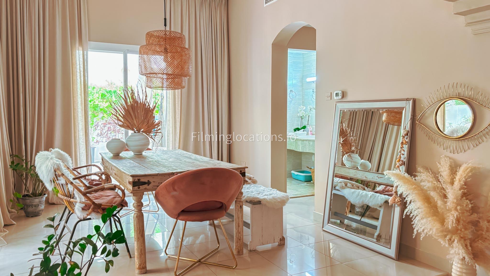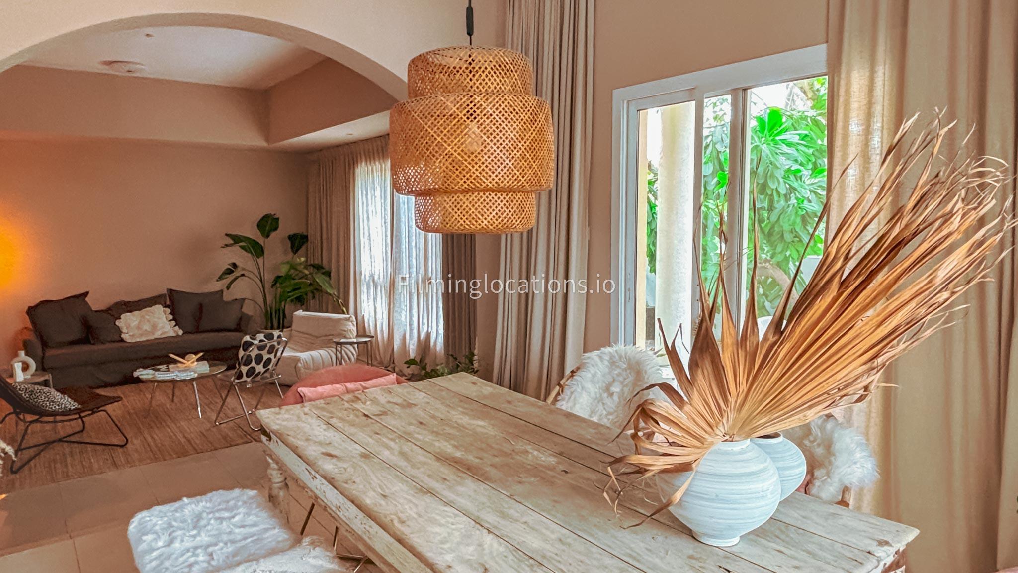 Our Boho-style villa is a perfect location for film shoots that need a cozy and stylish setting. The living room features warm, earthy tones and soft lighting, creating a relaxed and inviting atmosphere. The dining area is bright and aesthetic, with natural wood furniture, wicker lighting, and large windows that fill the space with natural light. Outside, the quaint backyard includes a comfortable seating area surrounded by greenery, ideal for outdoor scenes.