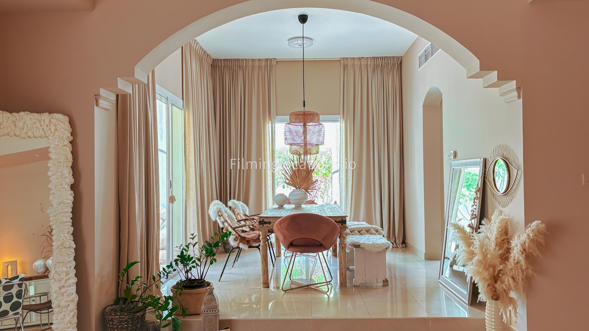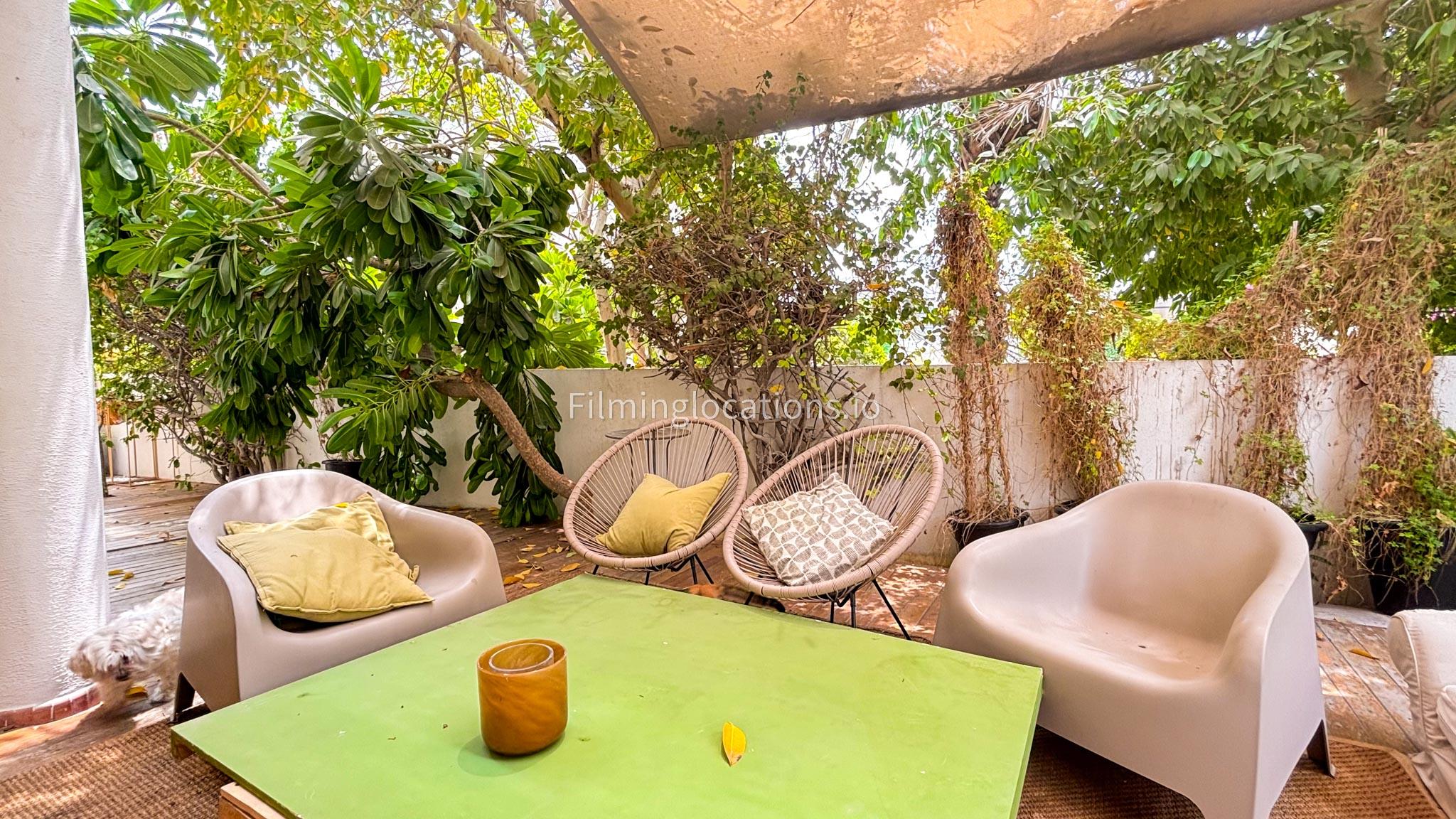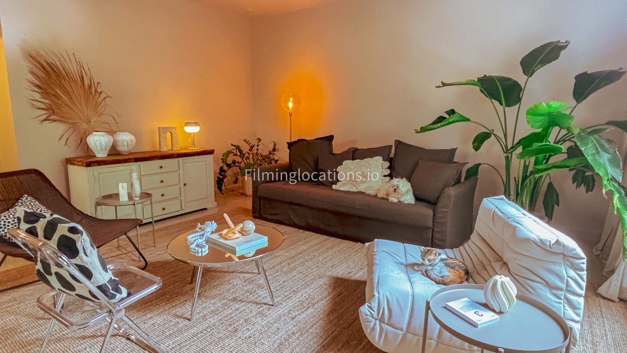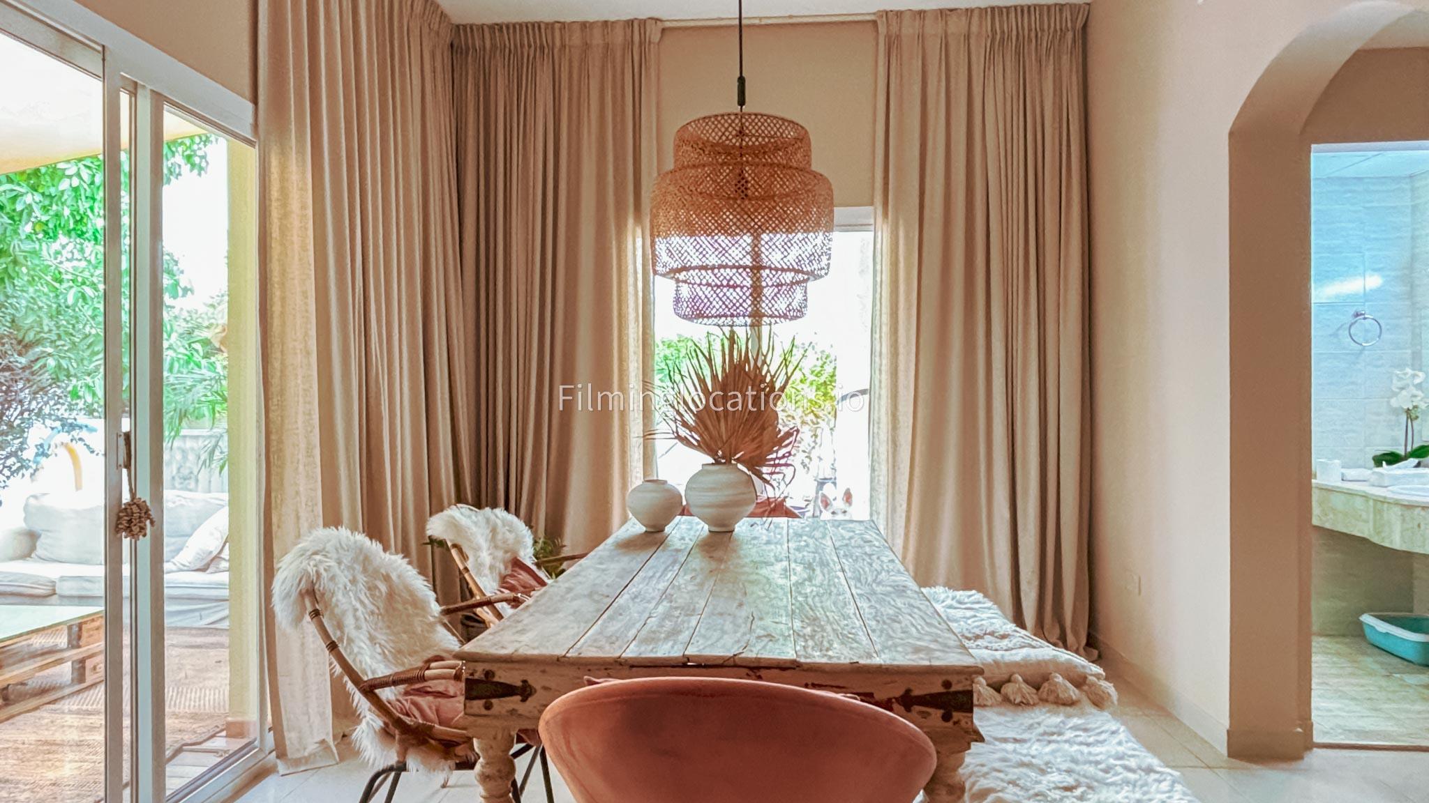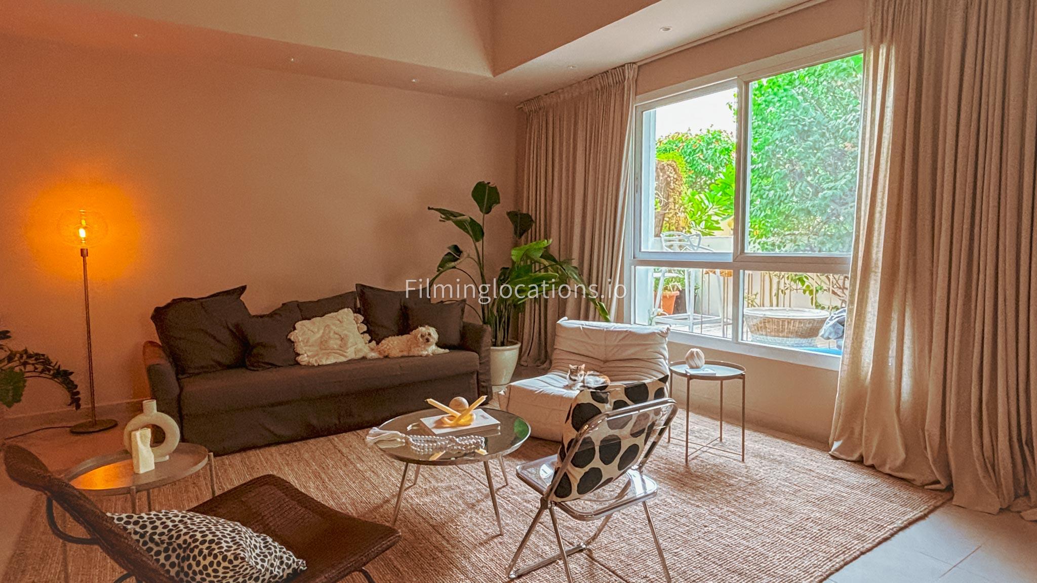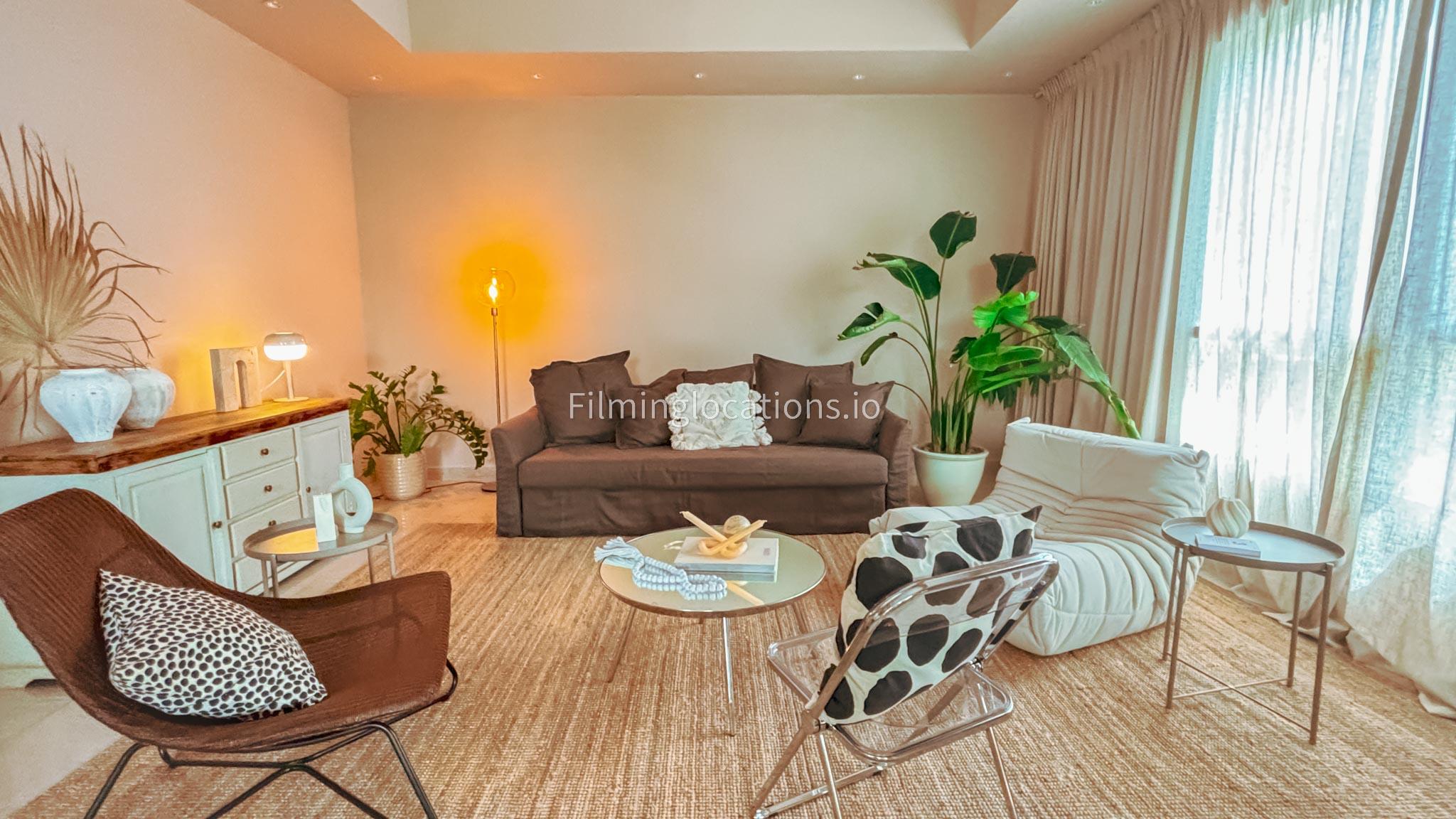 Our Boho-style villa is a perfect location for film shoots that need a cozy and stylish setting. The living room features warm, earthy tones and soft lighting, creating a relaxed and inviting atmosphere. The dining area is bright and aesthetic, with natural wood furniture, wicker lighting, and large windows that fill the space with natural light. Outside, the quaint backyard includes a comfortable seating area surrounded by greenery, ideal for outdoor scenes.