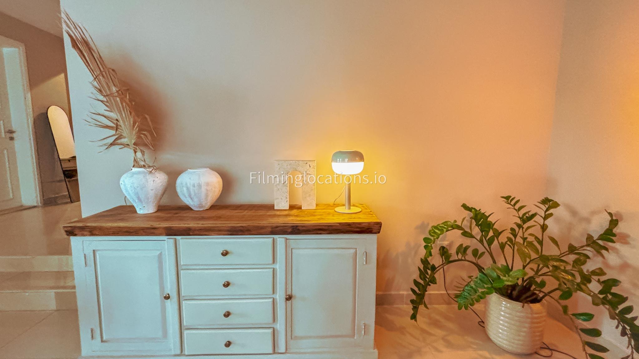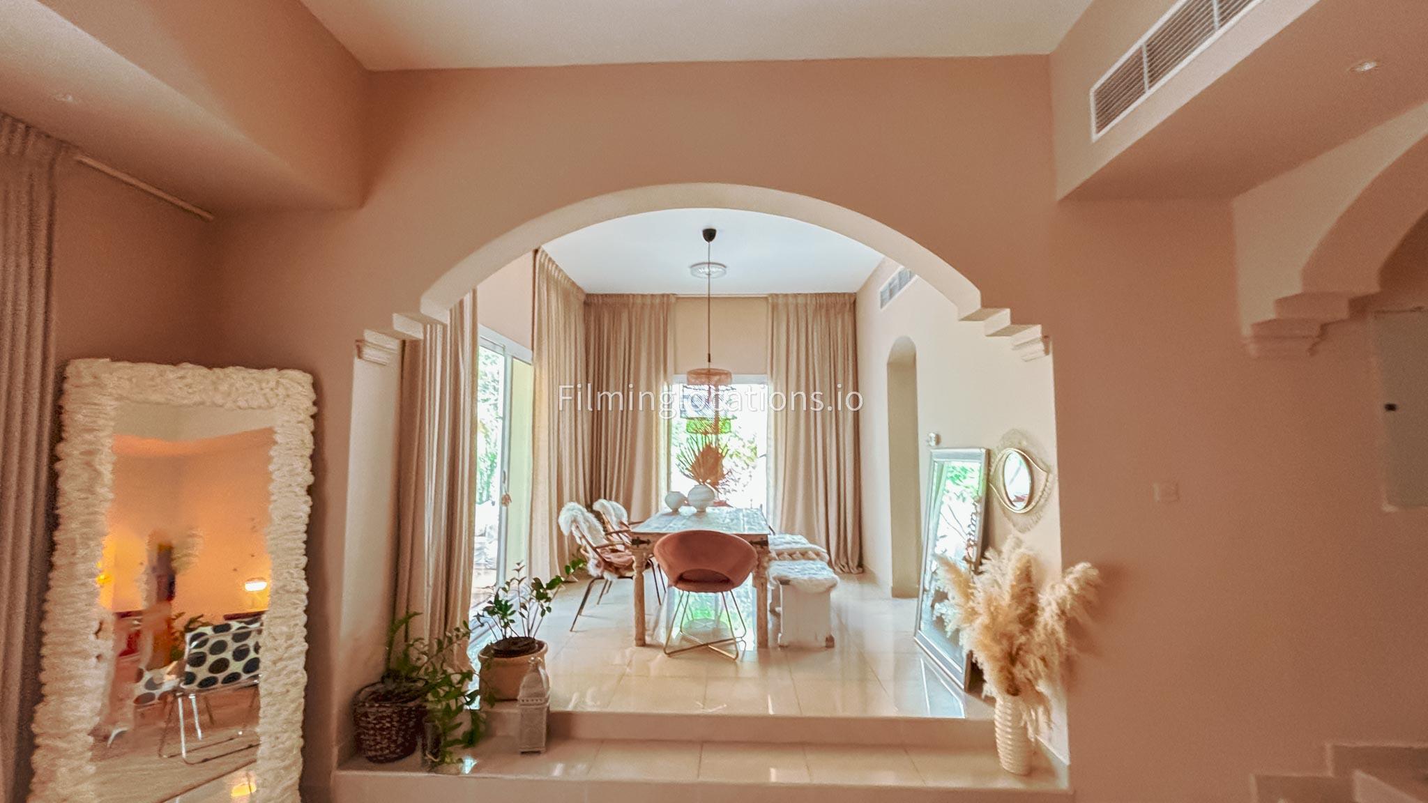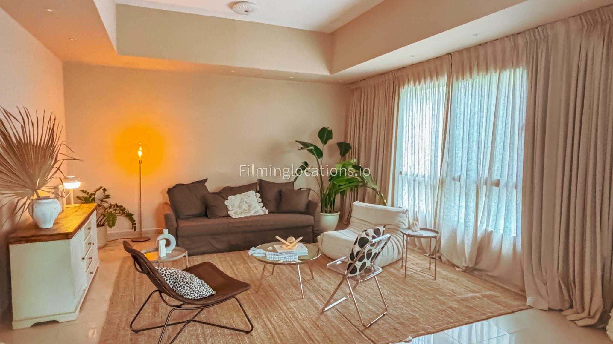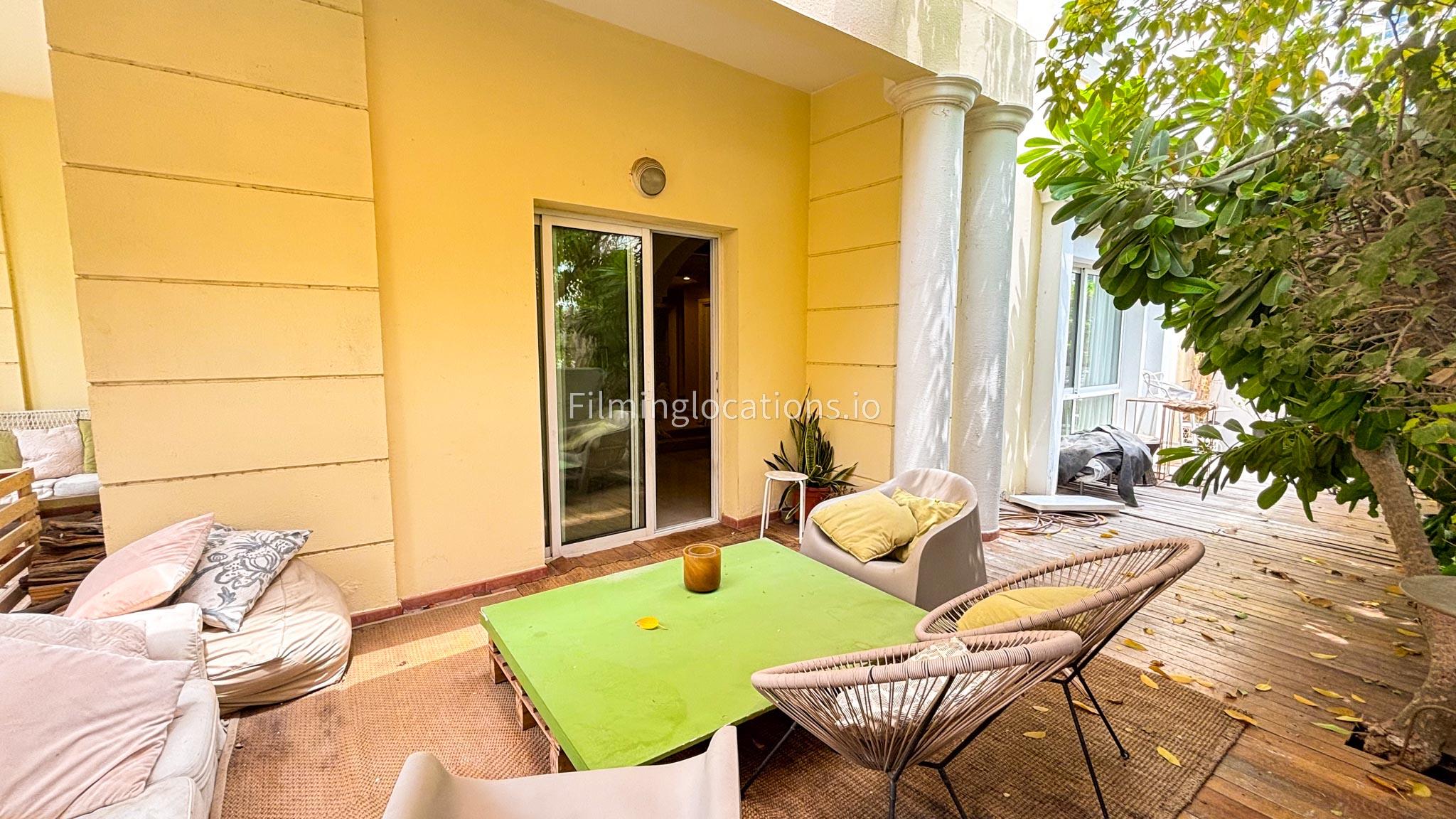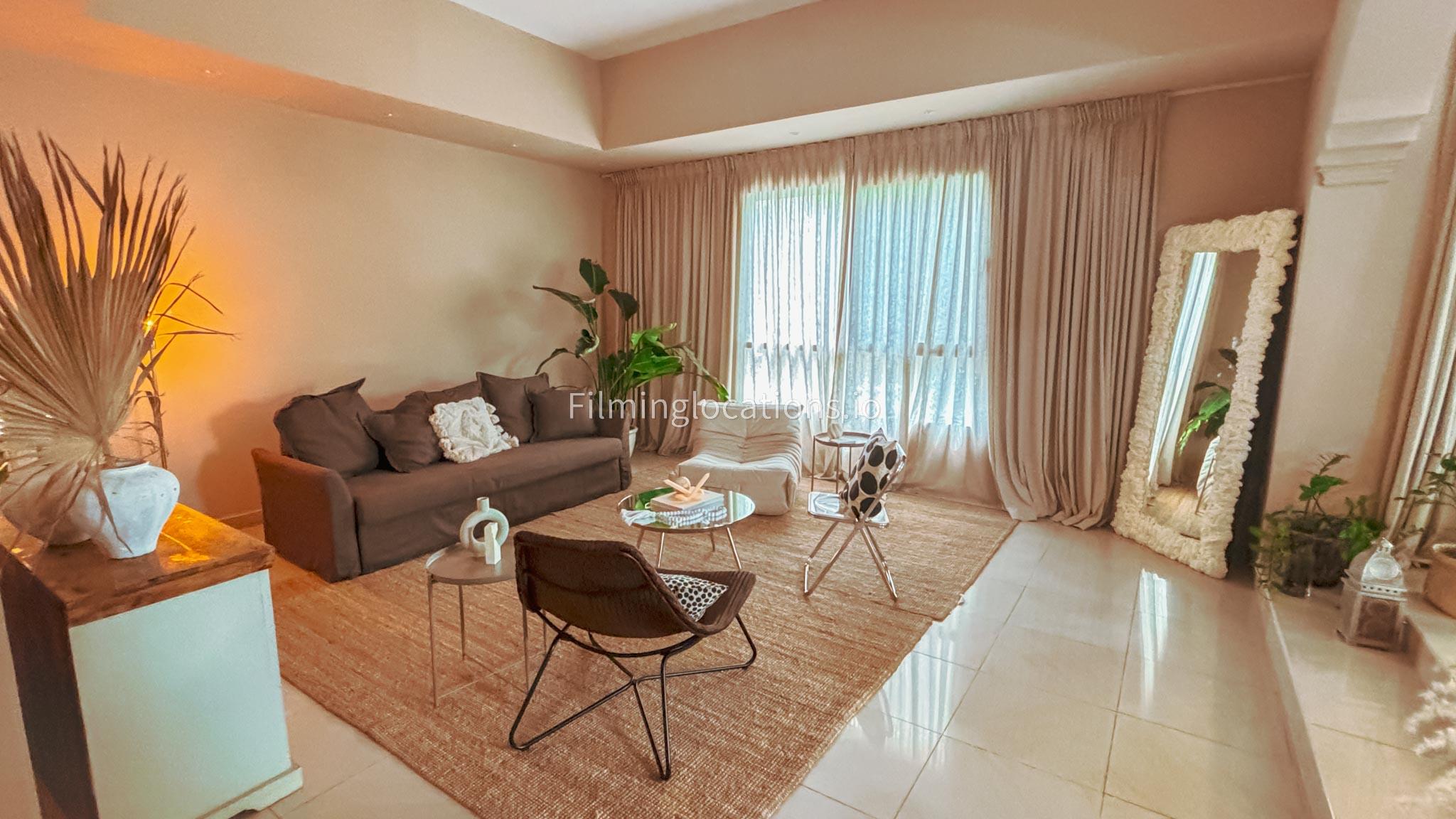 Our Boho-style villa is a perfect location for film shoots that need a cozy and stylish setting. The living room features warm, earthy tones and soft lighting, creating a relaxed and inviting atmosphere. The dining area is bright and aesthetic, with natural wood furniture, wicker lighting, and large windows that fill the space with natural light. Outside, the quaint backyard includes a comfortable seating area surrounded by greenery, ideal for outdoor scenes.