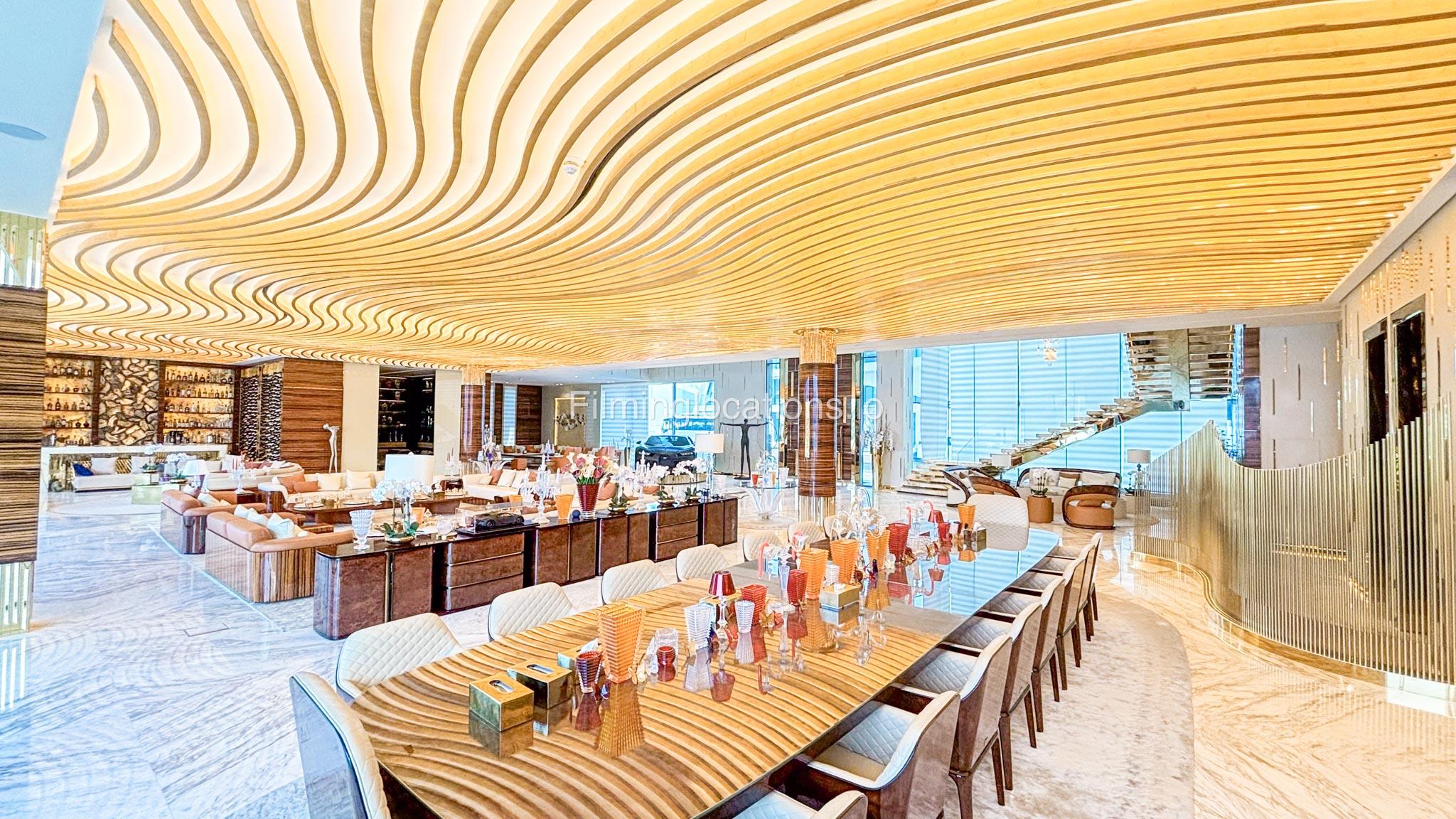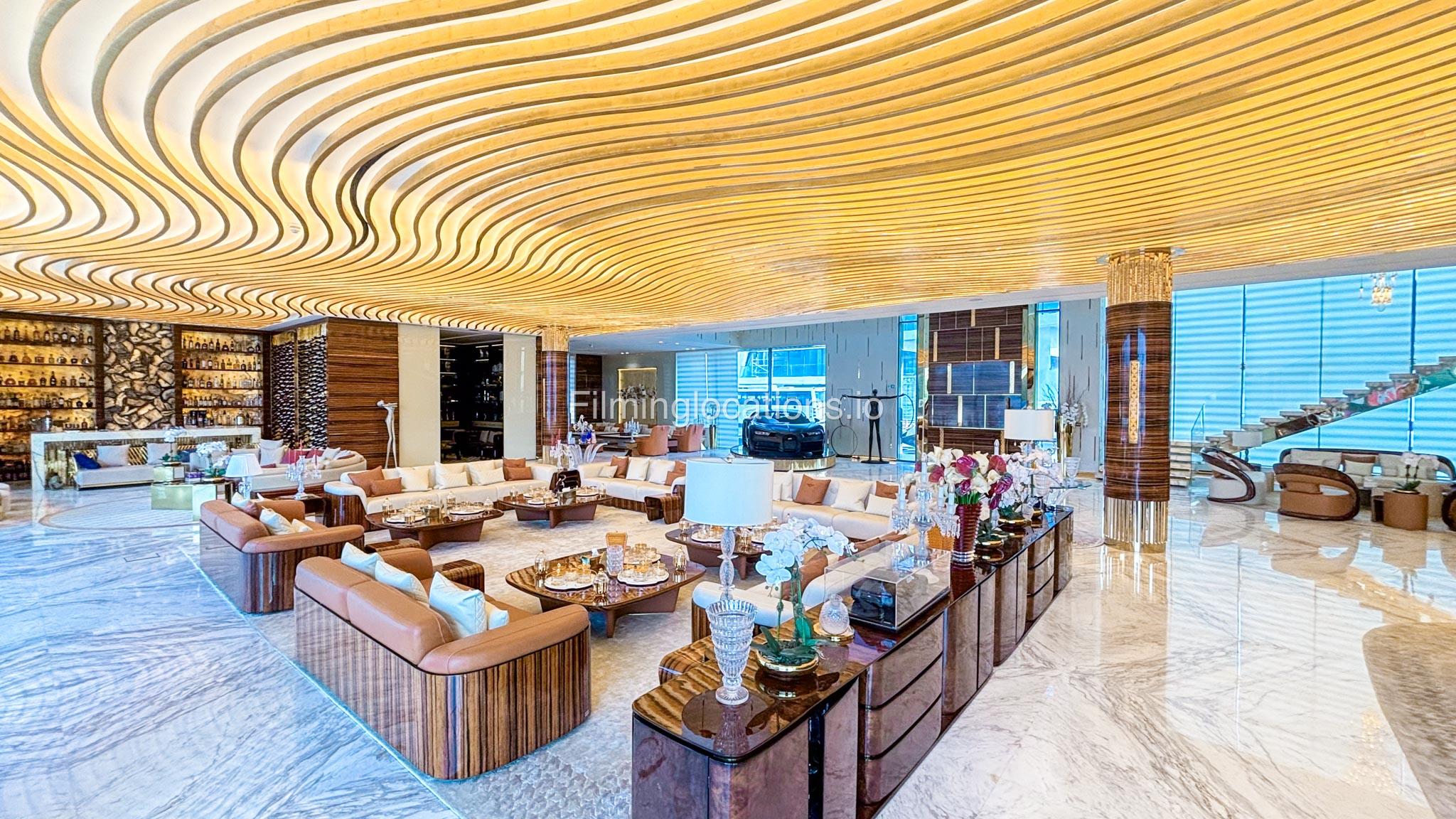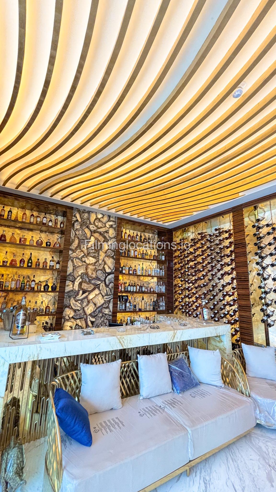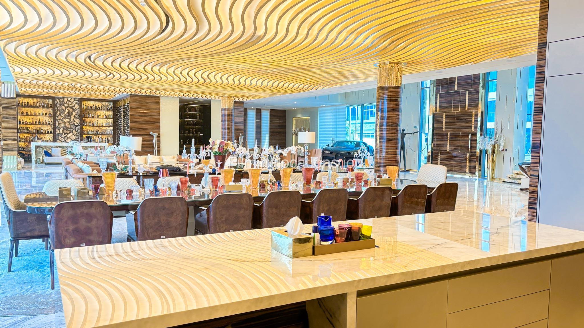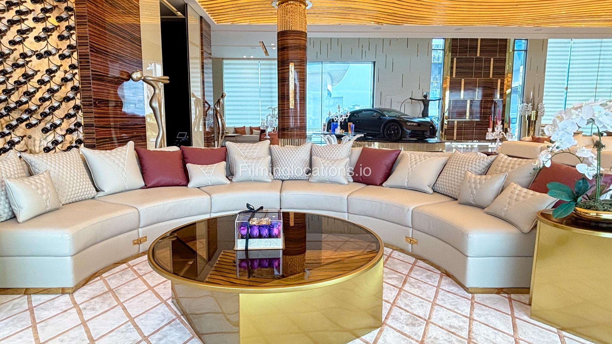 The interior is furnished with the finest pieces from Bentley, Fendi, Baccarat, Hadi, Armani, and Chanel, creating a sophisticated and stylish environment. The ground floor boasts an open kitchen, a bar room with luxurious sofas, and multiple lounge areas, offering a variety of settings for different scenes.