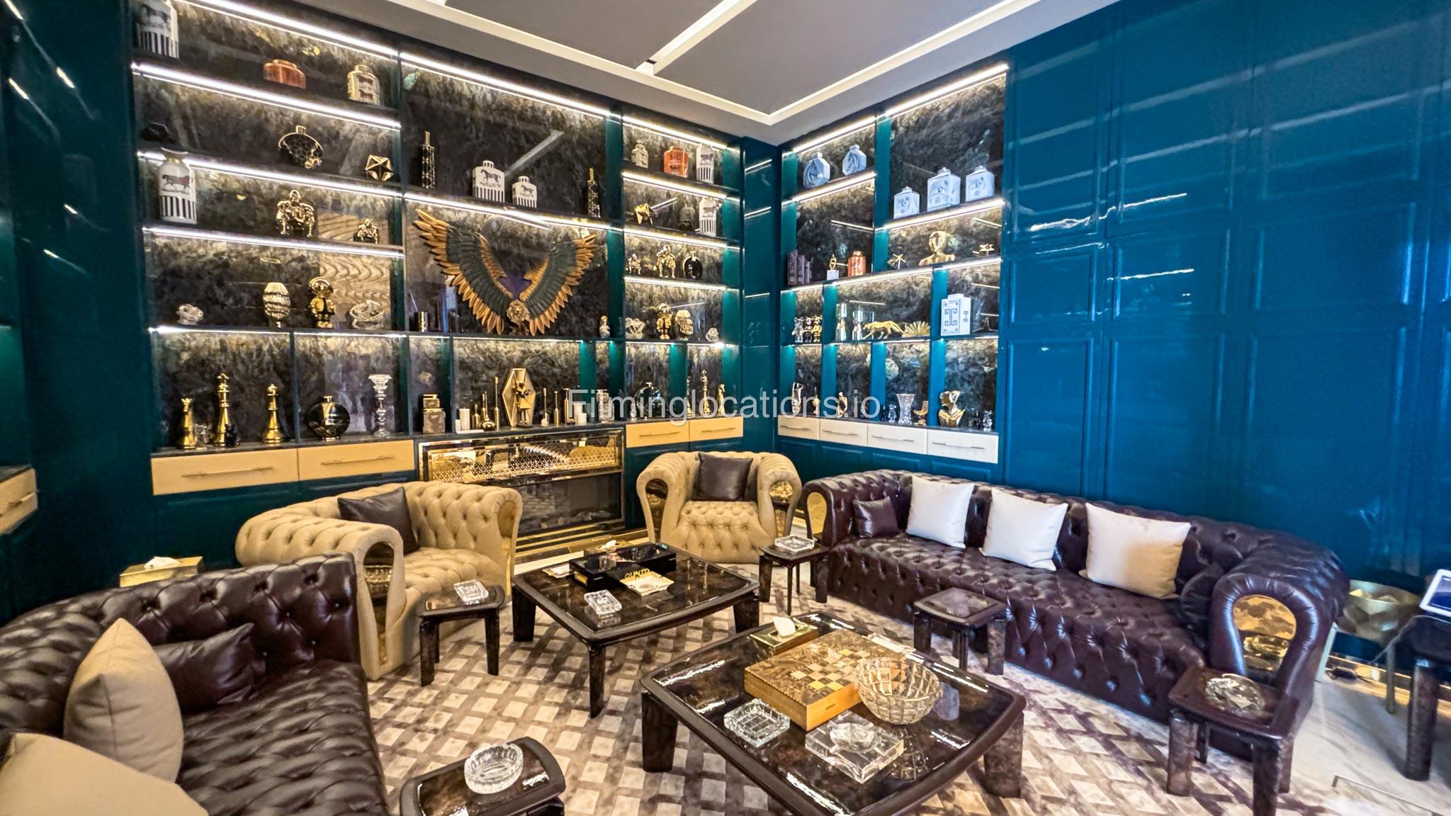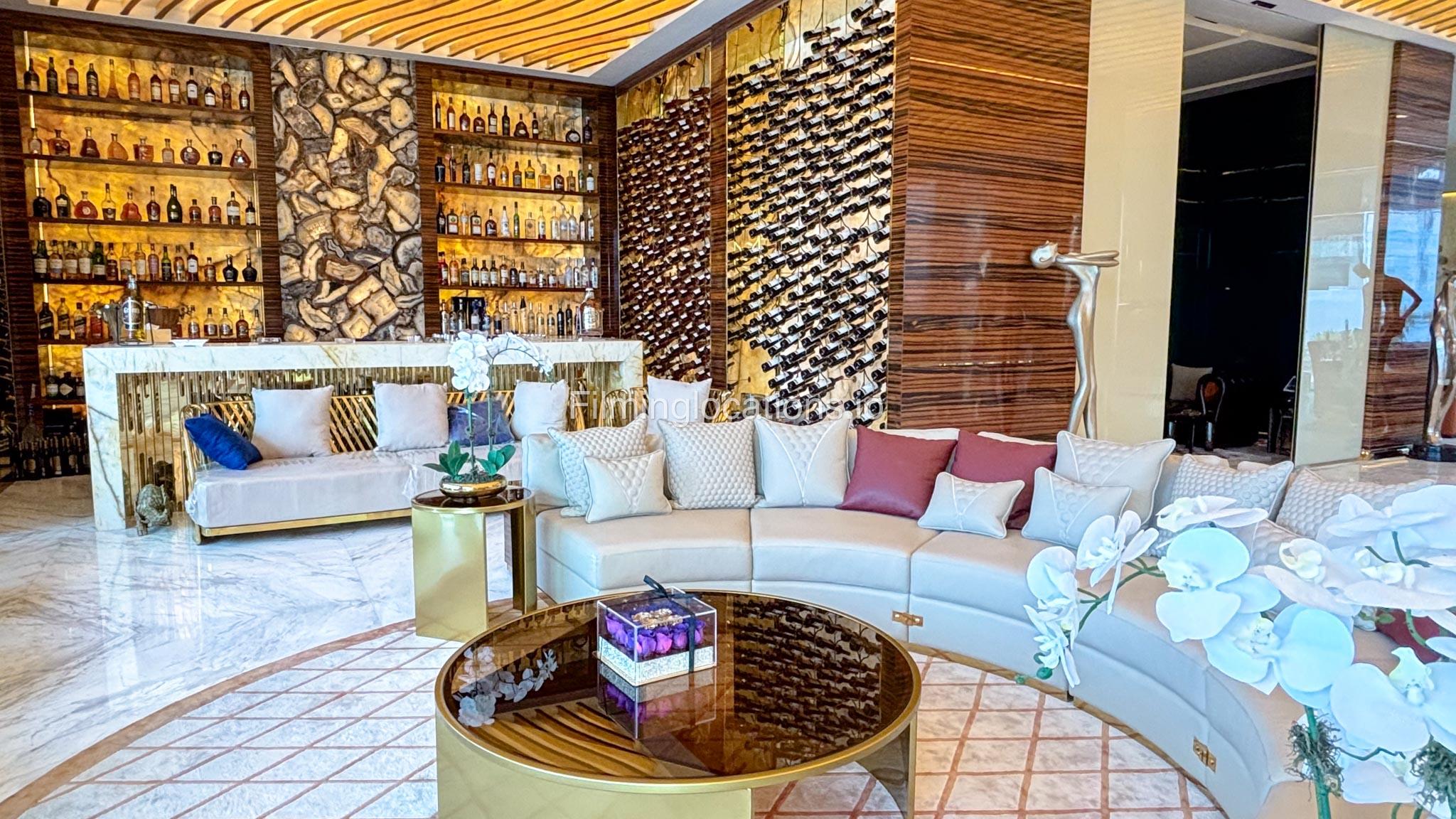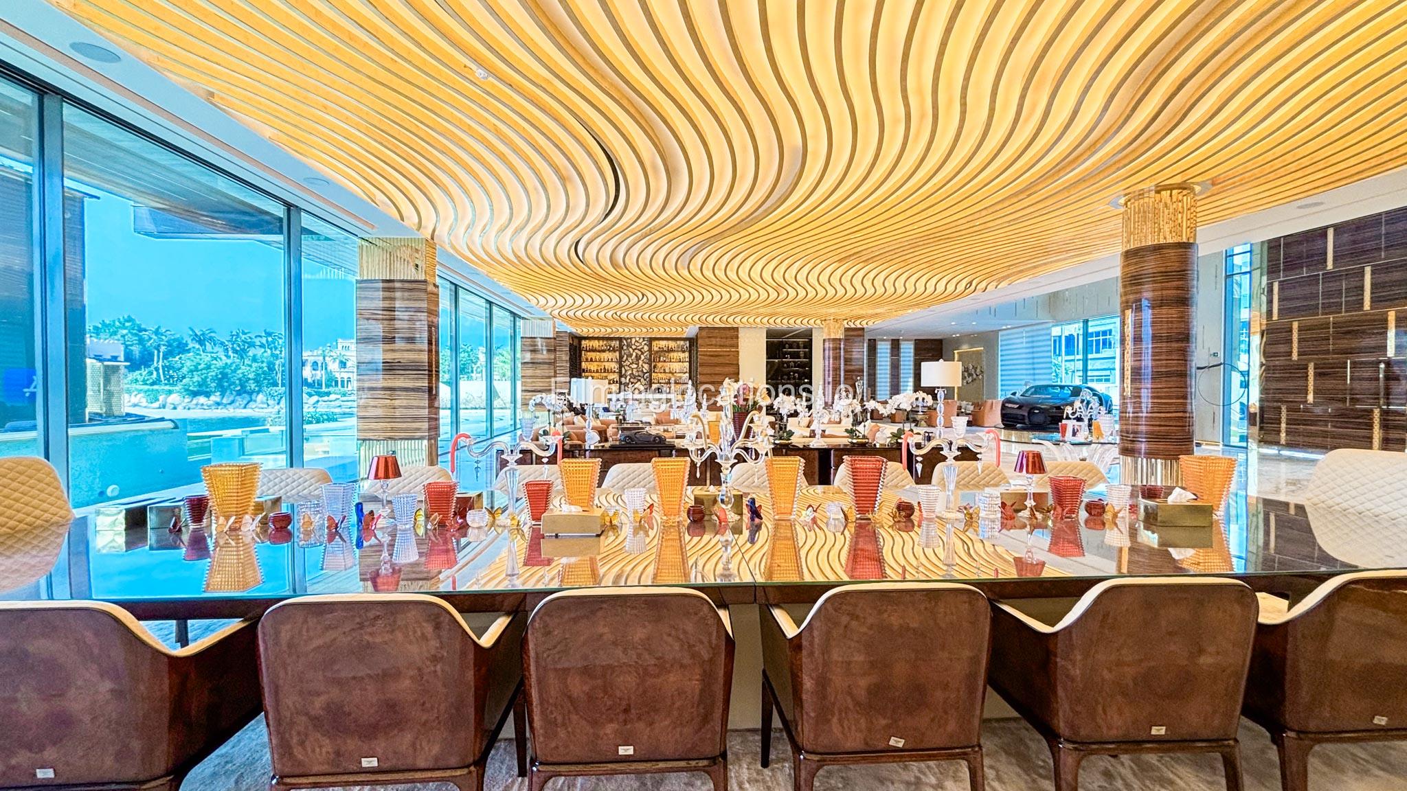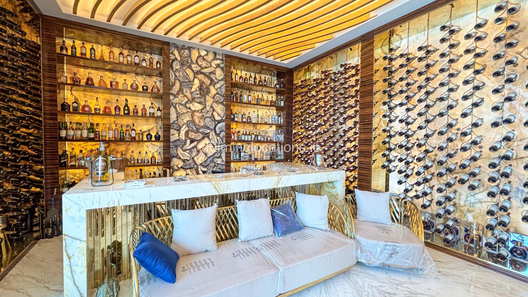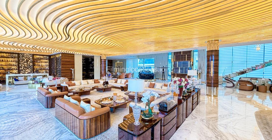 The interior is furnished with the finest pieces from Bentley, Fendi, Baccarat, Hadi, Armani, and Chanel, creating a sophisticated and stylish environment. The ground floor boasts an open kitchen, a bar room with luxurious sofas, and multiple lounge areas, offering a variety of settings for different scenes.