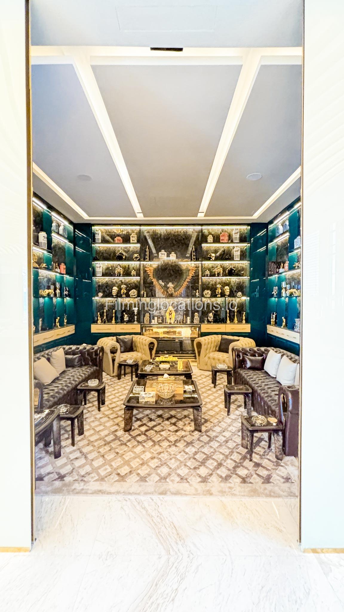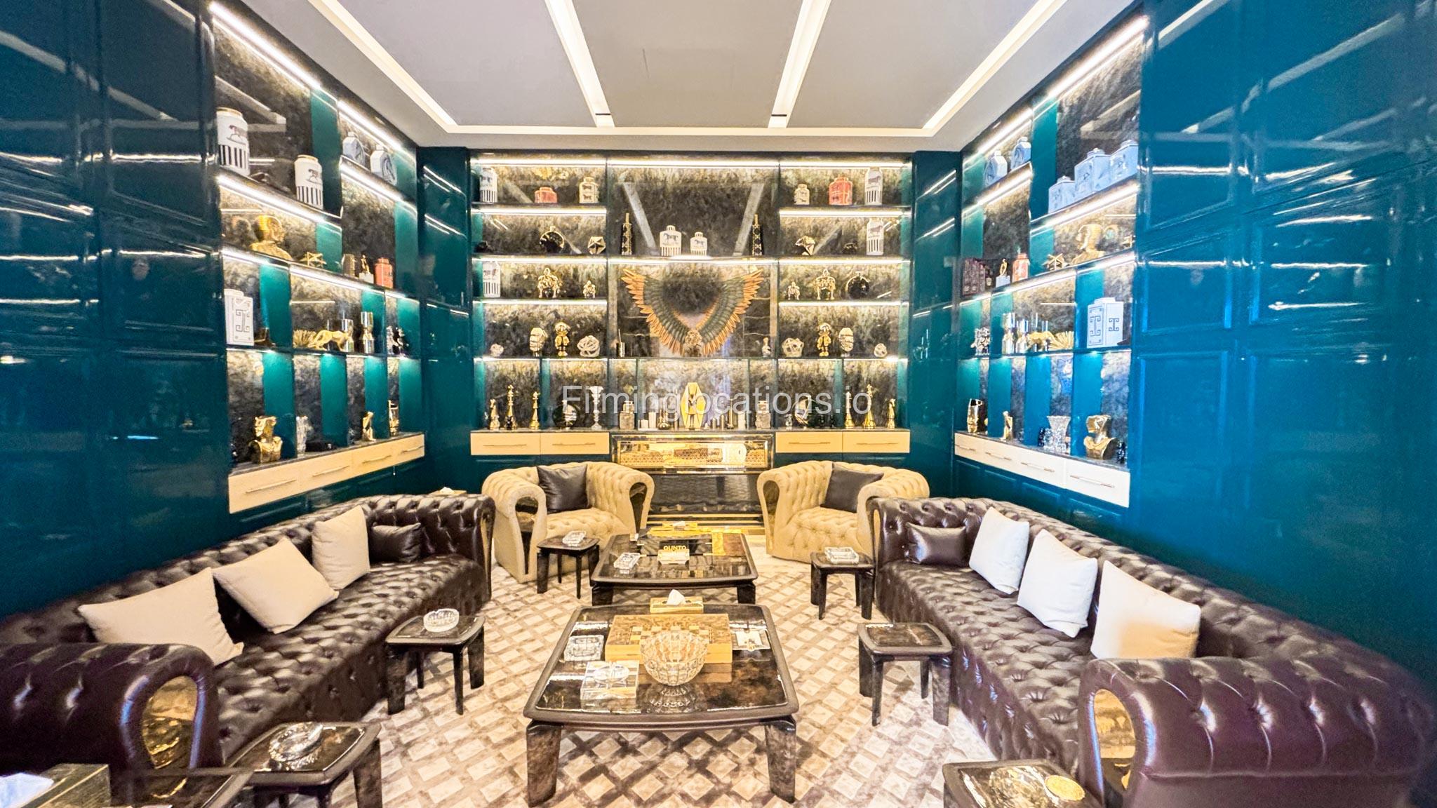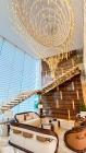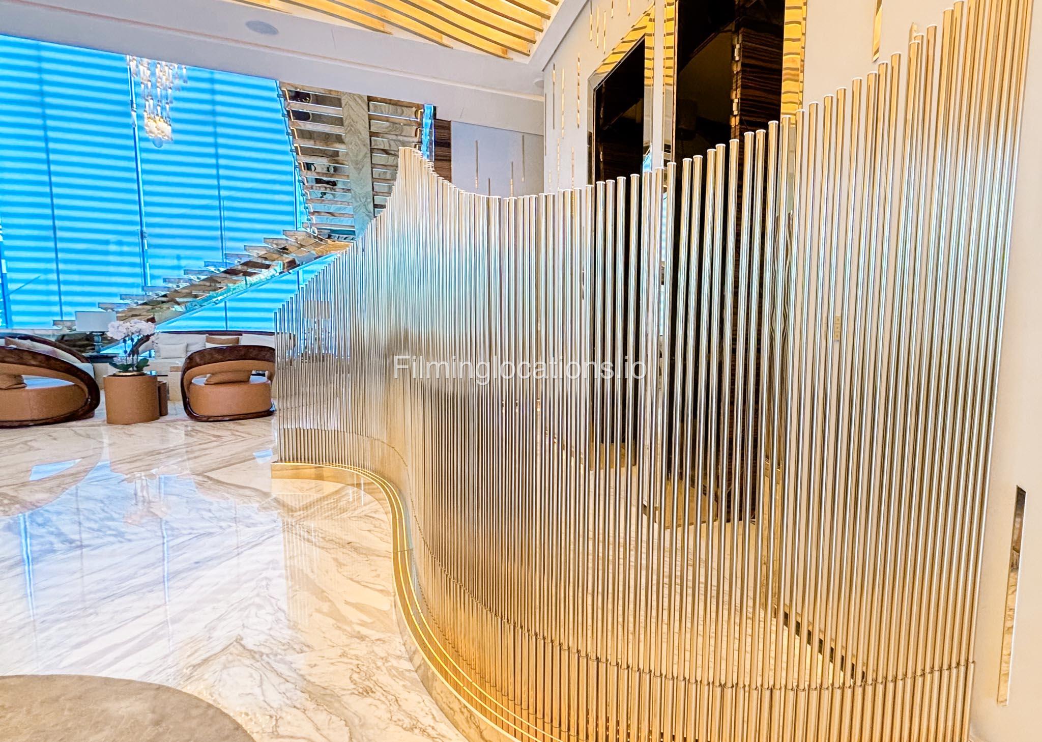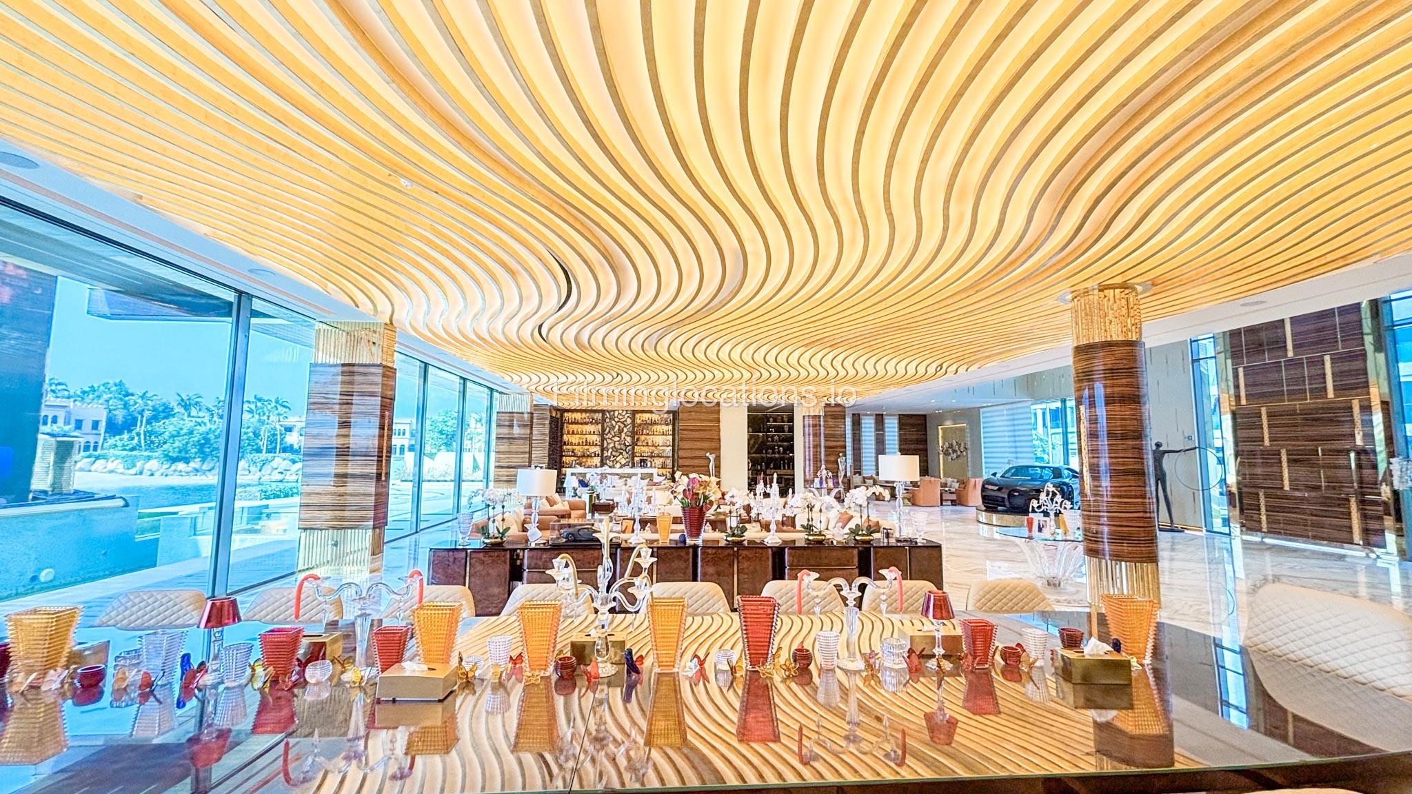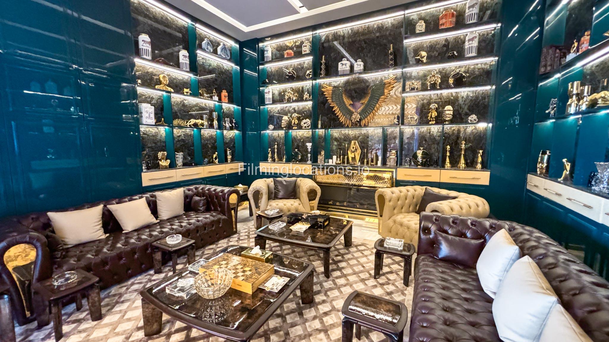 The interior is furnished with the finest pieces from Bentley, Fendi, Baccarat, Hadi, Armani, and Chanel, creating a sophisticated and stylish environment. The ground floor boasts an open kitchen, a bar room with luxurious sofas, and multiple lounge areas, offering a variety of settings for different scenes.