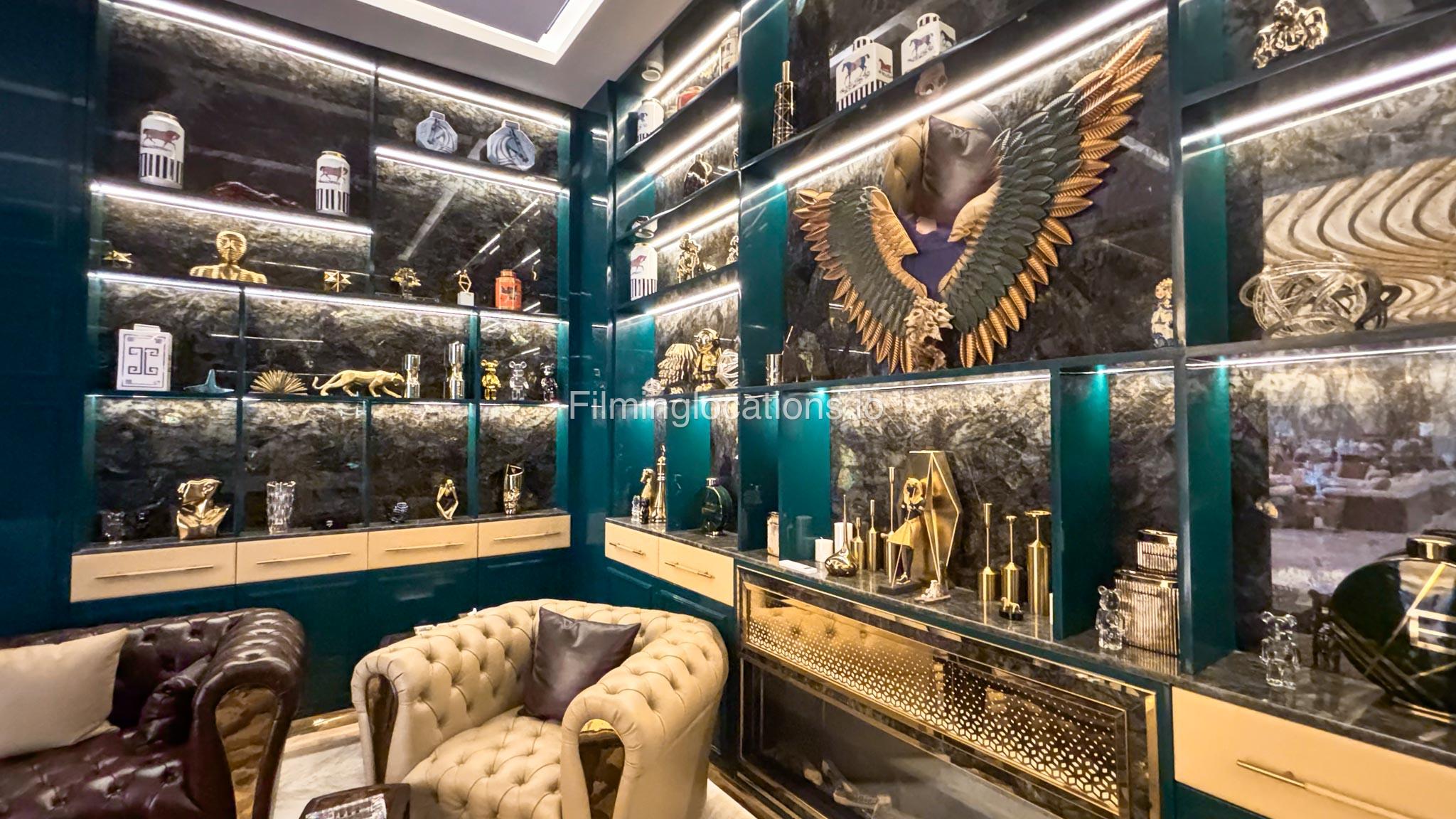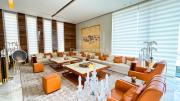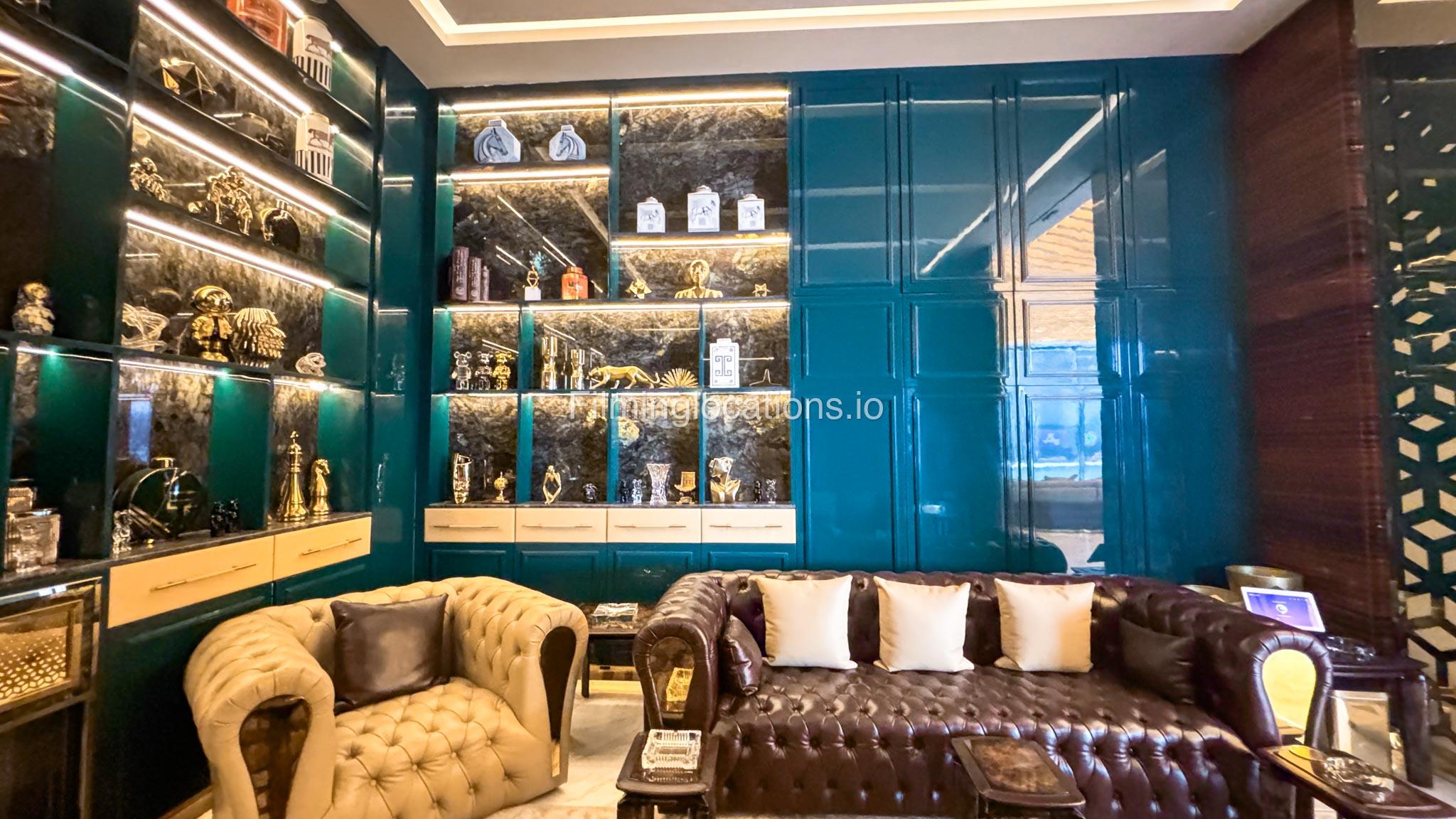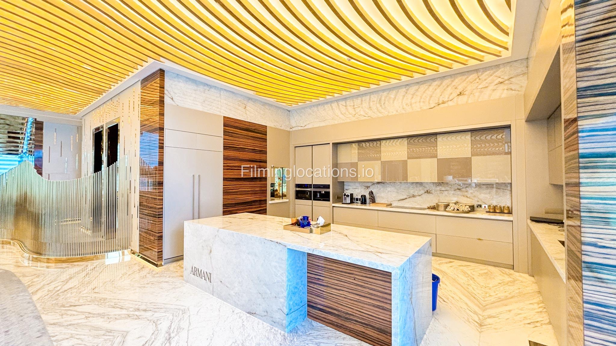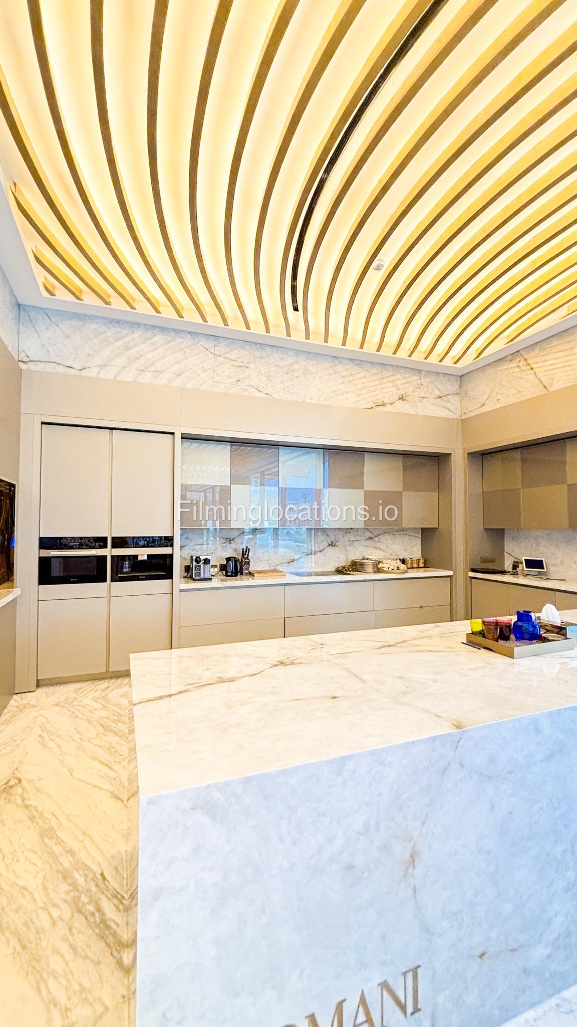 The interior is furnished with the finest pieces from Bentley, Fendi, Baccarat, Hadi, Armani, and Chanel, creating a sophisticated and stylish environment. The ground floor boasts an open kitchen, a bar room with luxurious sofas, and multiple lounge areas, offering a variety of settings for different scenes.