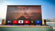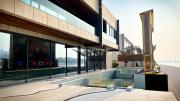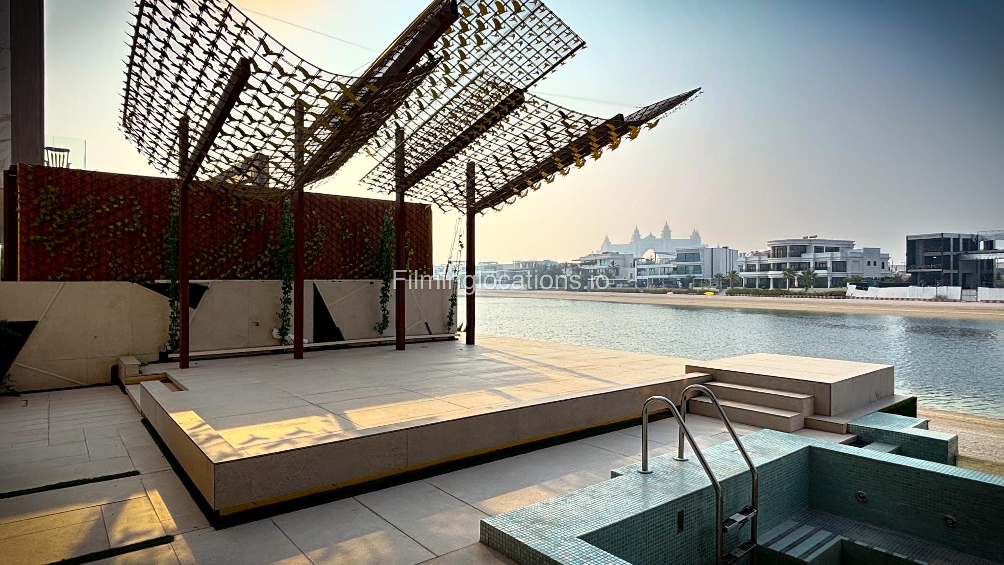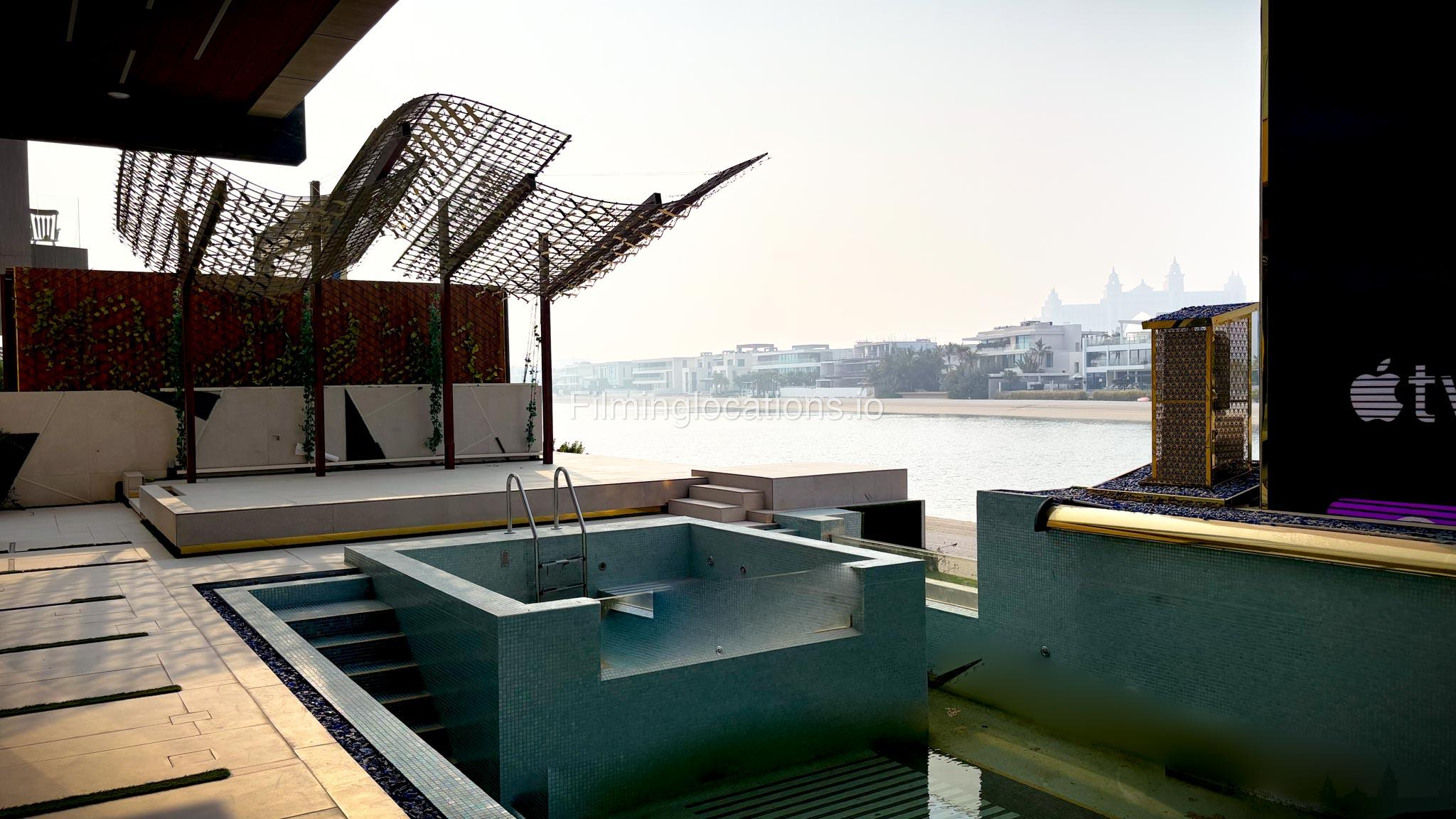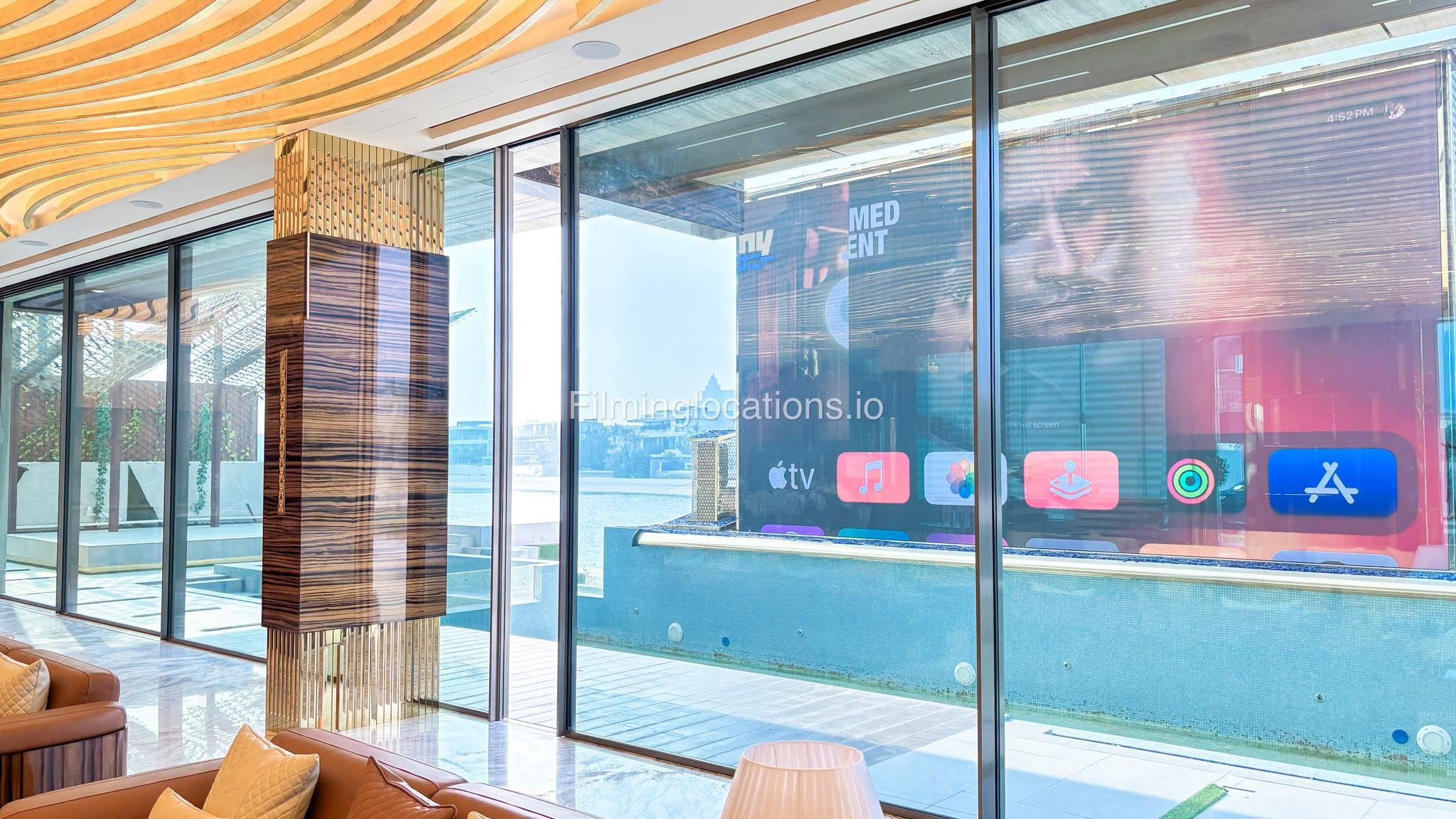 The villa features a stunning outdoors where you'll find Dubai's largest screen, positioned right by the expansive swimming pool, making it an ideal setting for both daytime and nighttime scenes.