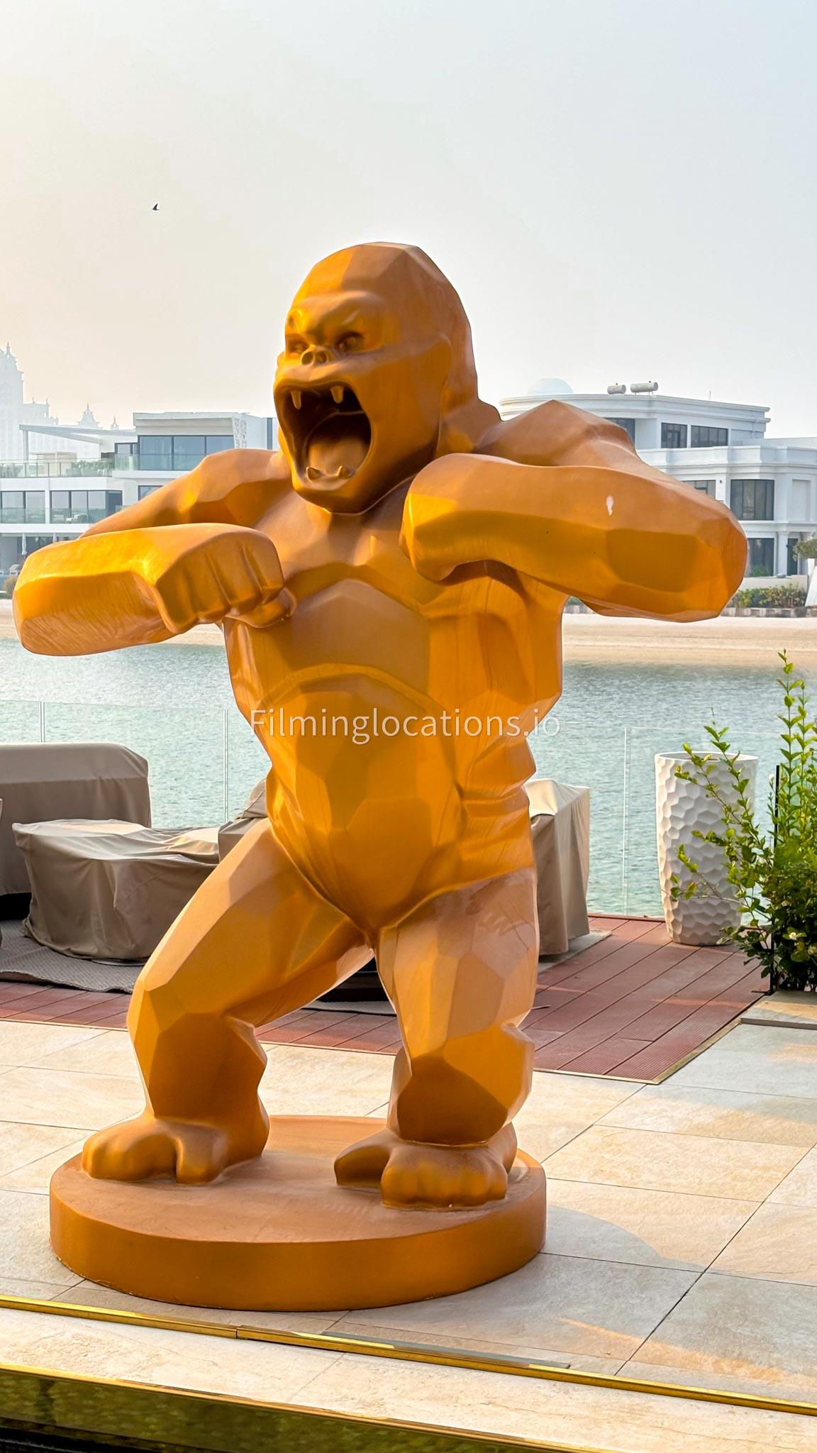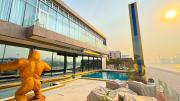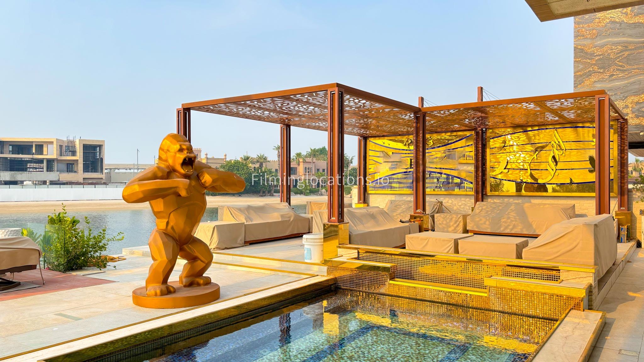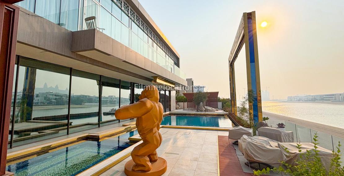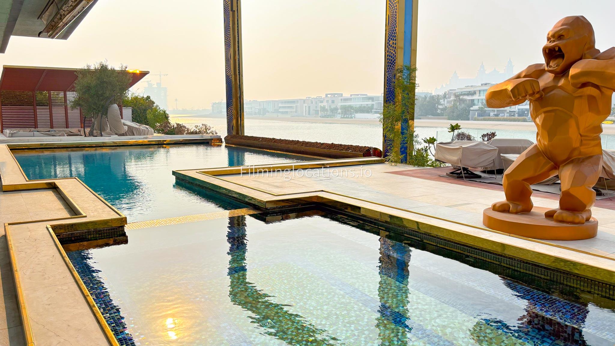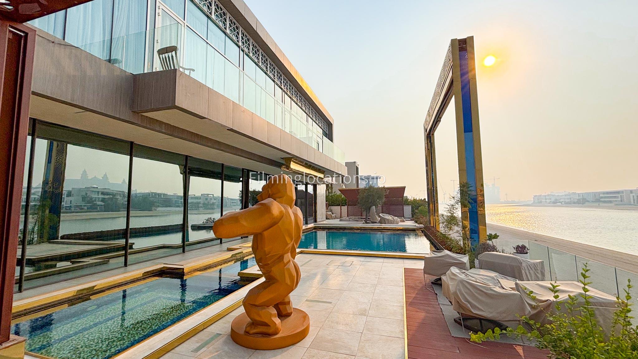 The outdoor space is equally impressive, featuring a swimming pool accented by a striking statue, perfect for exterior shots.