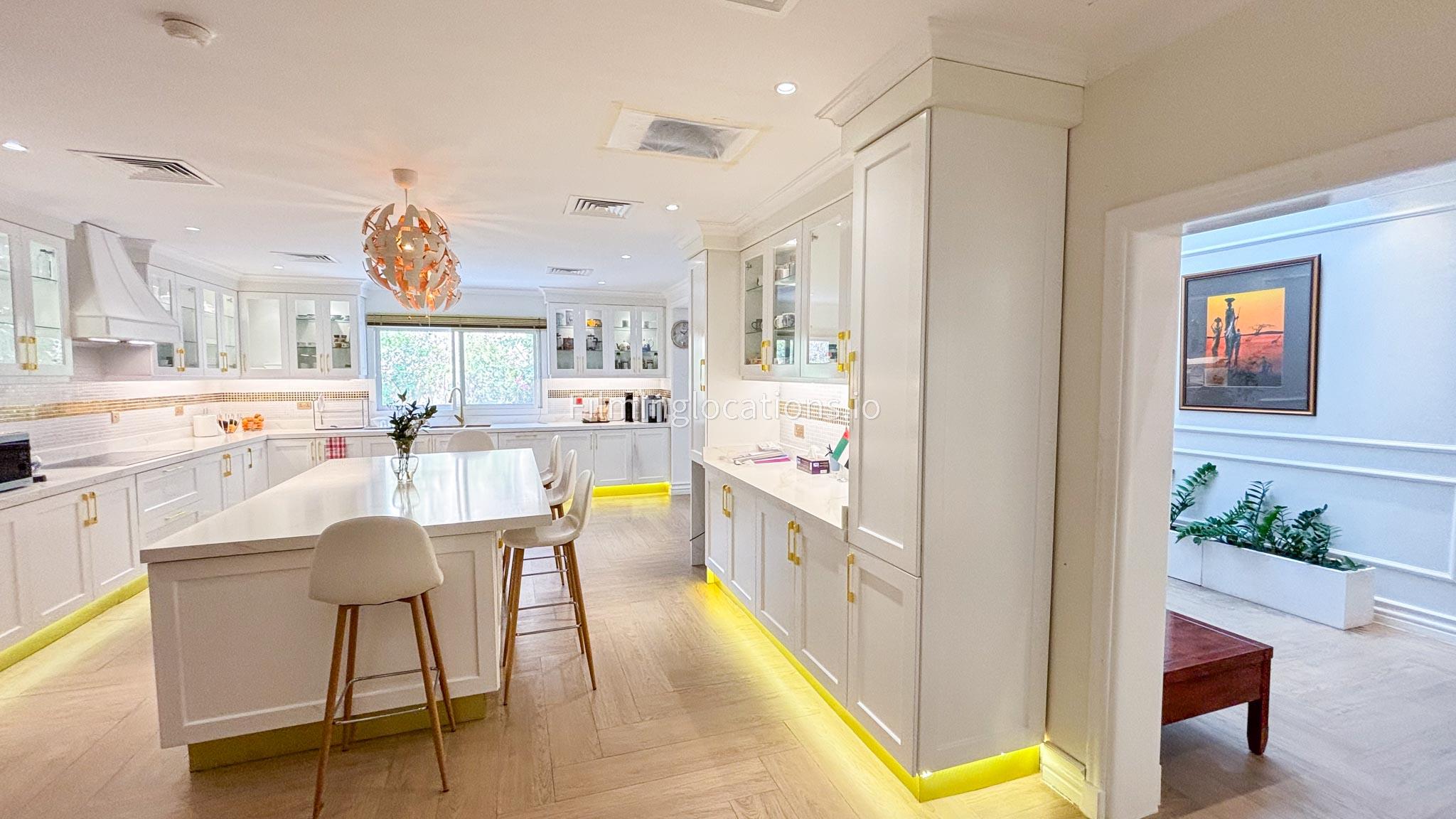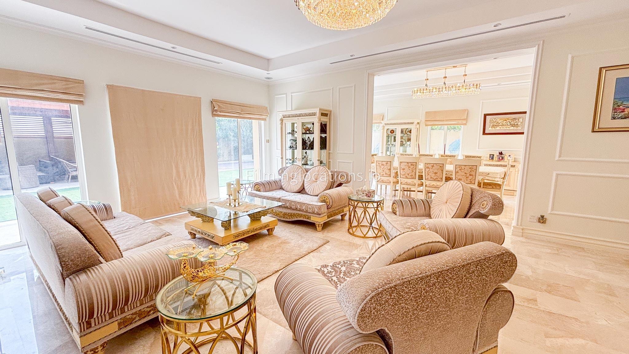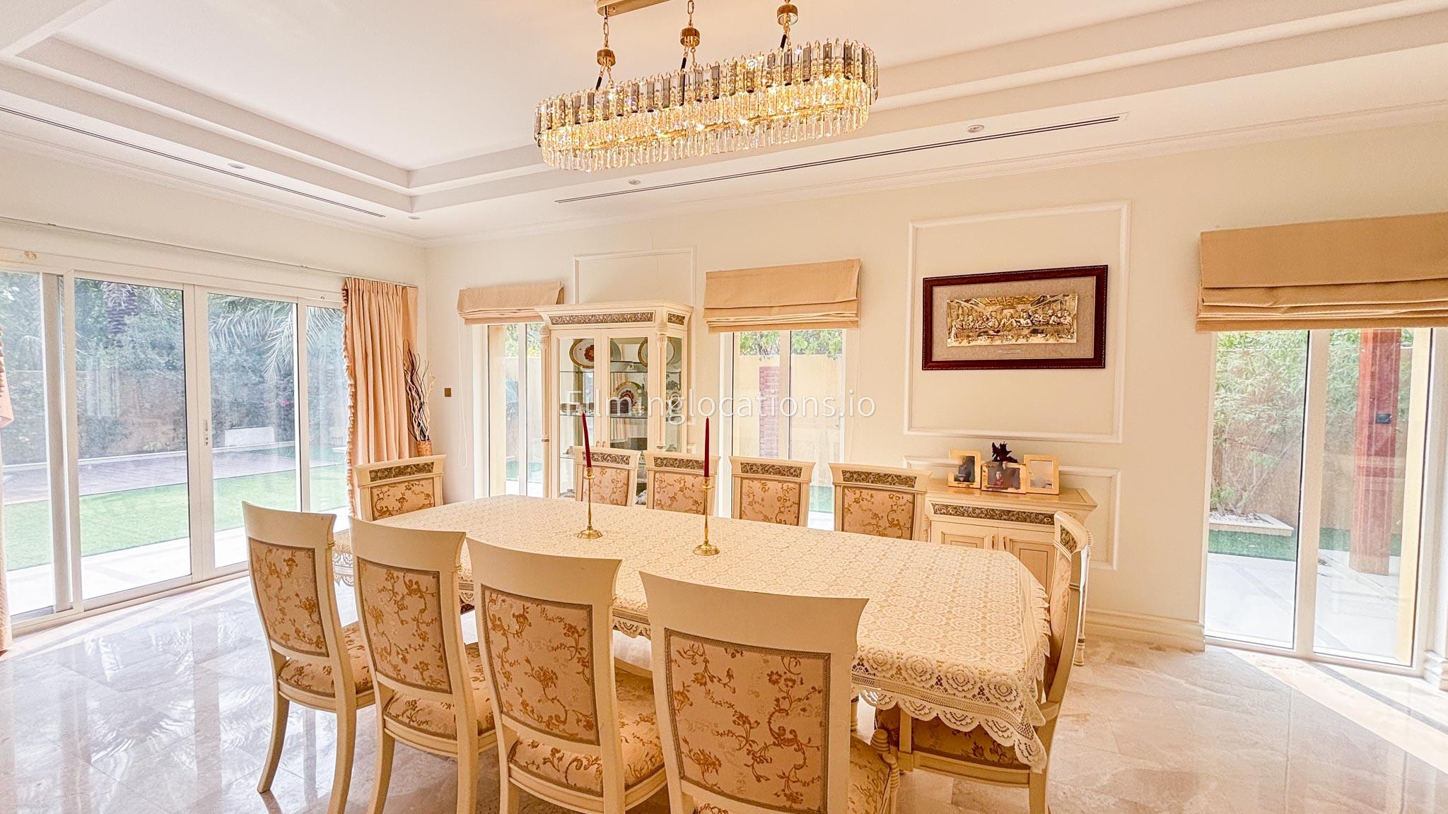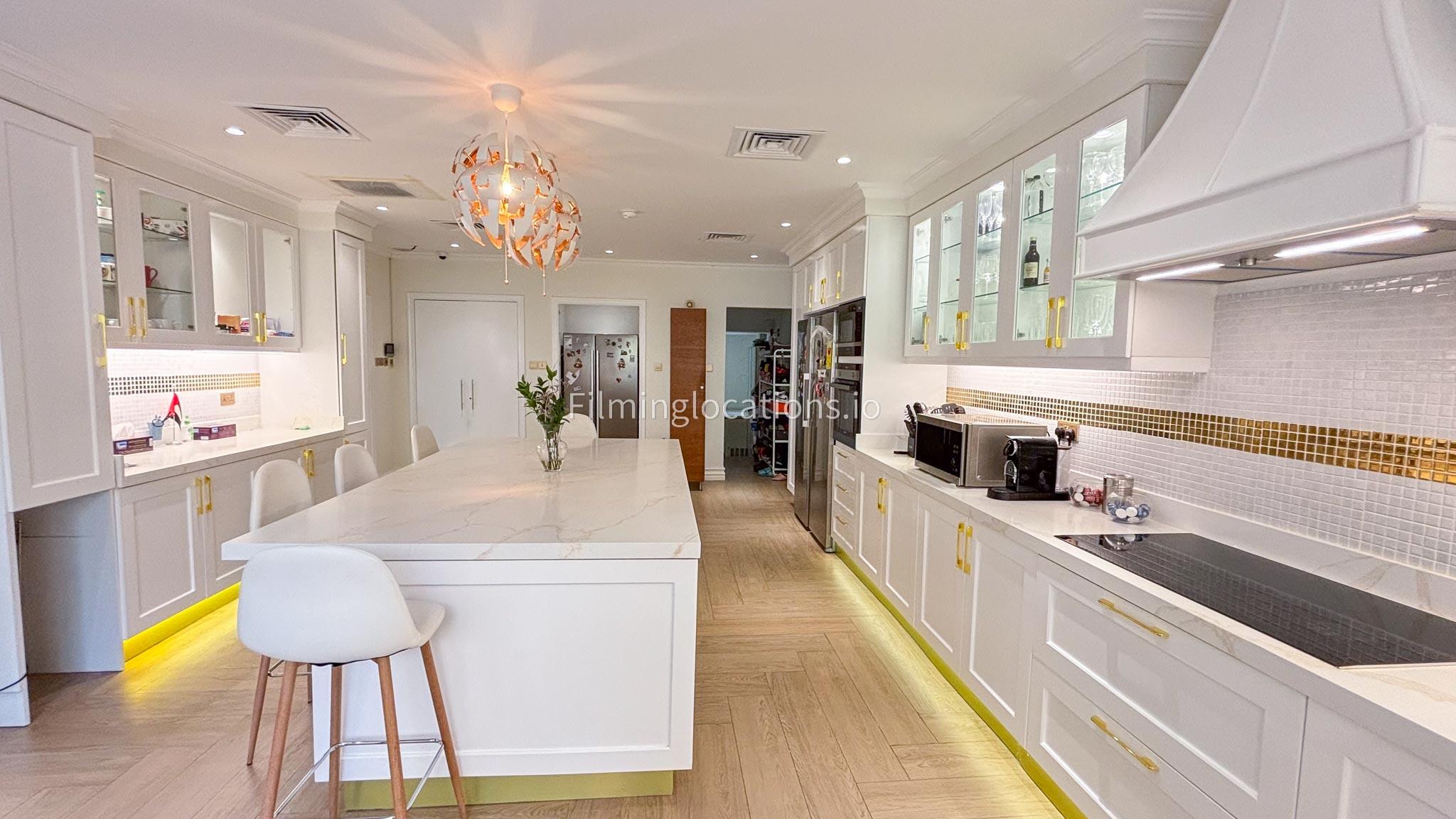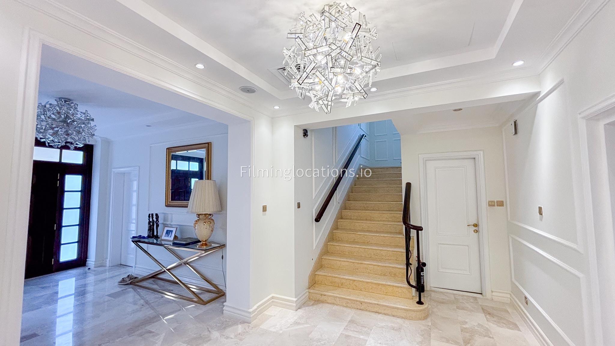 Our elegant three-story luxury villa is perfect for film shoots needing a sophisticated setting. With 7 spacious bedrooms, 2 lounges, and a stylish dining room featuring beautiful chandeliers, the villa offers plenty of room for various scenes. The open-plan layout includes a large kitchen with a central island, ideal for cooking or social scenes. Outside, the villa boasts a spacious outdoor area with a landscaped garden and a large gazebo, perfect for filming outdoor events or relaxing moments. This villa's luxurious design and versatile spaces make it an excellent choice for any production looking to capture scenes of elegance and comfort. Villa also has a rooftop access.