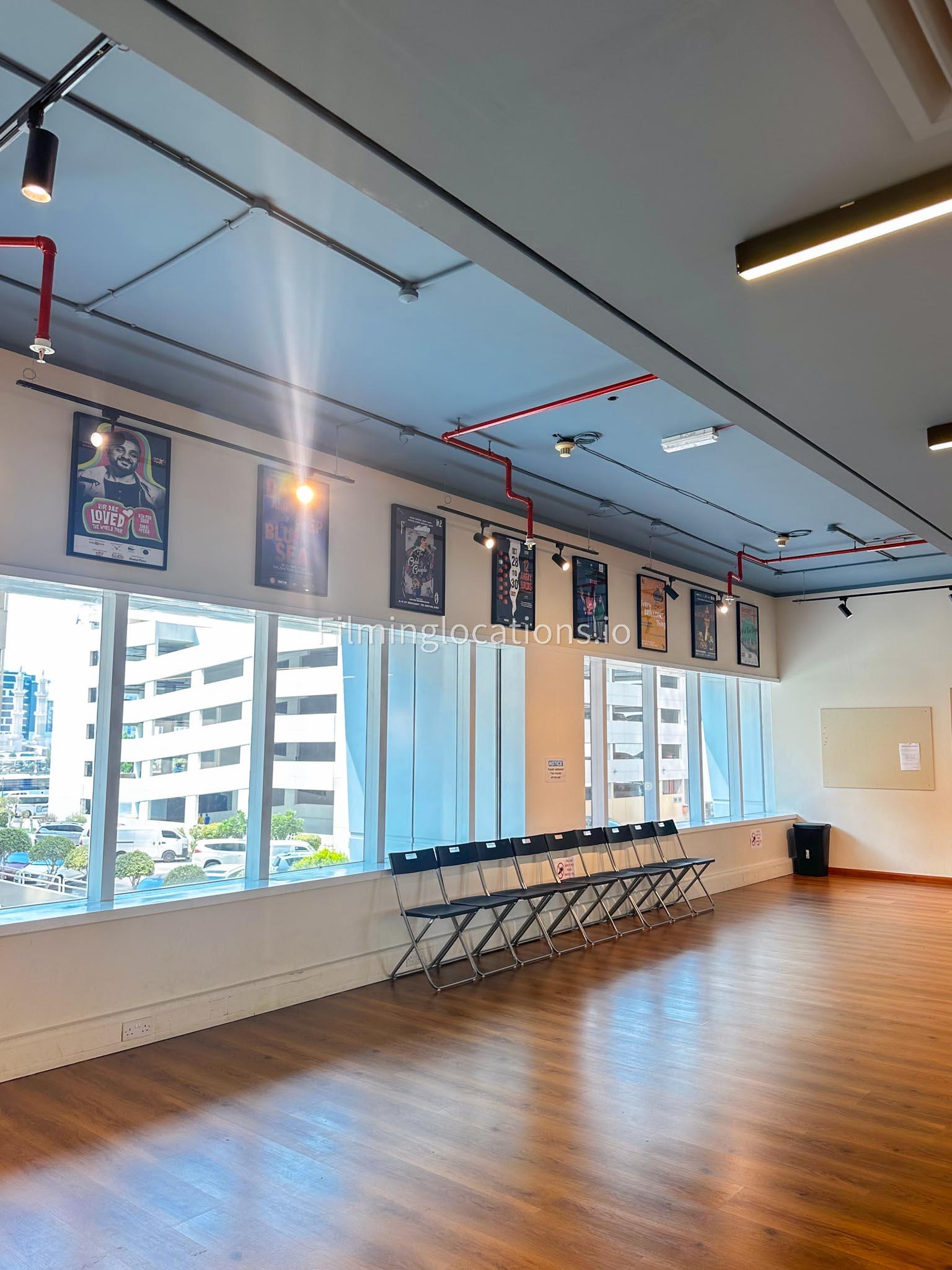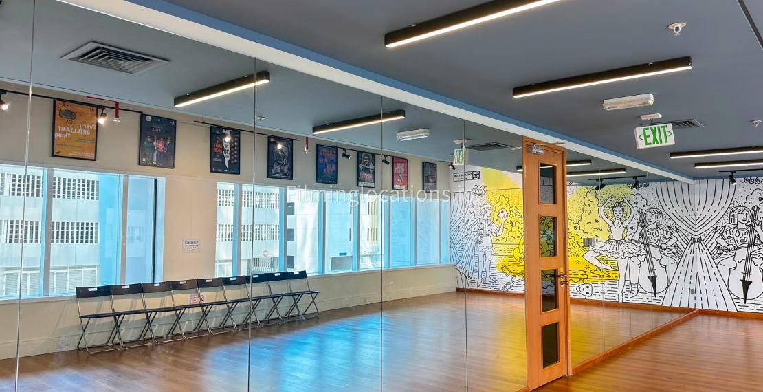 Our modern dance studio is perfect for filming. It features a spacious wooden floor, ideal for capturing dance routines and movement. The studio has a vibrant mural on one wall, adding a pop of color and a unique backdrop for scenes. Full-length mirrors line one side of the room, offering creative angles for filming. Large windows let in plenty of natural light, and there's additional overhead lighting to brighten the space. The studio also has a simple seating area along the windows, useful for setting up equipment or as part of the scene.