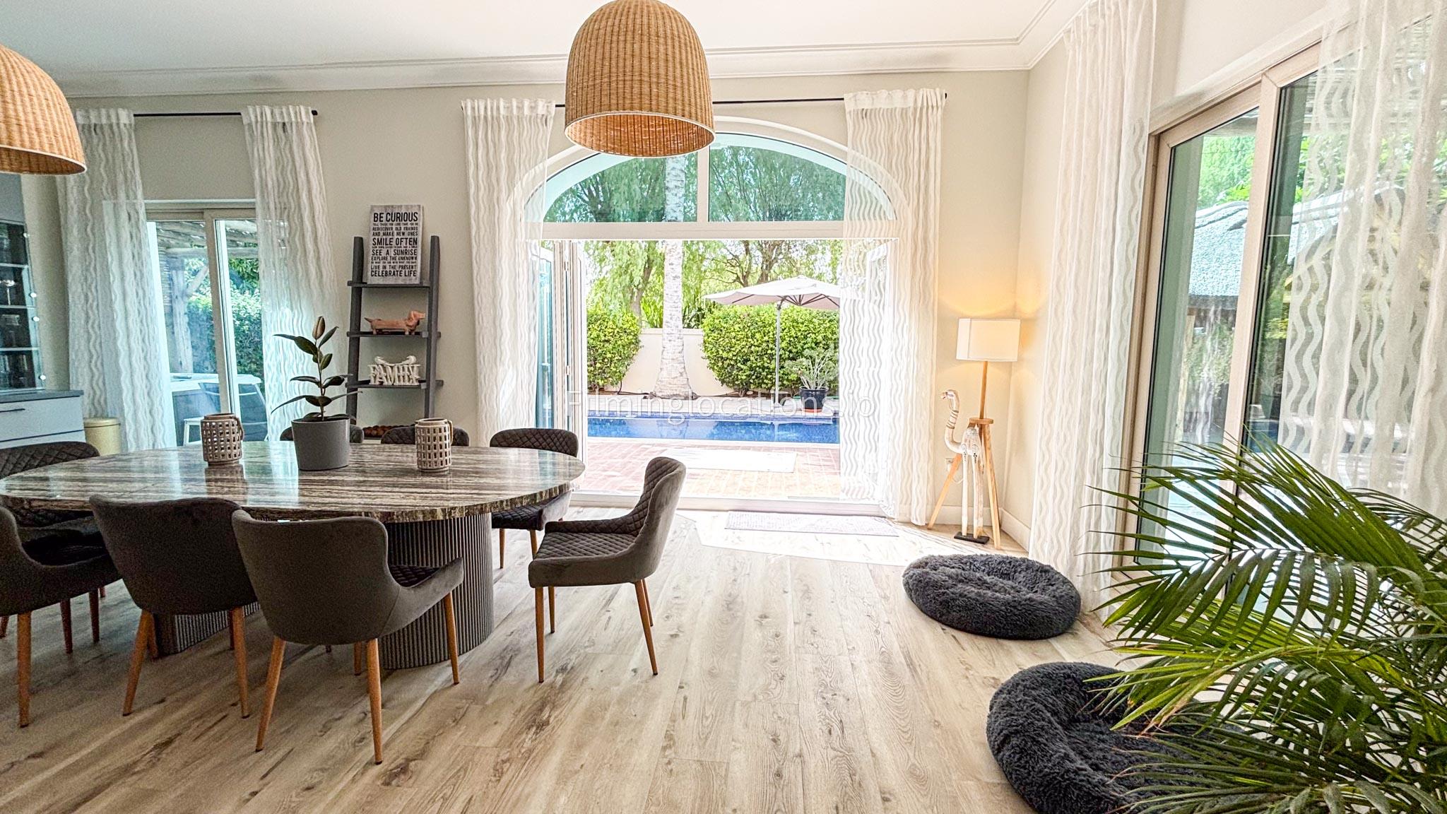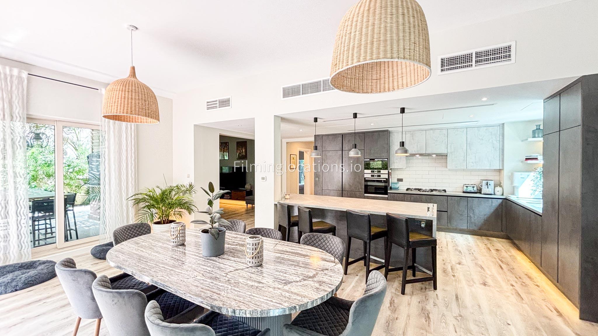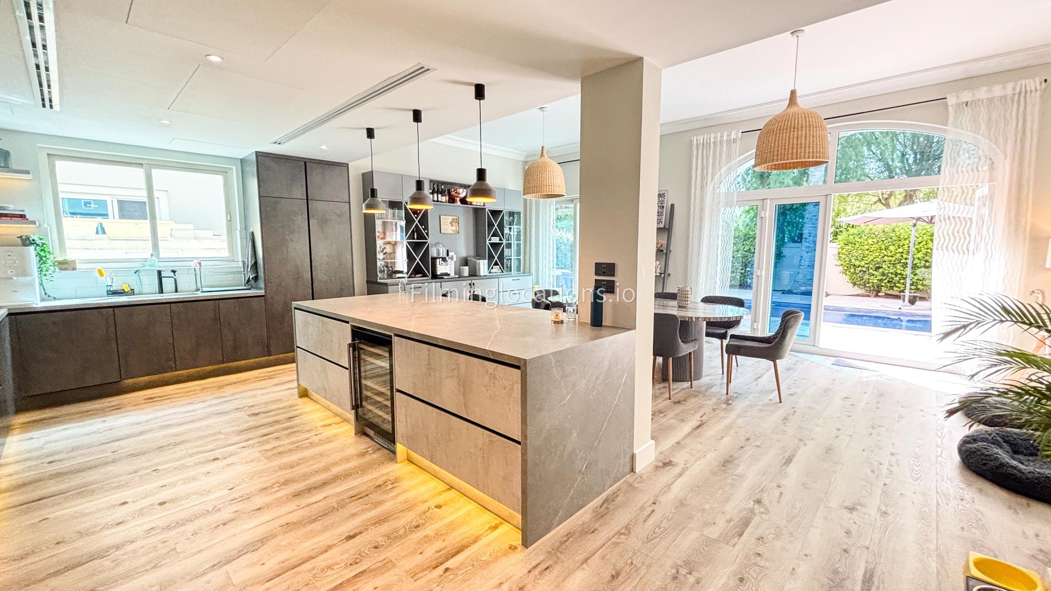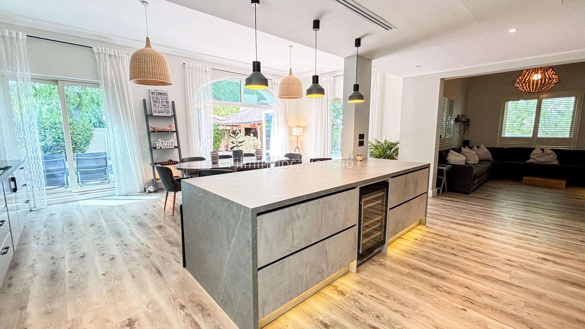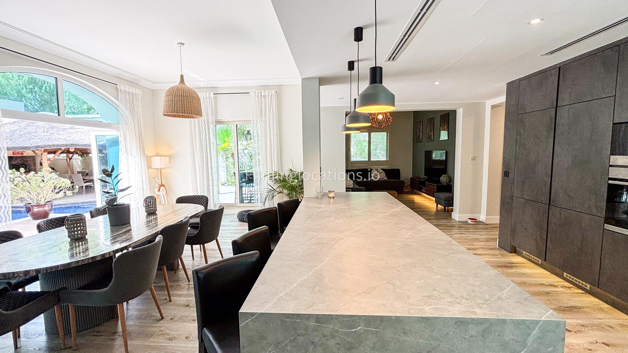 Our modern villa is perfect for film shoots, offering a range of great features. The large living room is bright and stylish, ideal for different types of scenes. The open kitchen, with a big island and connected dining area, is great for filming entertaining or family moments. The villa also includes a bar area inside and an outdoor sports bar with a TV for casual, social settings. Outside, there’s a cozy fireplace and a swimming pool, adding to the luxury. With a bedroom on the ground floor, this villa is a flexible and cinematic location for any project.