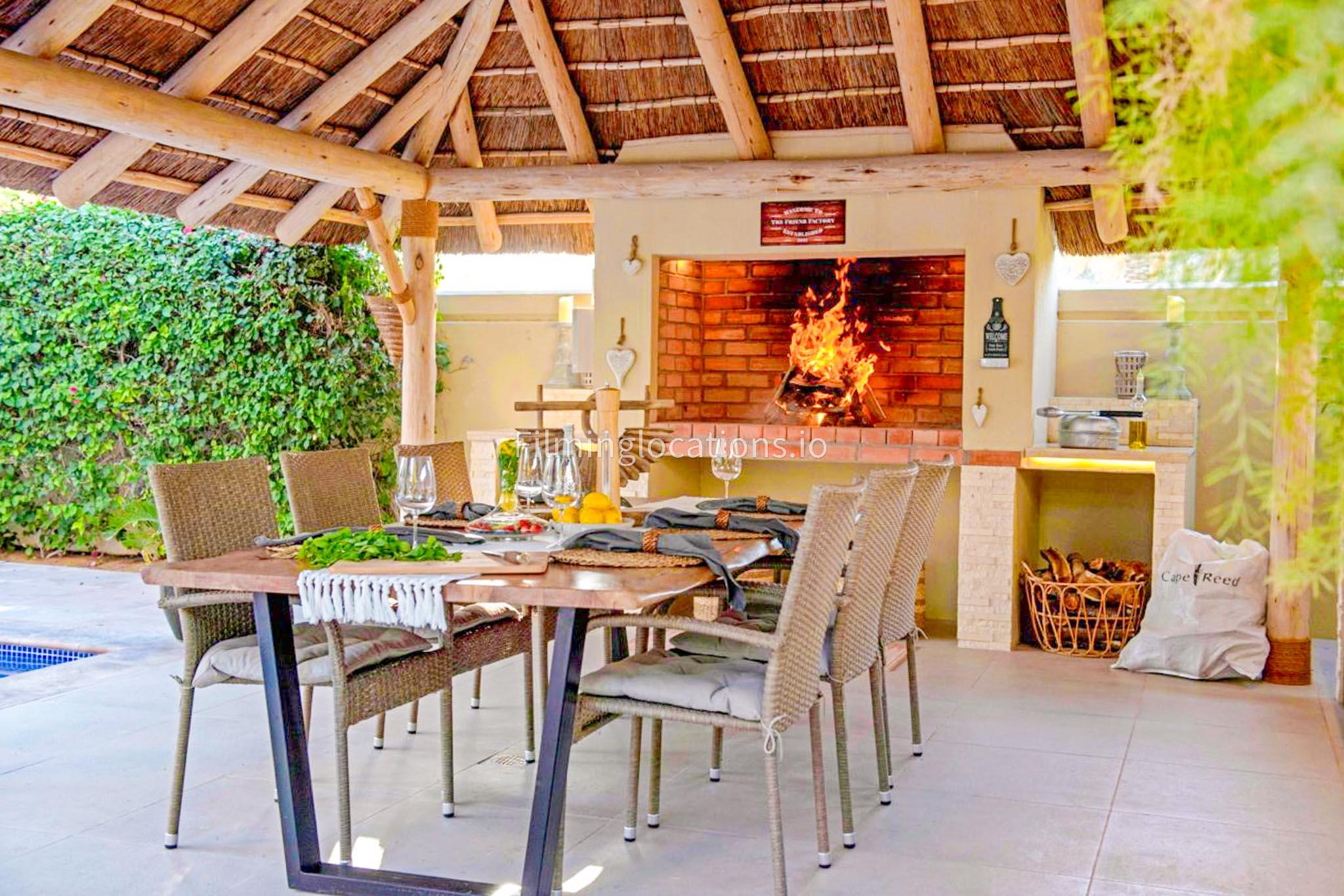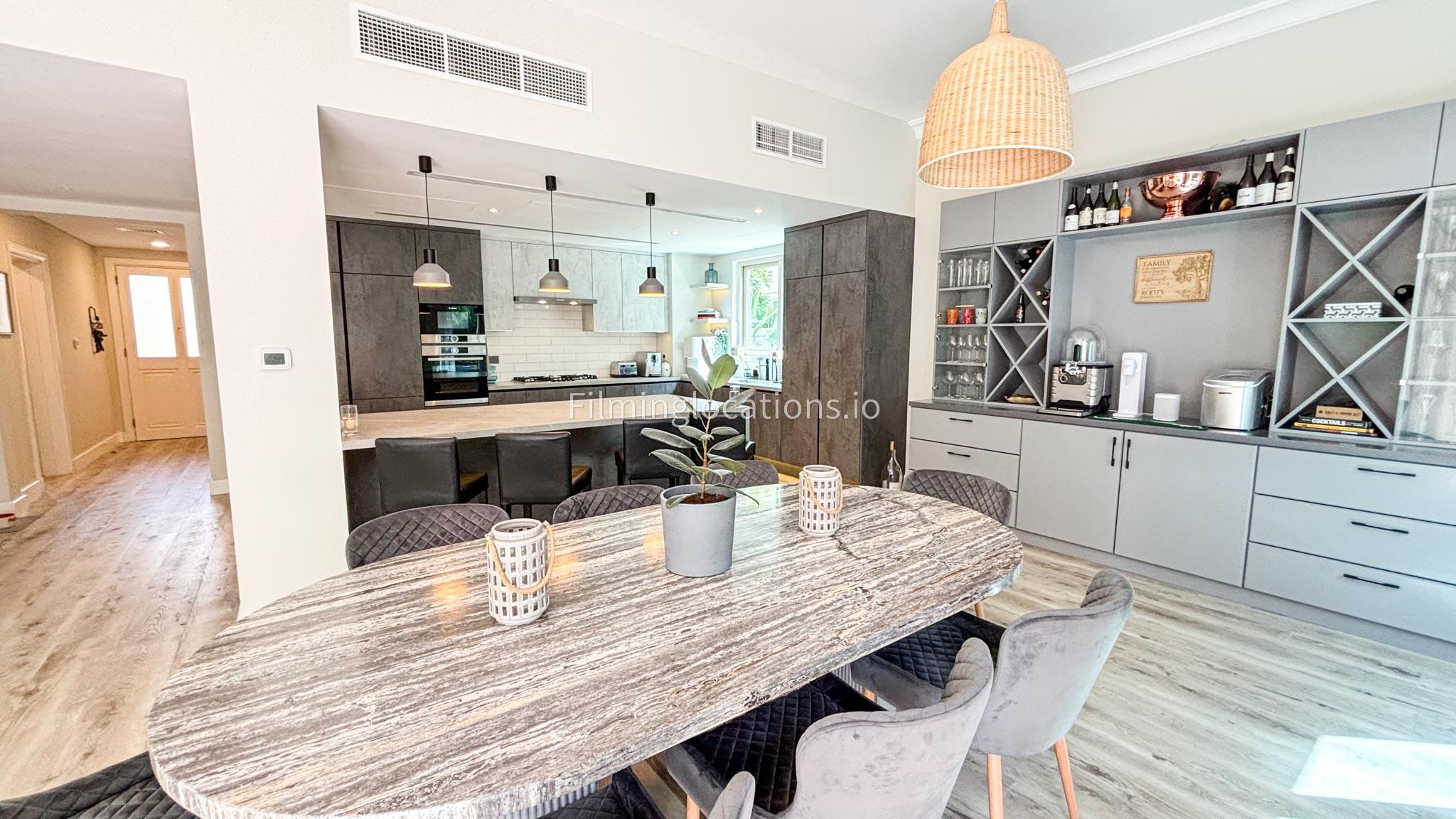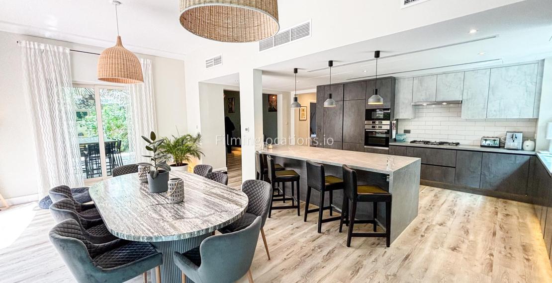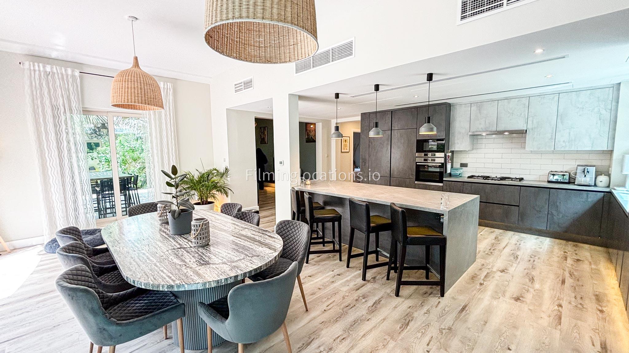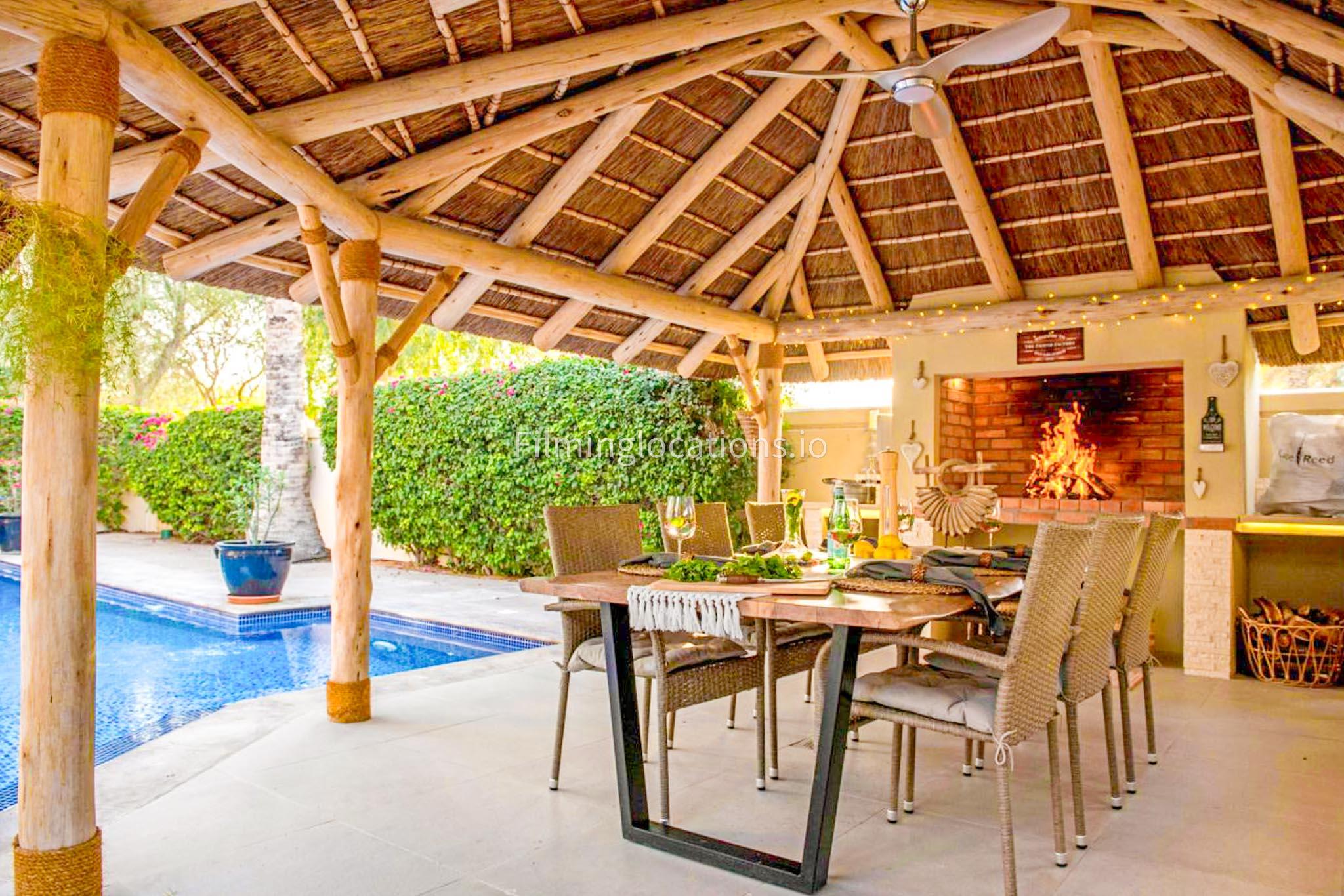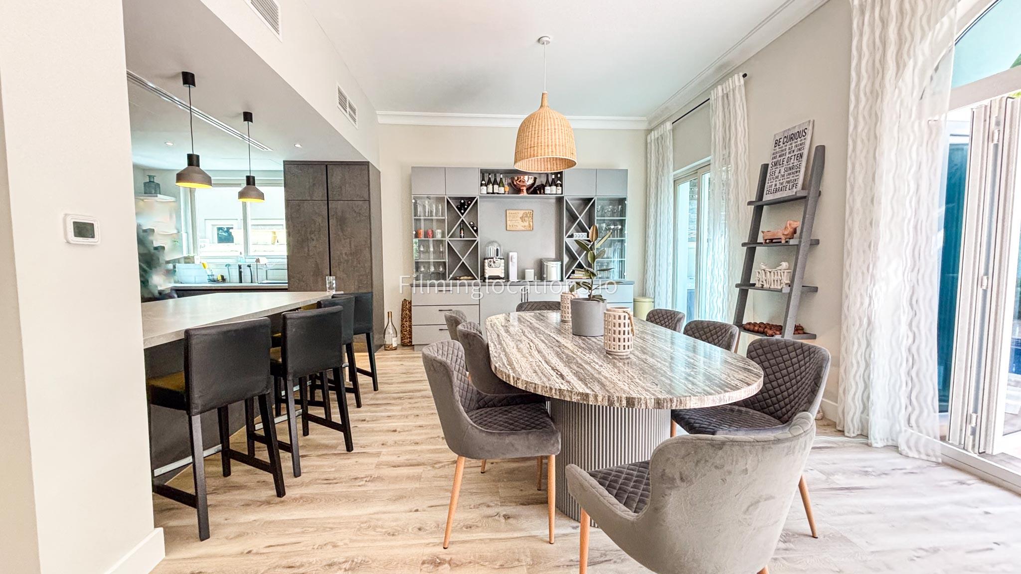 Our modern villa is perfect for film shoots, offering a range of great features. The large living room is bright and stylish, ideal for different types of scenes. The open kitchen, with a big island and connected dining area, is great for filming entertaining or family moments. The villa also includes a bar area inside and an outdoor sports bar with a TV for casual, social settings. Outside, there’s a cozy fireplace and a swimming pool, adding to the luxury. With a bedroom on the ground floor, this villa is a flexible and cinematic location for any project.