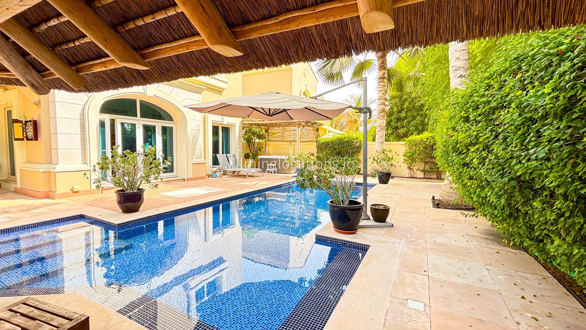 sunsets visible towards swimming pool area. Sun light in the pool between 12pm -2pm.
