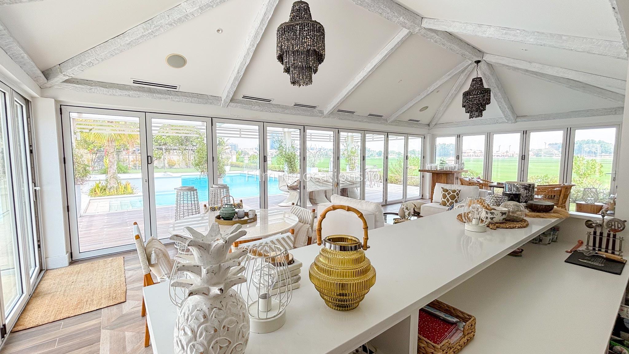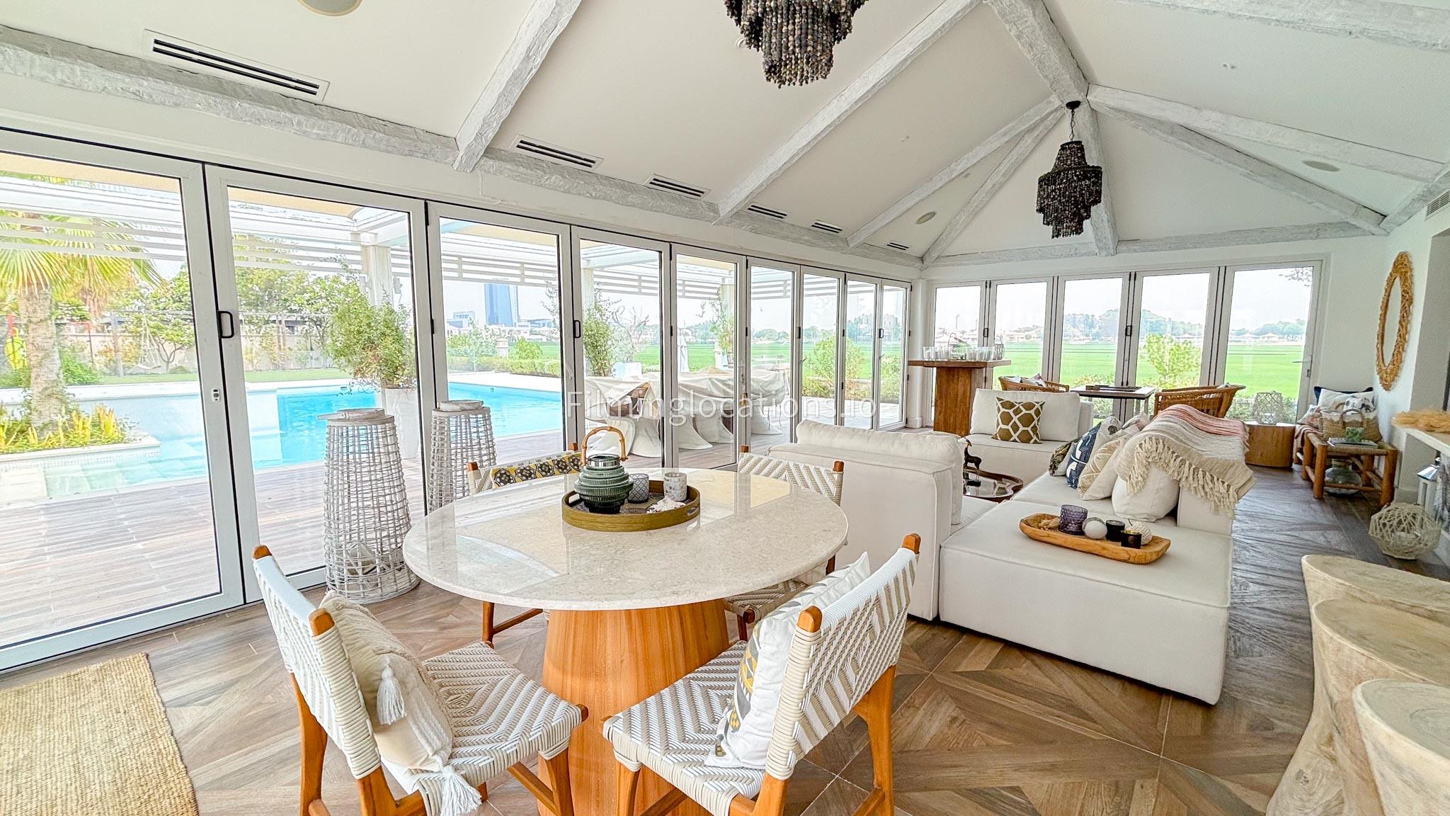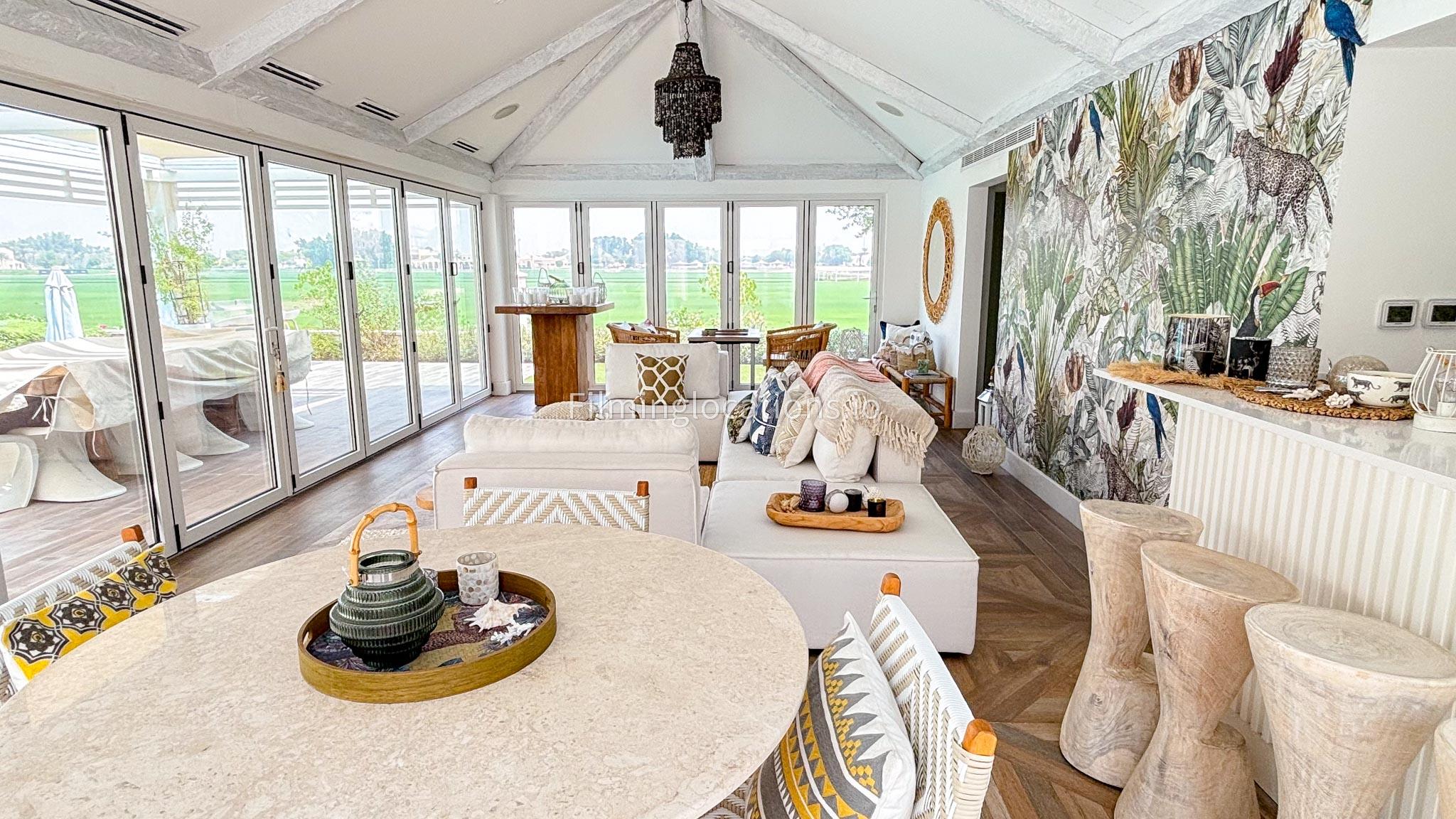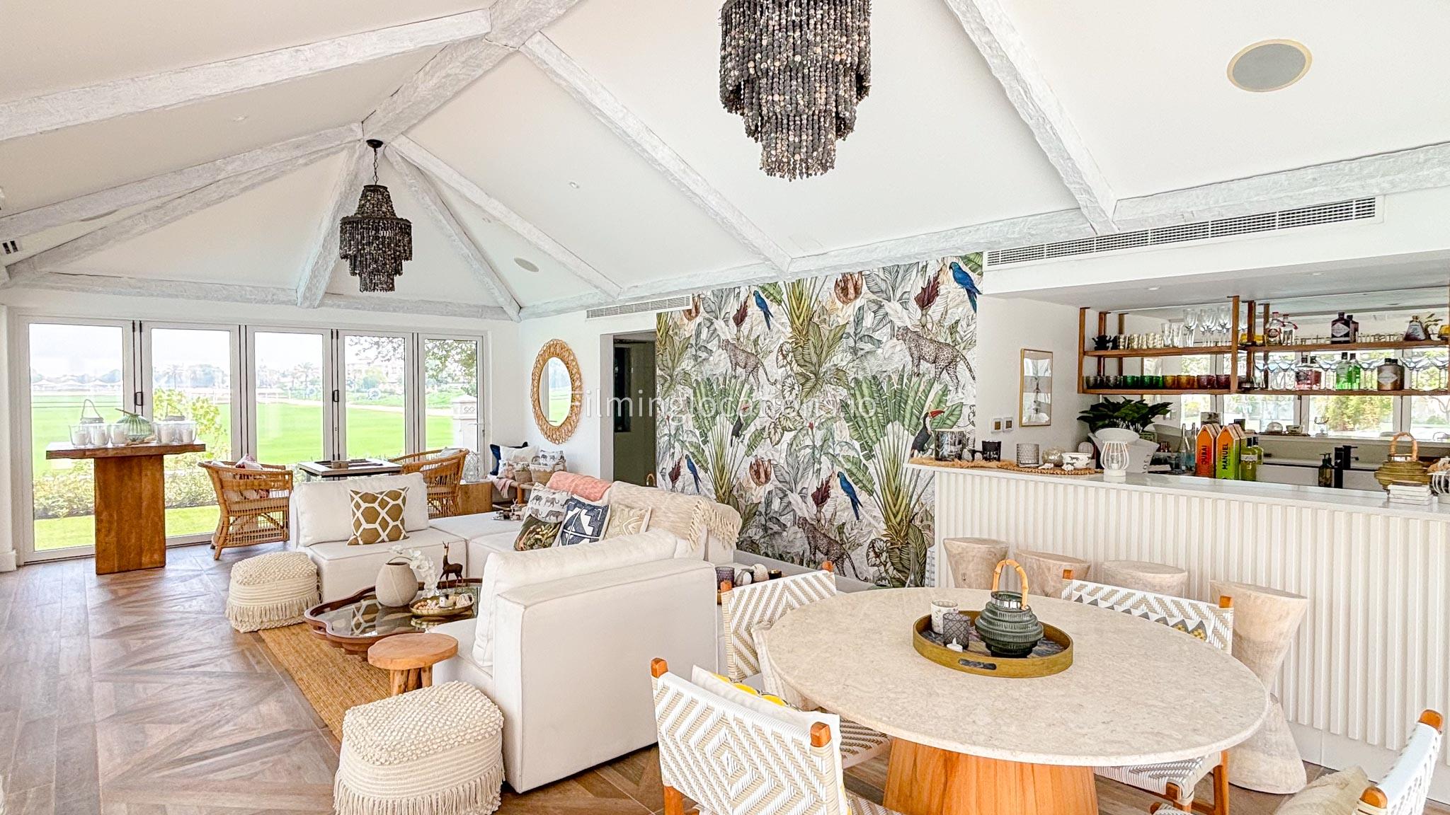Our chic majlis flooding the space with natural light and offering scenic views of the swimming pool and greenery. The nature-inspired mural and eclectic cushions add a vibrant touch to the cozy seating area. A modern bar area with sleek shelving and wooden stools provides a contemporary twist. This versatile setting is perfect for filming serene or upscale scenes with a blend of modern luxury and cultural charm.