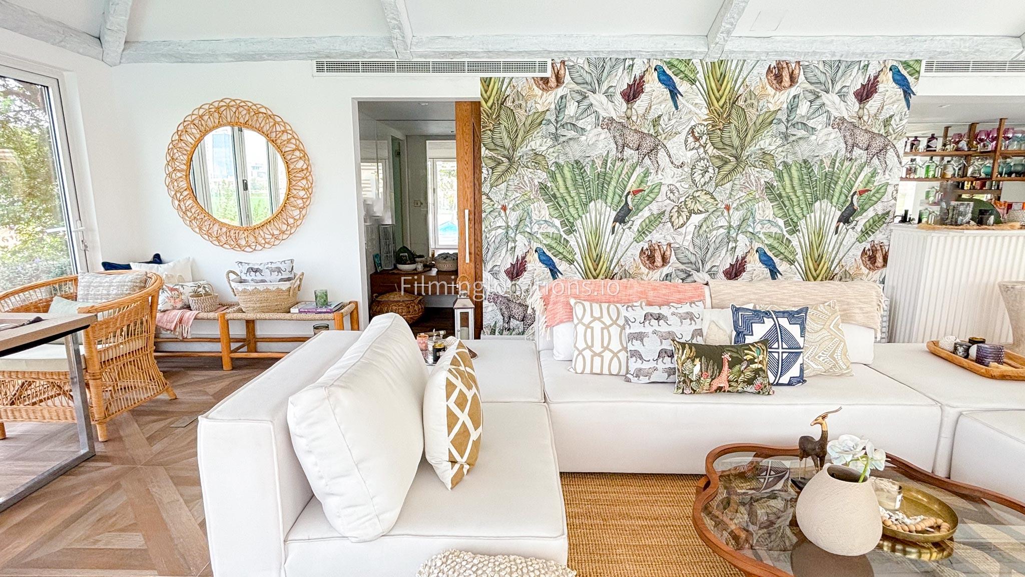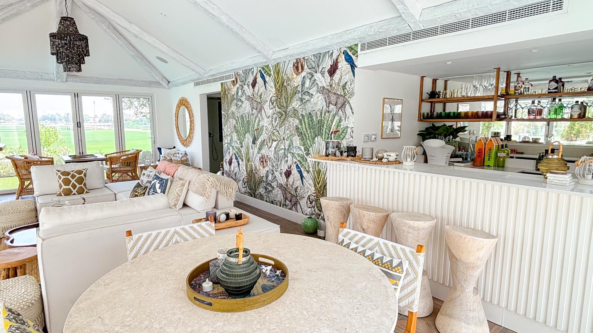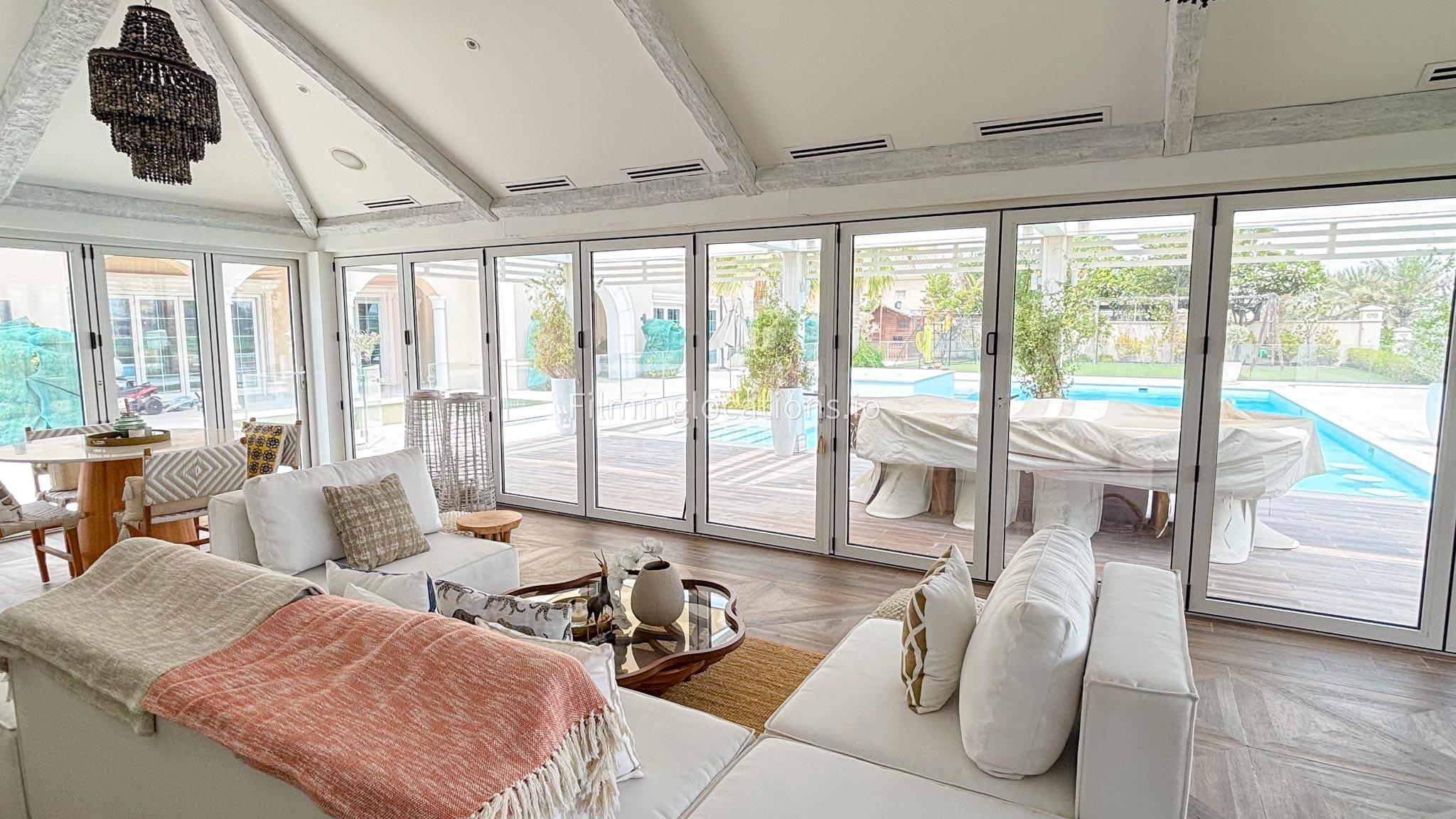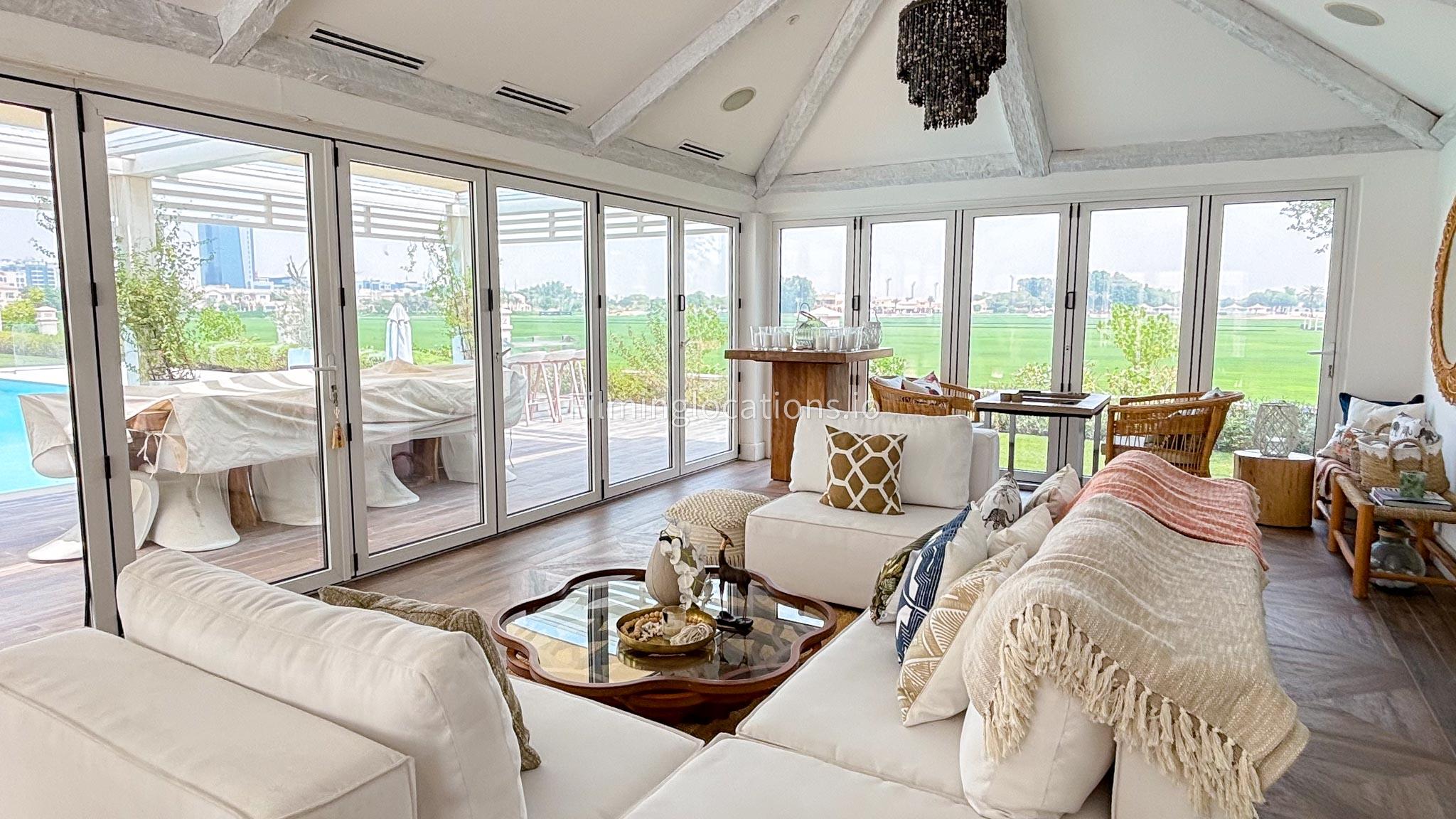 Our chic majlis flooding the space with natural light and offering scenic views of the swimming pool and greenery. The nature-inspired mural and eclectic cushions add a vibrant touch to the cozy seating area. A modern bar area with sleek shelving and wooden stools provides a contemporary twist. This versatile setting is perfect for filming serene or upscale scenes with a blend of modern luxury and cultural charm.