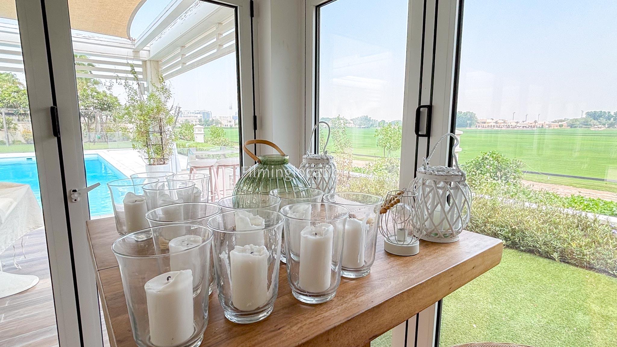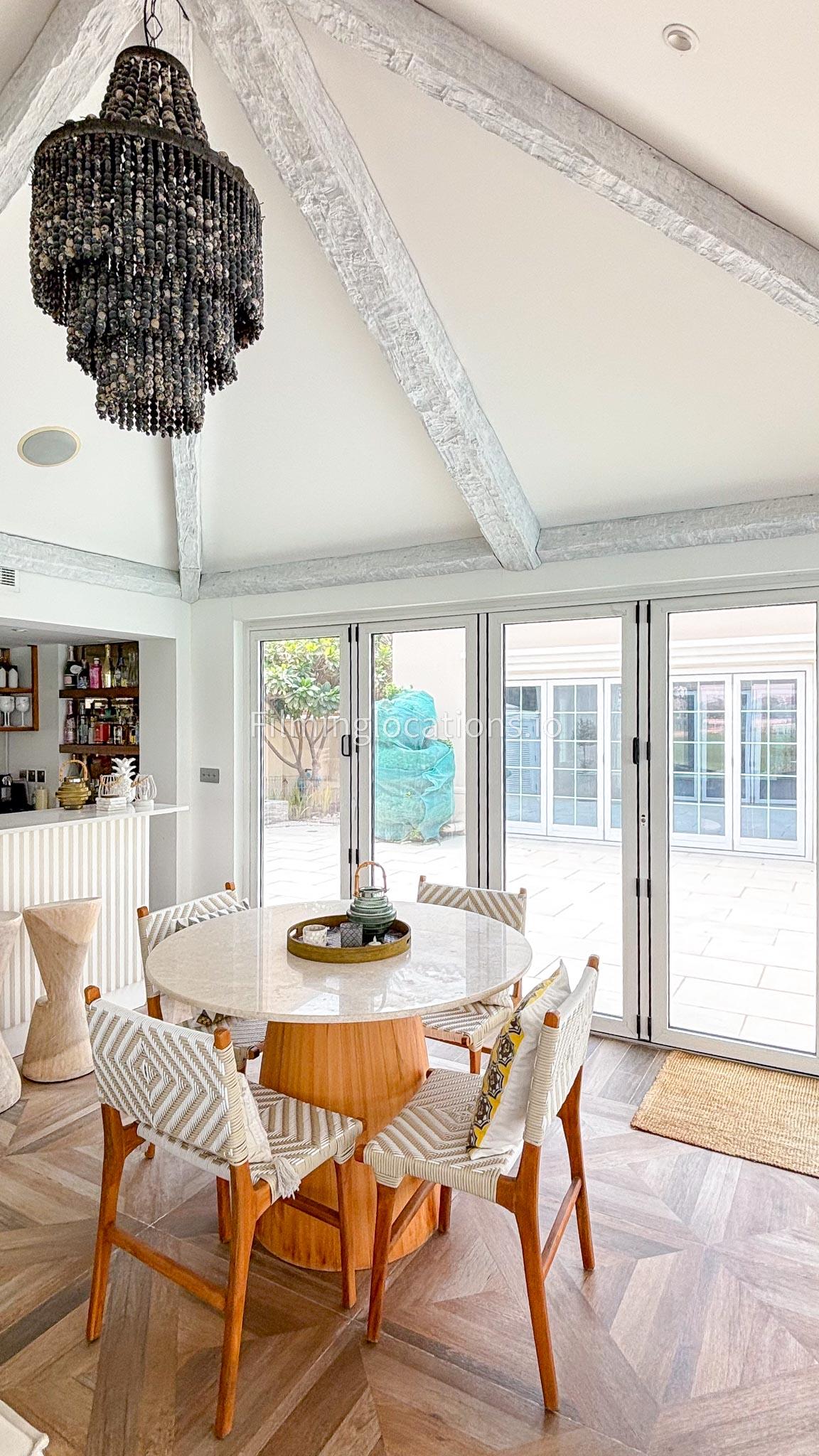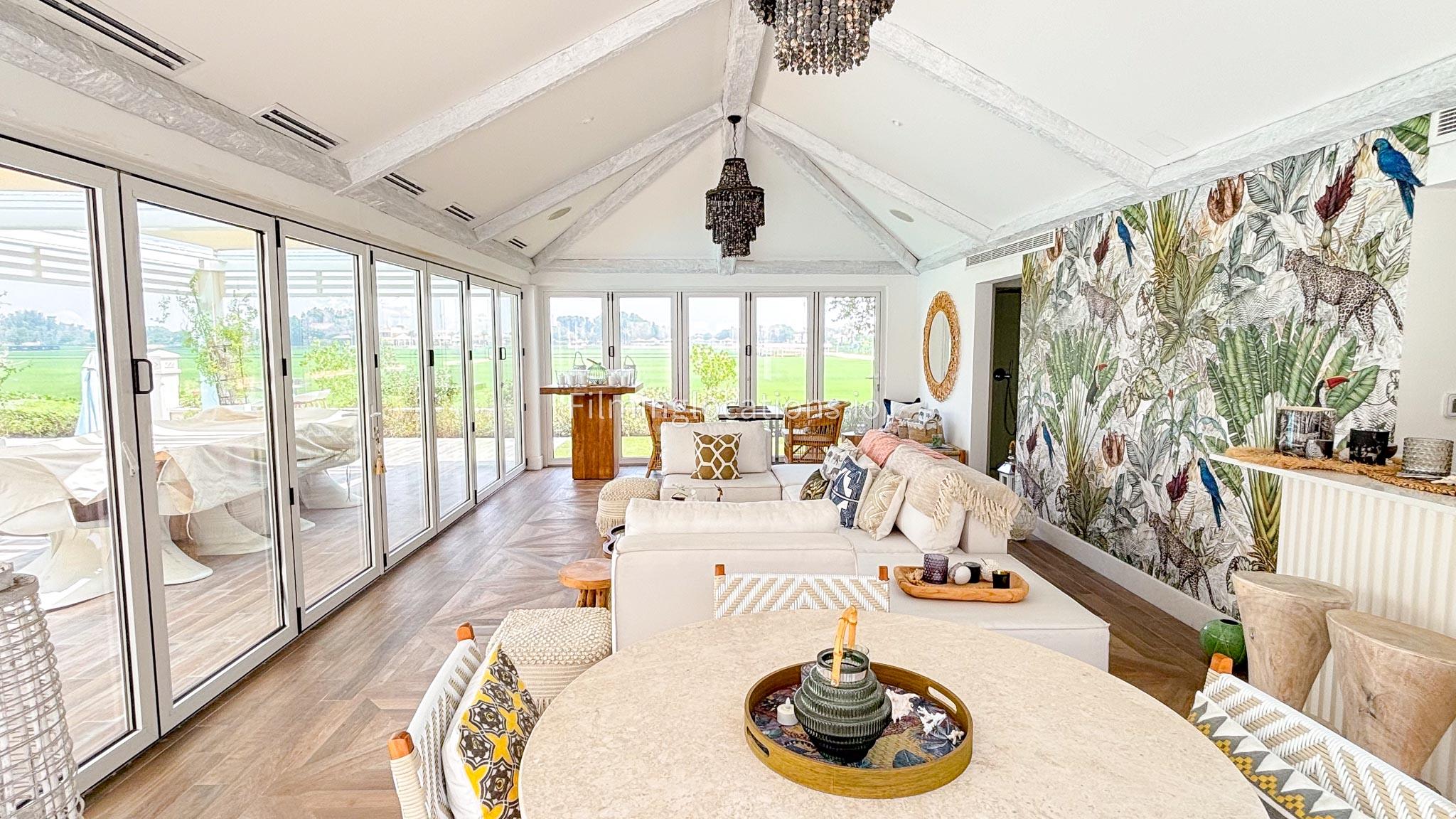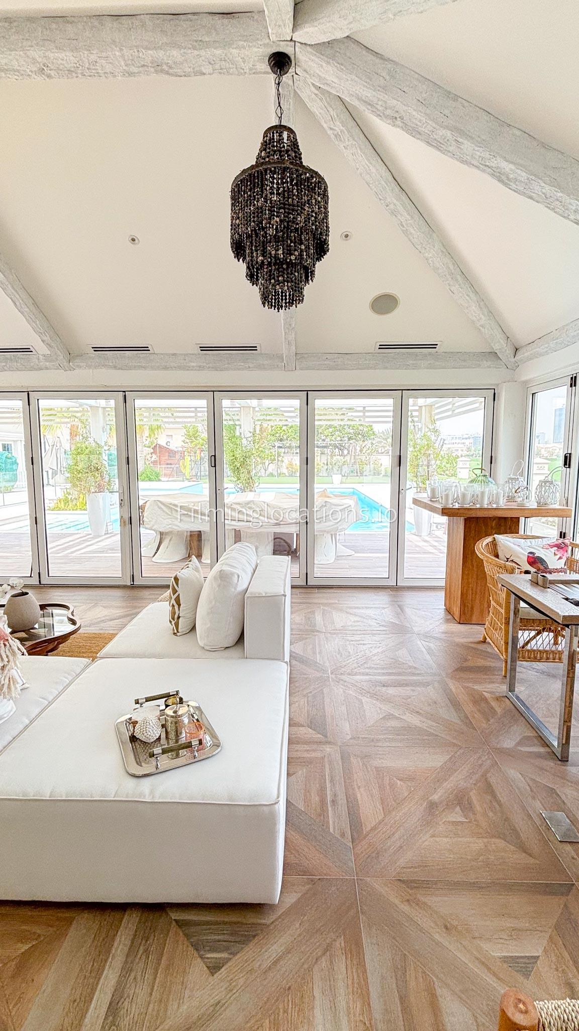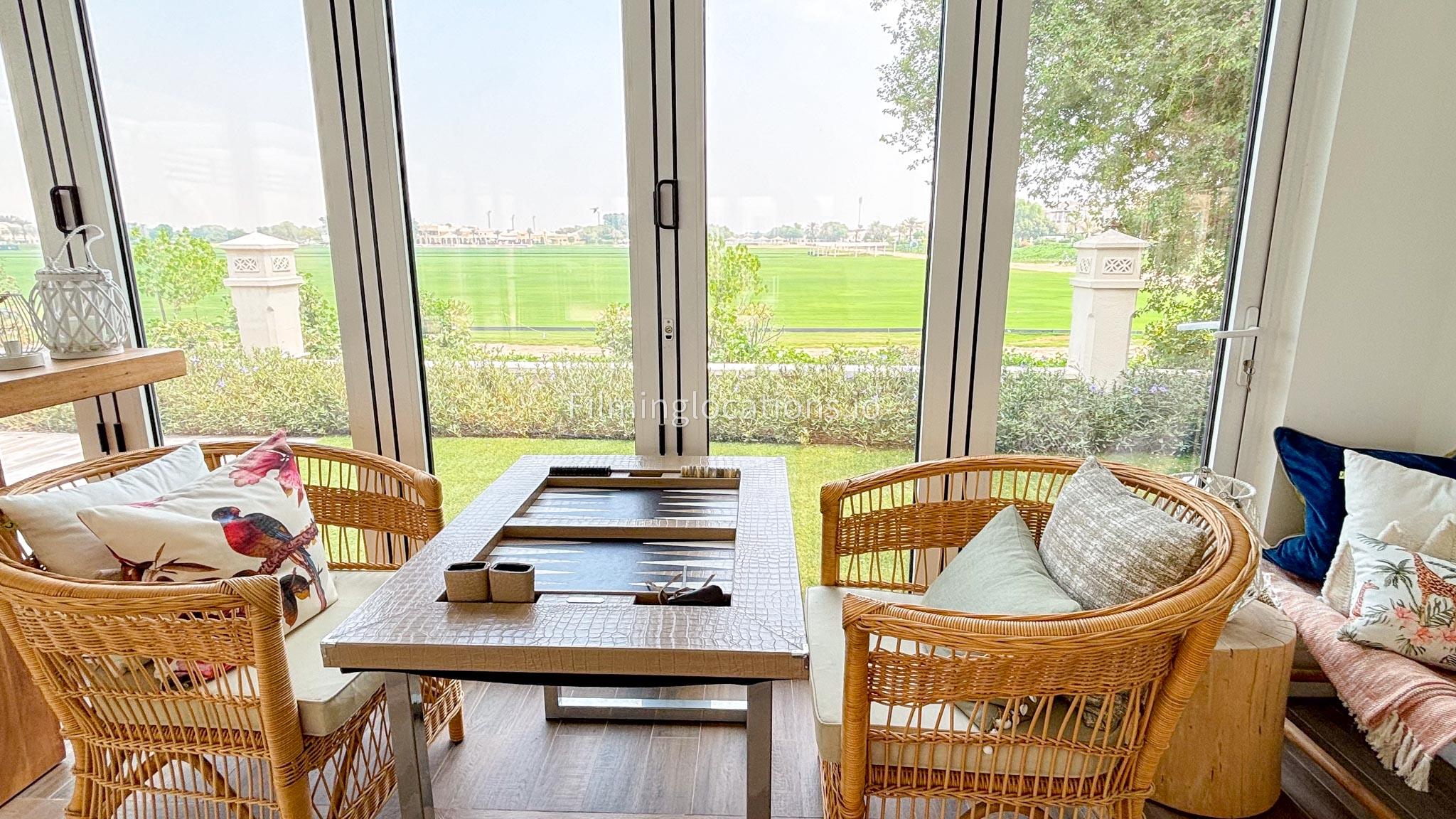 Our chic majlis flooding the space with natural light and offering scenic views of the swimming pool and greenery. The nature-inspired mural and eclectic cushions add a vibrant touch to the cozy seating area. A modern bar area with sleek shelving and wooden stools provides a contemporary twist. This versatile setting is perfect for filming serene or upscale scenes with a blend of modern luxury and cultural charm.