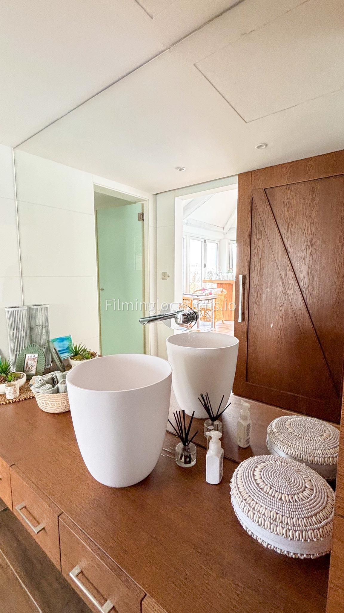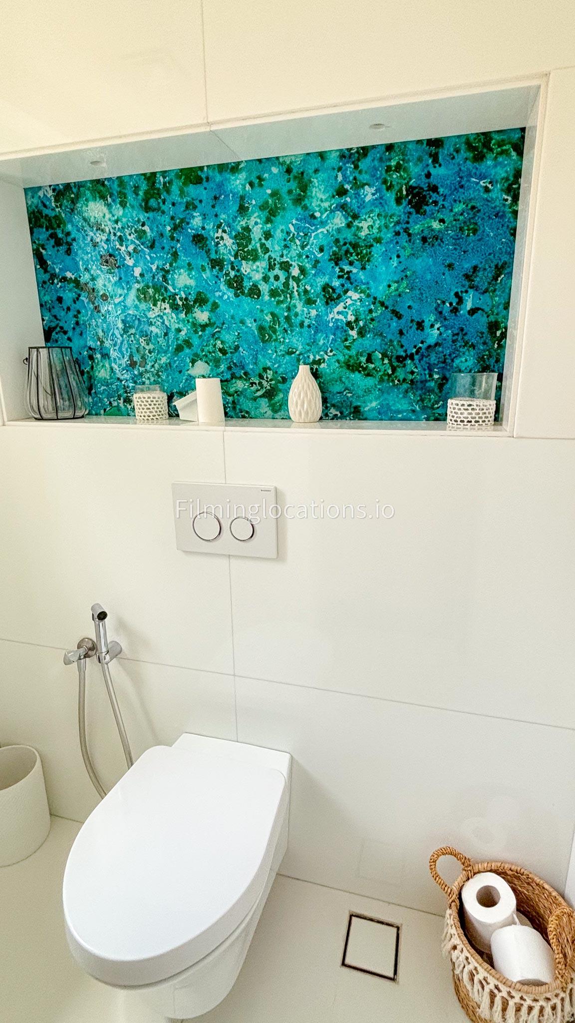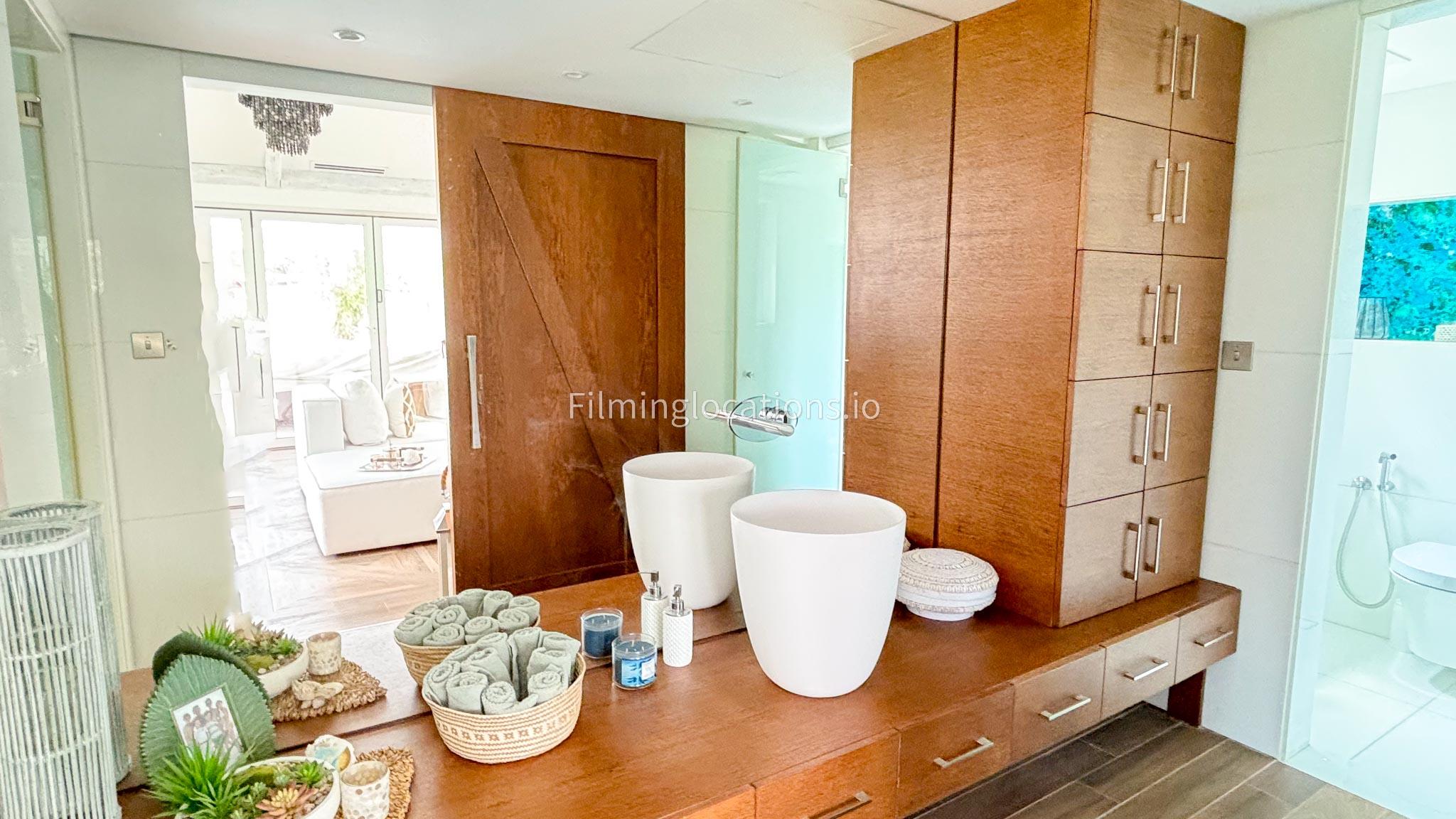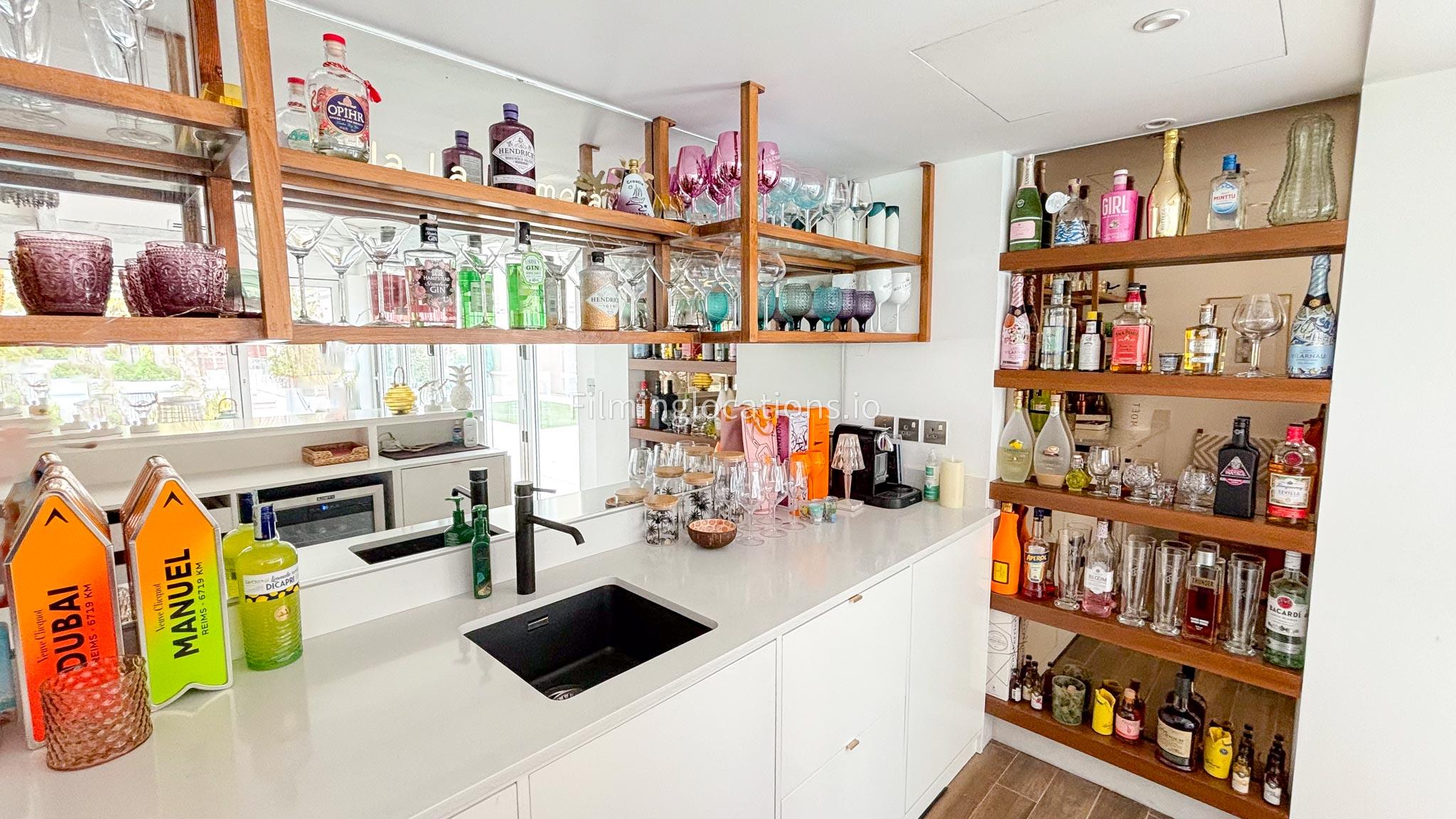 Our chic majlis flooding the space with natural light and offering scenic views of the swimming pool and greenery. The nature-inspired mural and eclectic cushions add a vibrant touch to the cozy seating area. A modern bar area with sleek shelving and wooden stools provides a contemporary twist. This versatile setting is perfect for filming serene or upscale scenes with a blend of modern luxury and cultural charm.