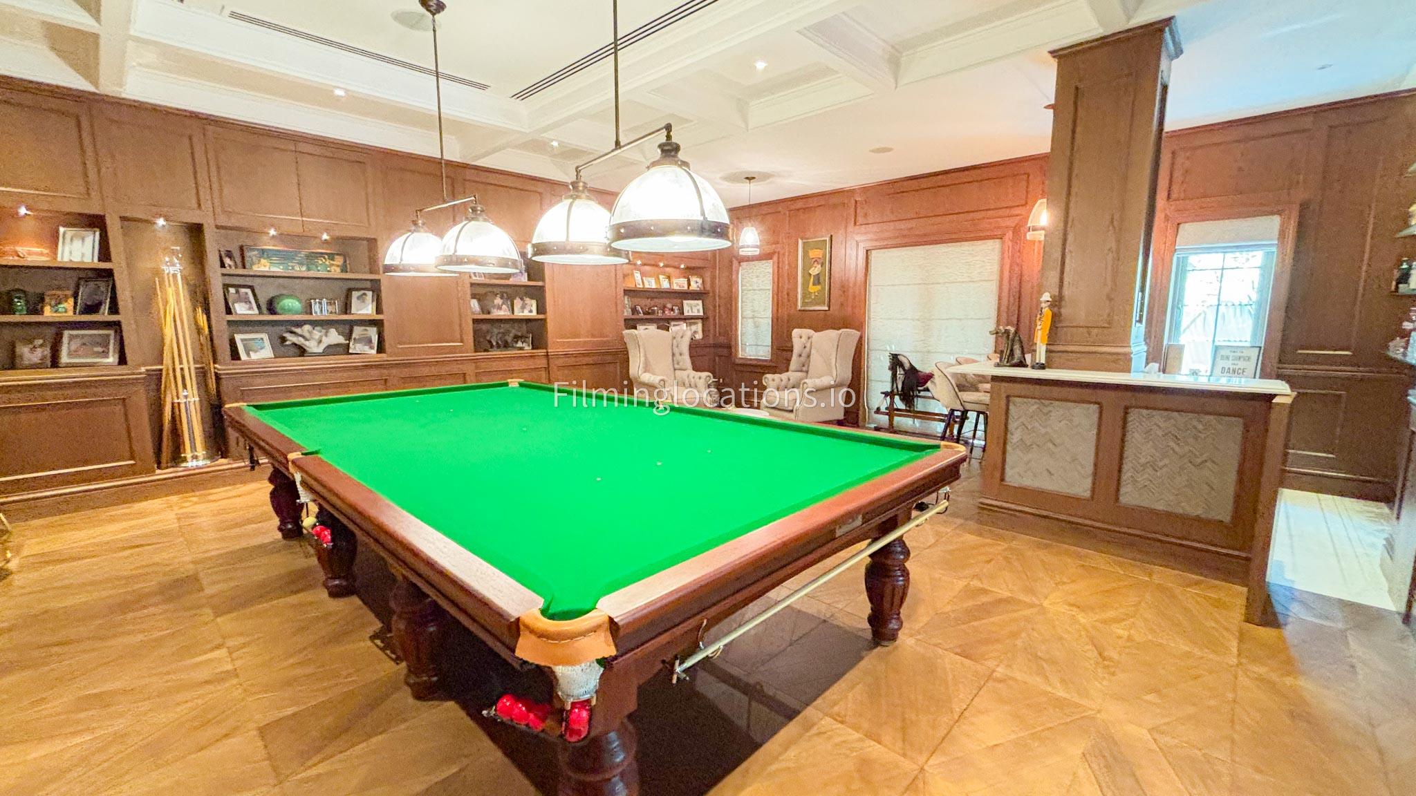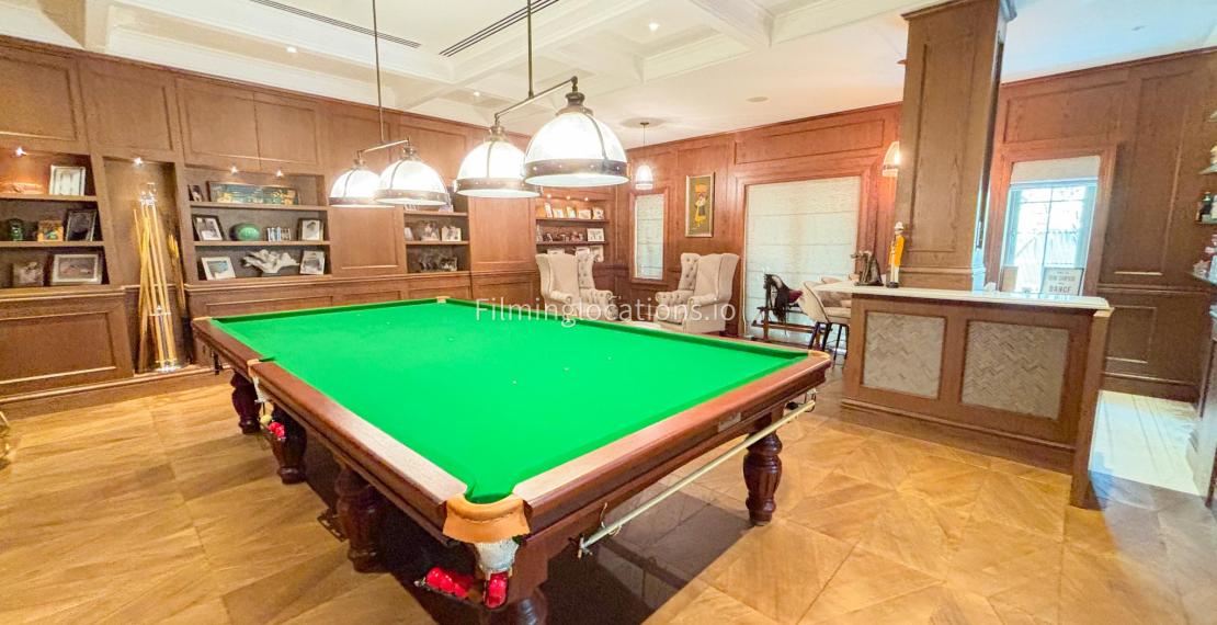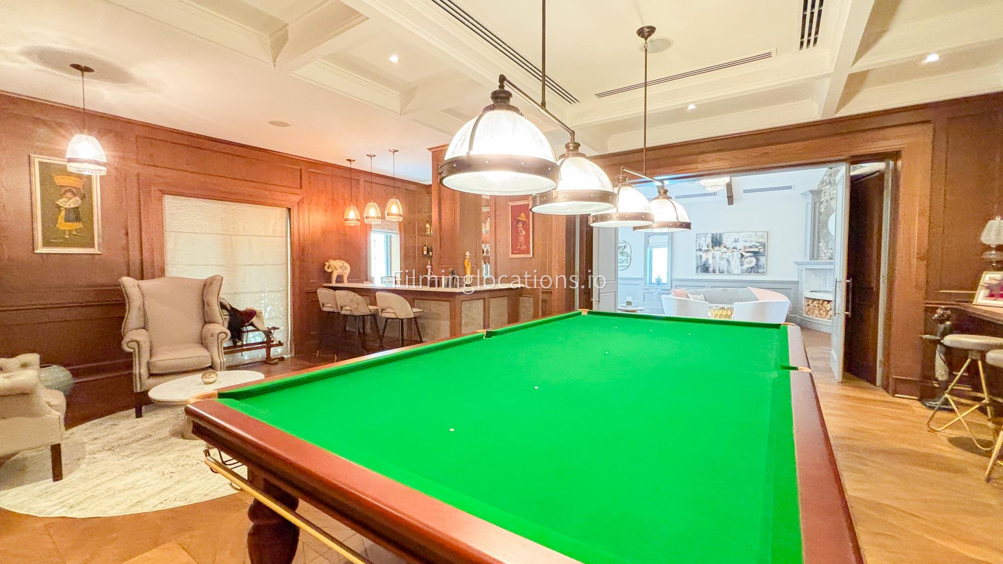 Our Pub Setting inside the Villa is featuring rich wooden flooring and matching furniture that create a warm, inviting atmosphere. The centerpiece is a stylish Snooker table, perfect for adding a playful touch to the space. The sleek design and refined ambiance make this room ideal for filming upscale social scenes, gatherings, or stylish, relaxed moments. The combination of polished wood and modern decor enhances the luxurious feel, offering a versatile and visually striking backdrop for any production.