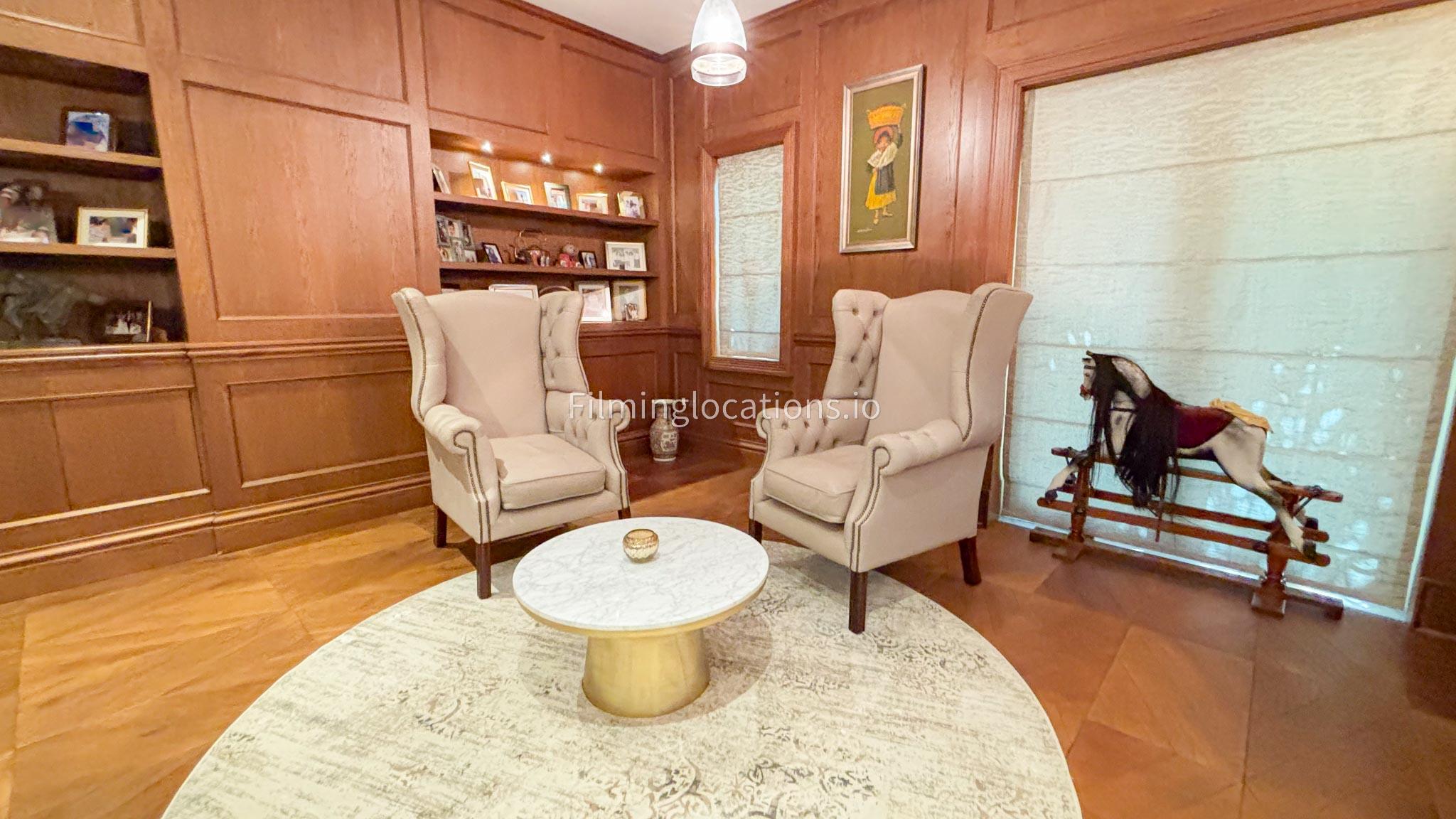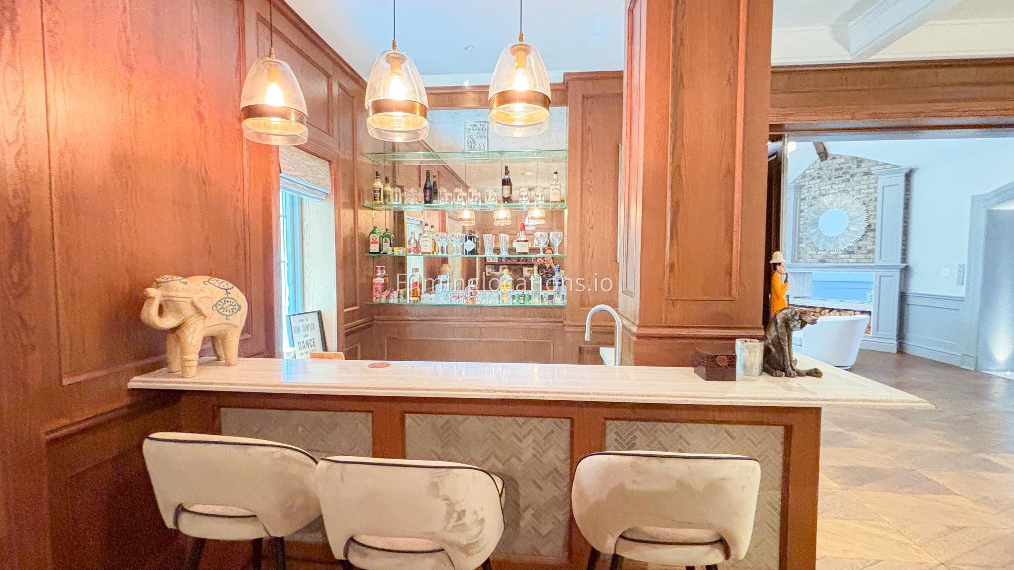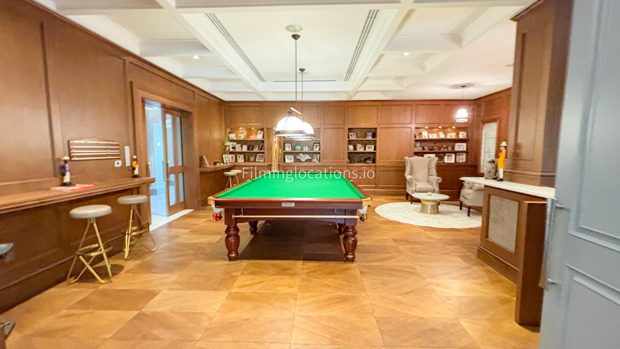 Our Pub Setting inside the Villa is featuring rich wooden flooring and matching furniture that create a warm, inviting atmosphere. The centerpiece is a stylish Snooker table, perfect for adding a playful touch to the space. The sleek design and refined ambiance make this room ideal for filming upscale social scenes, gatherings, or stylish, relaxed moments. The combination of polished wood and modern decor enhances the luxurious feel, offering a versatile and visually striking backdrop for any production.