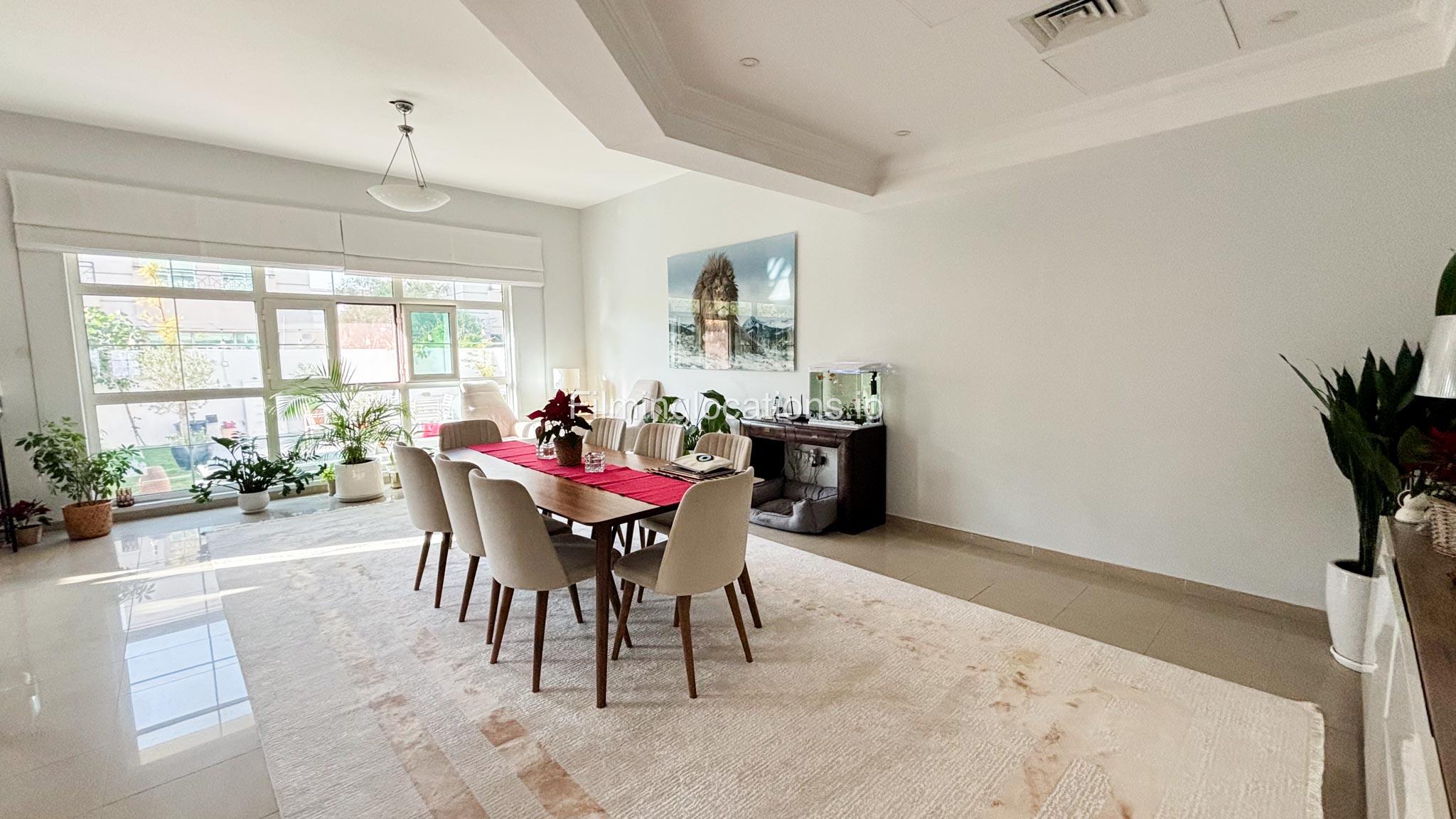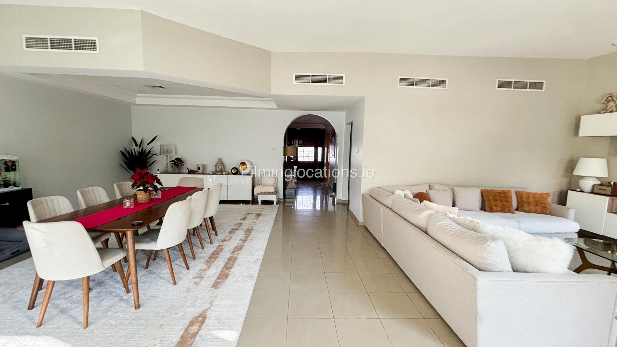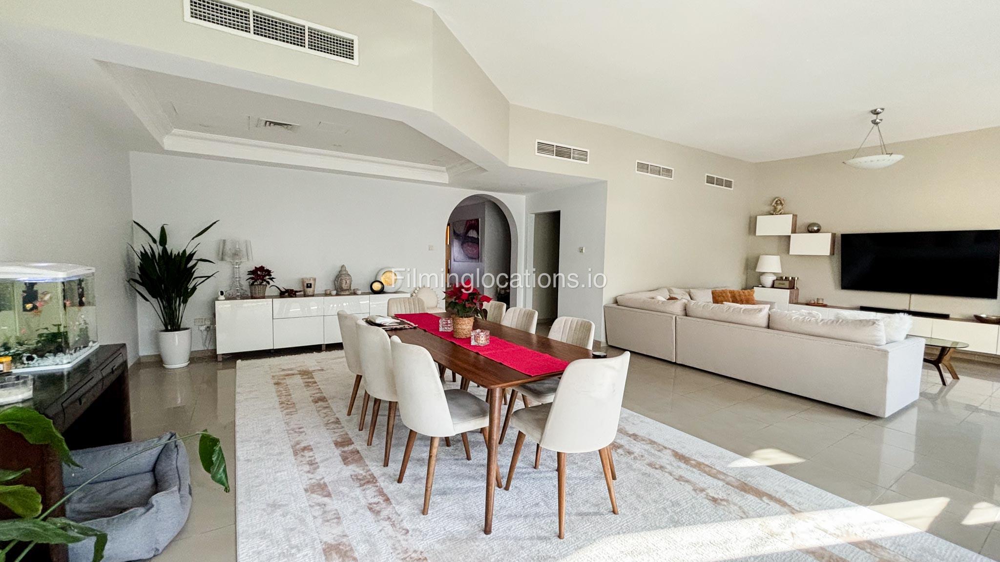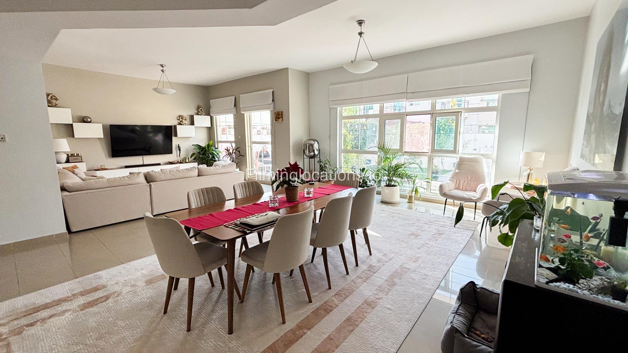 Our modern four-bedroom villa is a perfect location for film, TV, or fashion shoots. Located in the heart of Dubai, the villa offers a stunning skyline view and is equipped with high-end amenities such as a spacious open kitchen, large living area, and stylish furniture. The property also includes a private terrace with a garden, providing an excellent backdrop for outdoor shoots. Additionally, it features a balcony with a view of the Burj Khalifa, making it ideal for scenes requiring iconic Dubai scenery. The villa comfortably accommodates up to 50 people, ensuring ample space for production teams and equipment.