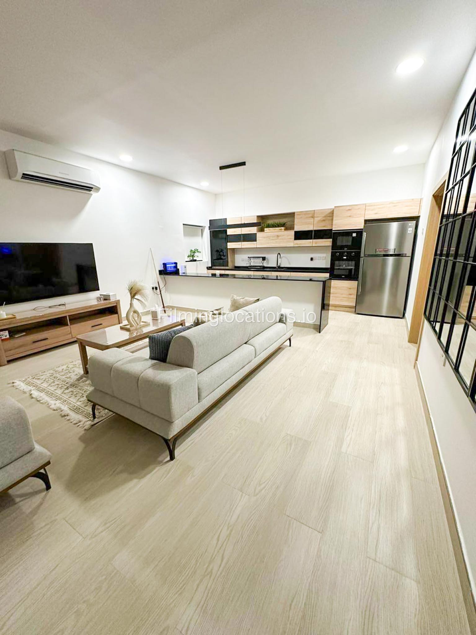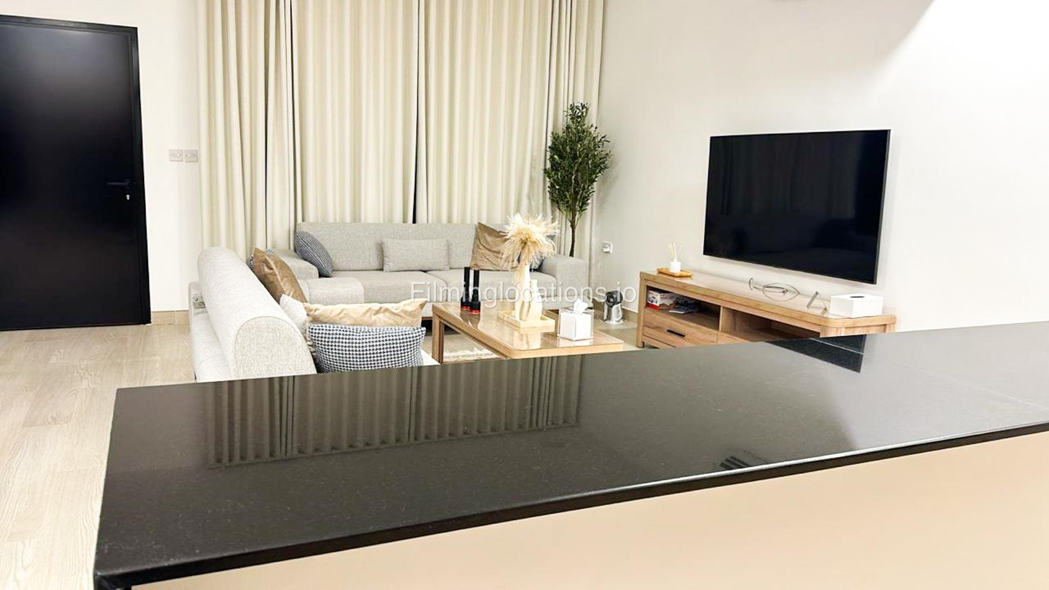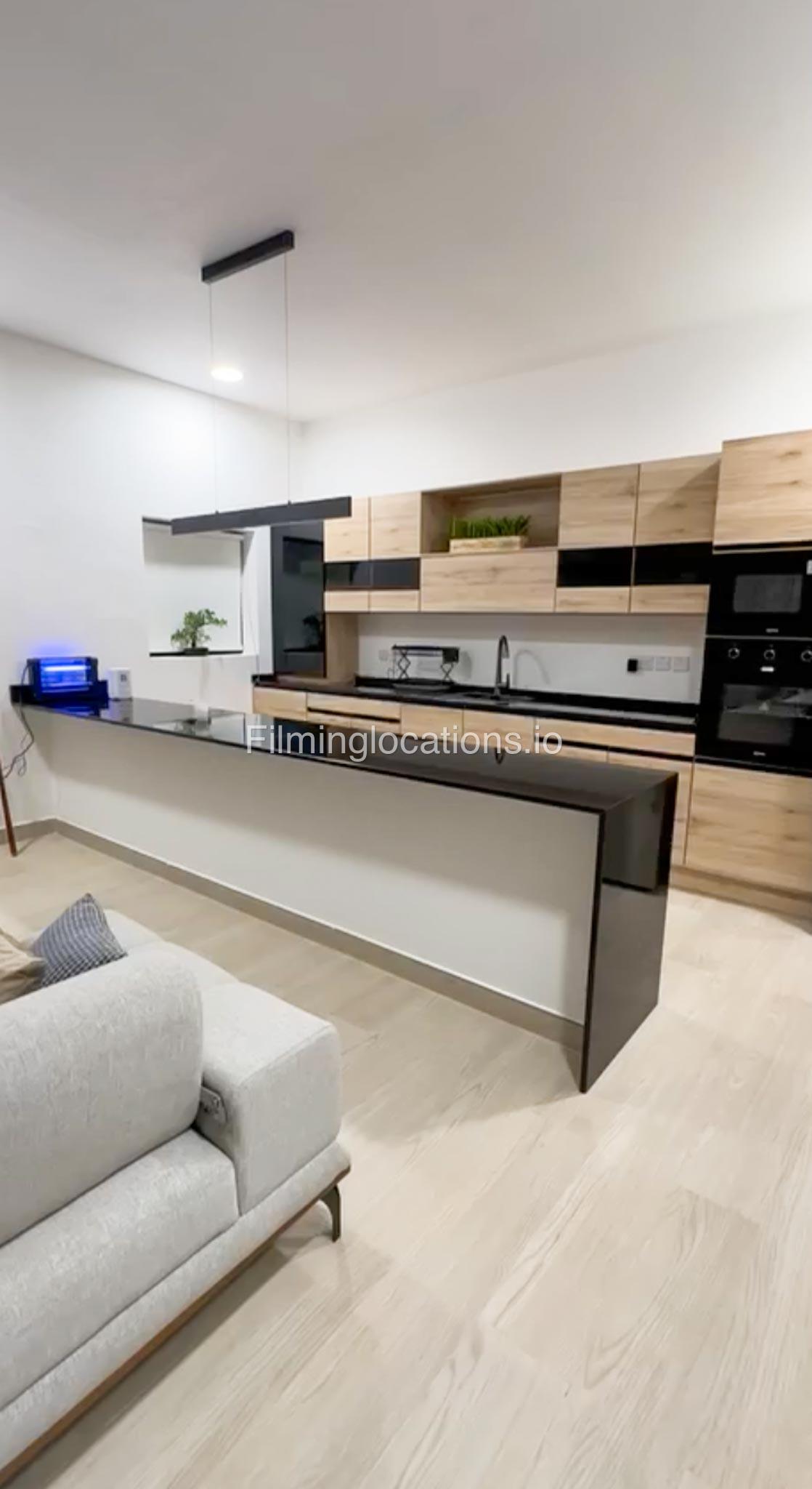 Our modern, open kitchen with a kitchen island is ideal for cooking shows or other medium-sized shoots! It includes a stylish living room with a sofa and TV set.