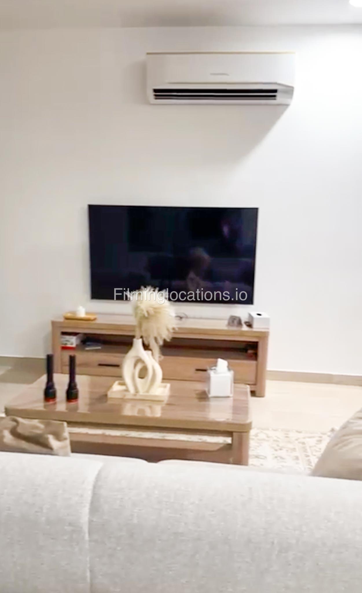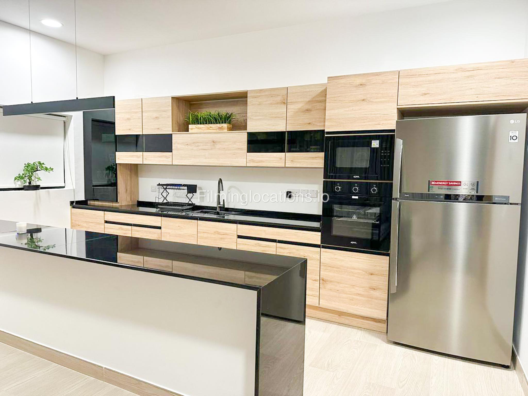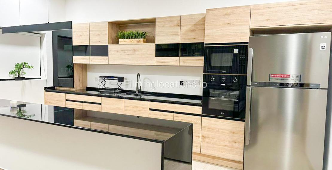 Our modern, open kitchen with a kitchen island is ideal for cooking shows or other medium-sized shoots! It includes a stylish living room with a sofa and TV set.