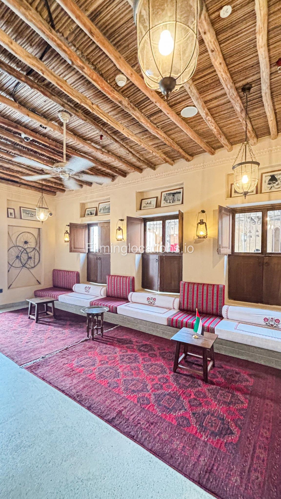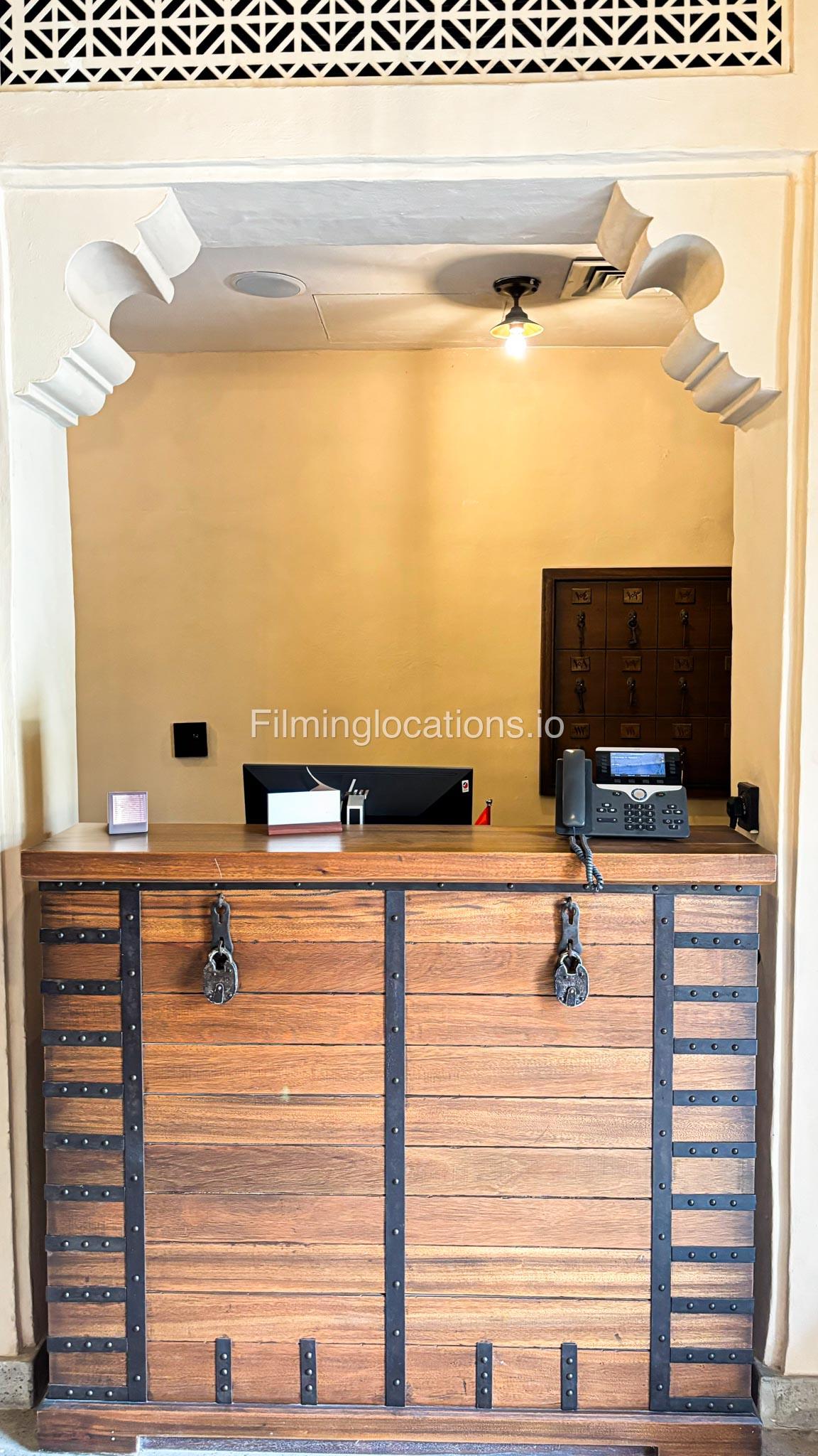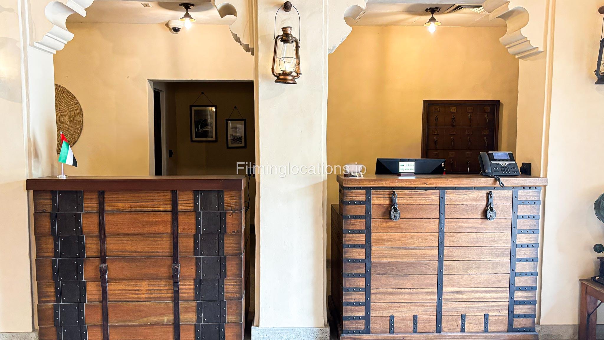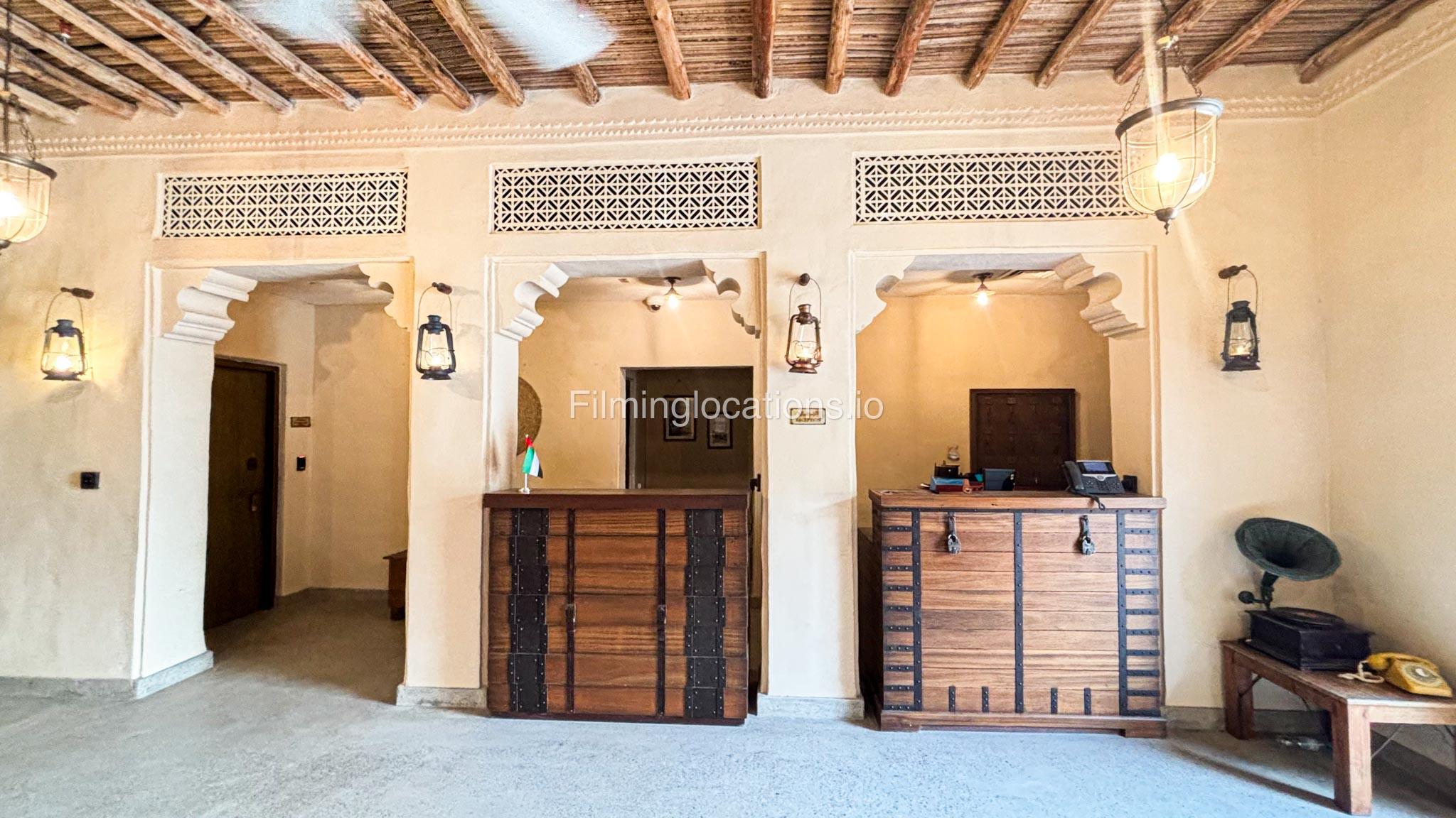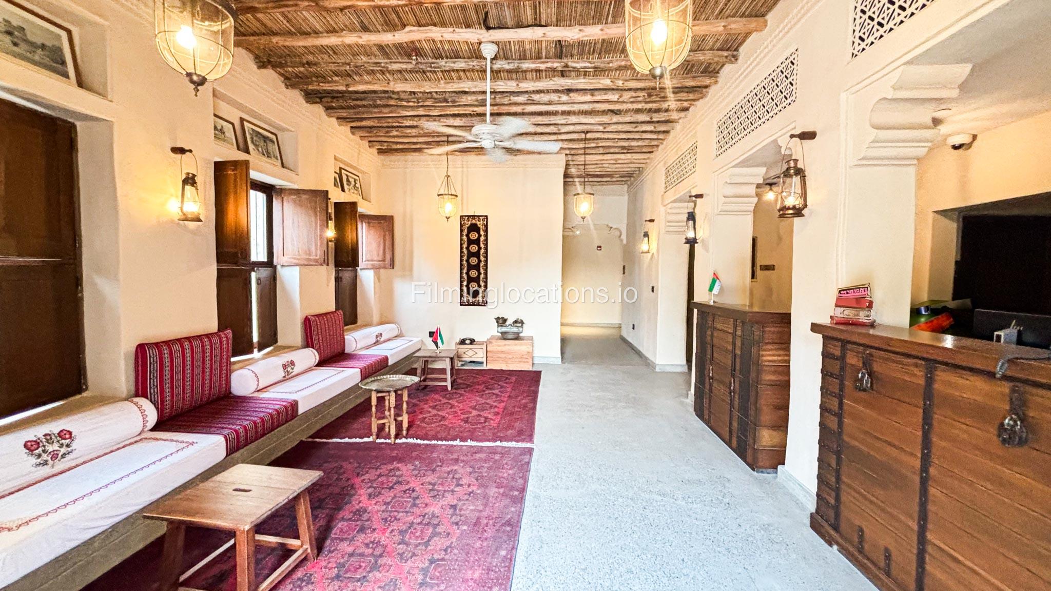 A stylish hotel reception with traditional Arabic design, featuring two wooden front desks, comfortable seating along the walls, and rich red carpets. Wooden shutter blinds filter natural light, creating a warm, inviting atmosphere. Perfect for filming with its elegant, cultural charm.