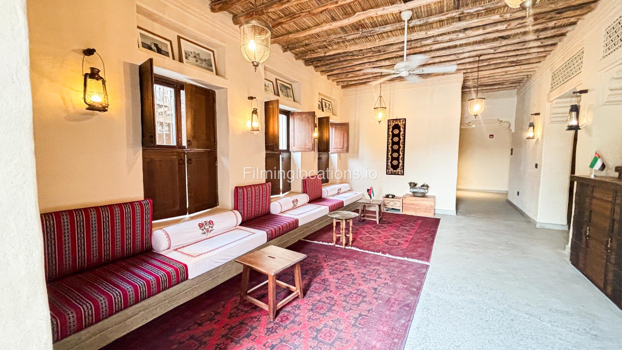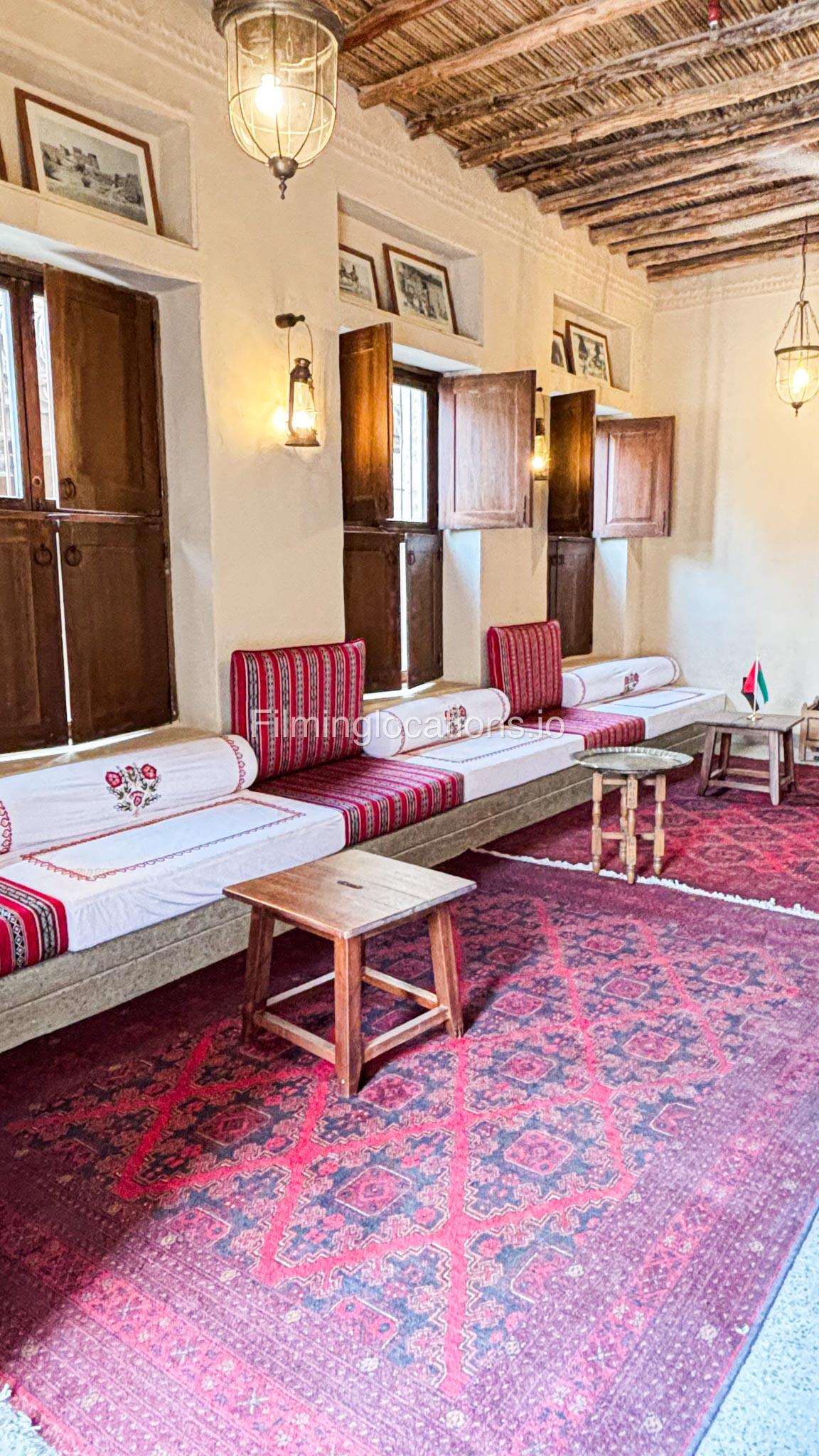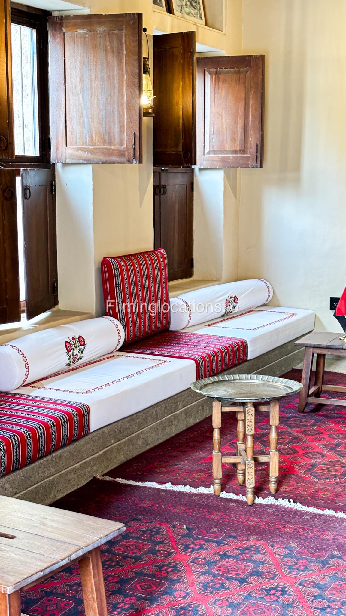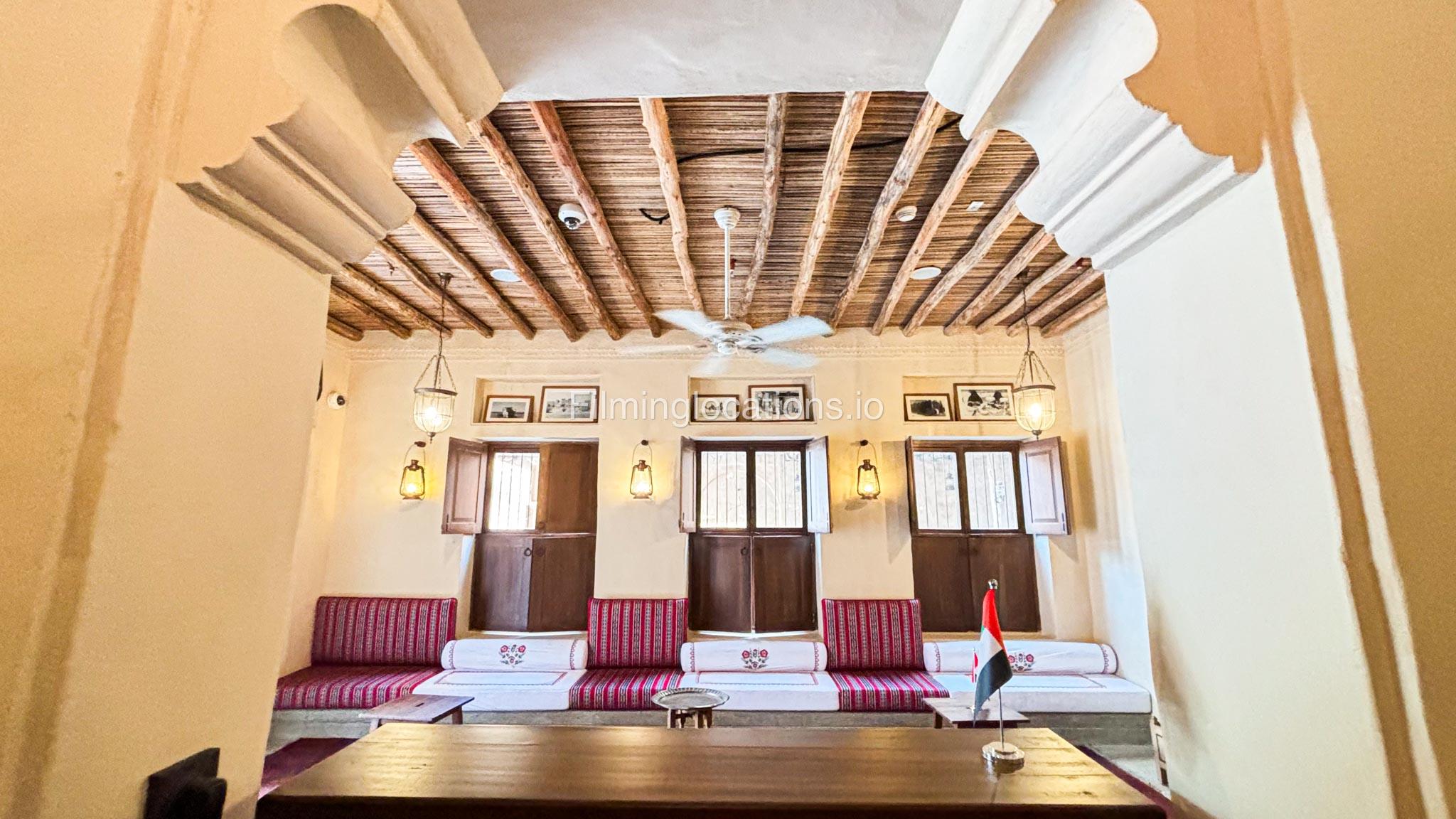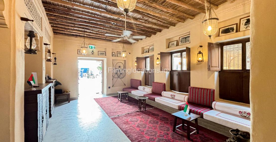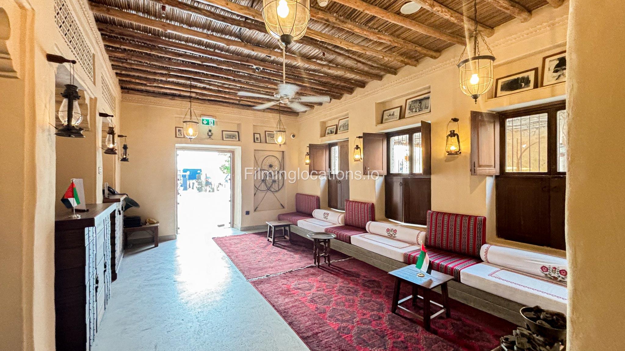 A stylish hotel reception with traditional Arabic design, featuring two wooden front desks, comfortable seating along the walls, and rich red carpets. Wooden shutter blinds filter natural light, creating a warm, inviting atmosphere. Perfect for filming with its elegant, cultural charm.
